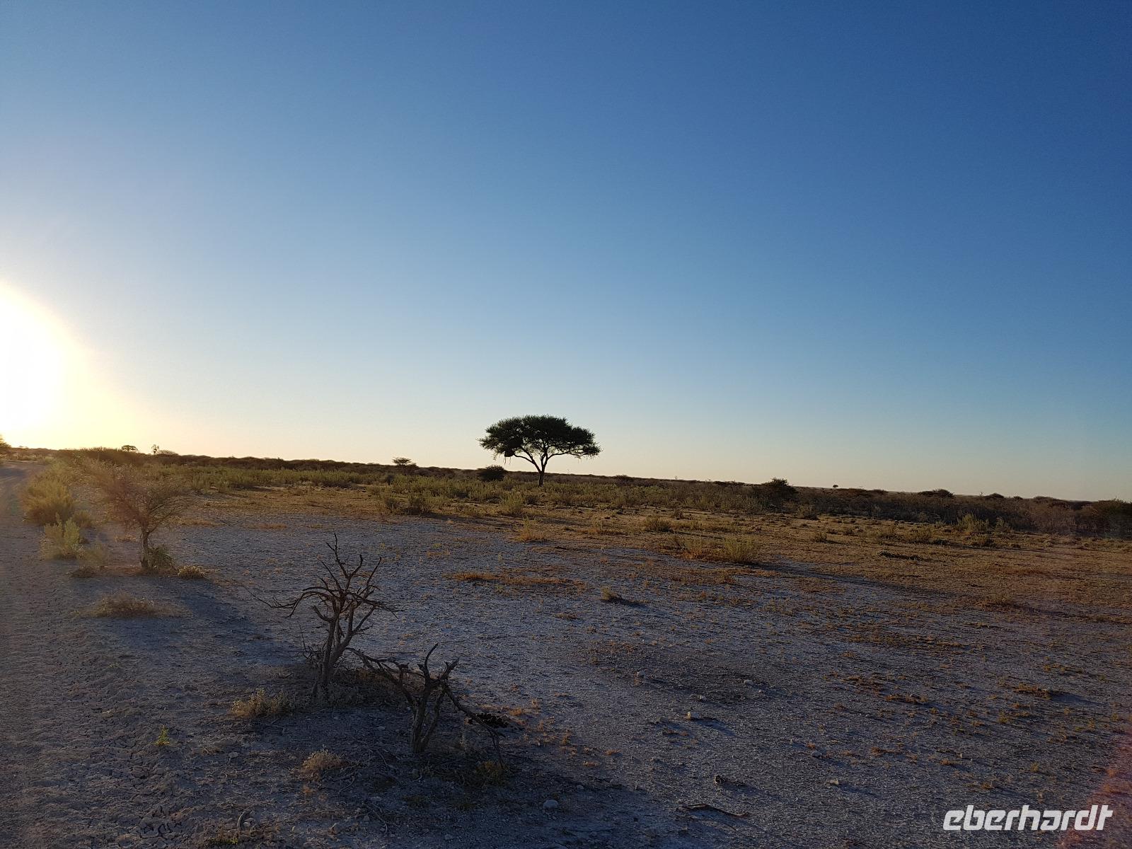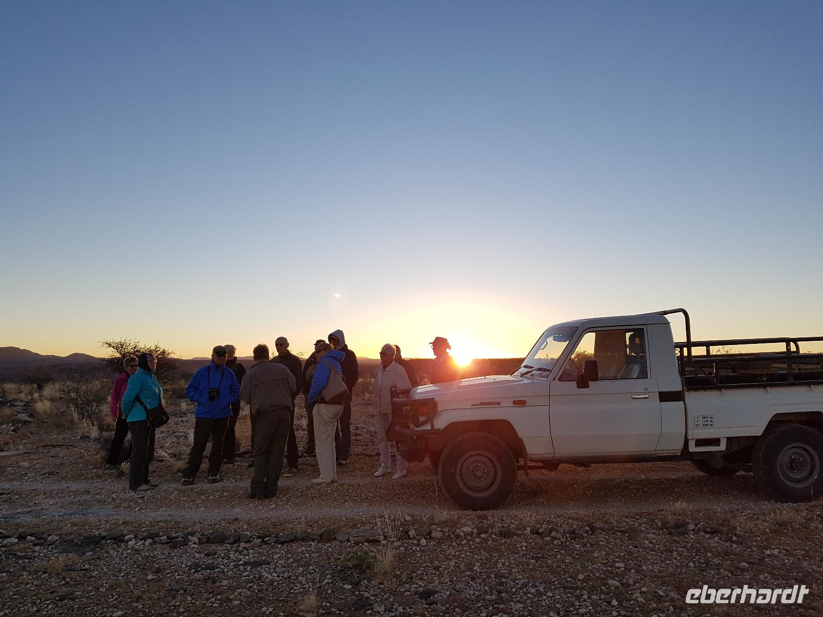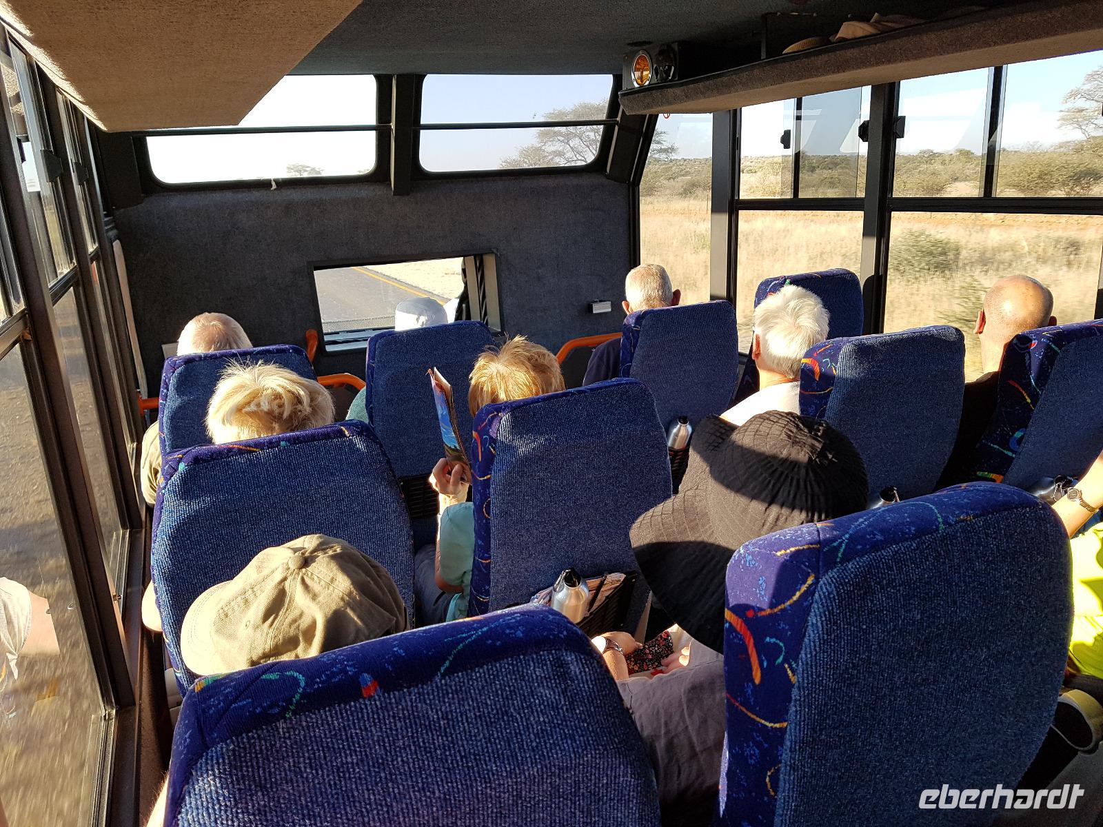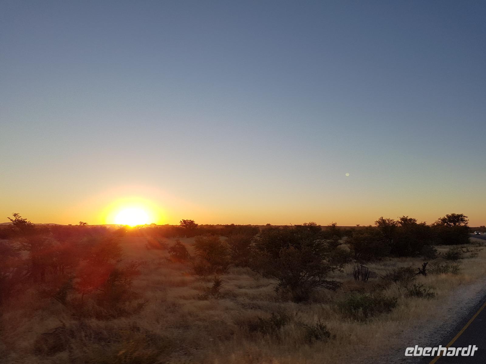 Fast noch in der Dunkelheit gingen wir zum Frühstück, da wir den Sonnenaufgang erleben wollten. Bereits am frühen Morgen starten wir zur ganztägigen Pirschfahrt durch den Etosha Nationalpark. Auf unserem „Safari-Truck" sitzen wir angenehm erhöht, zum Fotografieren der einzigartigen Tierwelt und wie immer konnten wir die Fenster öffnen, um jeder Zeit Fotos machen zu können. Unterwegs beobachten wir wie gestern riesige Zebra- und Springbockherden, die durch die Savanne ziehen.