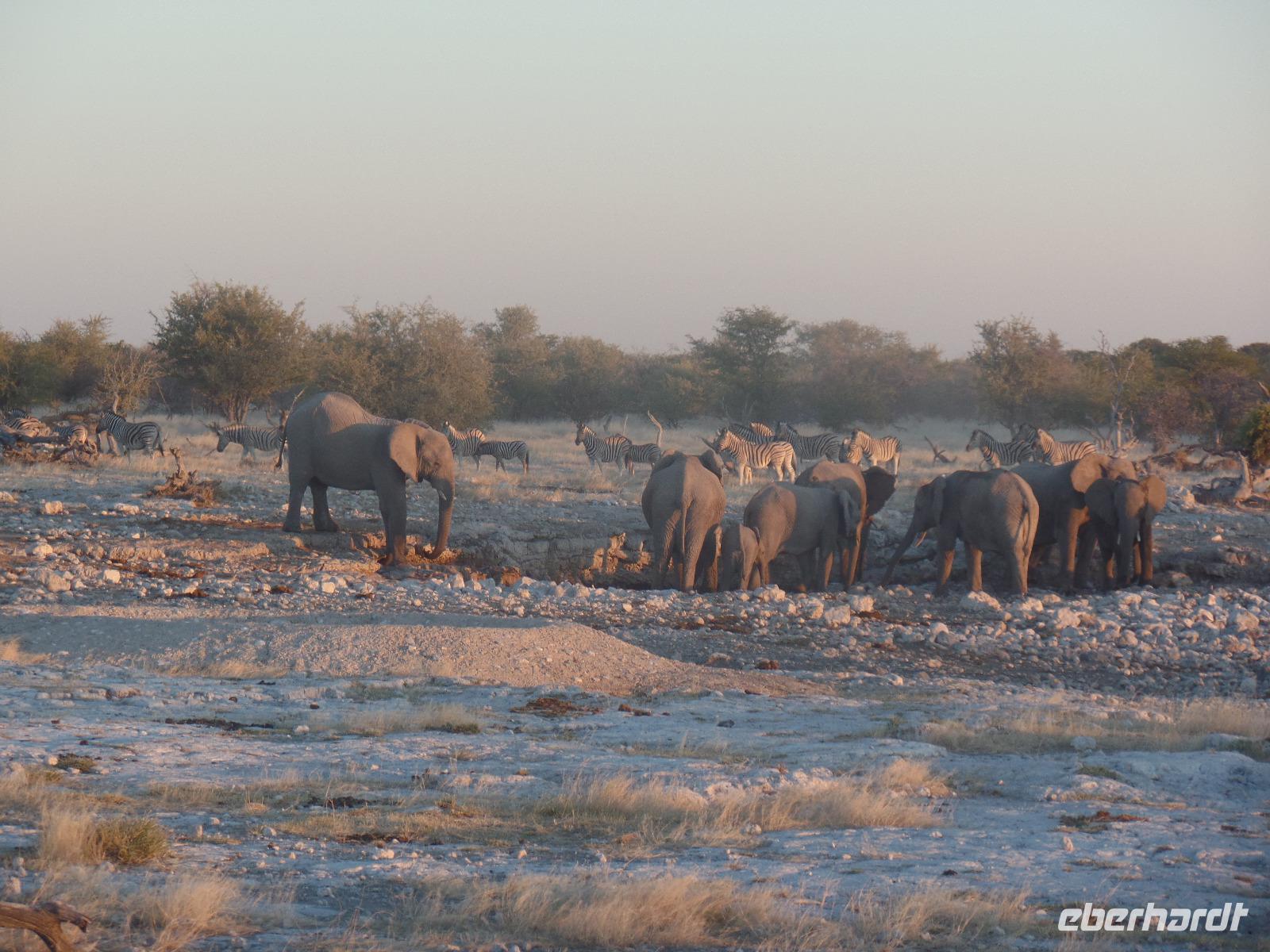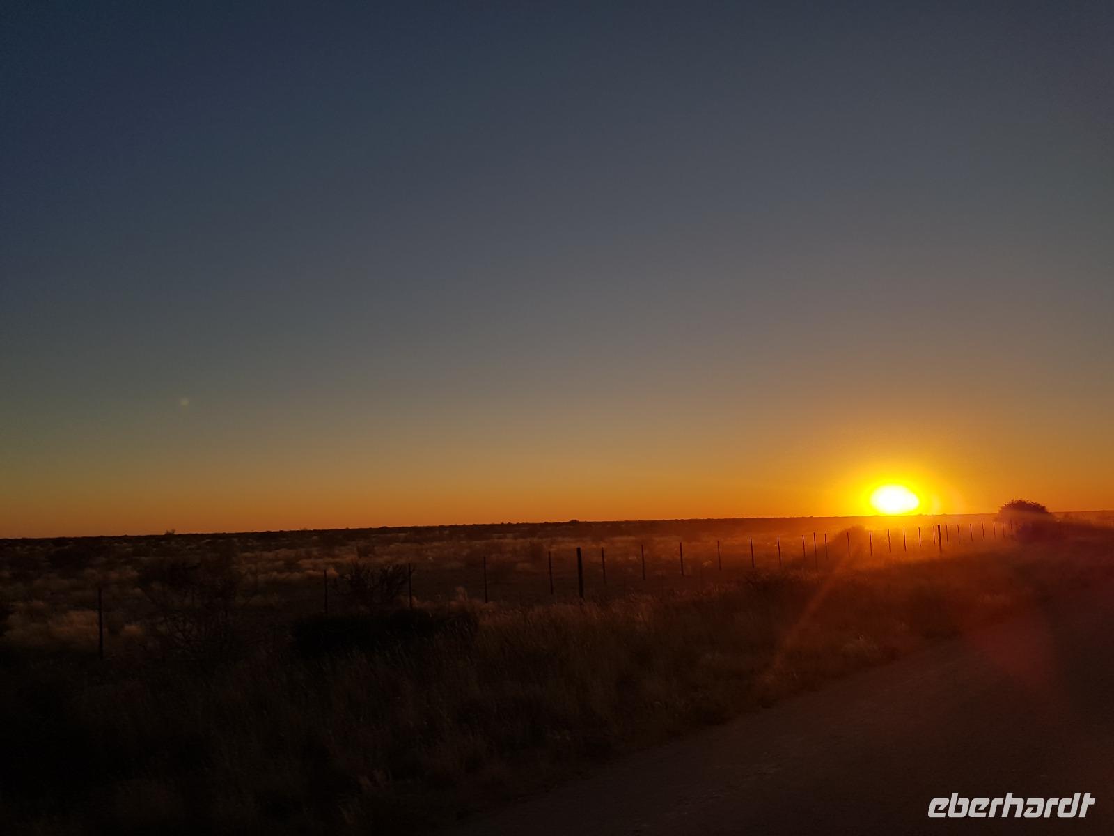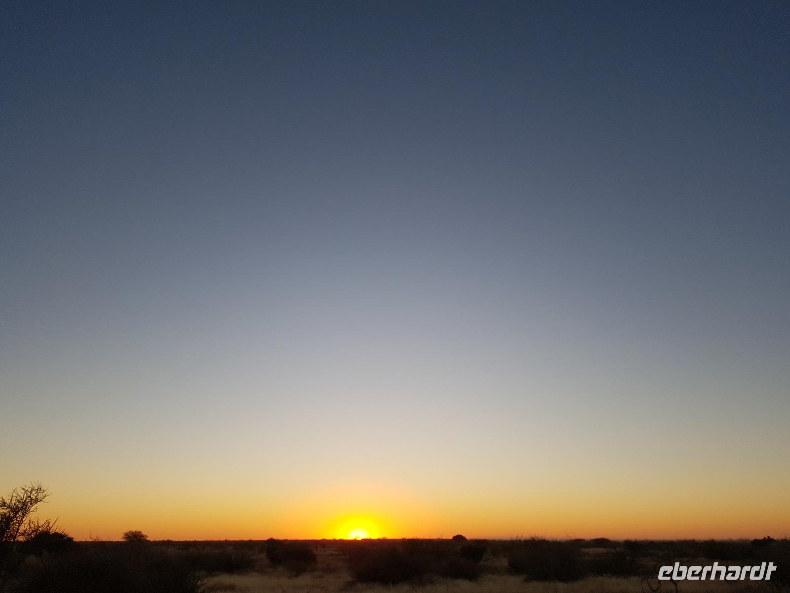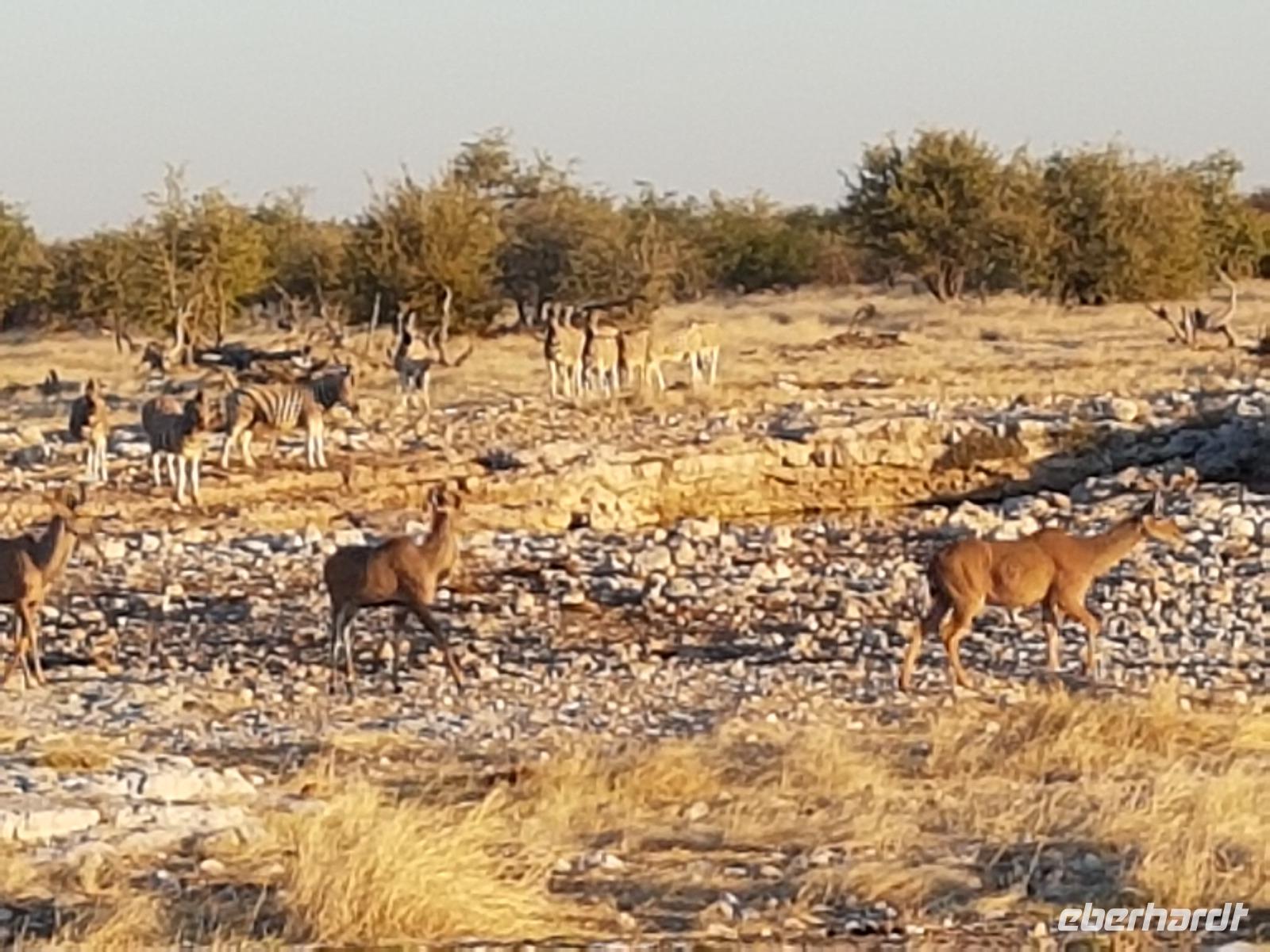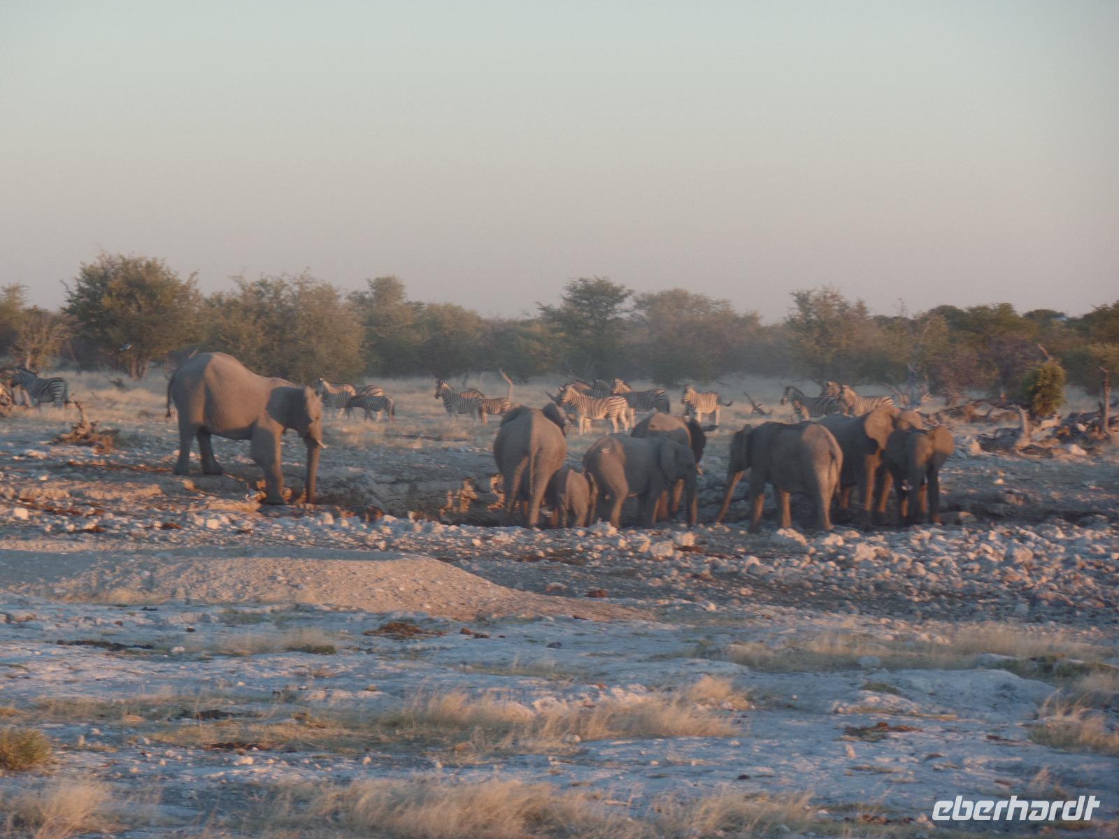 Fast noch in der Dunkelheit gingen wir zum Frühstück, da wir den Sonnenaufgang erleben wollten. Bereits am frühen Morgen starten wir zur ganztägigen Pirschfahrt durch den Etosha Nationalpark. Auf unserem „Safari-Truck" sitzen wir angenehm erhöht, zum Fotografieren der einzigartigen Tierwelt und wie immer konnten wir die Fenster öffnen, um jeder Zeit Fotos machen zu können. Unterwegs beobachten wir wie gestern riesige Zebra- und Springbockherden, die durch die Savanne ziehen.