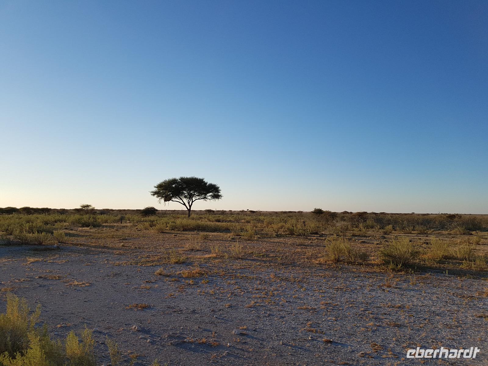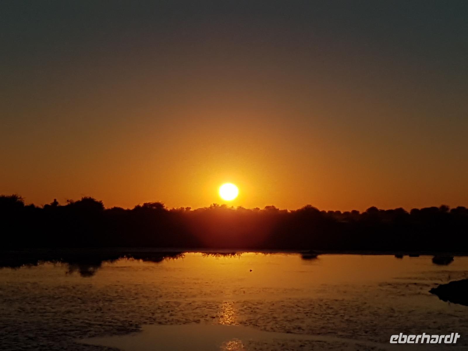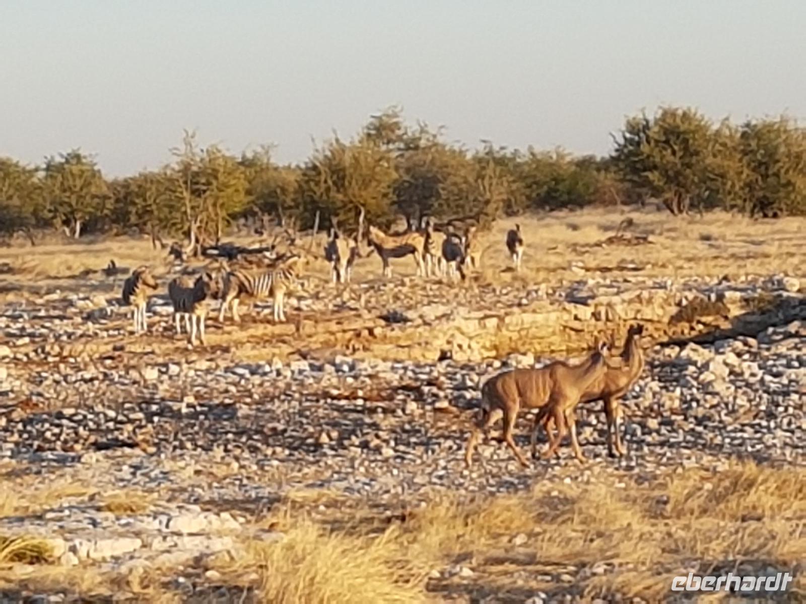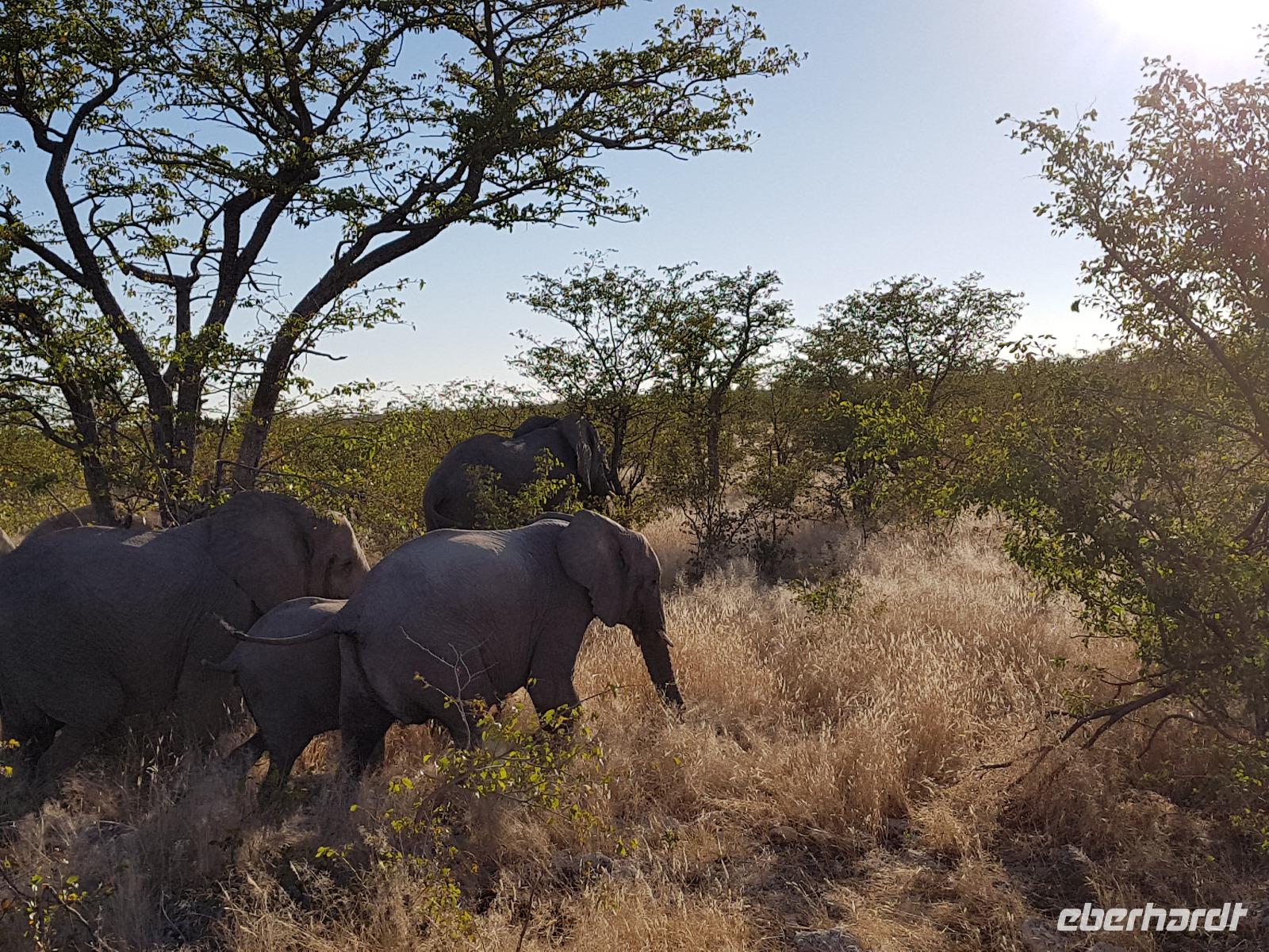 Fast noch in der Dunkelheit gingen wir zum Frühstück, da wir den Sonnenaufgang erleben wollten. Bereits am frühen Morgen starten wir zur ganztägigen Pirschfahrt durch den Etosha Nationalpark. Auf unserem „Safari-Truck" sitzen wir angenehm erhöht, zum Fotografieren der einzigartigen Tierwelt und wie immer konnten wir die Fenster öffnen, um jeder Zeit Fotos machen zu können. Unterwegs beobachten wir wie gestern riesige Zebra- und Springbockherden, die durch die Savanne ziehen.