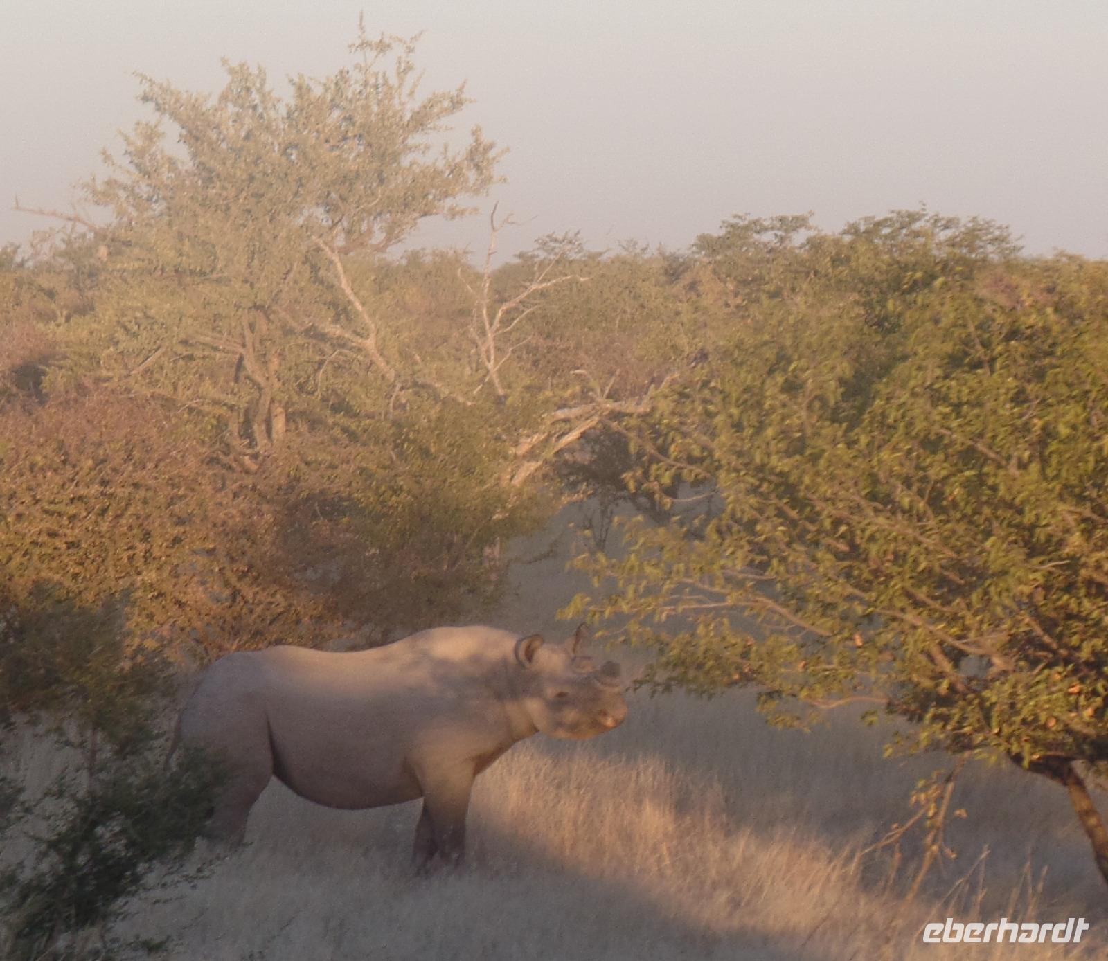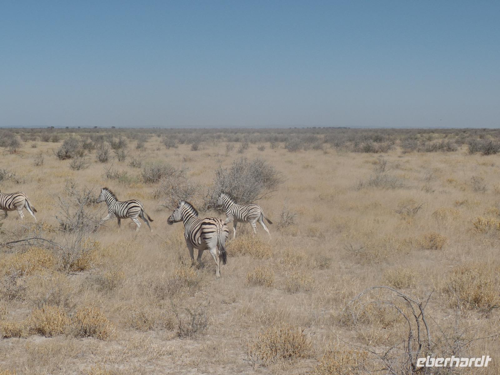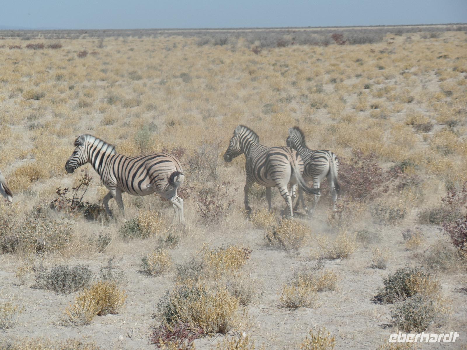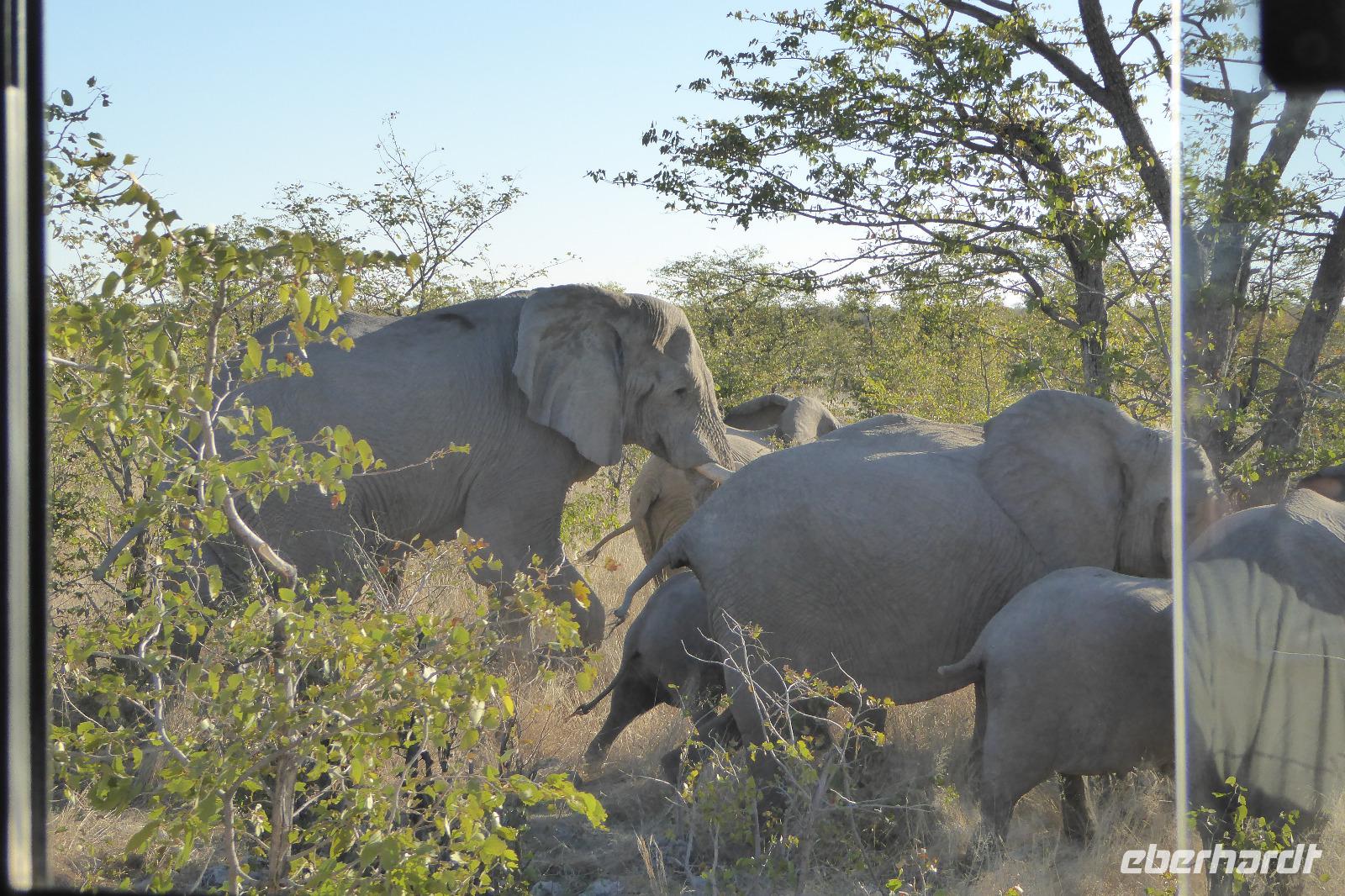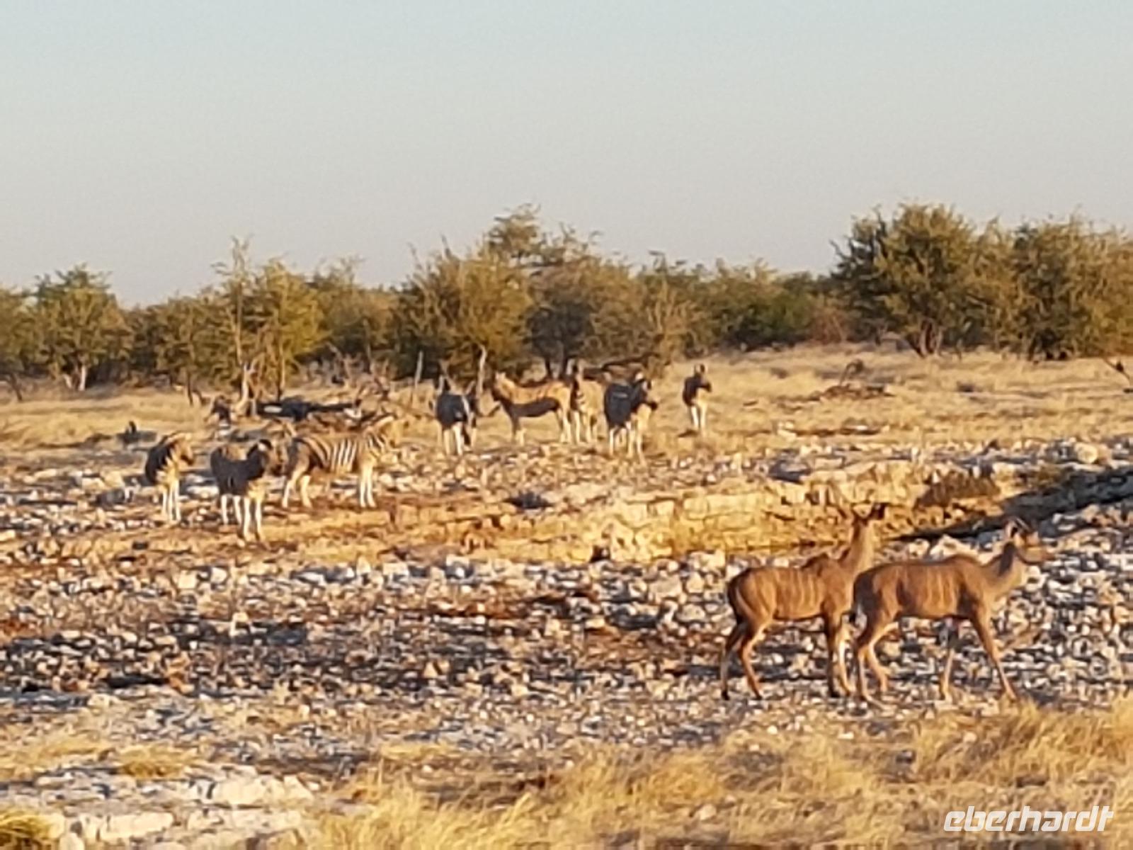 Fast noch in der Dunkelheit gingen wir zum Frühstück, da wir den Sonnenaufgang erleben wollten. Bereits am frühen Morgen starten wir zur ganztägigen Pirschfahrt durch den Etosha Nationalpark. Auf unserem „Safari-Truck" sitzen wir angenehm erhöht, zum Fotografieren der einzigartigen Tierwelt und wie immer konnten wir die Fenster öffnen, um jeder Zeit Fotos machen zu können. Unterwegs beobachten wir wie gestern riesige Zebra- und Springbockherden, die durch die Savanne ziehen.