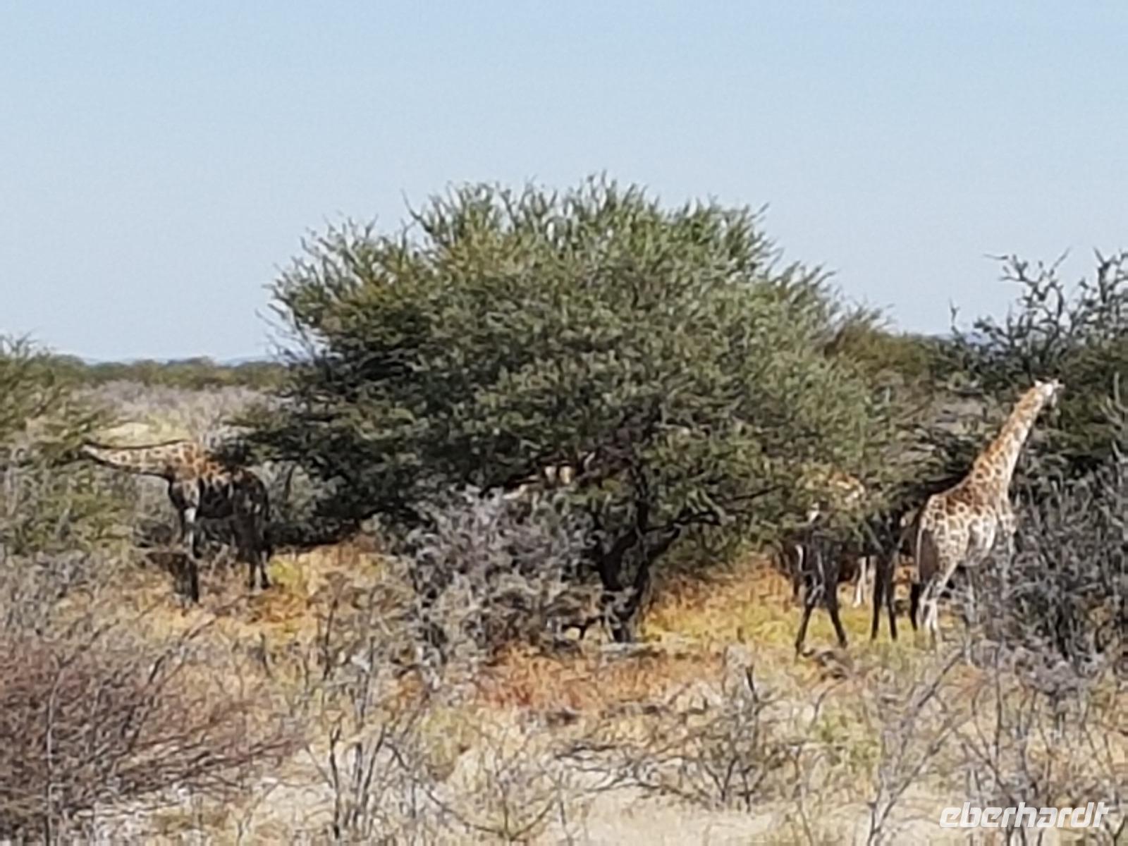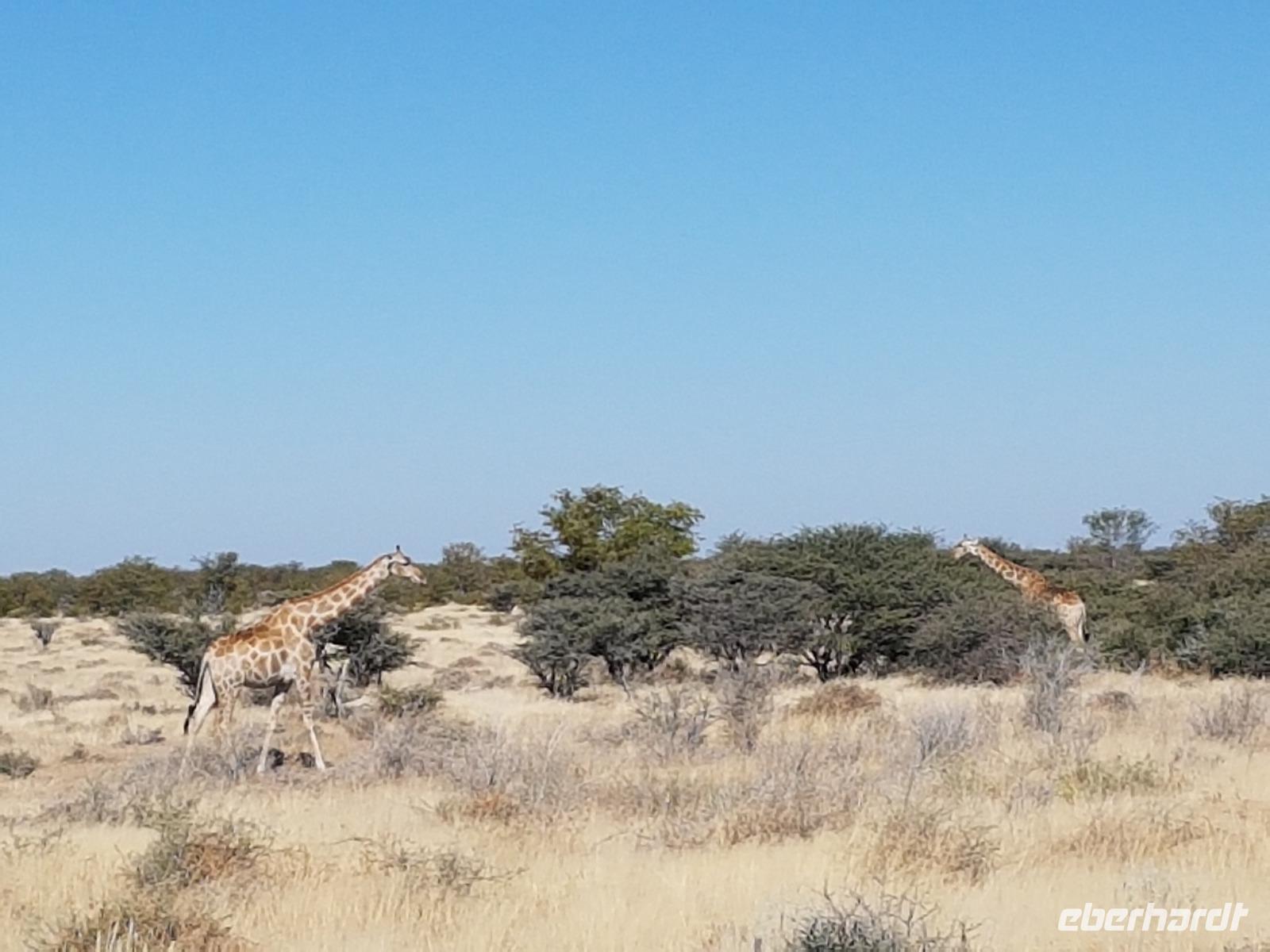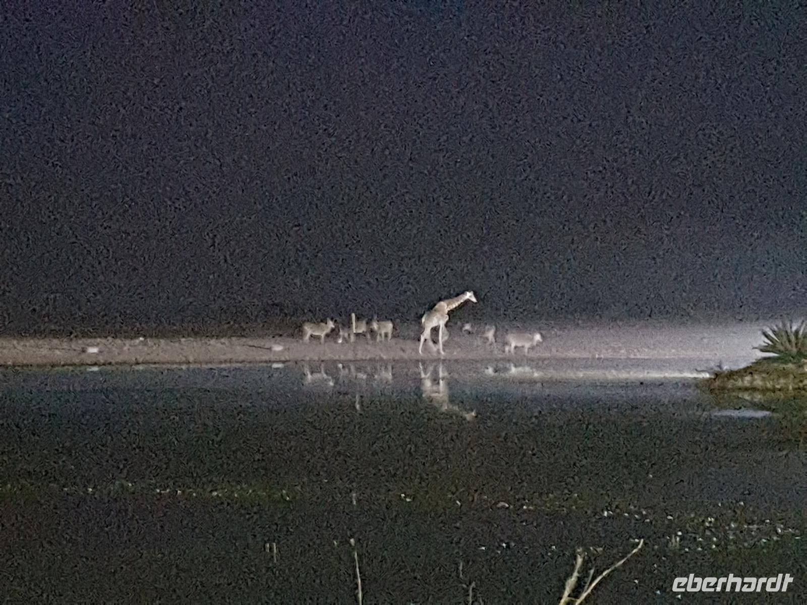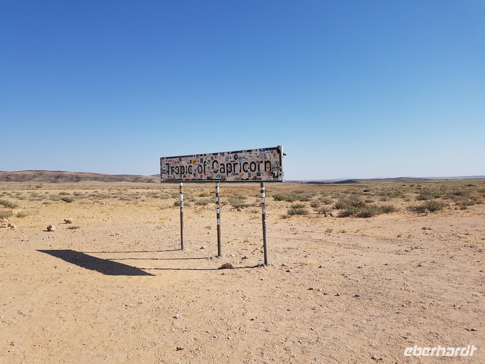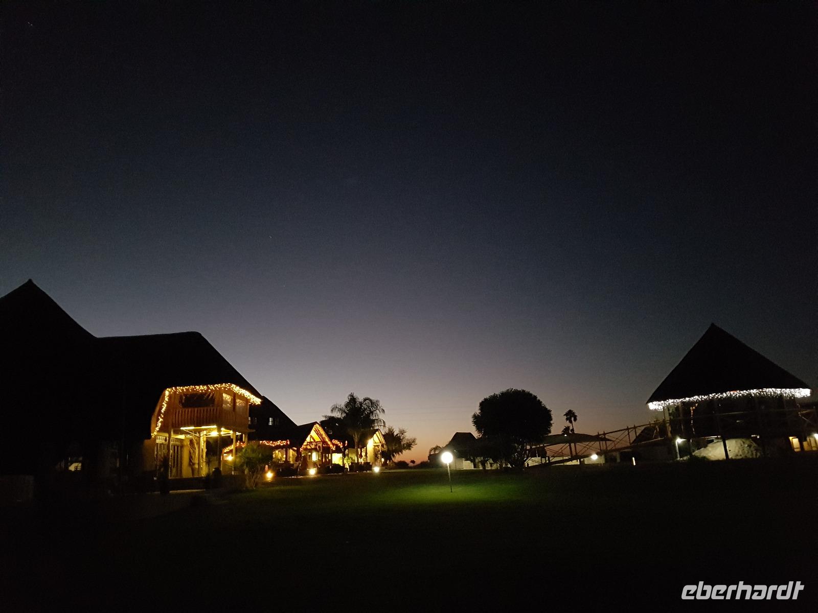 Am 23. Breitengrad überquerten wir, das 1. Mal noch unbemerkt auf unserer Reise, den südlichen Wendekreis des Steinbocks. Wir werden in einigen Tage den Wendekreis des Steinbocks erneut überqueren und ein tolles Foto machen. Das schwarze Asphaltband zog sich fast schnurgerade durch die Landschaft, typisch für Namibia. Am späten Nachmittag erreichten wir die schöne Lapa Lange Lodge bei Sonnenuntergang. Die Anlage gefiel uns sehr. Einige von uns hatten eine Überraschung in der Lodge vor dem Abendessen: eine Familie von Giraffen trank am Wasserloch.