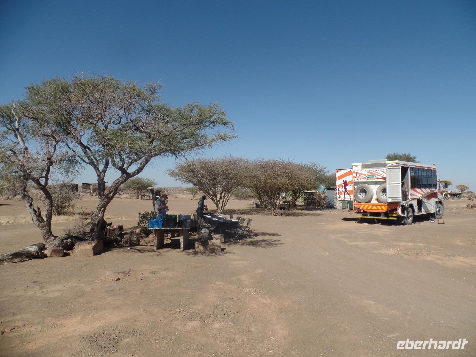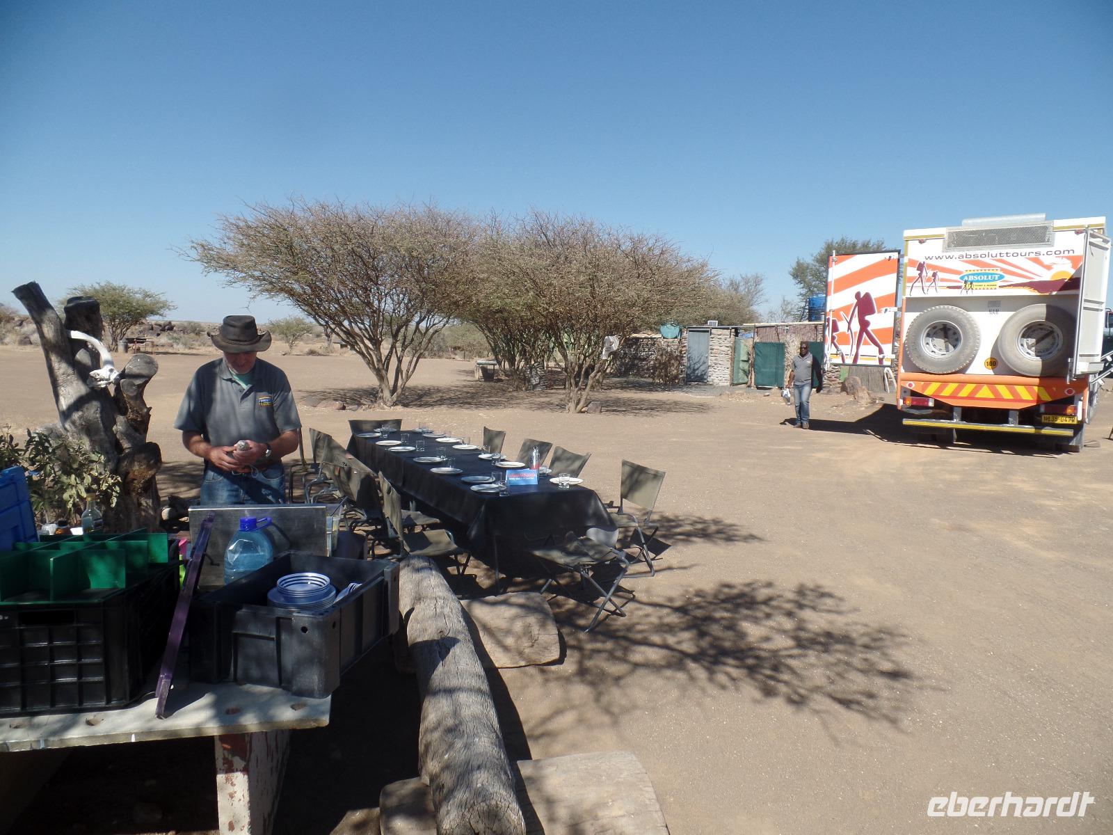 Wir hatten eine tolle Idee! Auf unseren „Safari-Truck" packten wir eine vollständige Picknickausrüstung für unsere Pausen . An einem Köcherbaumwald machten wir Rast, holten Tische und Stühle vom Truck. Ernst, Theo und wir alle halfen beim Aufbau. Es war der pure Luxus, da waren wir uns einig.