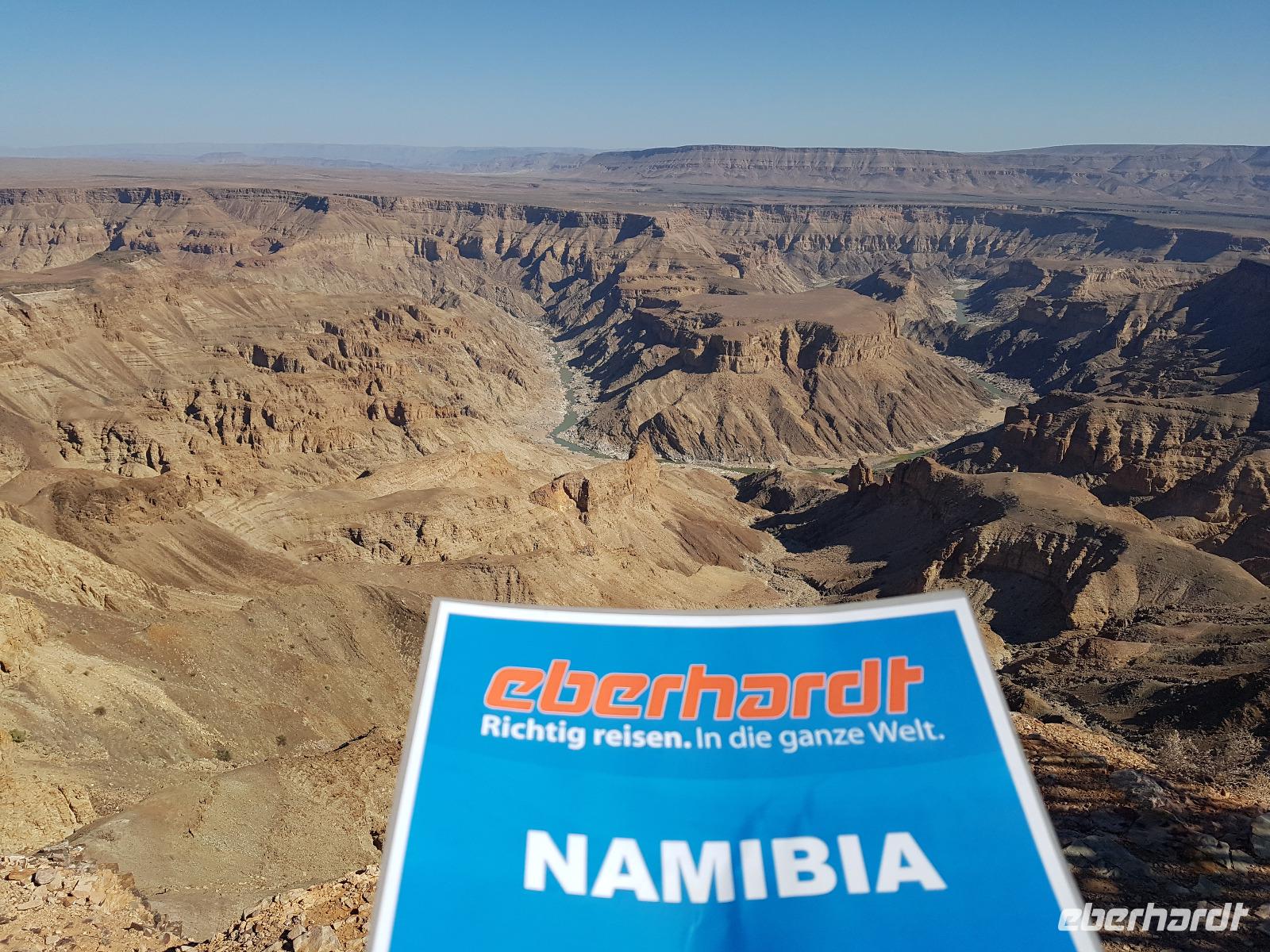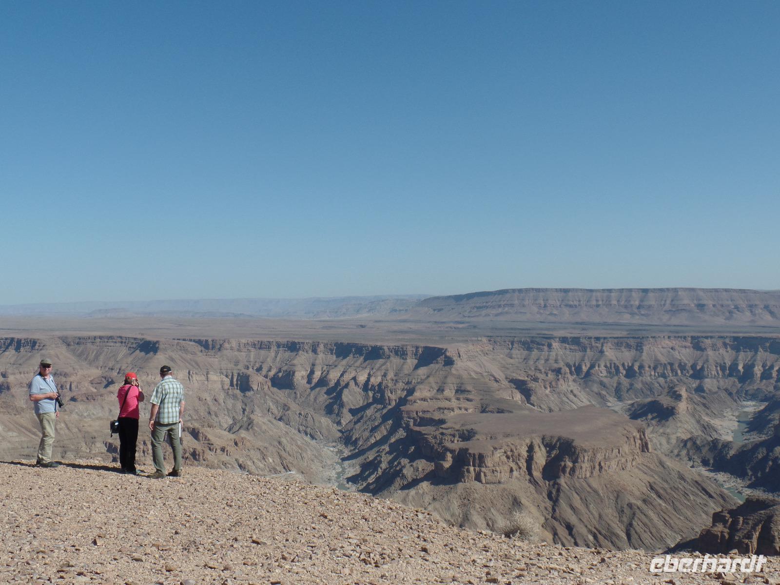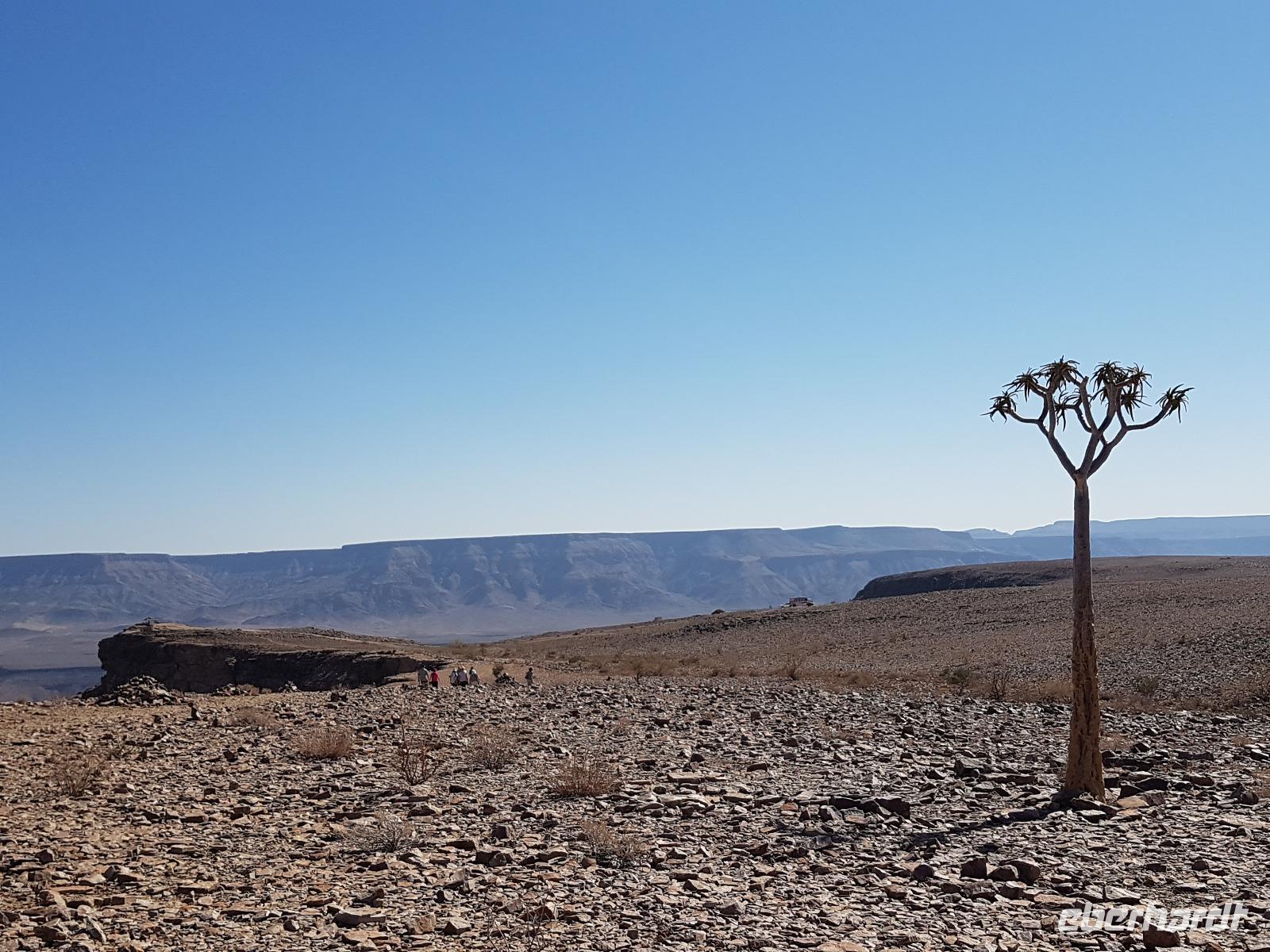 Die weitere Route führt uns parallel der Eisenbahnstrecke zum Fish River Canyon, der zu den eindrucksvollsten Naturschönheiten Namibias gehört. Der Fish River windet sich durch den 550 Meter tiefen Canyon und bildet somit die zweitgrößte Schluchtenlandschaft der Erde. Hier machten wir unser erstes Gruppenfoto und wanderten ein kleines Stück am oberen Rand des Canyons entlang. Es war herrlich hier zu sein. Für viele, die in den USA auf dem Grand Canyon von Colorado waren, sah es hier sehr ähnlich aus. Wunderschön, was die Natur in Millionen von Jahren mit Gletschern aus der Eiszeit, mit dem Wasser des Flusses, mit der Brandung und der Erosion bilden kann.