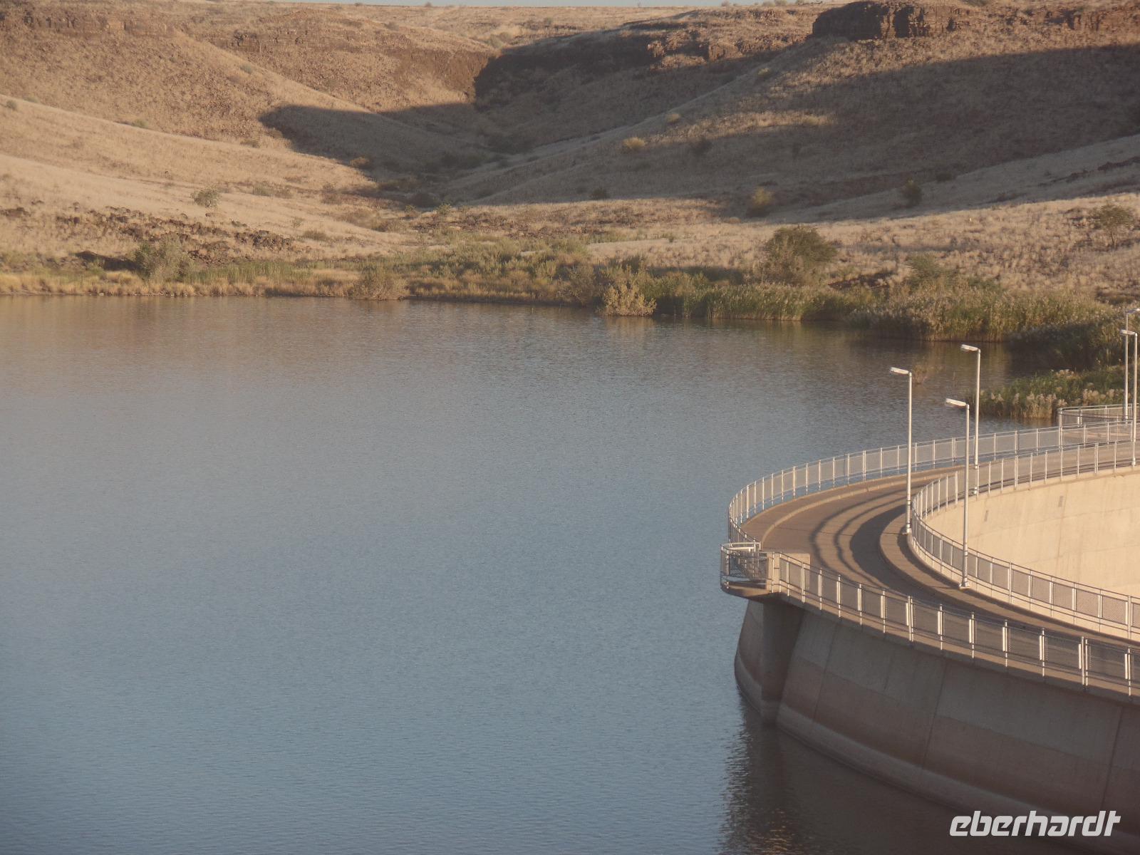 Auf dem Rückweg konnten wir den unweit gelegenen Naute Staudamm sehen, der als riesiger Wasserspeicher die gesamte Region um Keetmanshoop versorgt. Genau dieser Staudamm ließ hier eine kleine Oase entstehen, in welcher Tafeltrauben und Datteln gedeihen, in der sonst so kargen, trockenen Landschaft. An dieser Stelle machten wir eine Kaktuslikörverkostung. Es hat allen gut geschmeckt, was man daran sah, dass ein oder zwei Flaschen von manchen gekauft wurden.