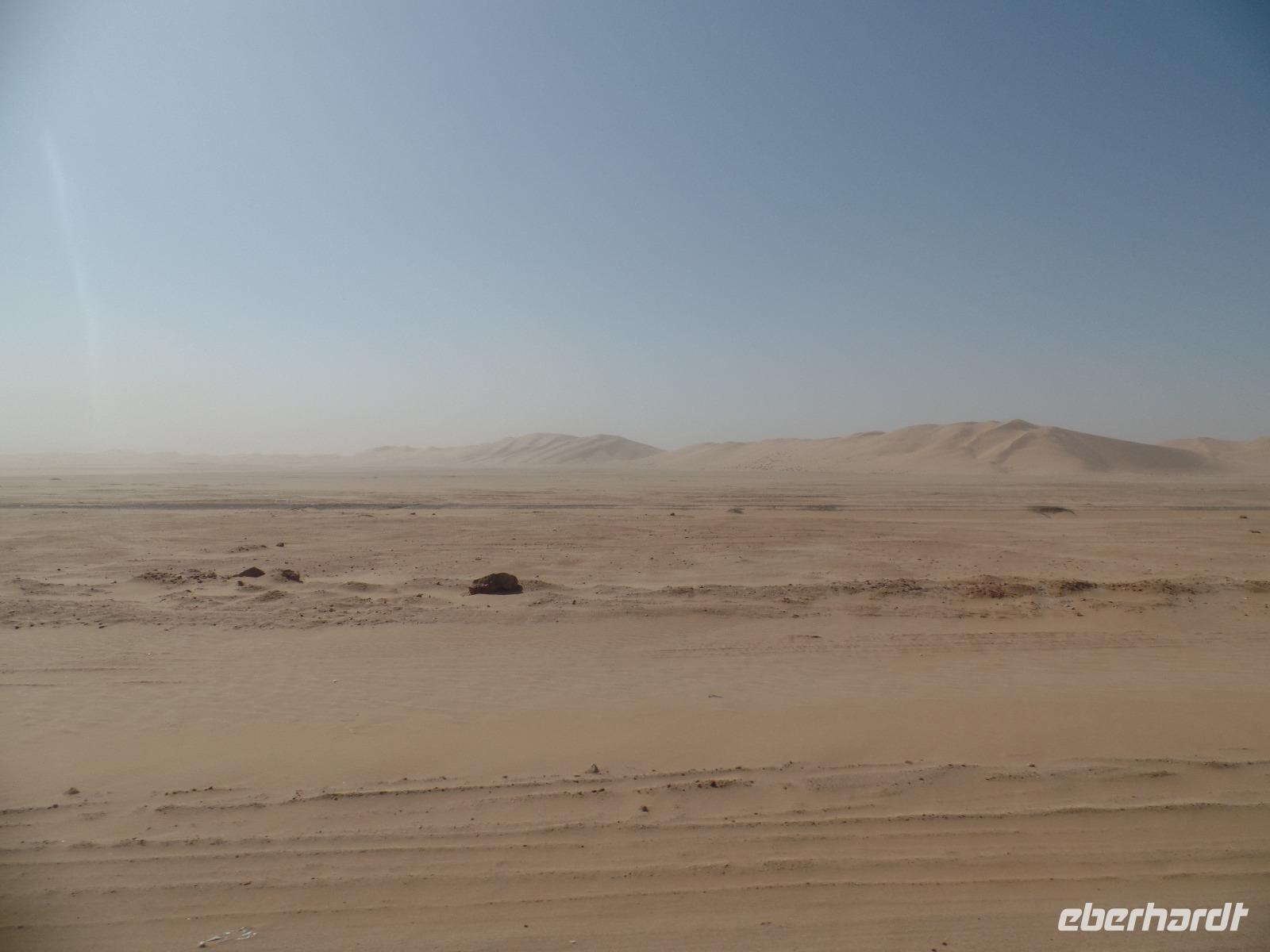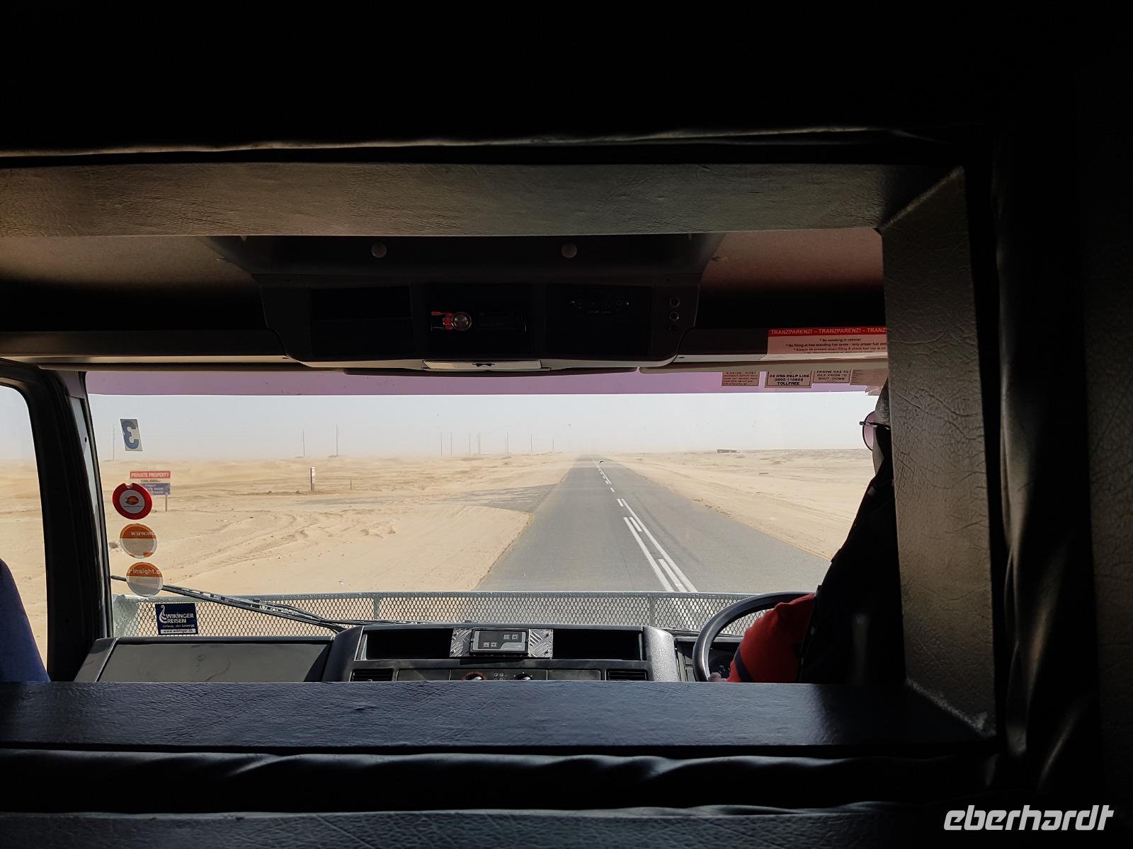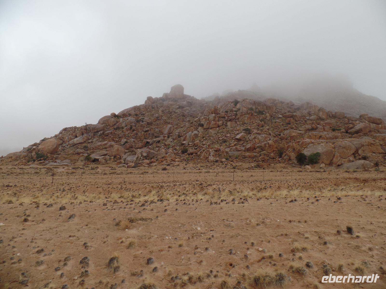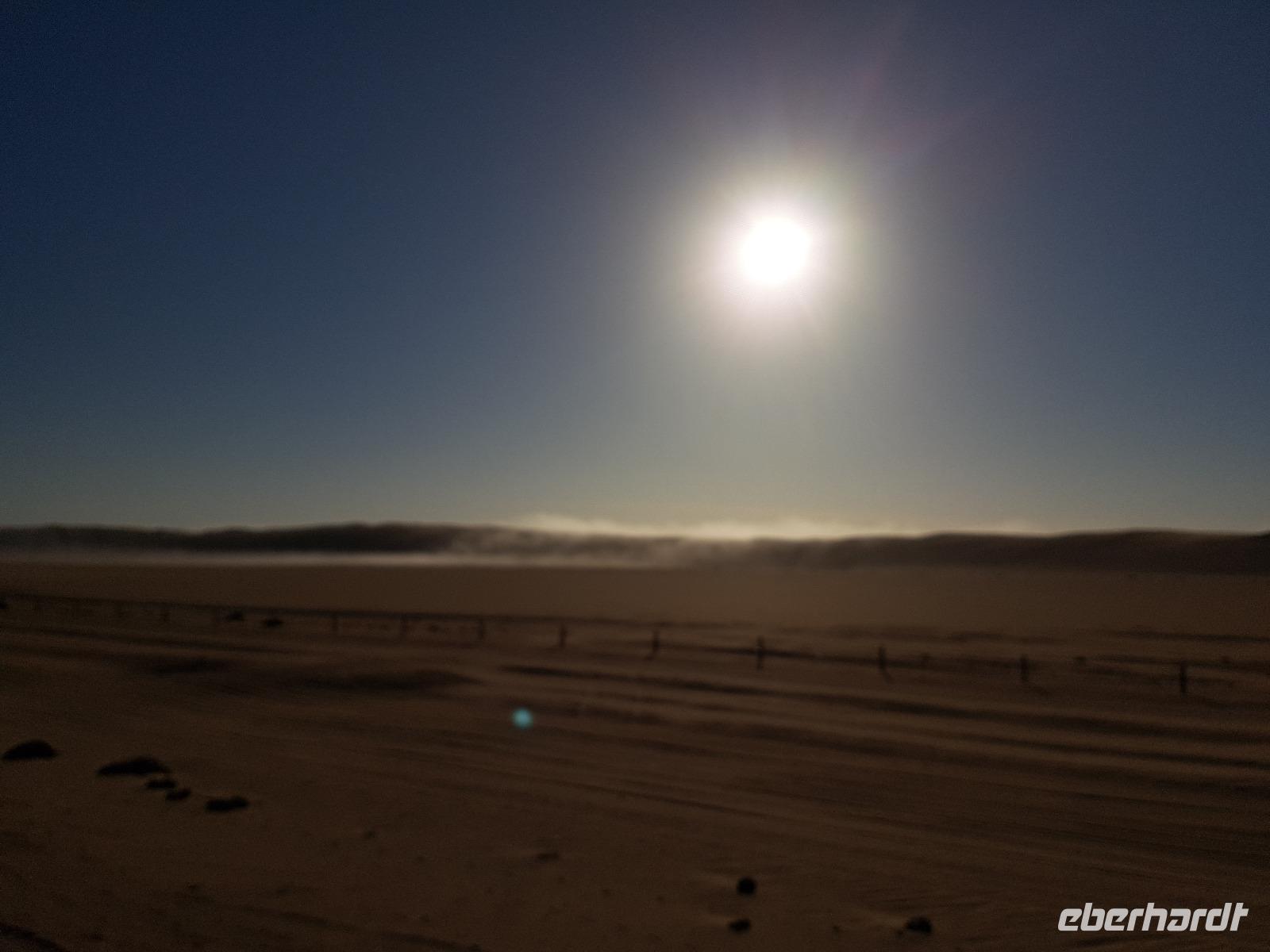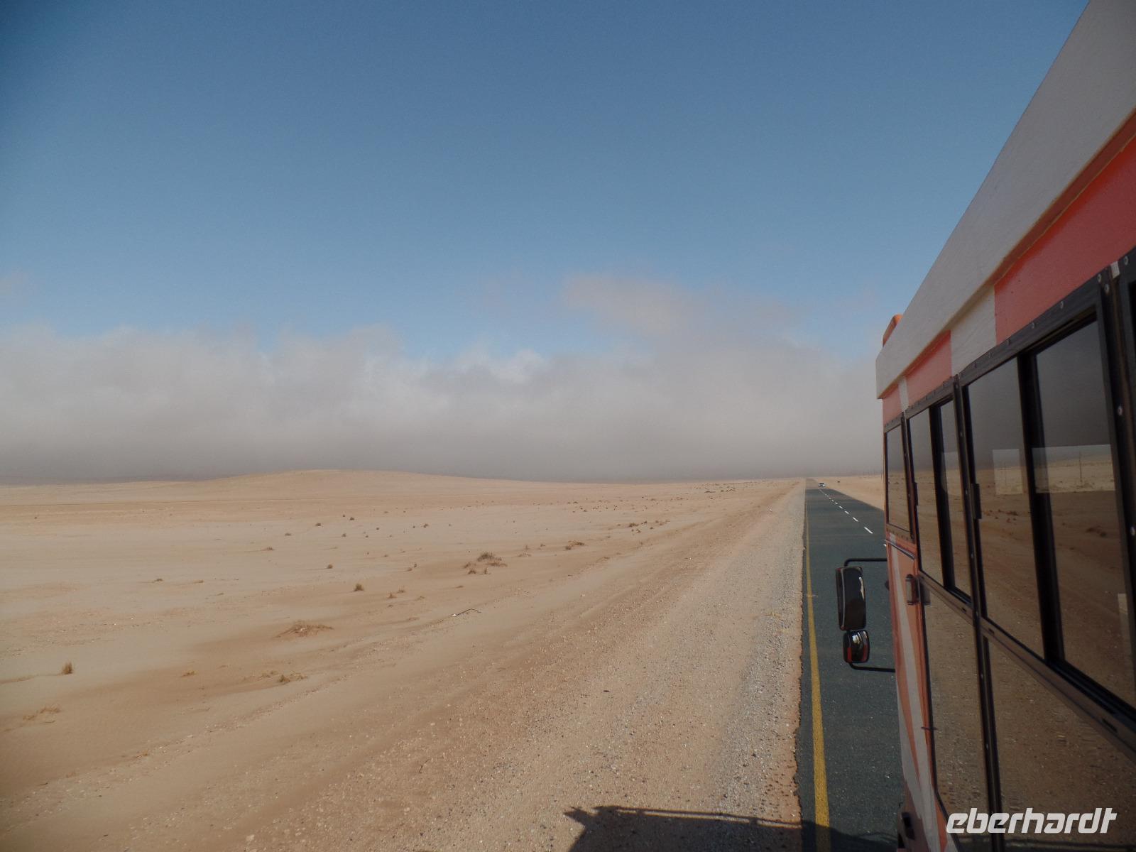 Weiter geht es und ein langer, ewiger, schwarzer Asphaltstreifen bahnt sich seinen geraden Weg durch die Wüste von Ost nach West. Zu beiden Seiten erstreckt sich eine karge, weite Landschaft, die nur durch ein paar Inselberge durchbrochen wird. Unsere Straße führt fast die ganze Zeit parallel zur Eisenbahnlinie. Es war schön anzusehen, wie der Nebel vom Atlantik bis 40 km ins Landesinnere vordrang. Zusammen mit dem Wind, dem Sand über dem Asphalt und den Schienen von der Bahn erschien uns die Fahrt gespenstisch. Wir erlebten sogar einmal kurz einen Sand-und Windsturm.