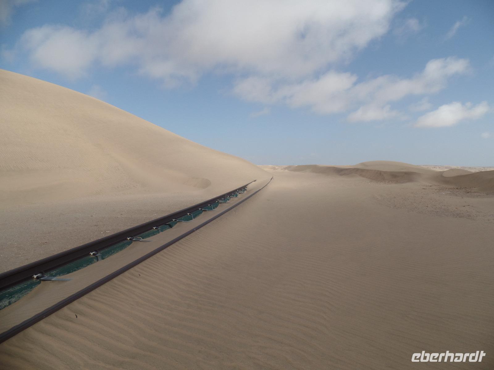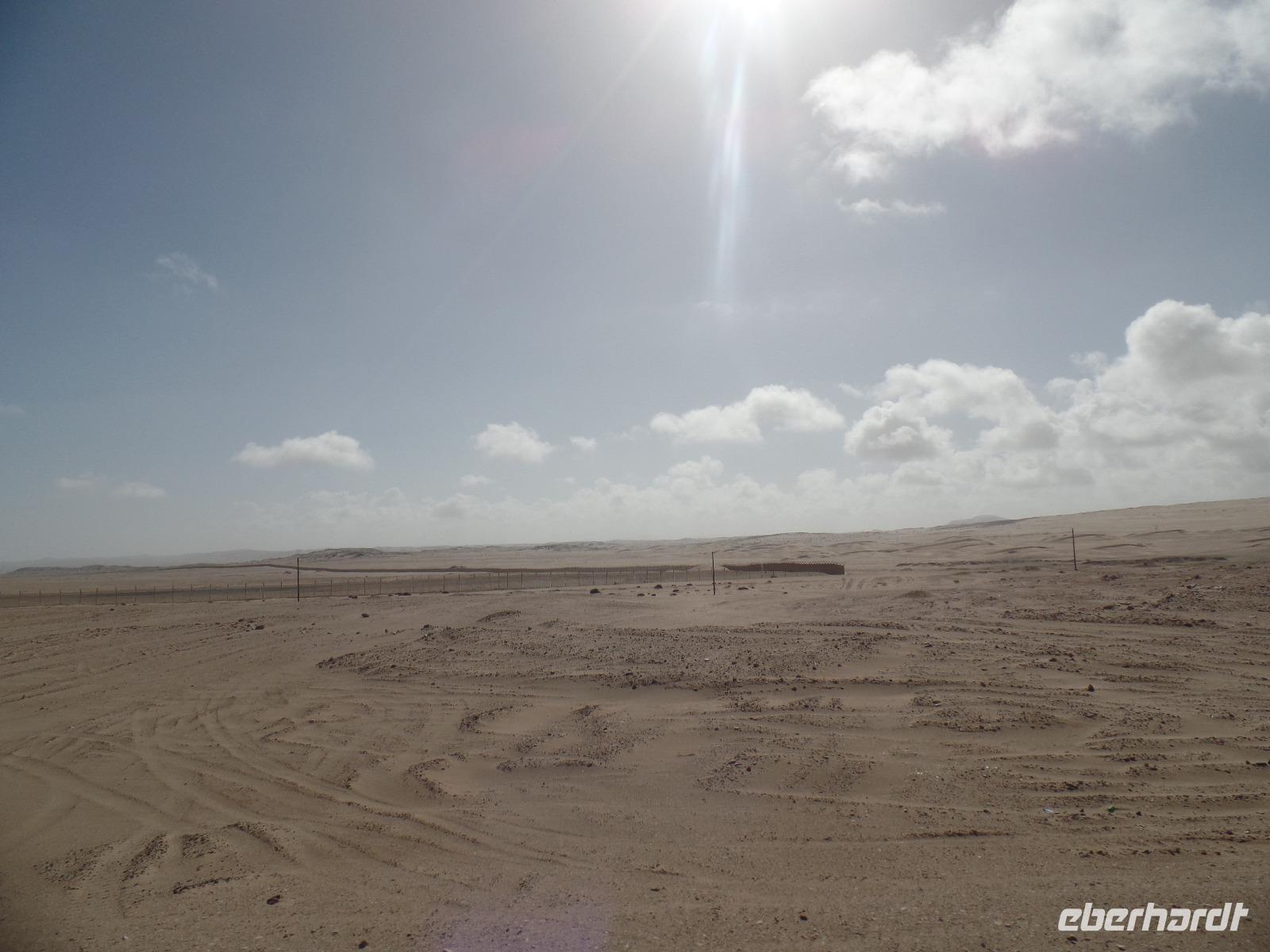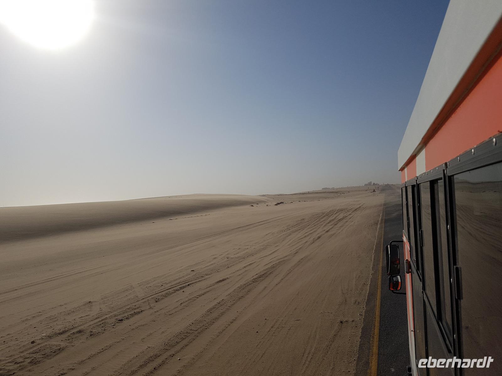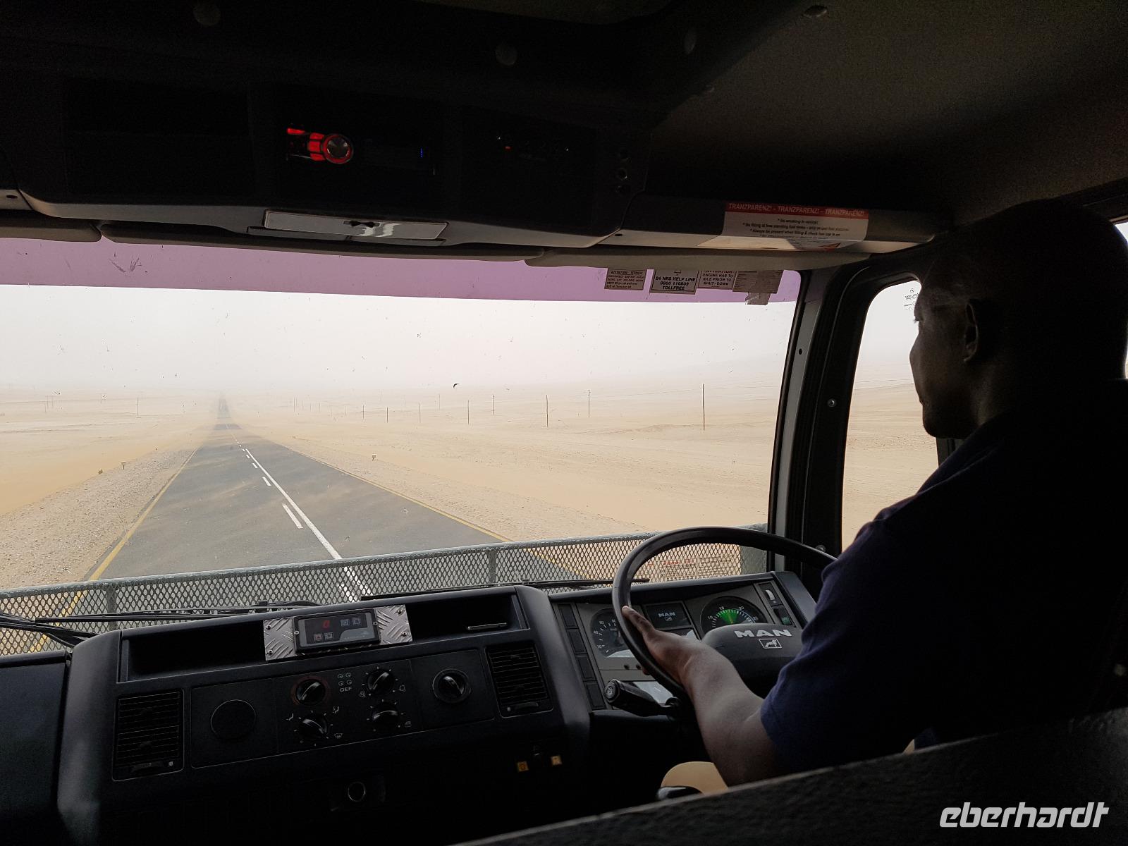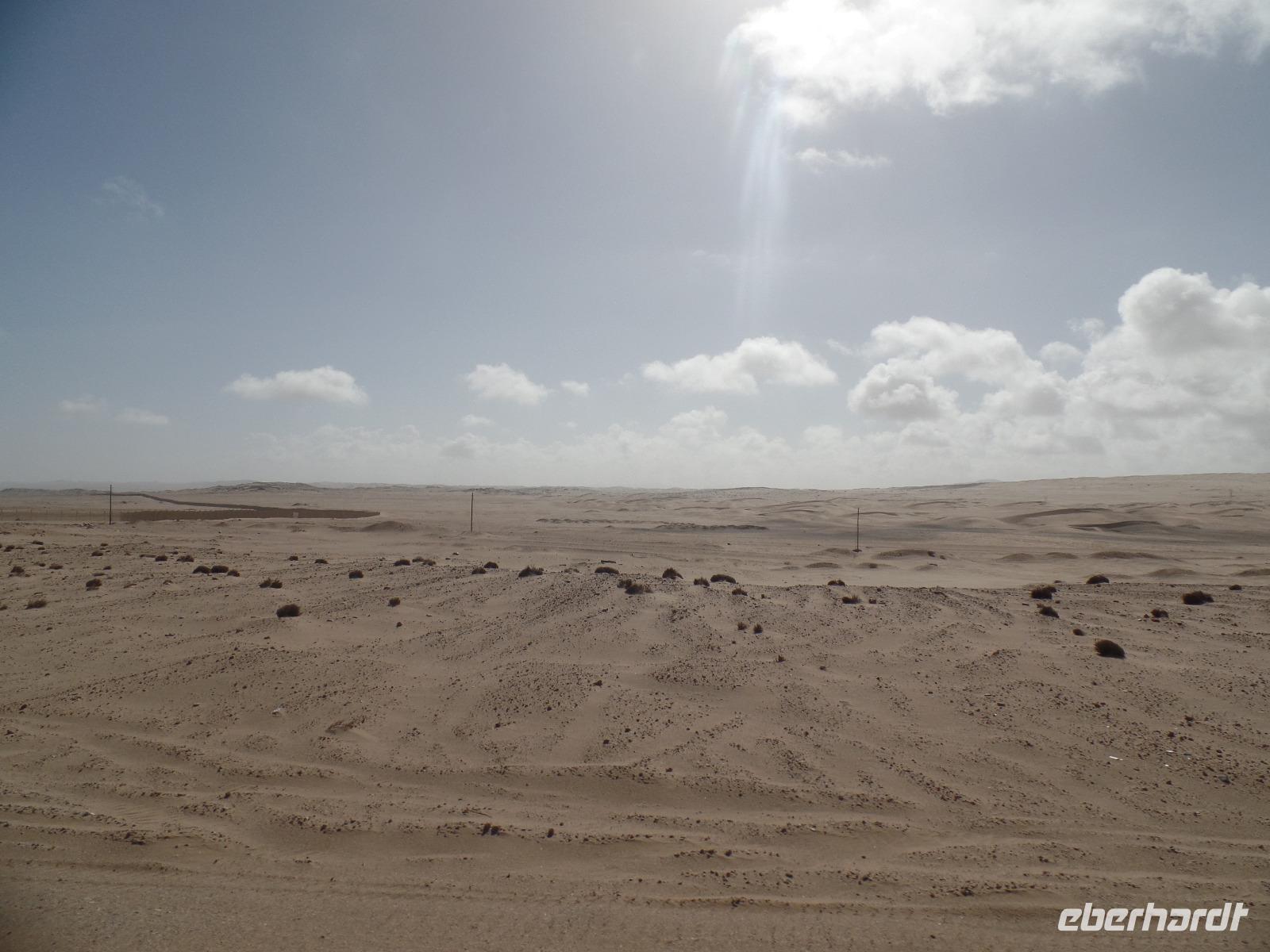 Weiter geht es und ein langer, ewiger, schwarzer Asphaltstreifen bahnt sich seinen geraden Weg durch die Wüste von Ost nach West. Zu beiden Seiten erstreckt sich eine karge, weite Landschaft, die nur durch ein paar Inselberge durchbrochen wird. Unsere Straße führt fast die ganze Zeit parallel zur Eisenbahnlinie. Es war schön anzusehen, wie der Nebel vom Atlantik bis 40 km ins Landesinnere vordrang. Zusammen mit dem Wind, dem Sand über dem Asphalt und den Schienen von der Bahn erschien uns die Fahrt gespenstisch. Wir erlebten sogar einmal kurz einen Sand-und Windsturm.