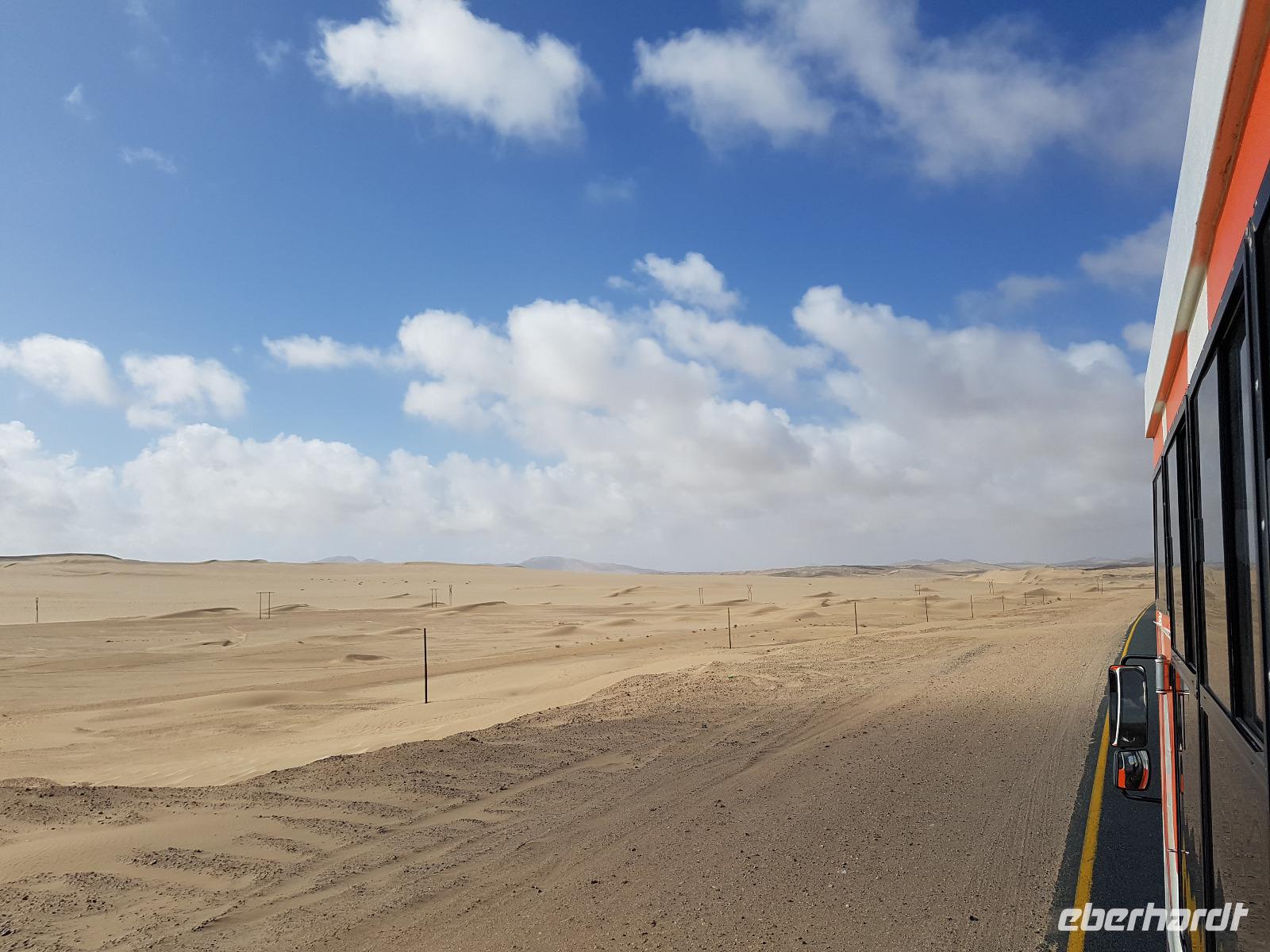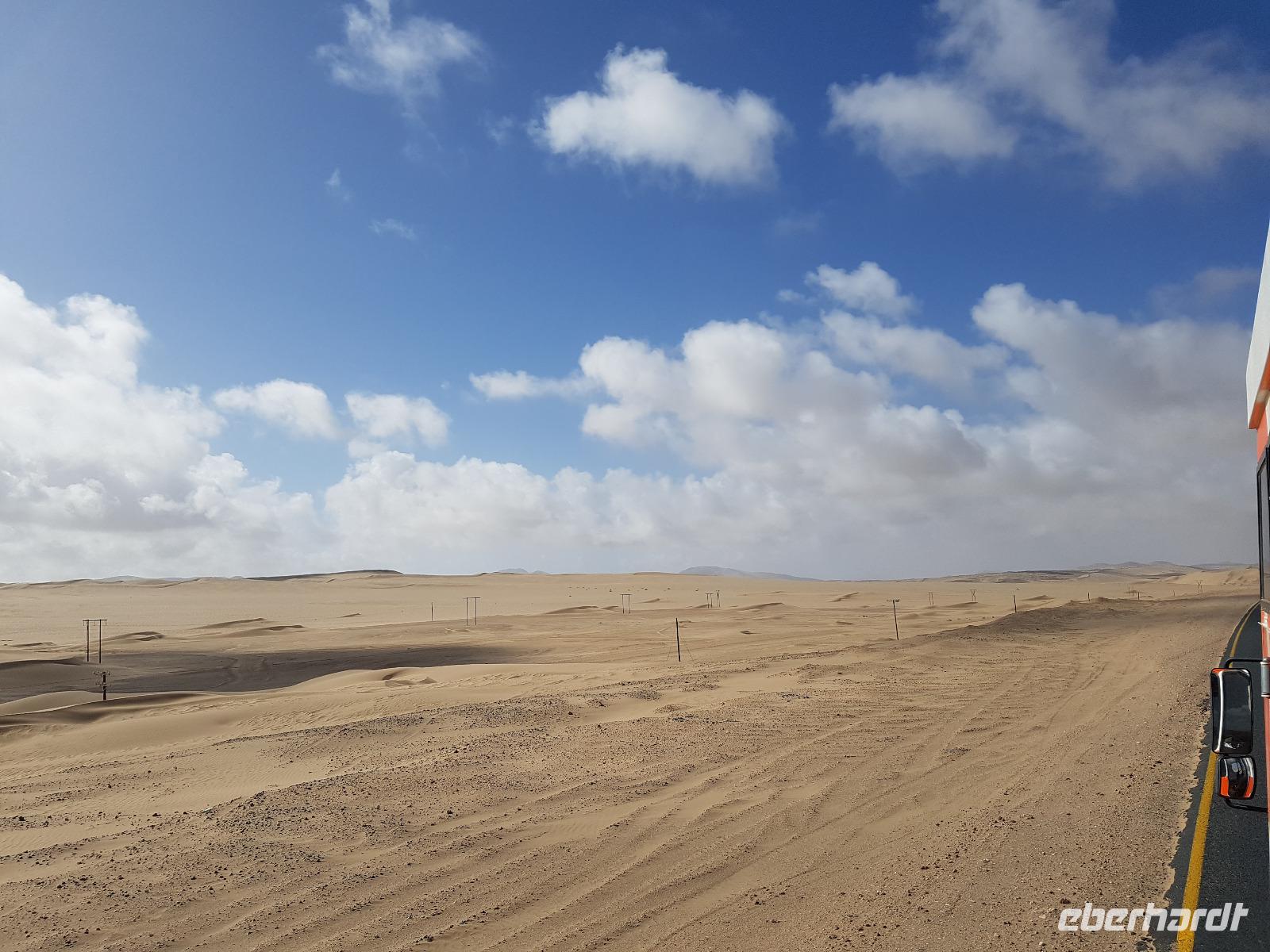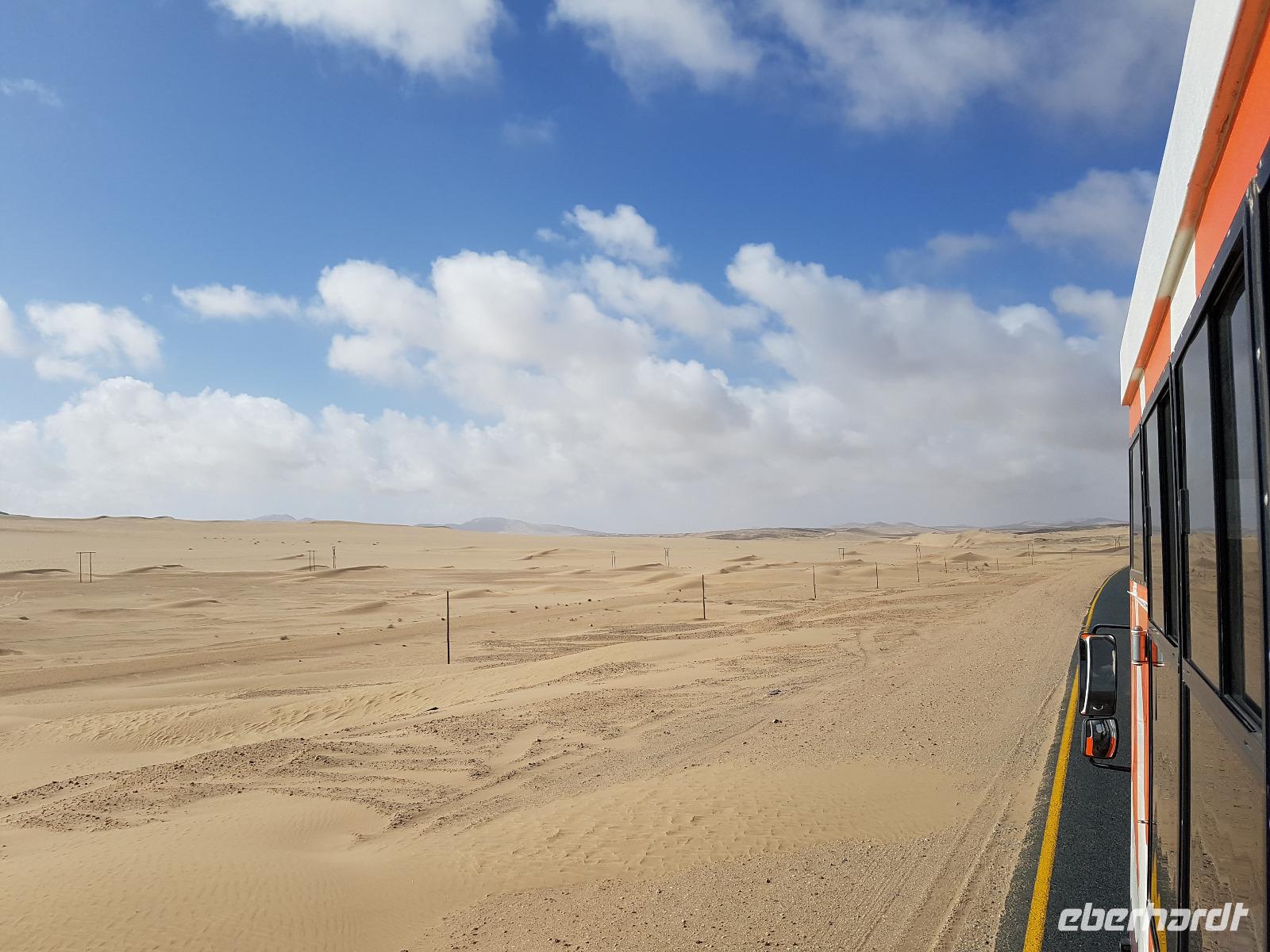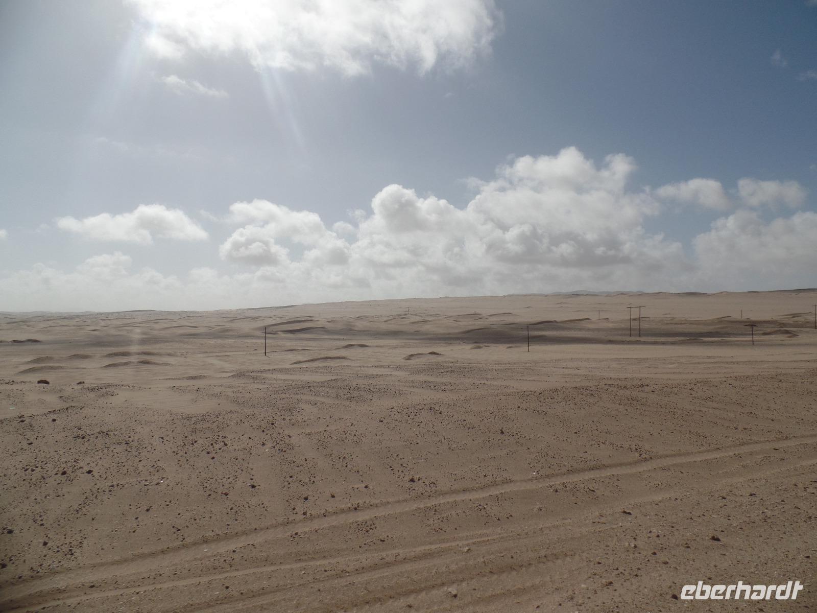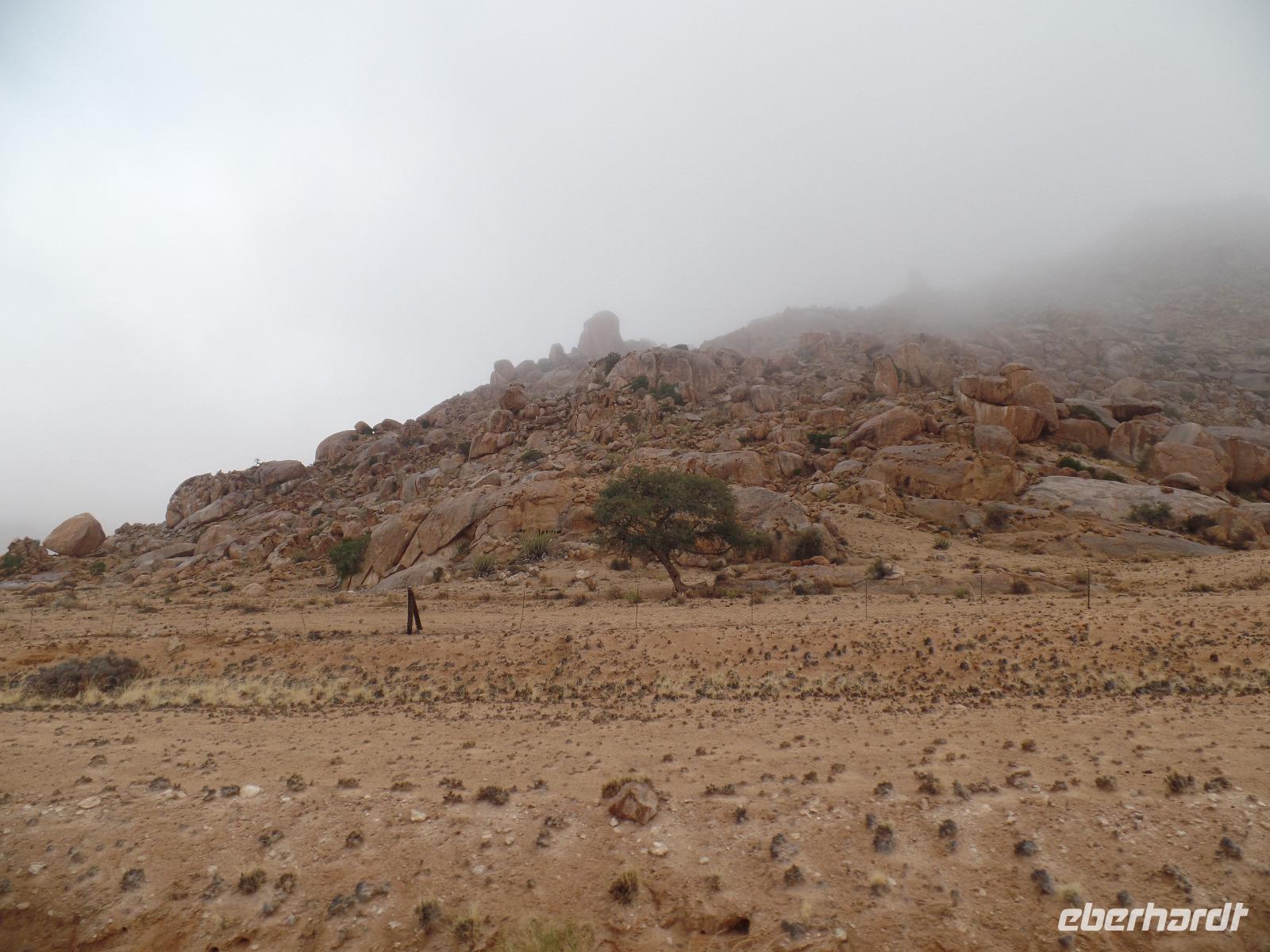 Weiter geht es und ein langer, ewiger, schwarzer Asphaltstreifen bahnt sich seinen geraden Weg durch die Wüste von Ost nach West. Zu beiden Seiten erstreckt sich eine karge, weite Landschaft, die nur durch ein paar Inselberge durchbrochen wird. Unsere Straße führt fast die ganze Zeit parallel zur Eisenbahnlinie. Es war schön anzusehen, wie der Nebel vom Atlantik bis 40 km ins Landesinnere vordrang. Zusammen mit dem Wind, dem Sand über dem Asphalt und den Schienen von der Bahn erschien uns die Fahrt gespenstisch. Wir erlebten sogar einmal kurz einen Sand-und Windsturm.