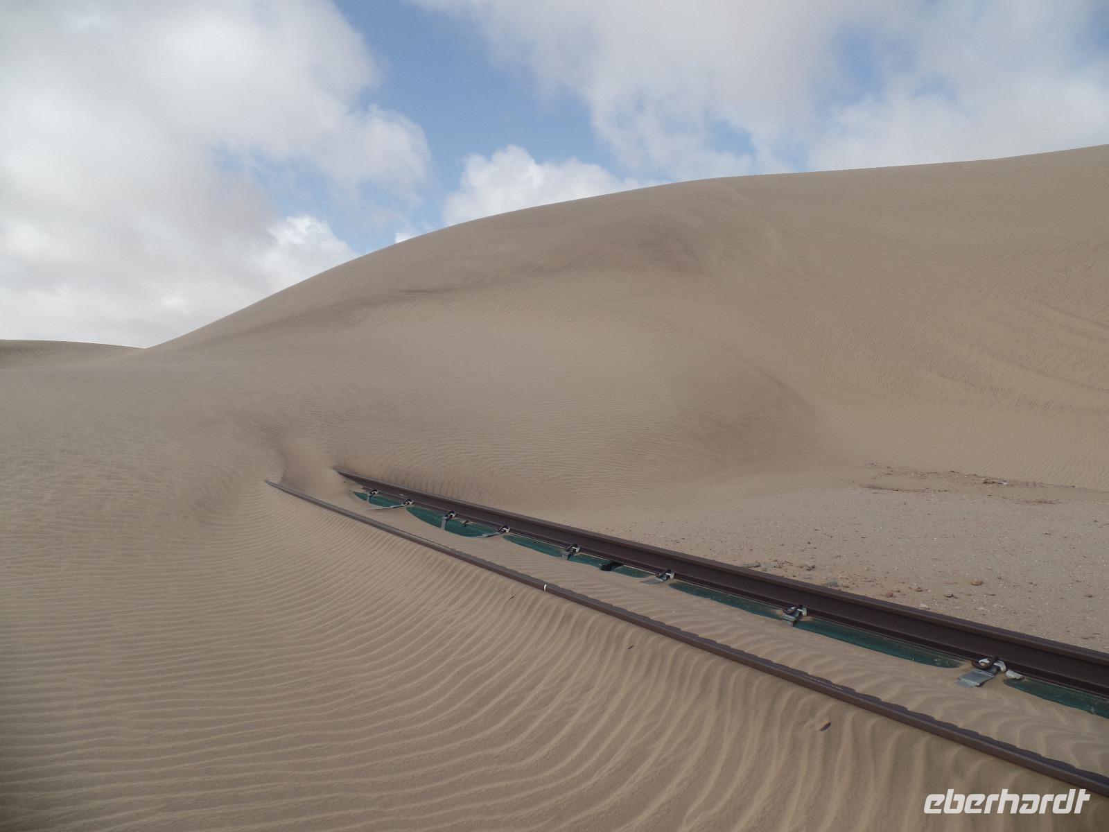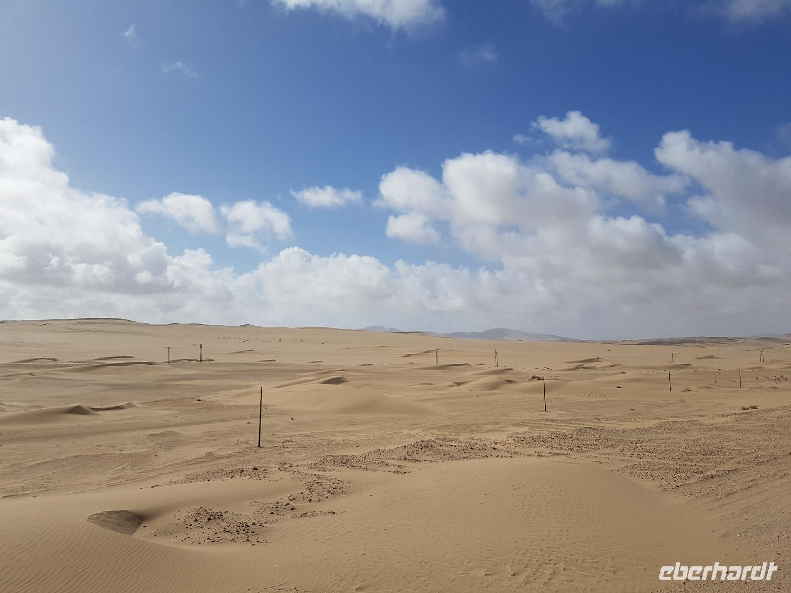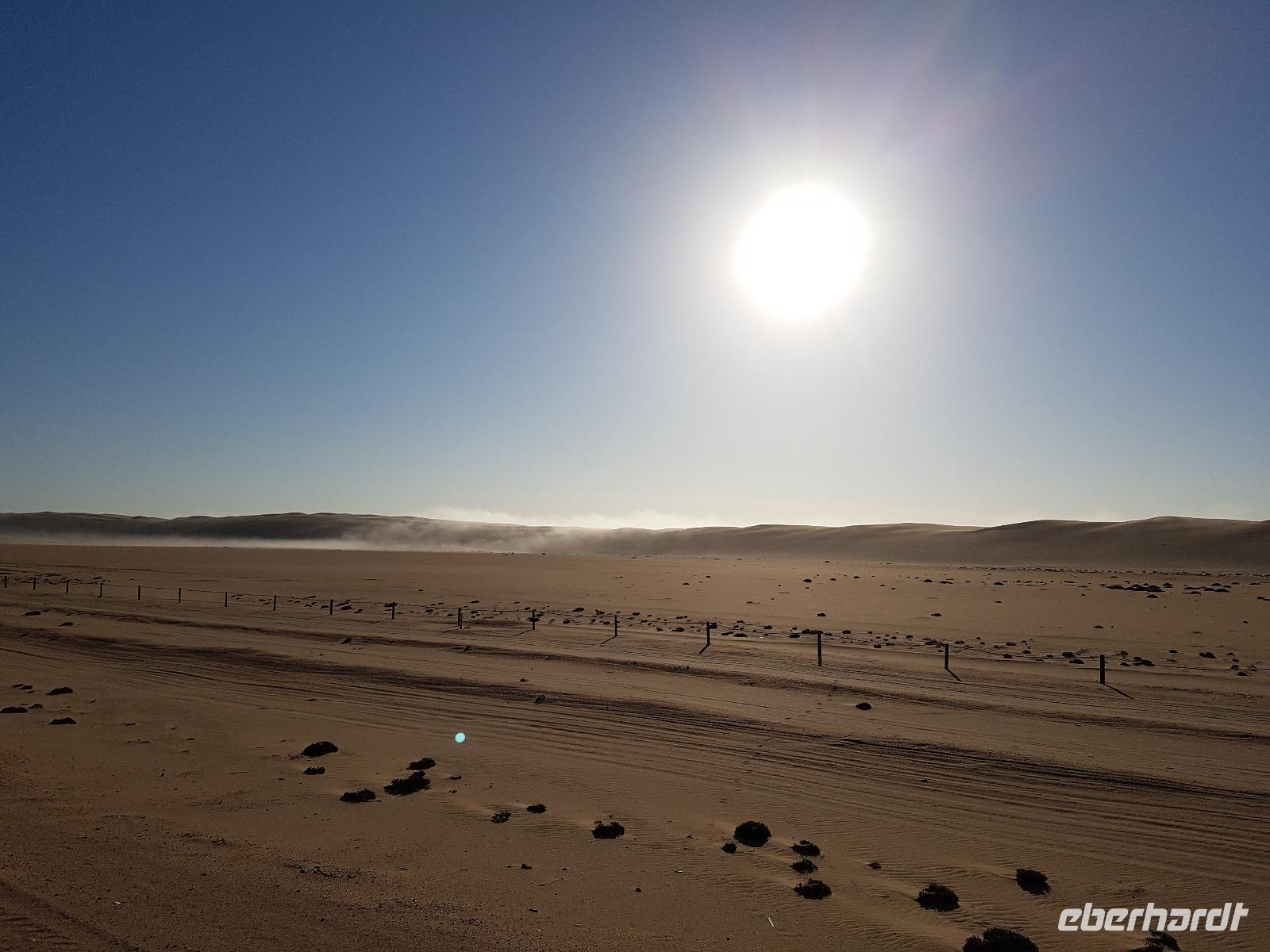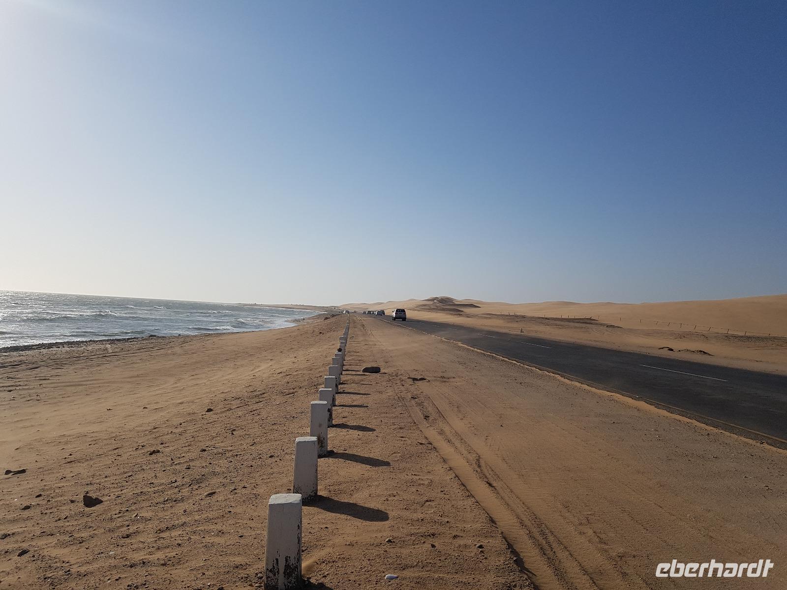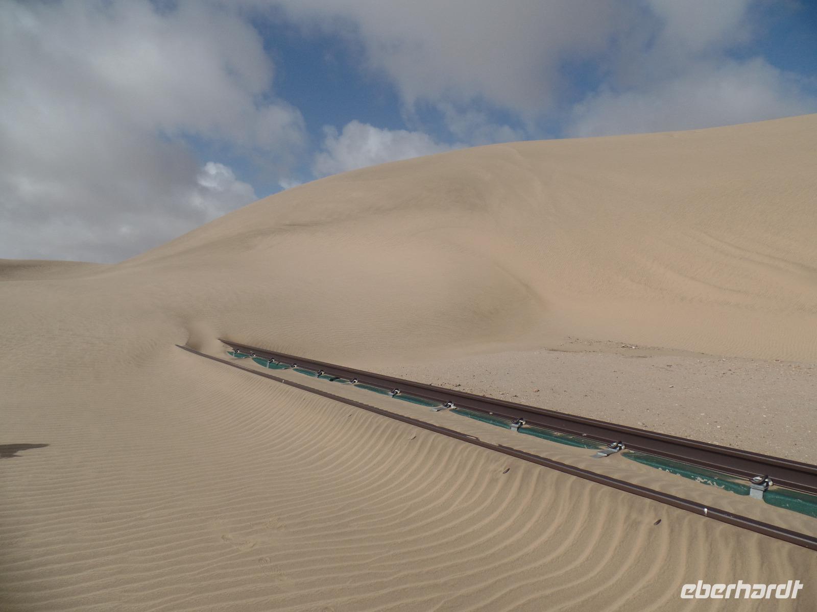 Weiter geht es und ein langer, ewiger, schwarzer Asphaltstreifen bahnt sich seinen geraden Weg durch die Wüste von Ost nach West. Zu beiden Seiten erstreckt sich eine karge, weite Landschaft, die nur durch ein paar Inselberge durchbrochen wird. Unsere Straße führt fast die ganze Zeit parallel zur Eisenbahnlinie. Es war schön anzusehen, wie der Nebel vom Atlantik bis 40 km ins Landesinnere vordrang. Zusammen mit dem Wind, dem Sand über dem Asphalt und den Schienen von der Bahn erschien uns die Fahrt gespenstisch. Wir erlebten sogar einmal kurz einen Sand-und Windsturm.