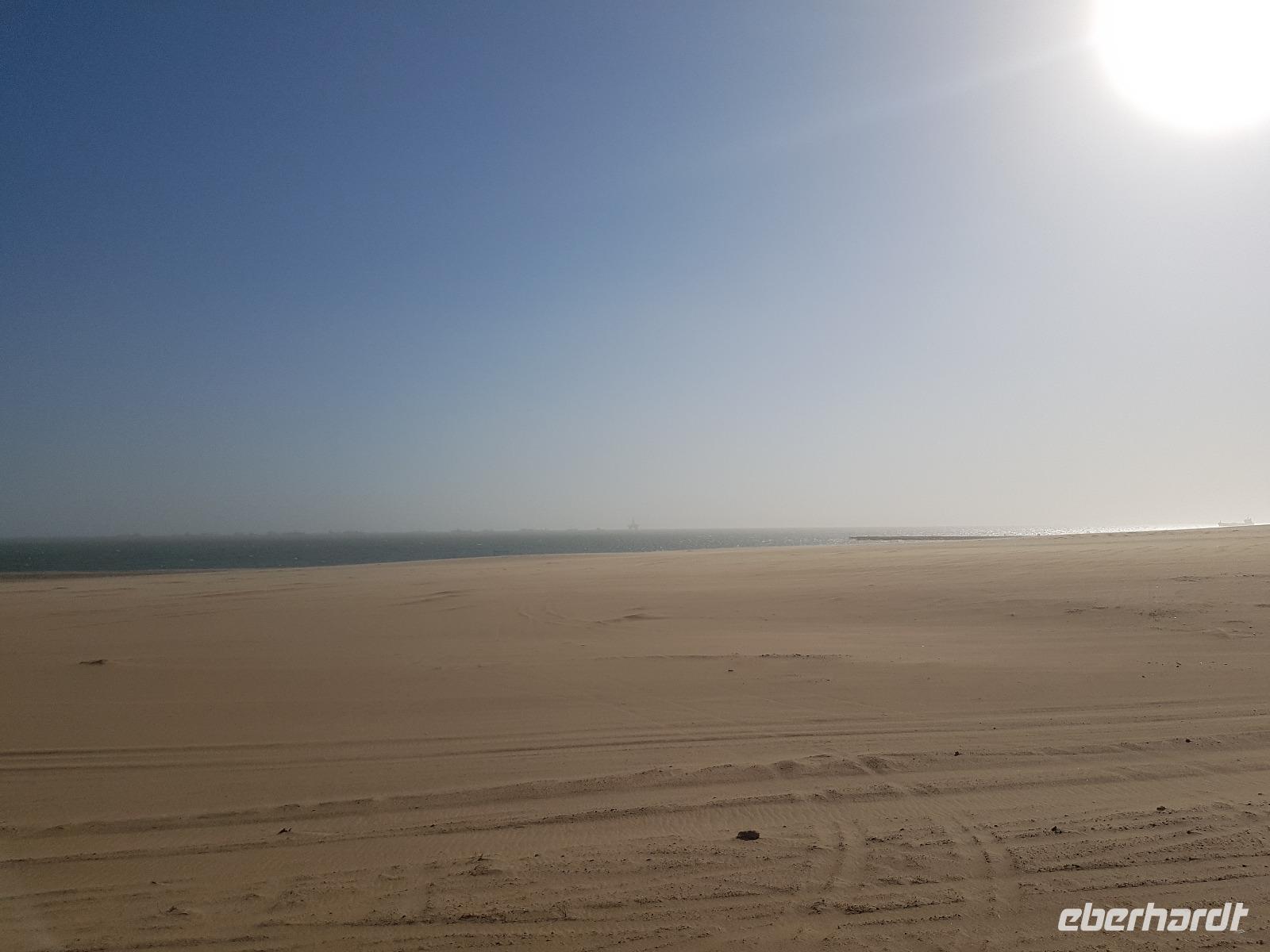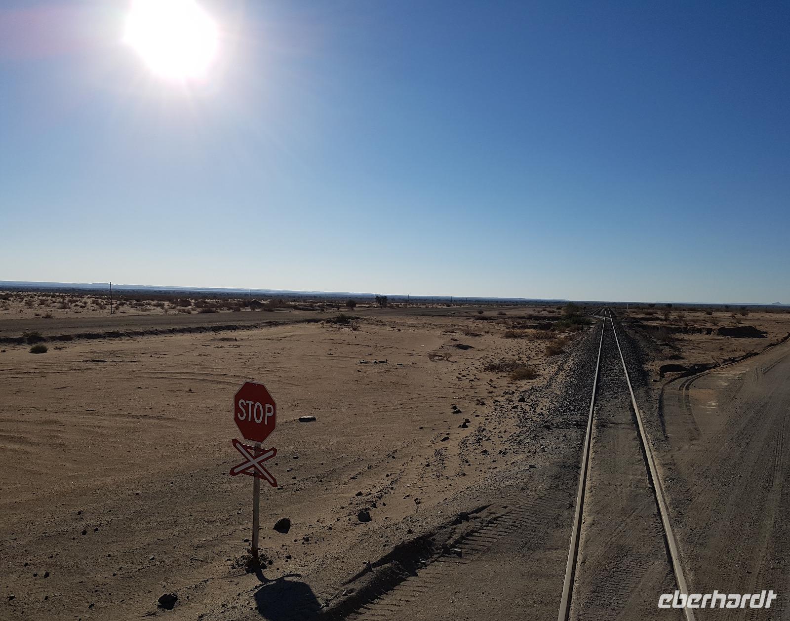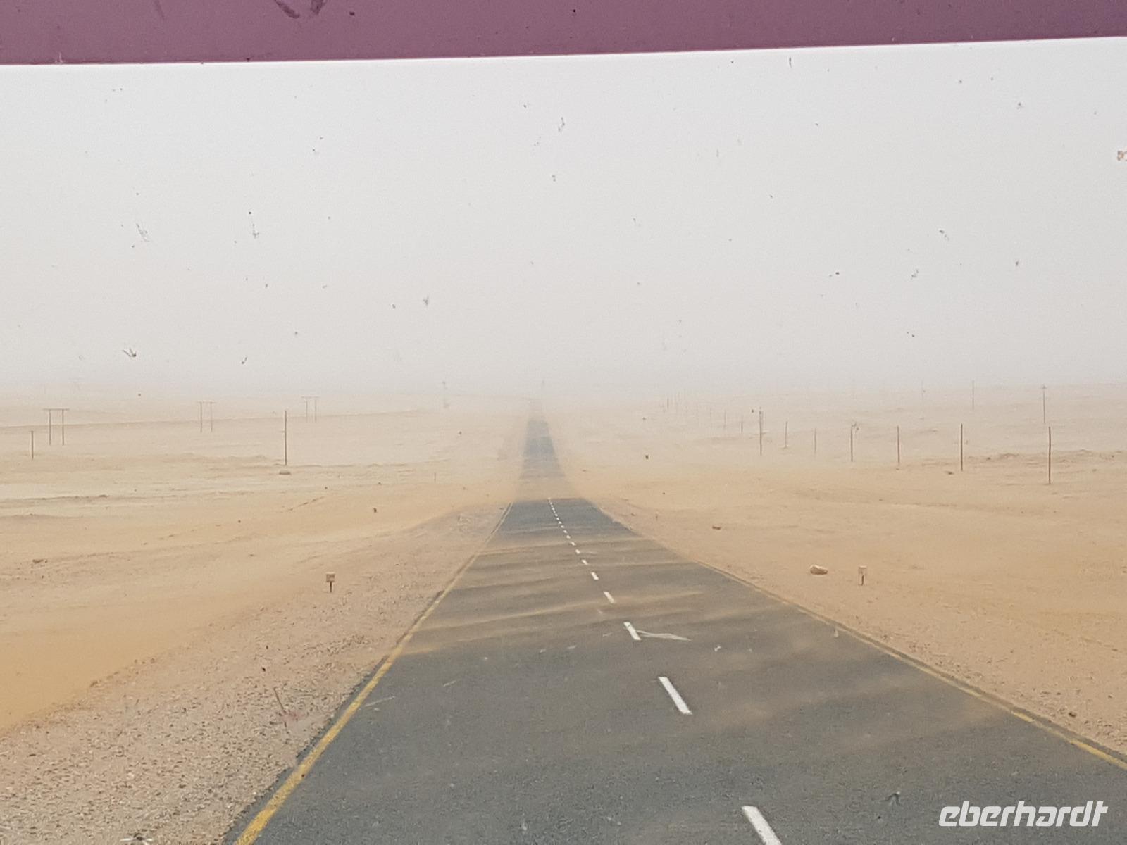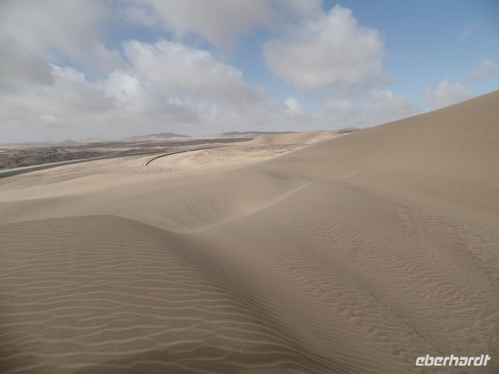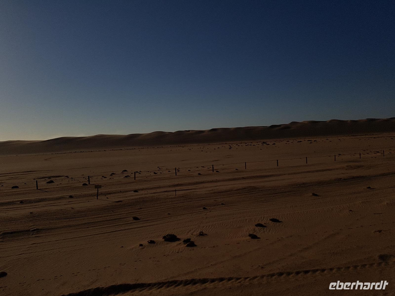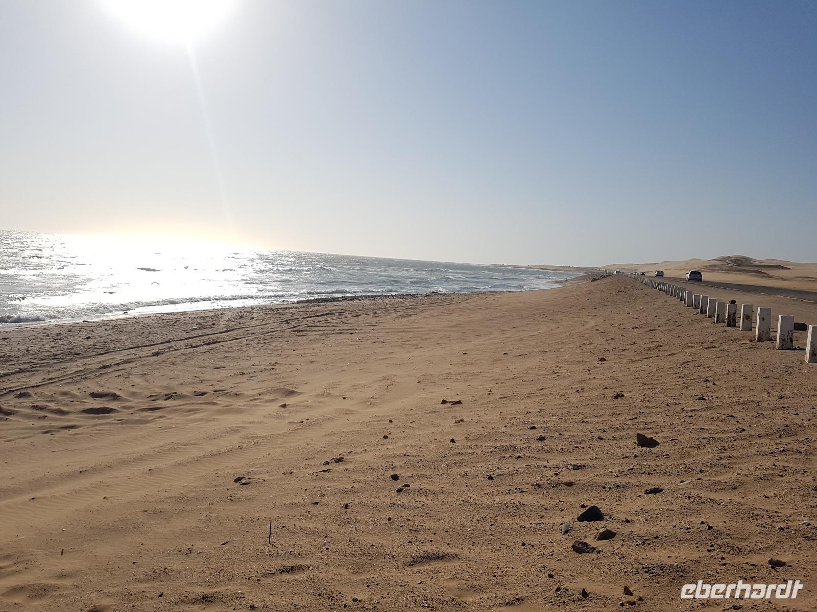 Weiter geht es und ein langer, ewiger, schwarzer Asphaltstreifen bahnt sich seinen geraden Weg durch die Wüste von Ost nach West. Zu beiden Seiten erstreckt sich eine karge, weite Landschaft, die nur durch ein paar Inselberge durchbrochen wird. Unsere Straße führt fast die ganze Zeit parallel zur Eisenbahnlinie. Es war schön anzusehen, wie der Nebel vom Atlantik bis 40 km ins Landesinnere vordrang. Zusammen mit dem Wind, dem Sand über dem Asphalt und den Schienen von der Bahn erschien uns die Fahrt gespenstisch. Wir erlebten sogar einmal kurz einen Sand-und Windsturm.
