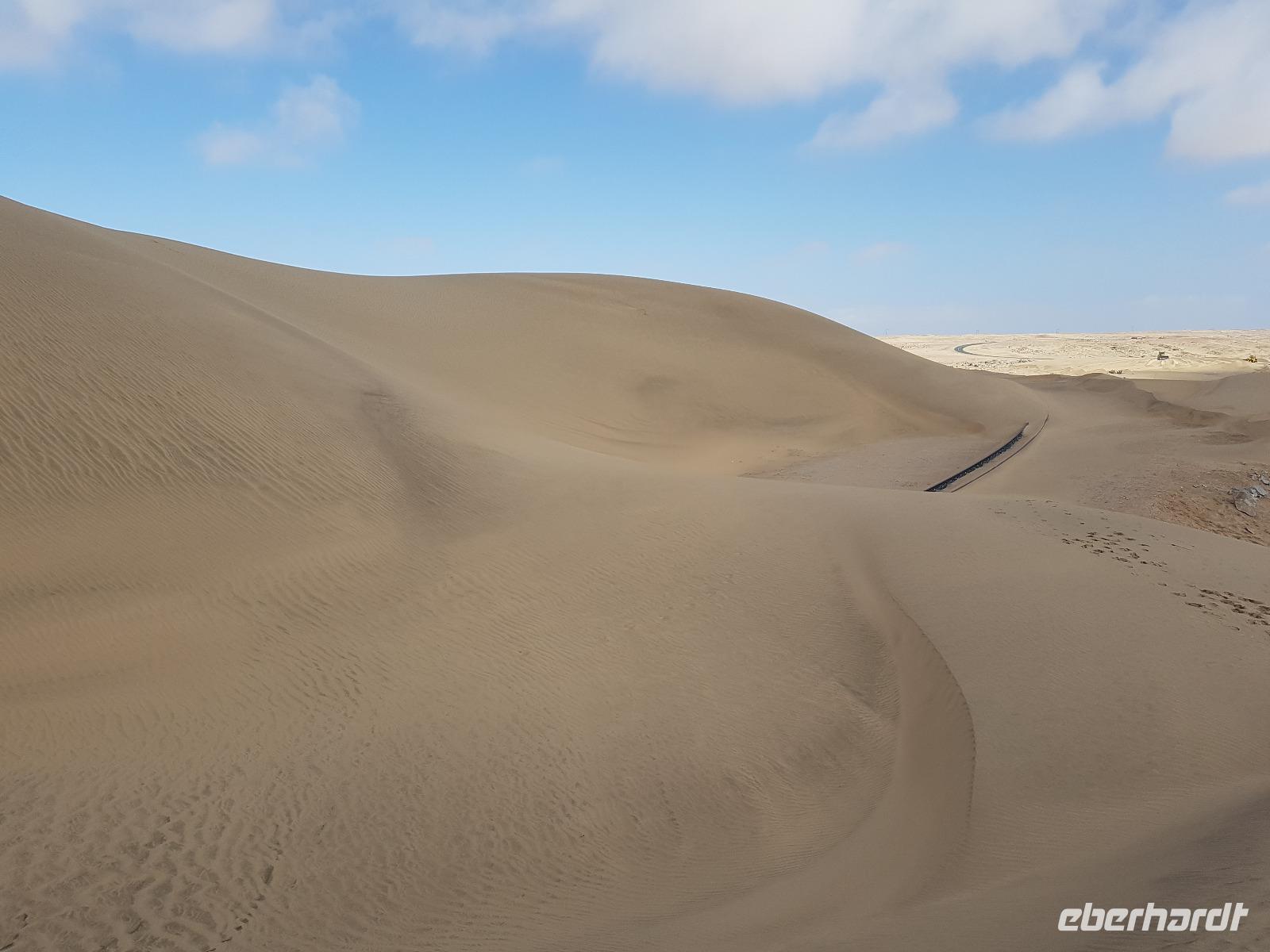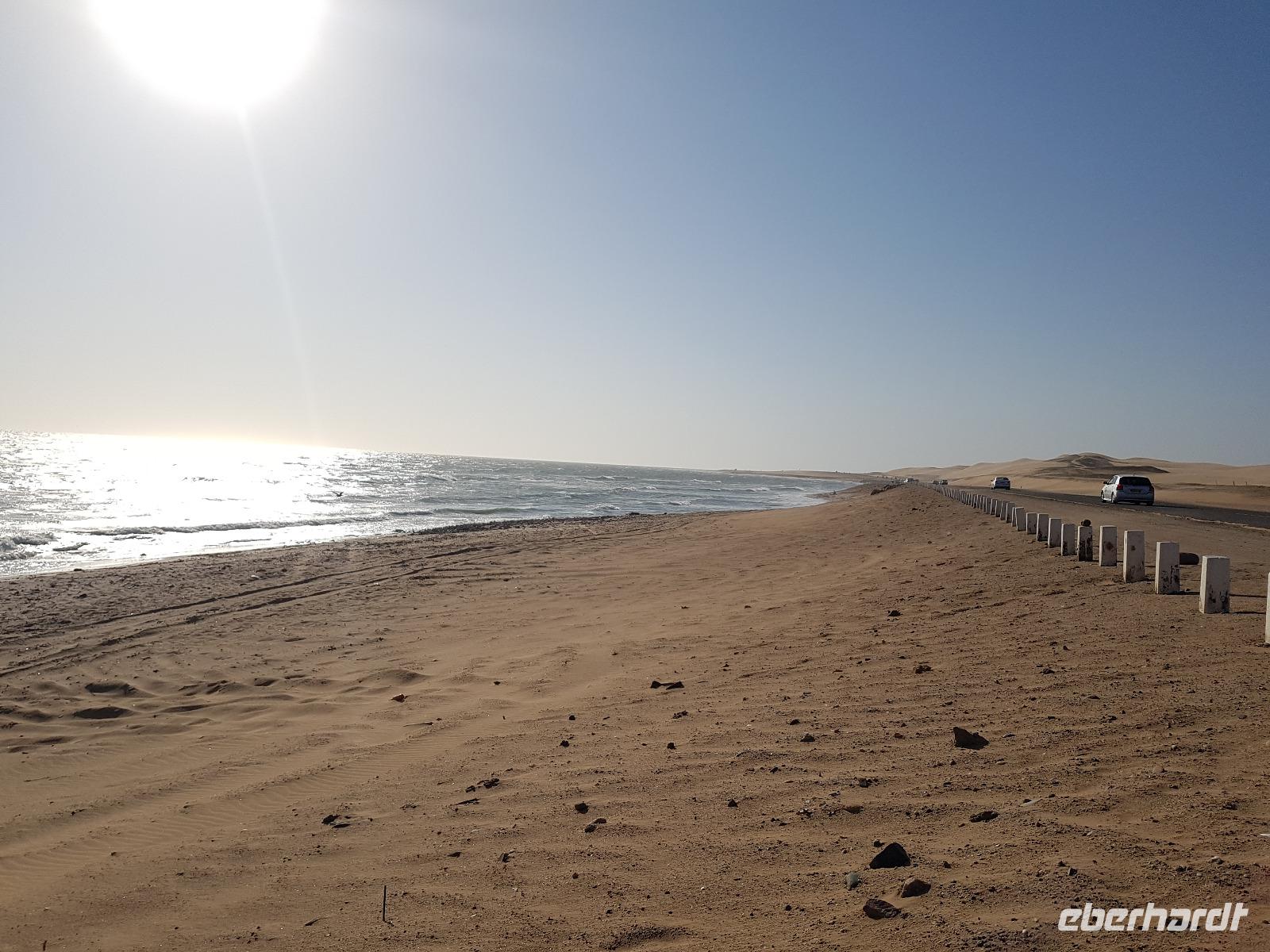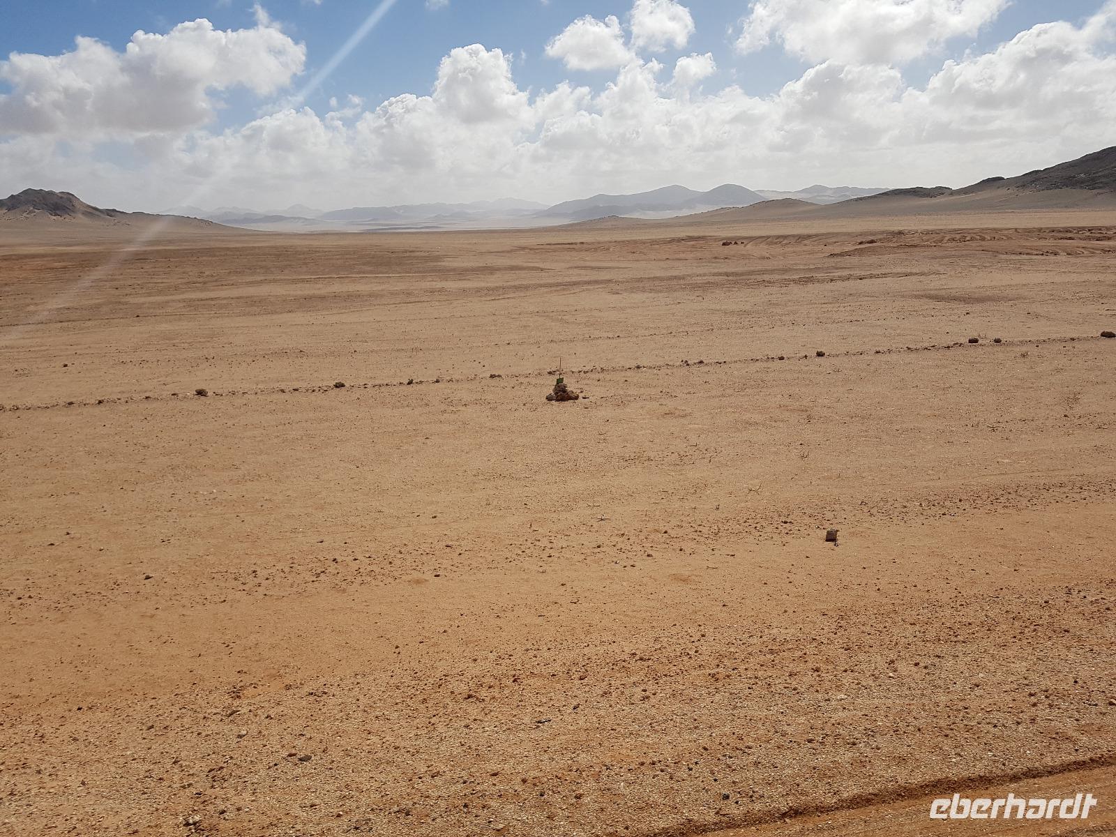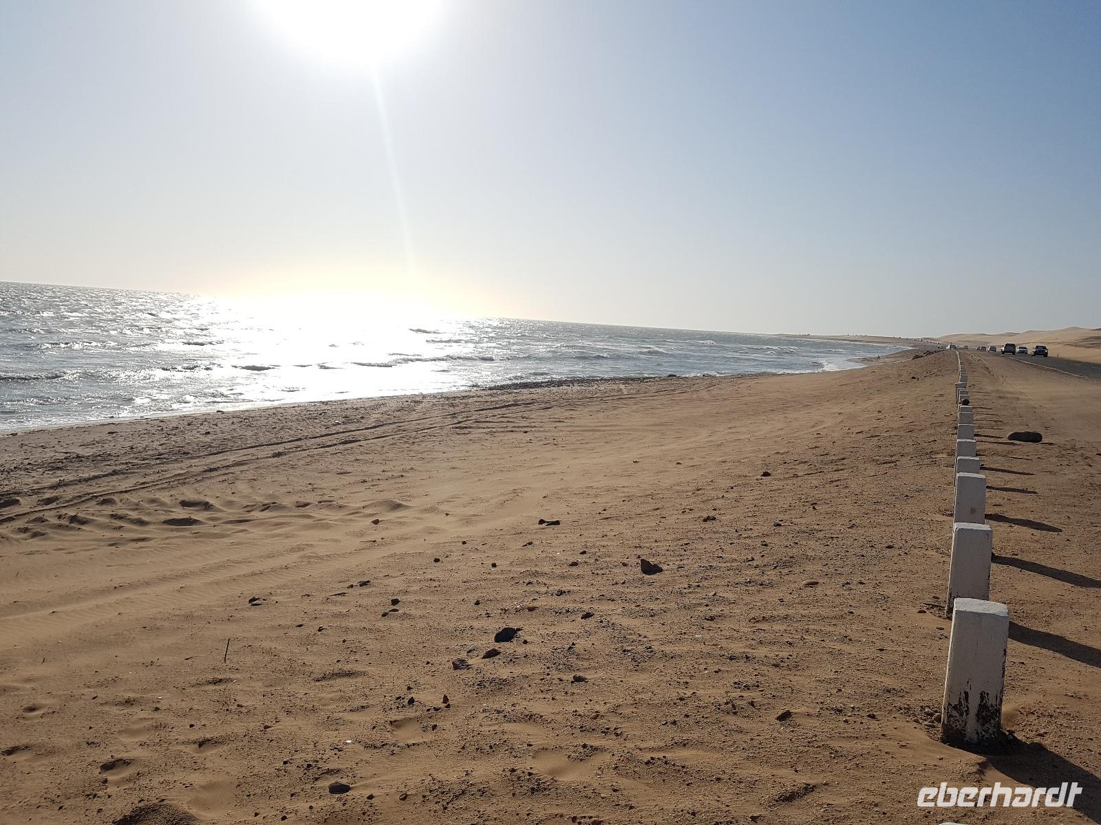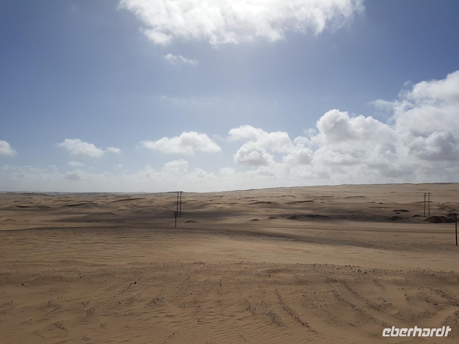 Weiter geht es und ein langer, ewiger, schwarzer Asphaltstreifen bahnt sich seinen geraden Weg durch die Wüste von Ost nach West. Zu beiden Seiten erstreckt sich eine karge, weite Landschaft, die nur durch ein paar Inselberge durchbrochen wird. Unsere Straße führt fast die ganze Zeit parallel zur Eisenbahnlinie. Es war schön anzusehen, wie der Nebel vom Atlantik bis 40 km ins Landesinnere vordrang. Zusammen mit dem Wind, dem Sand über dem Asphalt und den Schienen von der Bahn erschien uns die Fahrt gespenstisch. Wir erlebten sogar einmal kurz einen Sand-und Windsturm.