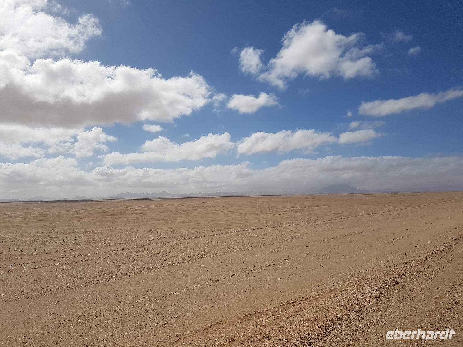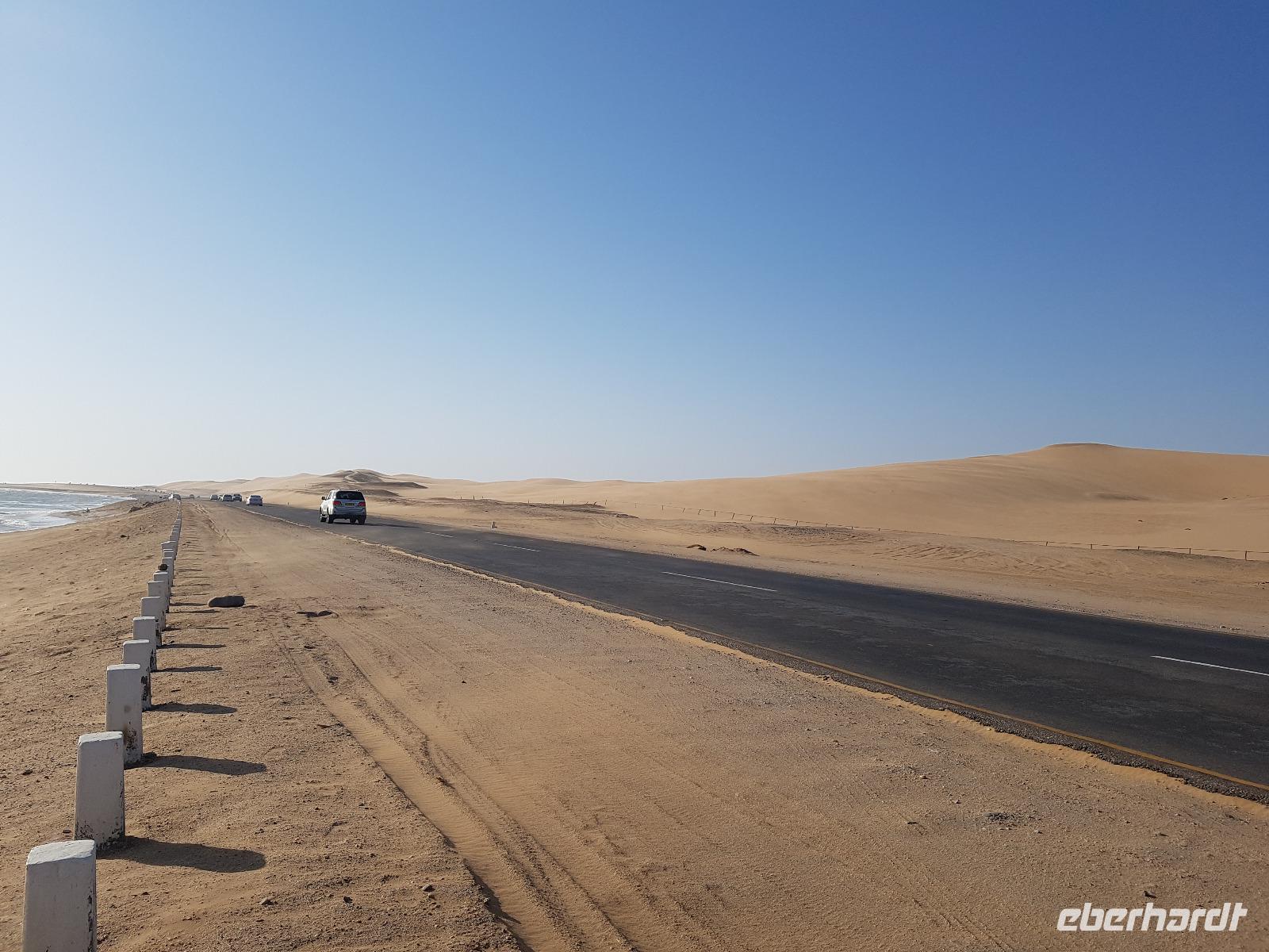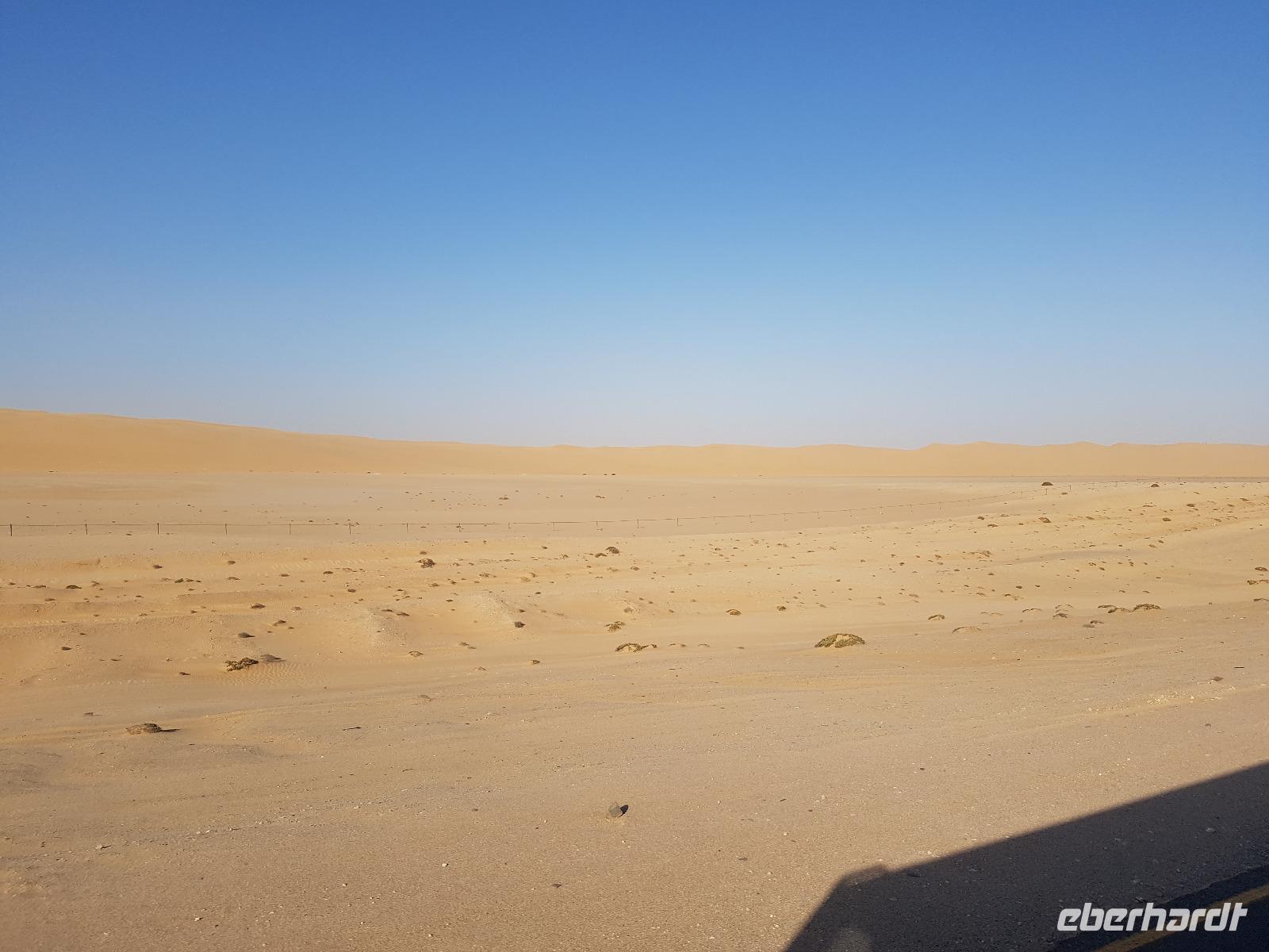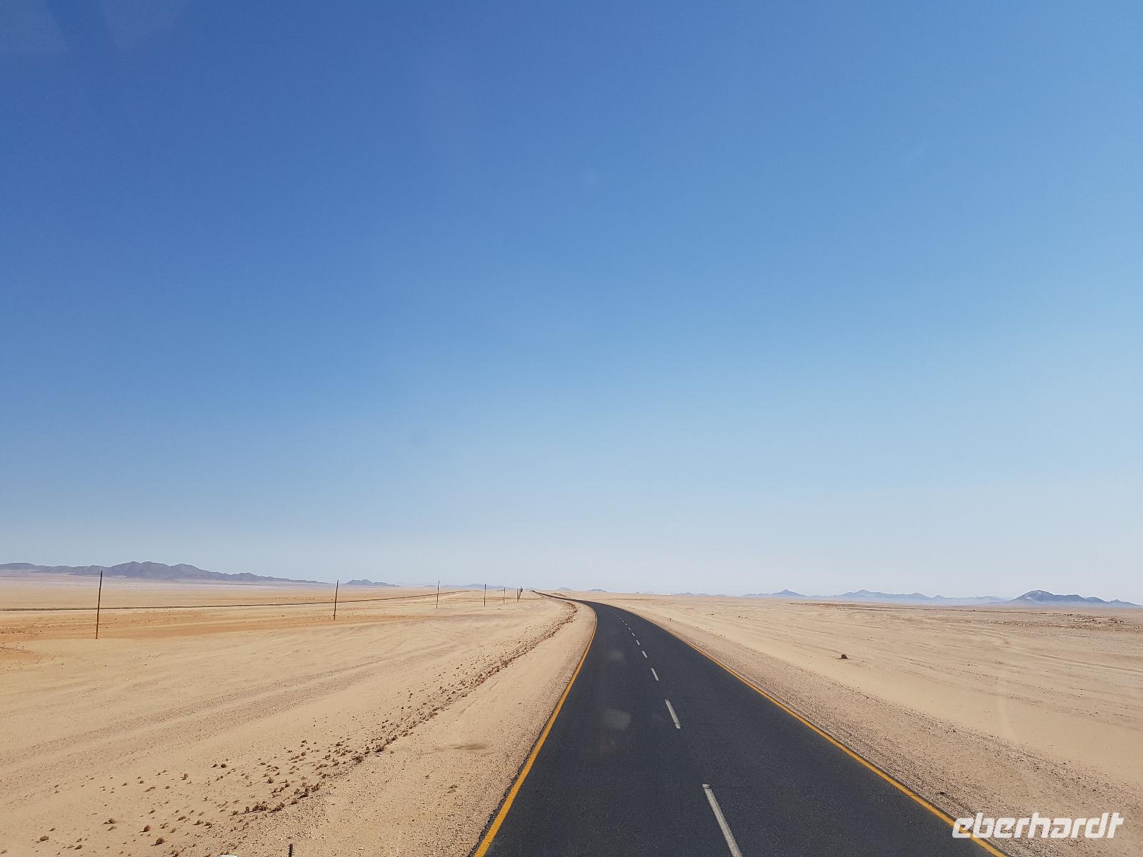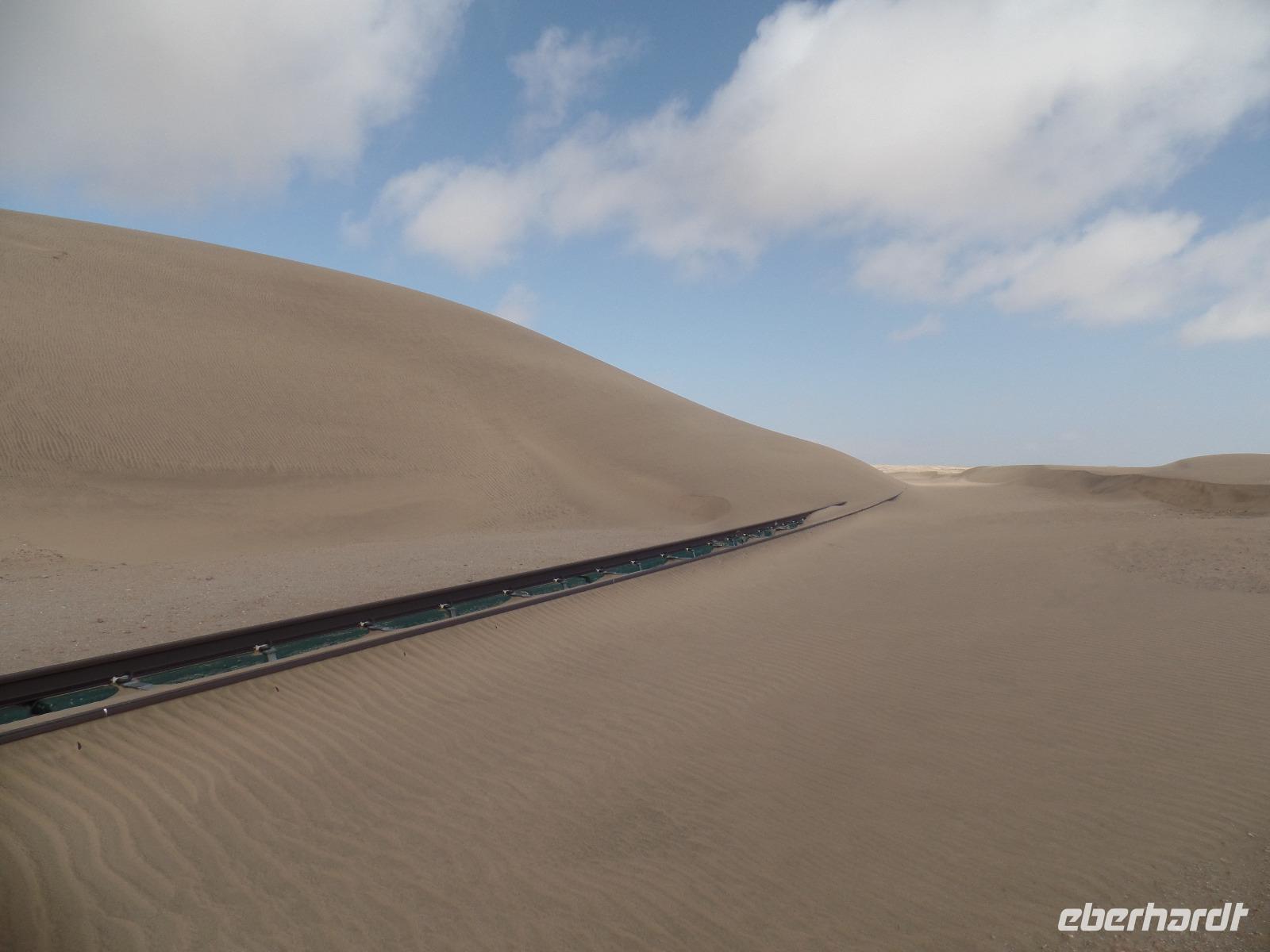 Weiter geht es und ein langer, ewiger, schwarzer Asphaltstreifen bahnt sich seinen geraden Weg durch die Wüste von Ost nach West. Zu beiden Seiten erstreckt sich eine karge, weite Landschaft, die nur durch ein paar Inselberge durchbrochen wird. Unsere Straße führt fast die ganze Zeit parallel zur Eisenbahnlinie. Es war schön anzusehen, wie der Nebel vom Atlantik bis 40 km ins Landesinnere vordrang. Zusammen mit dem Wind, dem Sand über dem Asphalt und den Schienen von der Bahn erschien uns die Fahrt gespenstisch. Wir erlebten sogar einmal kurz einen Sand-und Windsturm.