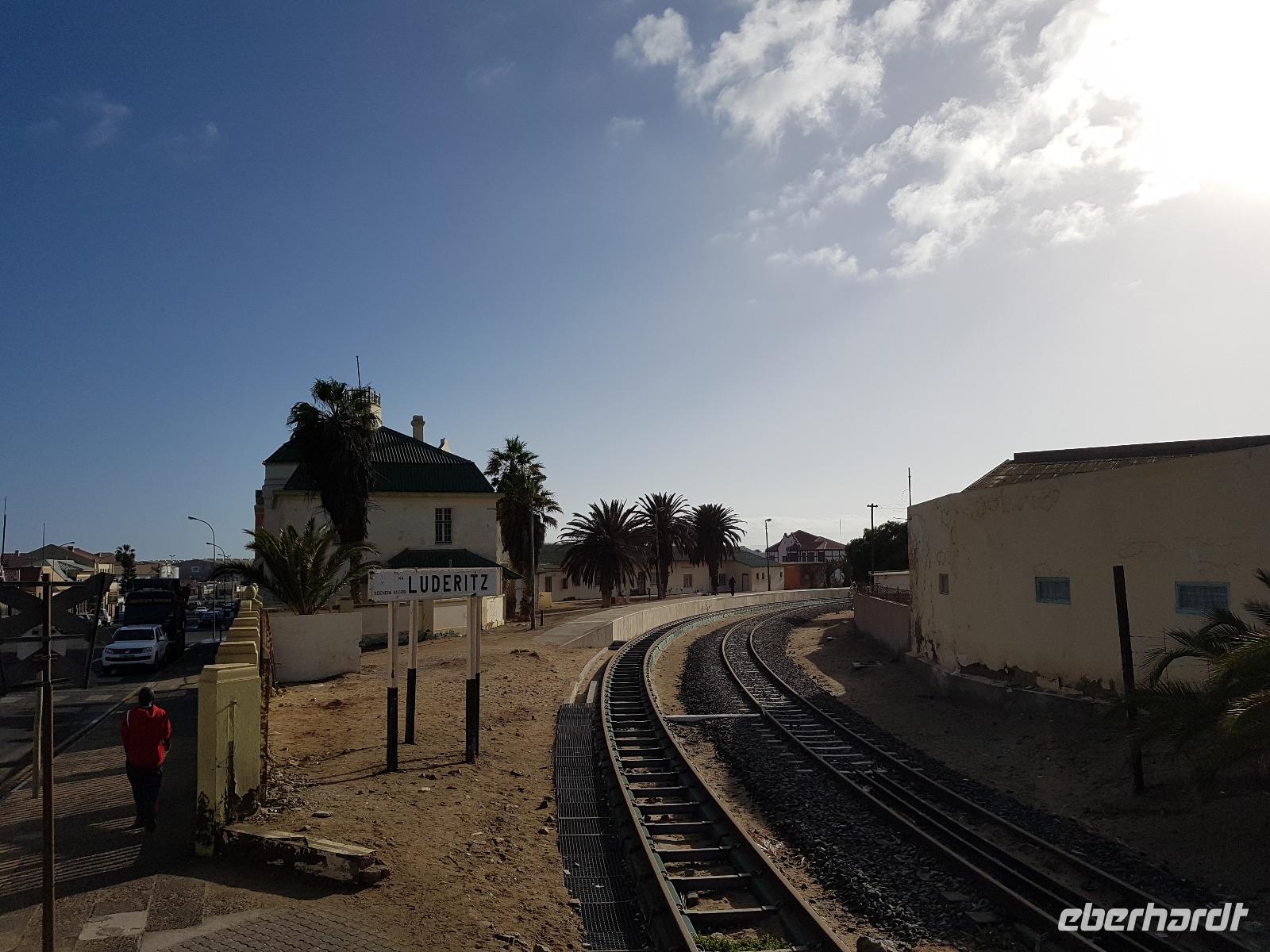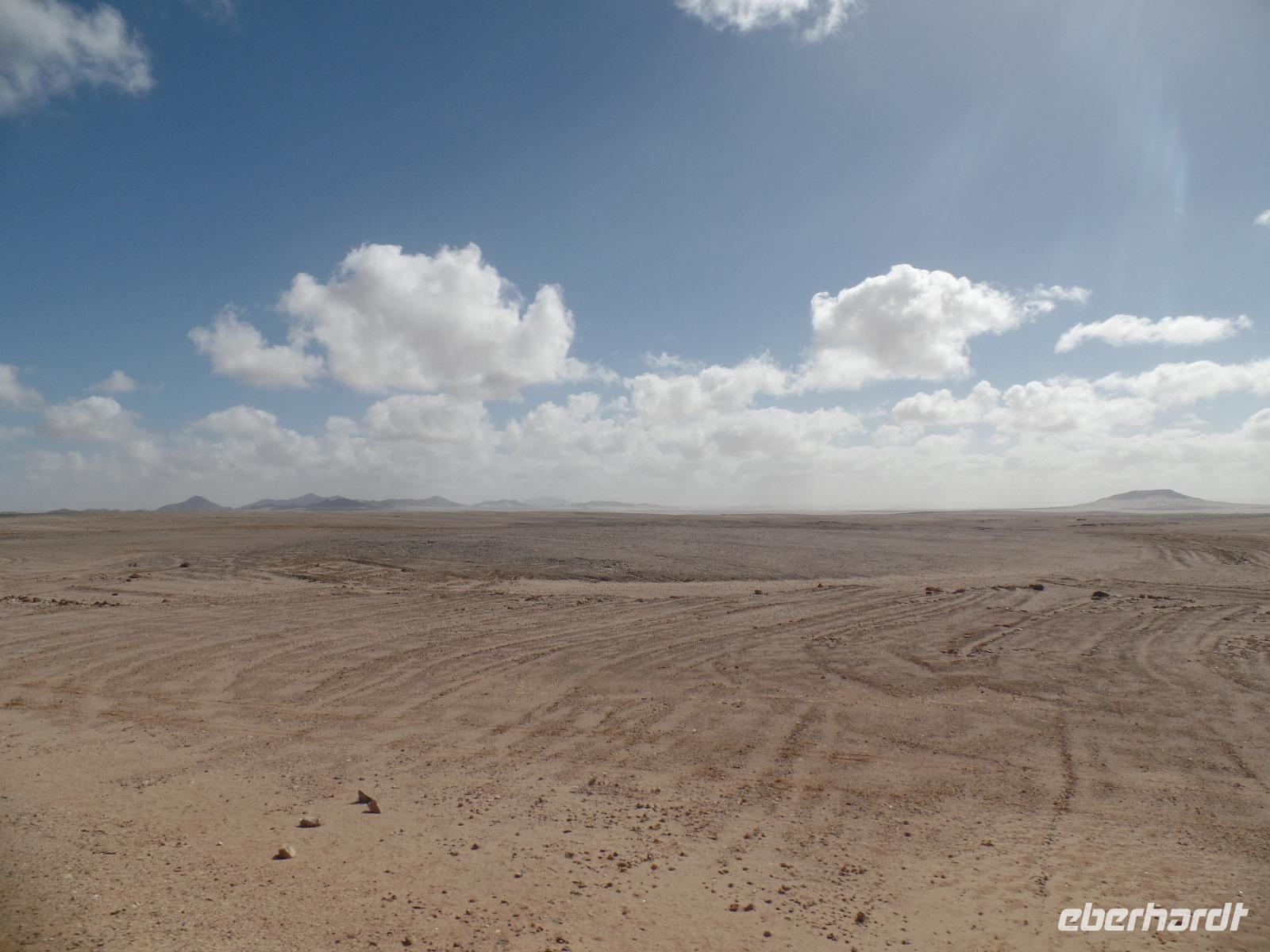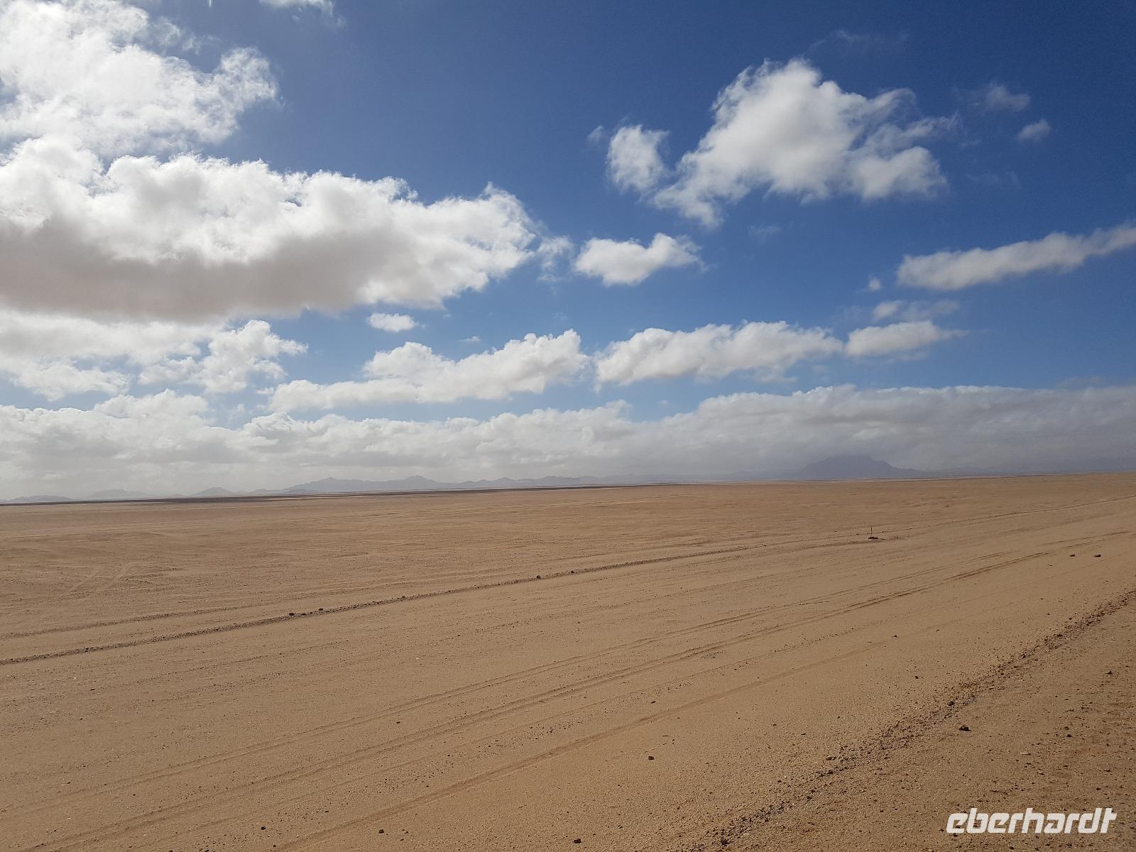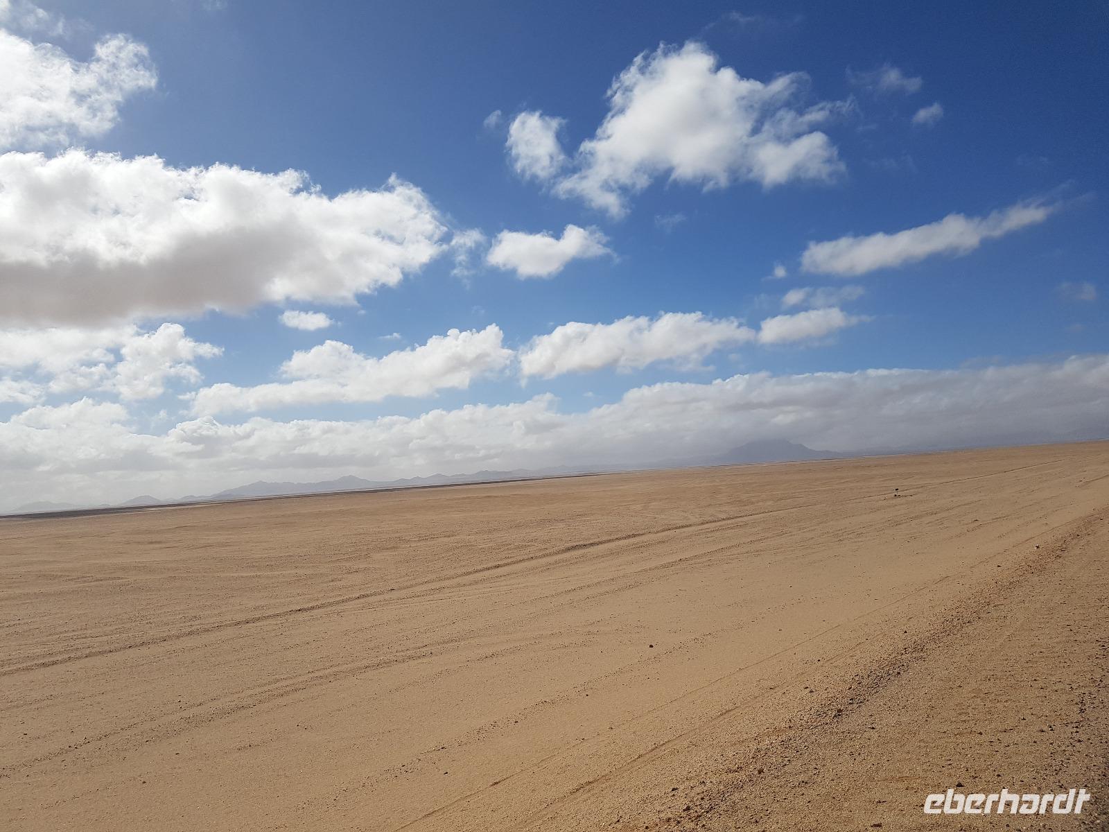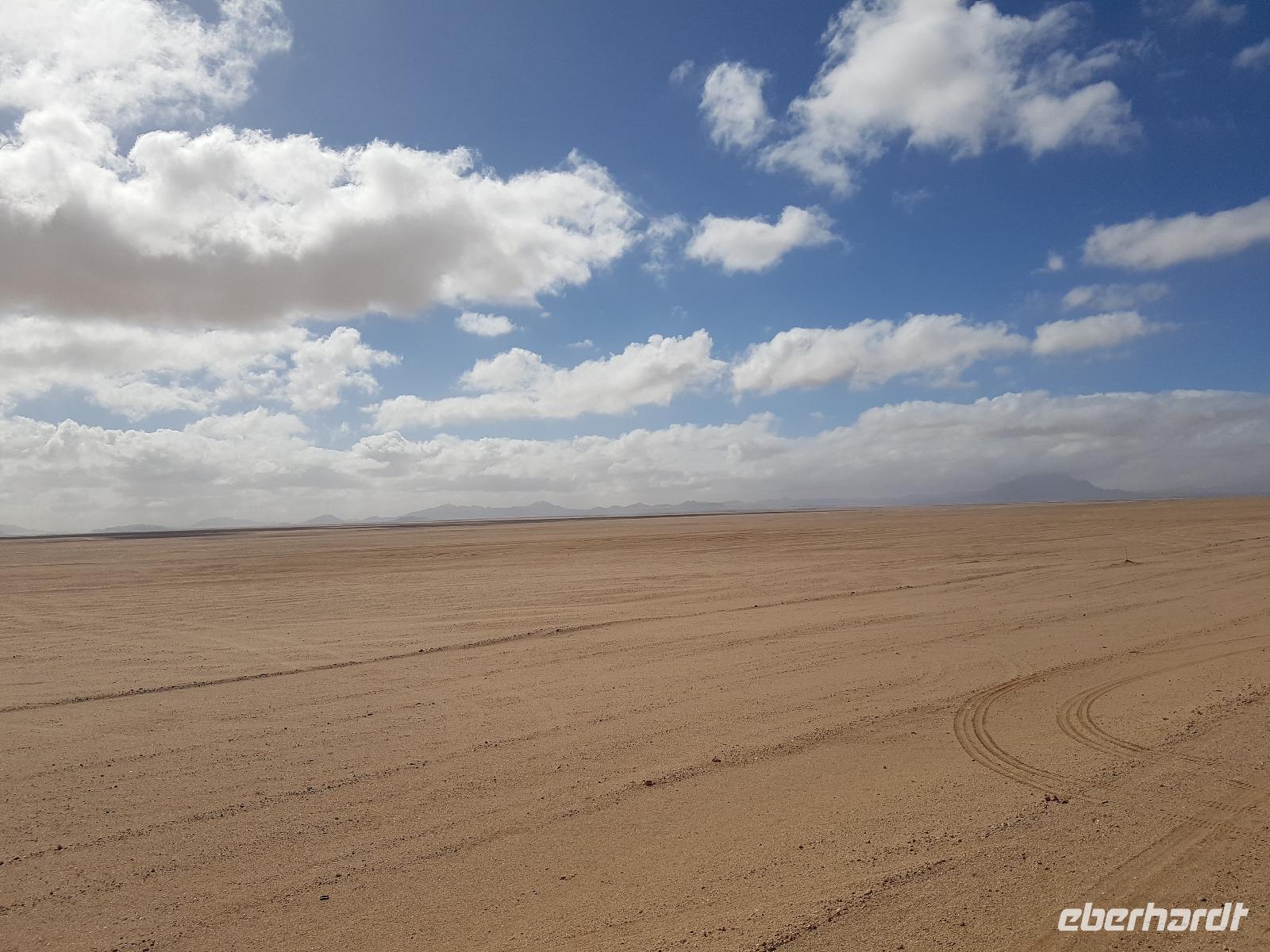 Weiter geht es und ein langer, ewiger, schwarzer Asphaltstreifen bahnt sich seinen geraden Weg durch die Wüste von Ost nach West. Zu beiden Seiten erstreckt sich eine karge, weite Landschaft, die nur durch ein paar Inselberge durchbrochen wird. Unsere Straße führt fast die ganze Zeit parallel zur Eisenbahnlinie. Es war schön anzusehen, wie der Nebel vom Atlantik bis 40 km ins Landesinnere vordrang. Zusammen mit dem Wind, dem Sand über dem Asphalt und den Schienen von der Bahn erschien uns die Fahrt gespenstisch. Wir erlebten sogar einmal kurz einen Sand-und Windsturm.