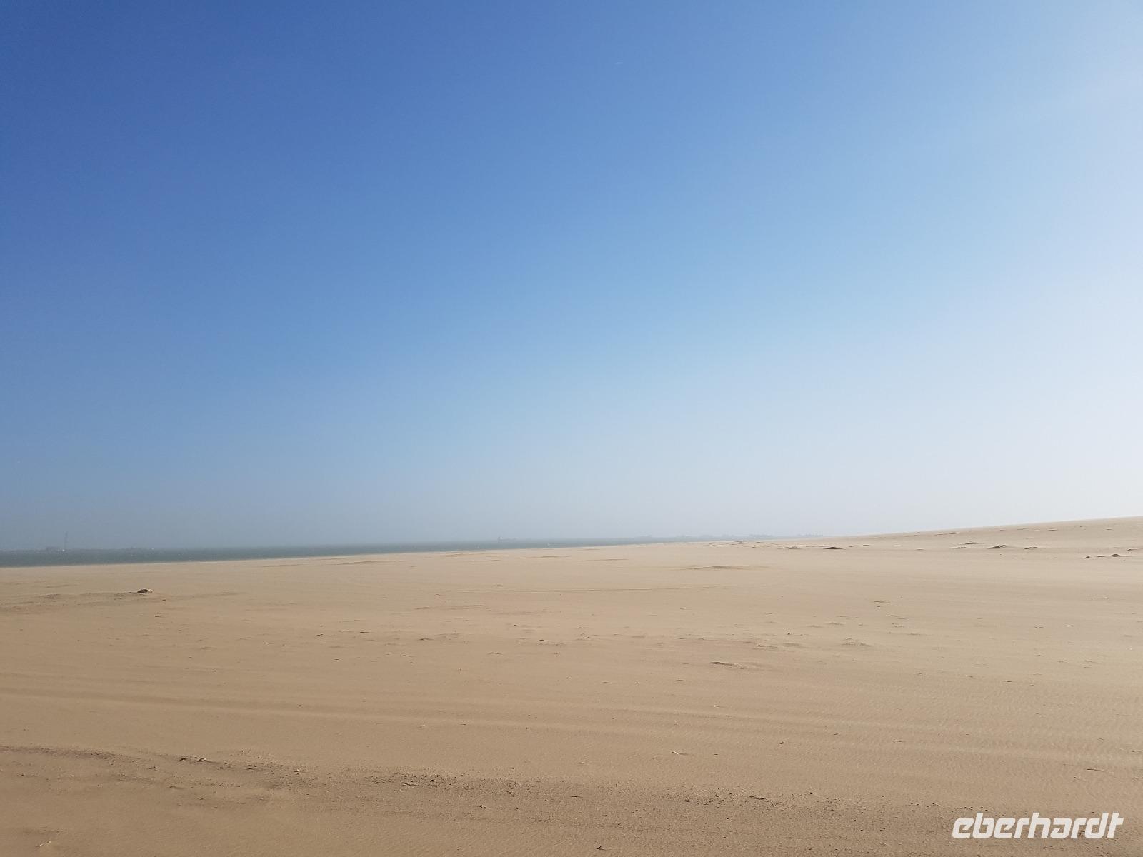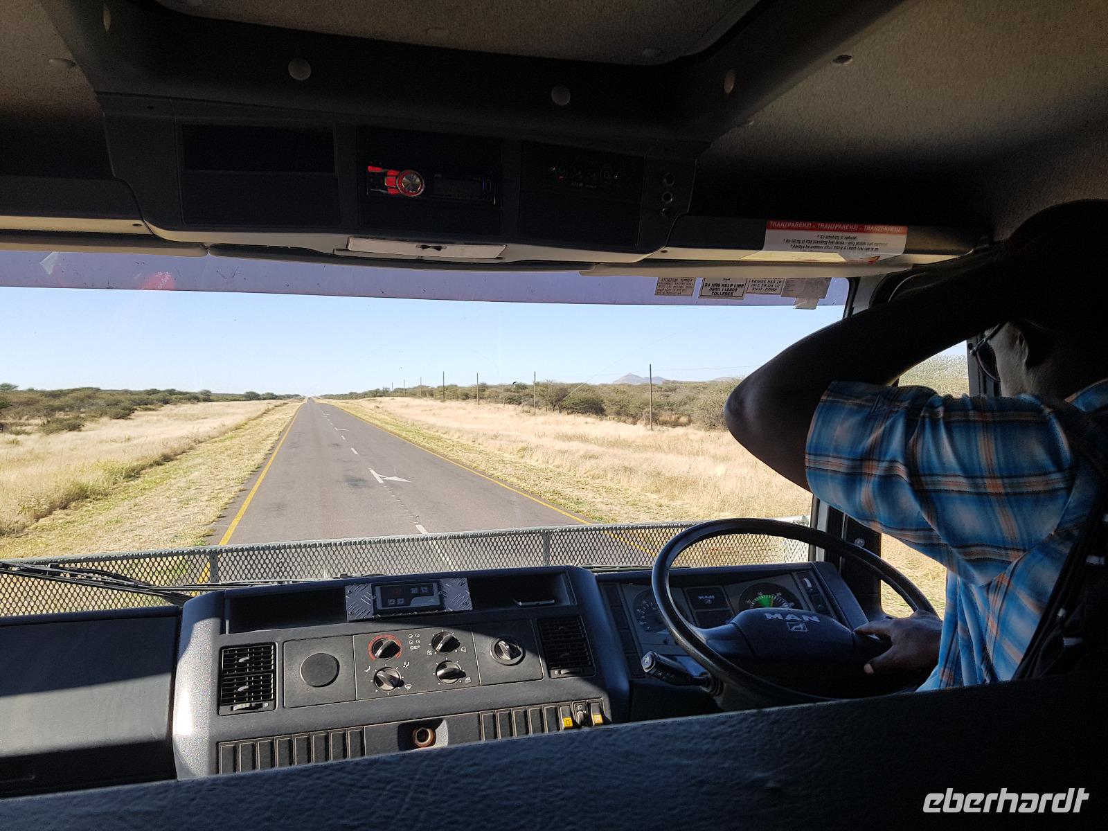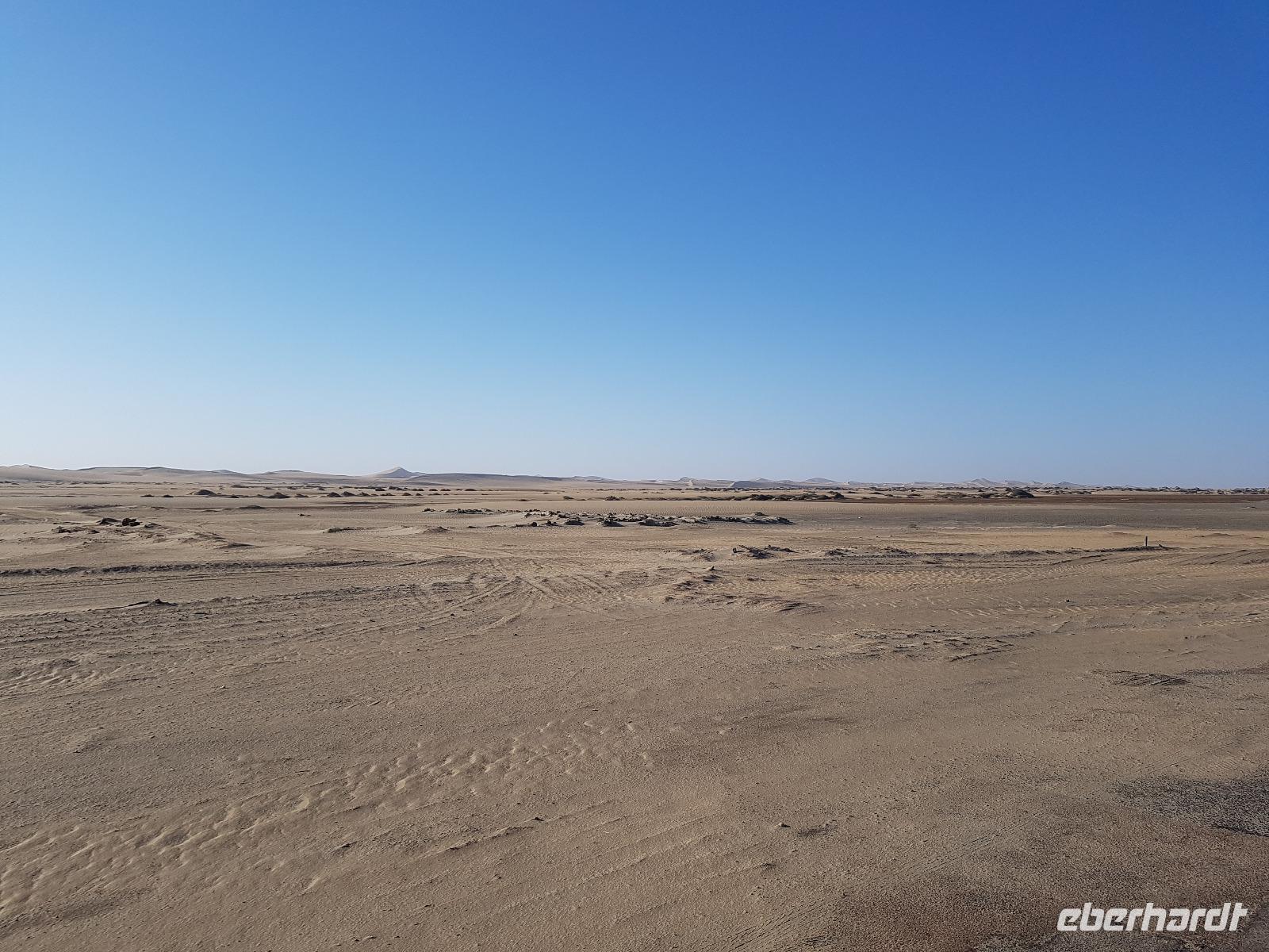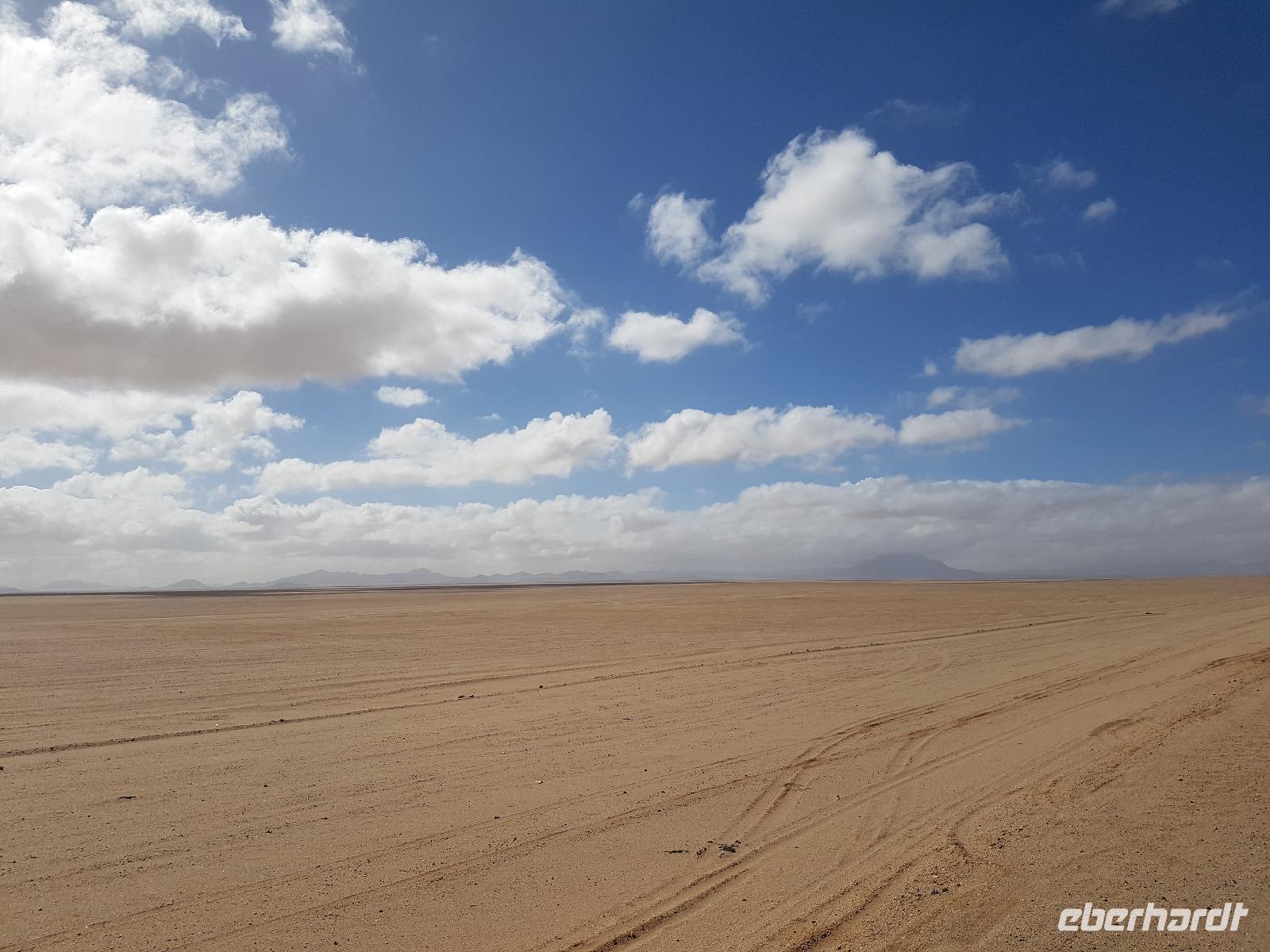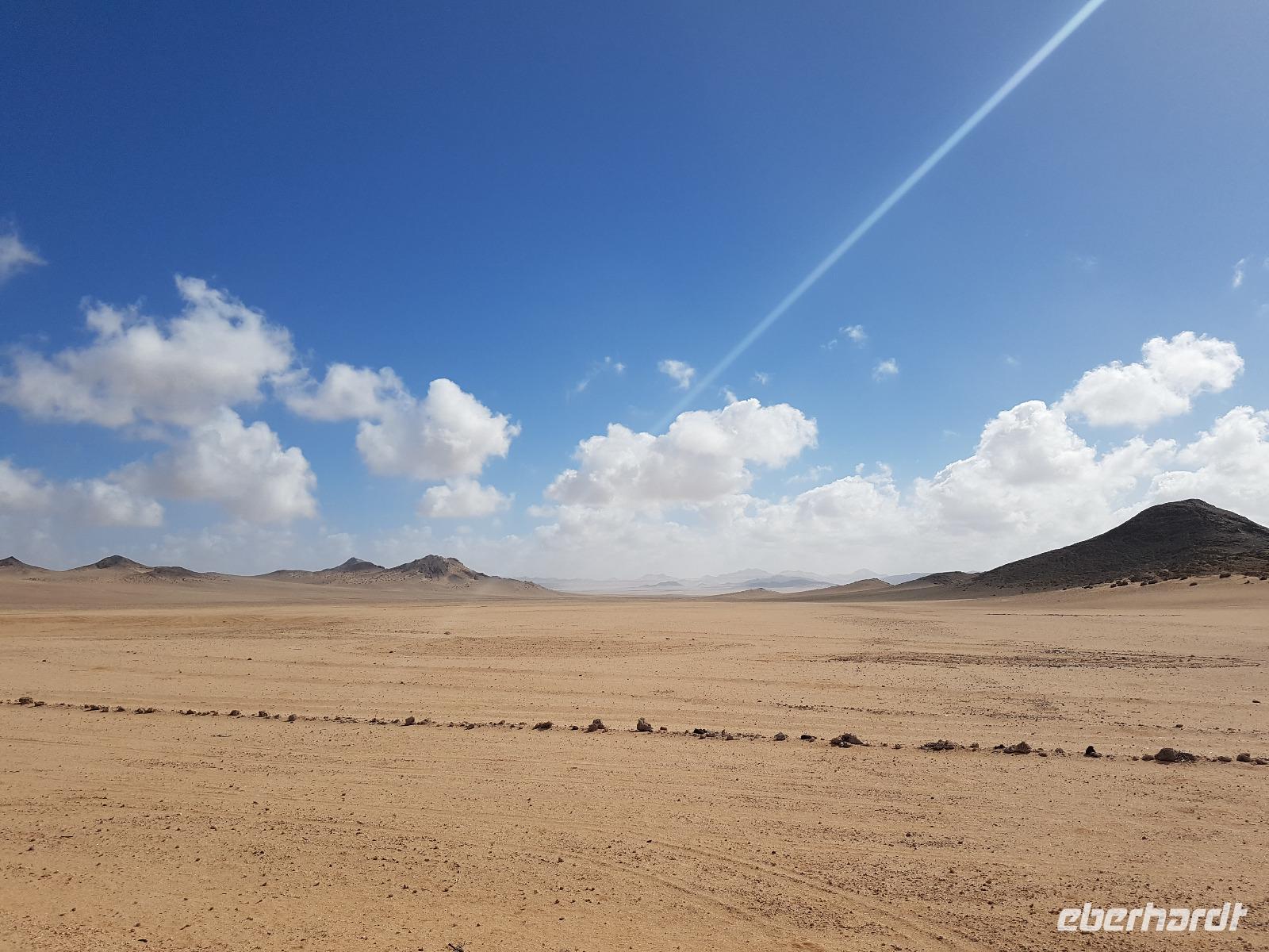 Weiter geht es und ein langer, ewiger, schwarzer Asphaltstreifen bahnt sich seinen geraden Weg durch die Wüste von Ost nach West. Zu beiden Seiten erstreckt sich eine karge, weite Landschaft, die nur durch ein paar Inselberge durchbrochen wird. Unsere Straße führt fast die ganze Zeit parallel zur Eisenbahnlinie. Es war schön anzusehen, wie der Nebel vom Atlantik bis 40 km ins Landesinnere vordrang. Zusammen mit dem Wind, dem Sand über dem Asphalt und den Schienen von der Bahn erschien uns die Fahrt gespenstisch. Wir erlebten sogar einmal kurz einen Sand-und Windsturm.