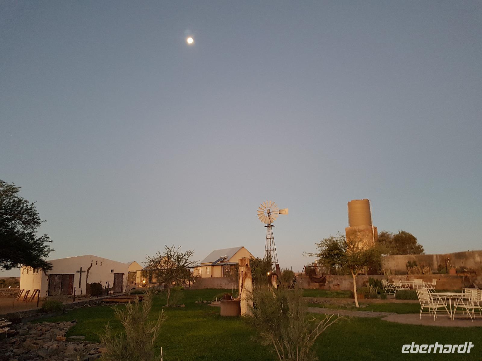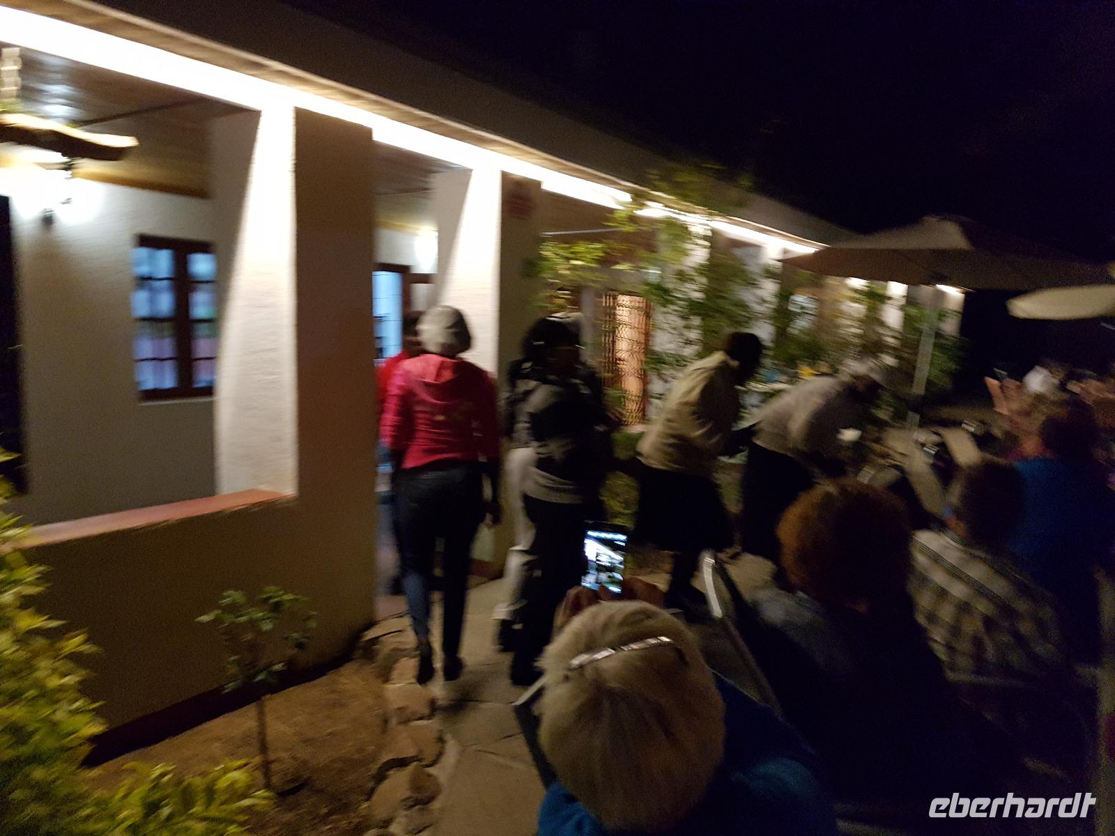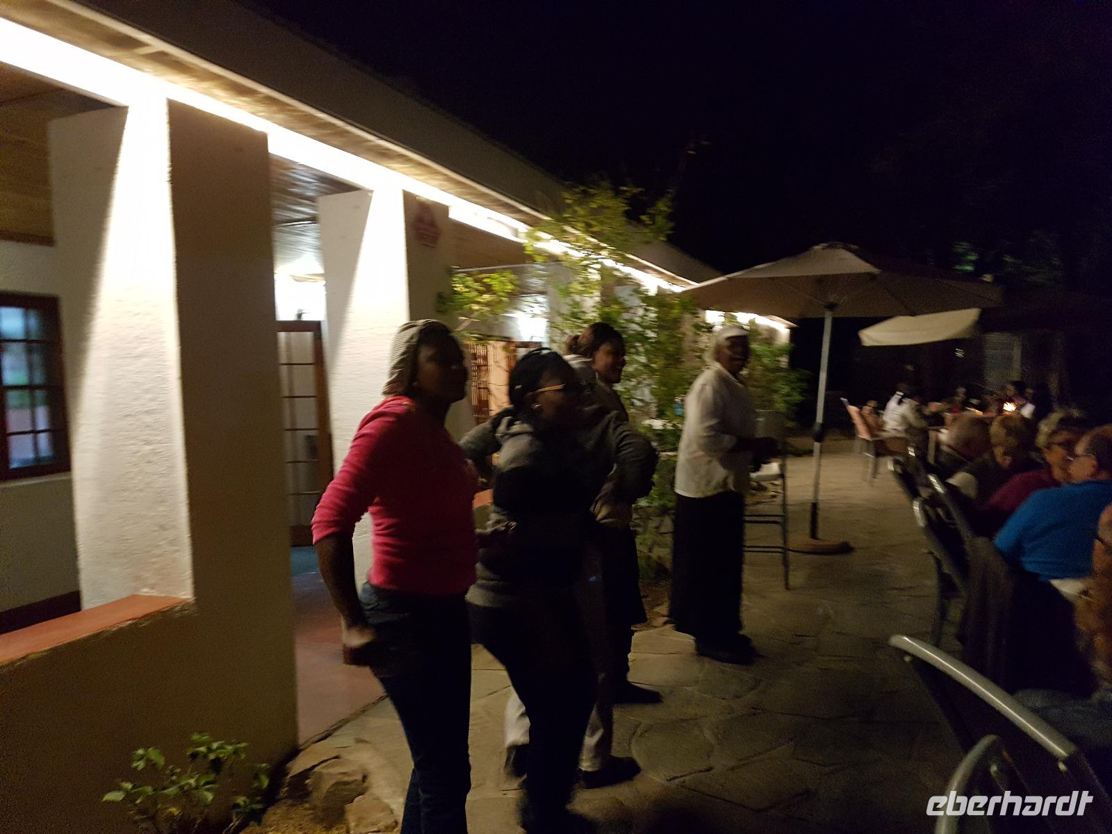 Nach einer ausgedehnten Erkundungstour durch das Anwesen freute sich das Ehepaar, uns am Abend mit einem typischen Lamb-Eintopf verwöhnen zu können. Seine Frau begeisterte uns mit ihren Kochkünsten und Produkten aus eigener Herstellung. Wir ließen uns einfach verwöhnen. Im Wohnzimmer genossen wir einen sehr gesunden Feigentee. Es hat uns allen vorzüglich geschmeckt. Bei einem Glas Rotwein konnten wir Fragen stellen, welche er mit Begeisterung beantwortete, wie in alten Zeiten, ohne Handy und dabei genossen wir die namibische Gastfreundschaft dieser deutschsprachigen Familie! Wir gingen ins Bett mit der Freude etwas Einfaches, Schönes und Einzigartiges gesehen und erlebt zu haben.