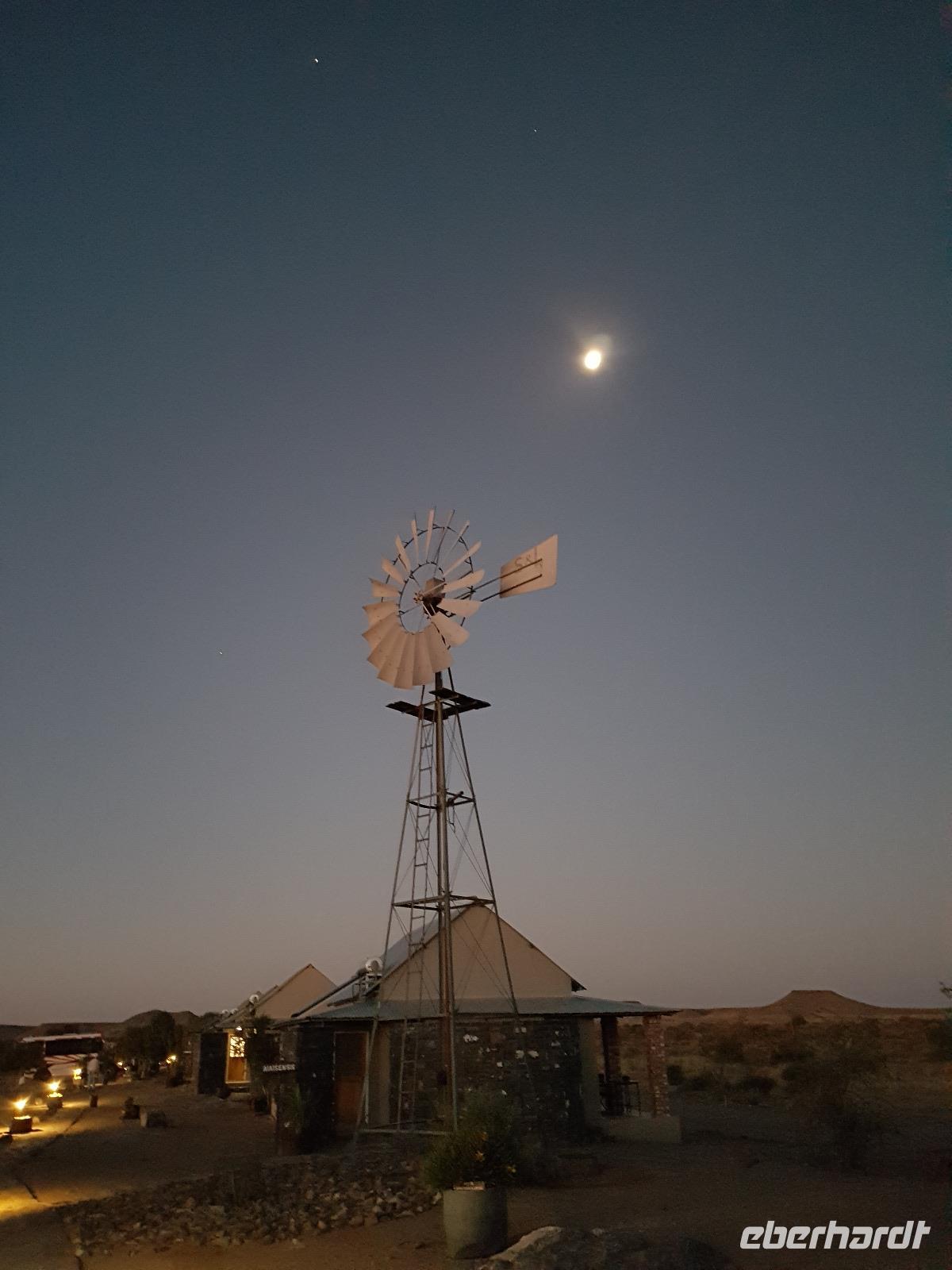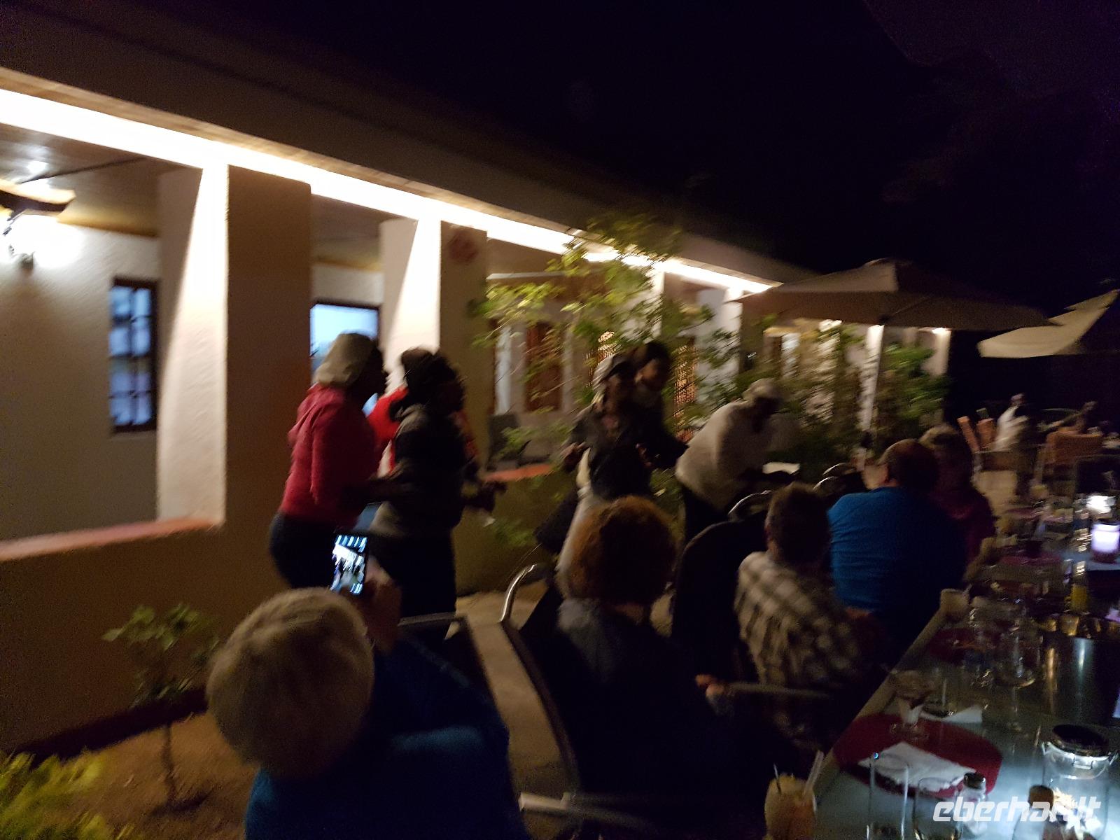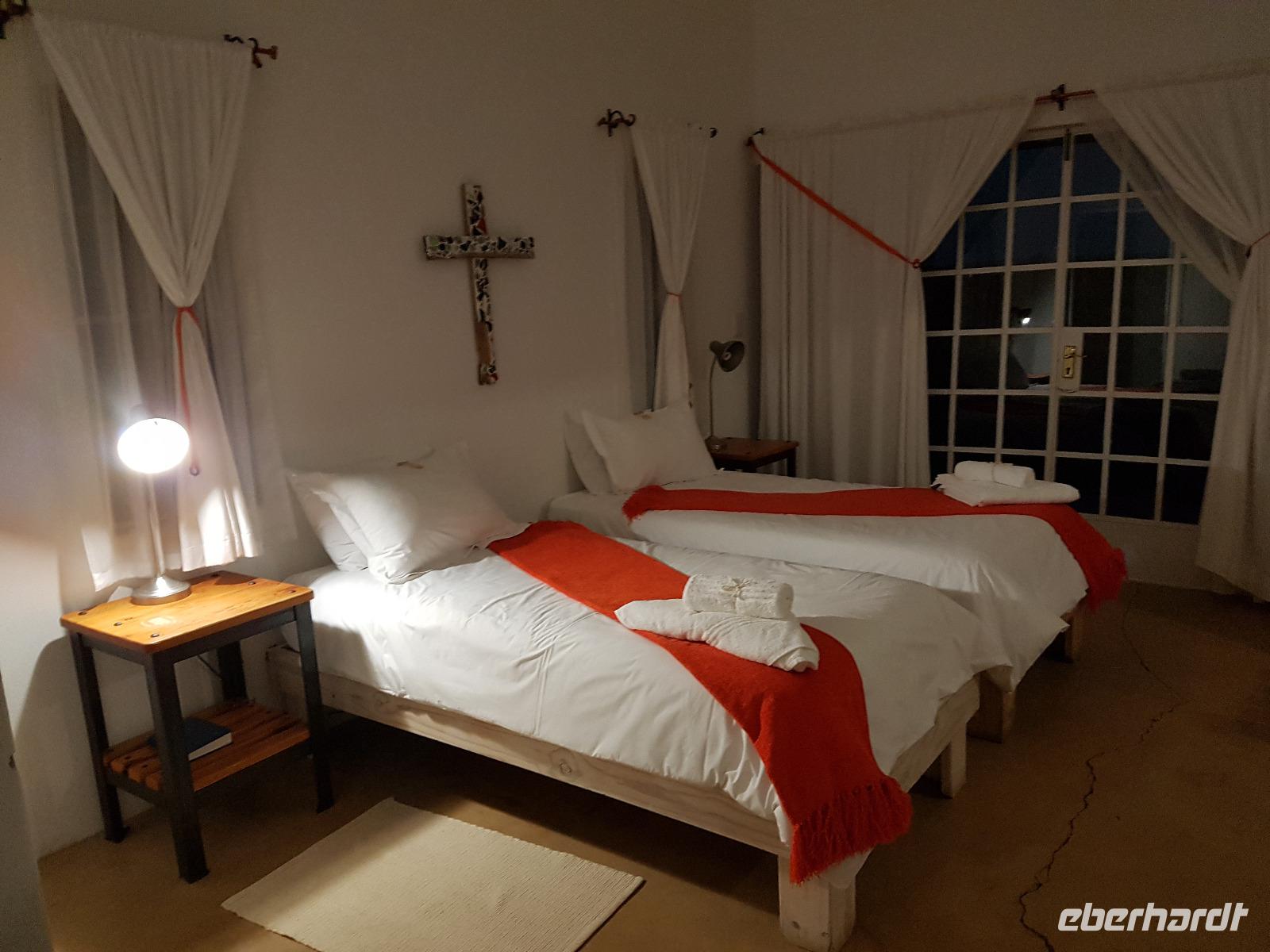 Nach einer ausgedehnten Erkundungstour durch das Anwesen freute sich das Ehepaar, uns am Abend mit einem typischen Lamb-Eintopf verwöhnen zu können. Seine Frau begeisterte uns mit ihren Kochkünsten und Produkten aus eigener Herstellung. Wir ließen uns einfach verwöhnen. Im Wohnzimmer genossen wir einen sehr gesunden Feigentee. Es hat uns allen vorzüglich geschmeckt. Bei einem Glas Rotwein konnten wir Fragen stellen, welche er mit Begeisterung beantwortete, wie in alten Zeiten, ohne Handy und dabei genossen wir die namibische Gastfreundschaft dieser deutschsprachigen Familie! Wir gingen ins Bett mit der Freude etwas Einfaches, Schönes und Einzigartiges gesehen und erlebt zu haben.