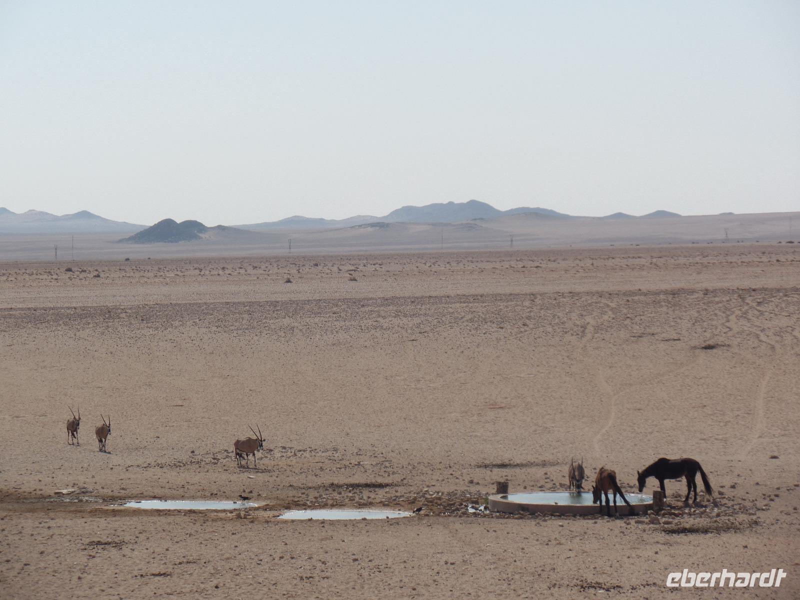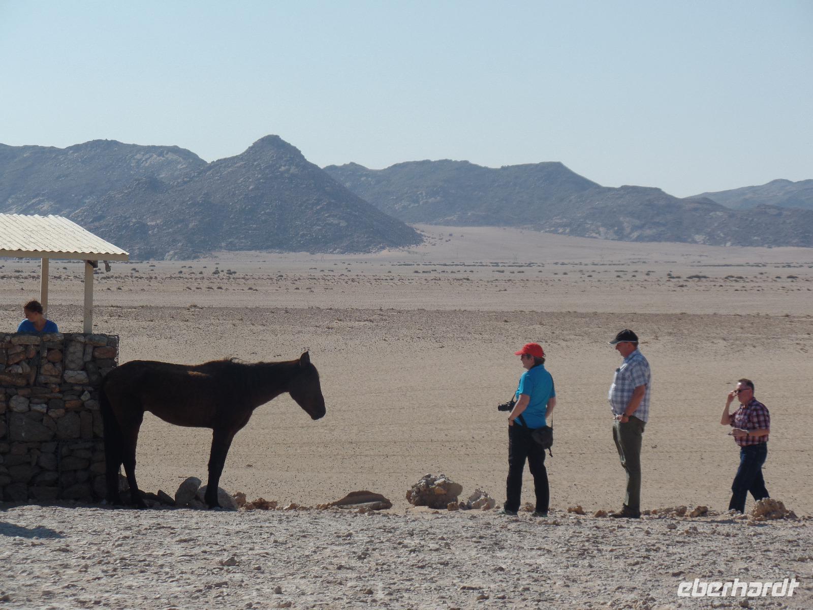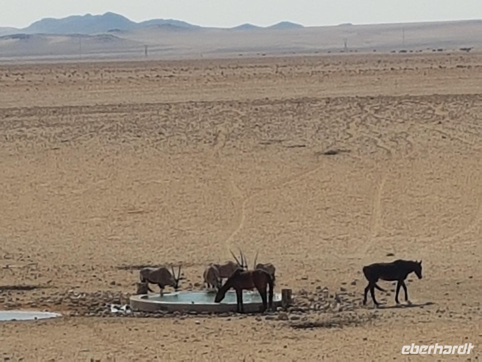 Unser Ziel heute ist Lüderitz aber zunächst überqueren wir den Fish River. In Aus machen wir eine kurze Pause am Bahnhofshotel und genießen einen Kaffee. Auf dem Weg erzählte Ernst viele Geschichten von der ehemaligen deutschen Kolonie und ihrem Schicksal. Diese ganze Reise ist auch eine Reise in die vergangene Zeit, die Kaiserzeit. Im beschaulichen Aus machten wir einen Abstecher zum Garub-Wasserloch zum Wild Horse Point. Wir hatten Glück und konnten nicht nur einige Wildpferde beobachten, sondern auch eine Herde der