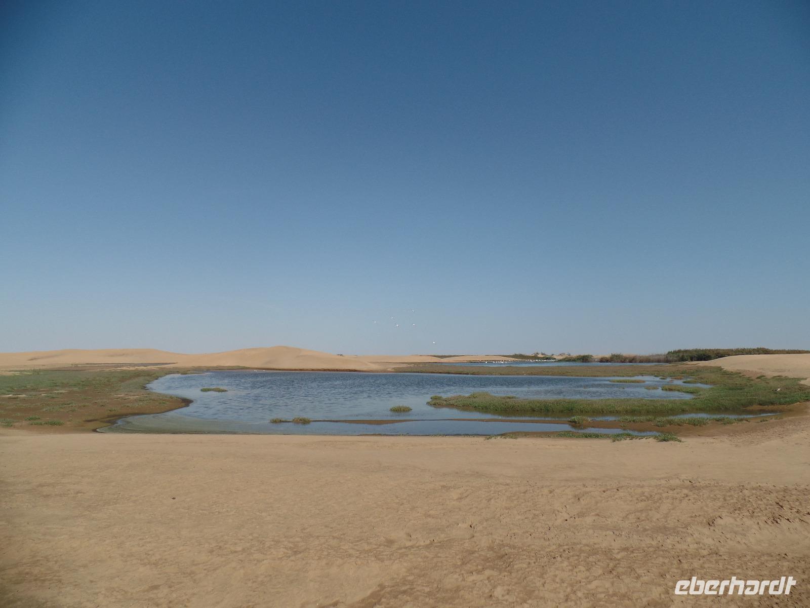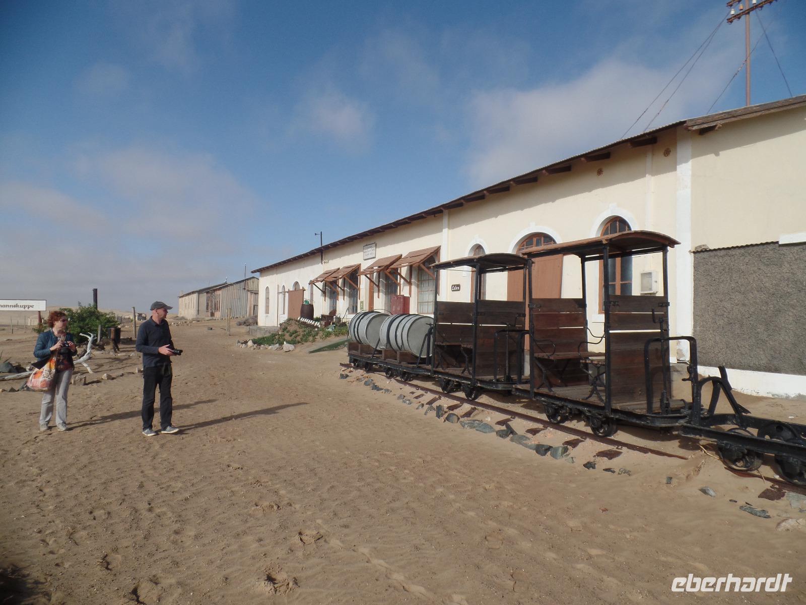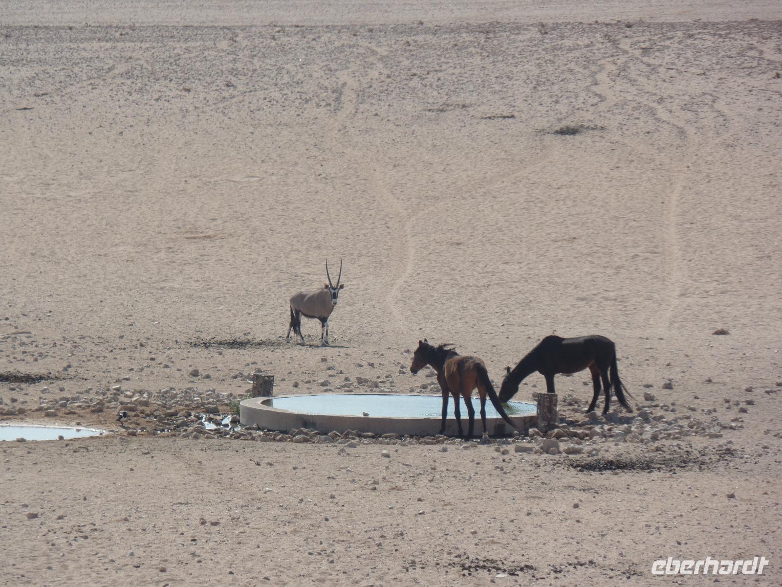 Unser Ziel heute ist Lüderitz aber zunächst überqueren wir den Fish River. In Aus machen wir eine kurze Pause am Bahnhofshotel und genießen einen Kaffee. Auf dem Weg erzählte Ernst viele Geschichten von der ehemaligen deutschen Kolonie und ihrem Schicksal. Diese ganze Reise ist auch eine Reise in die vergangene Zeit, die Kaiserzeit. Im beschaulichen Aus machten wir einen Abstecher zum Garub-Wasserloch zum Wild Horse Point. Wir hatten Glück und konnten nicht nur einige Wildpferde beobachten, sondern auch eine Herde der