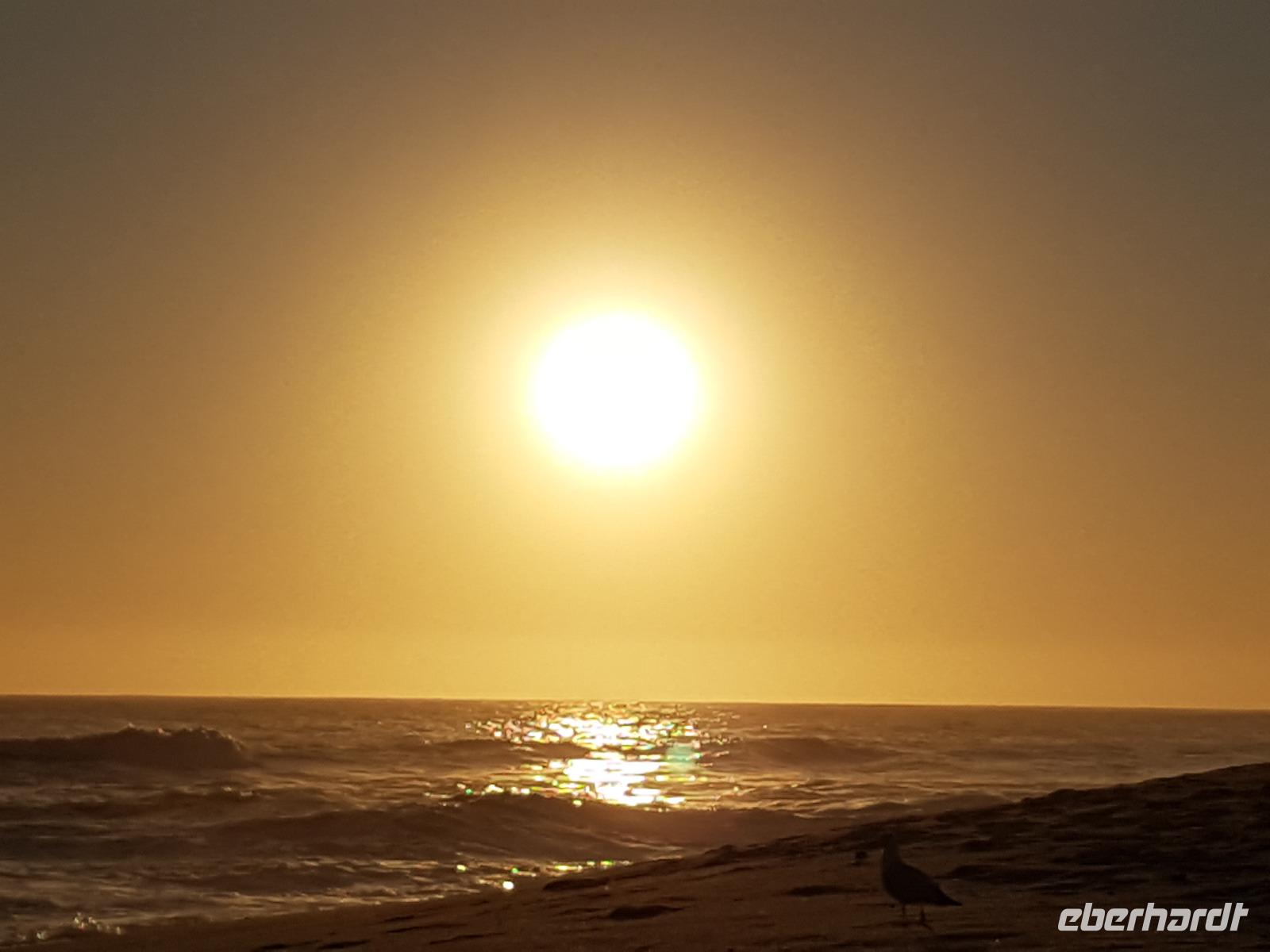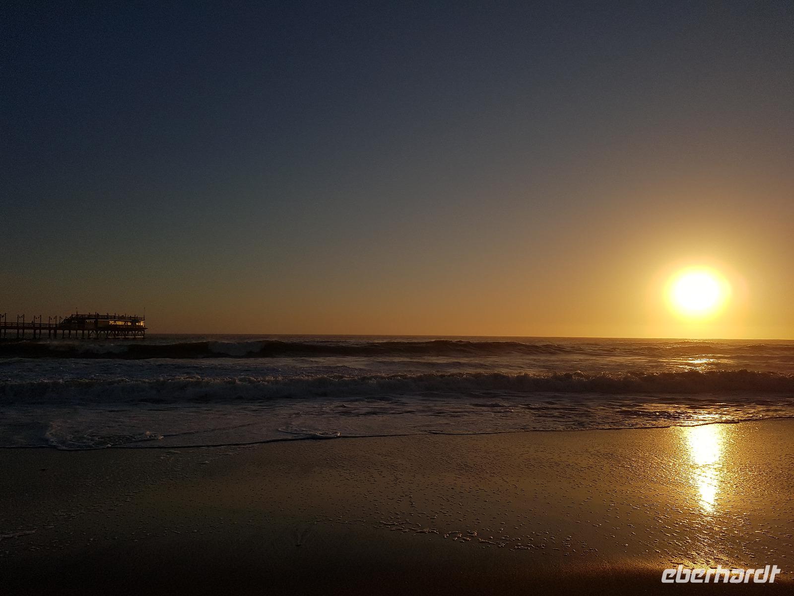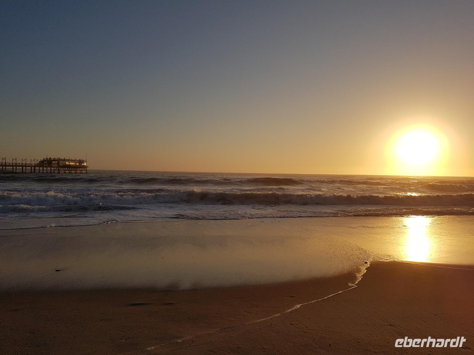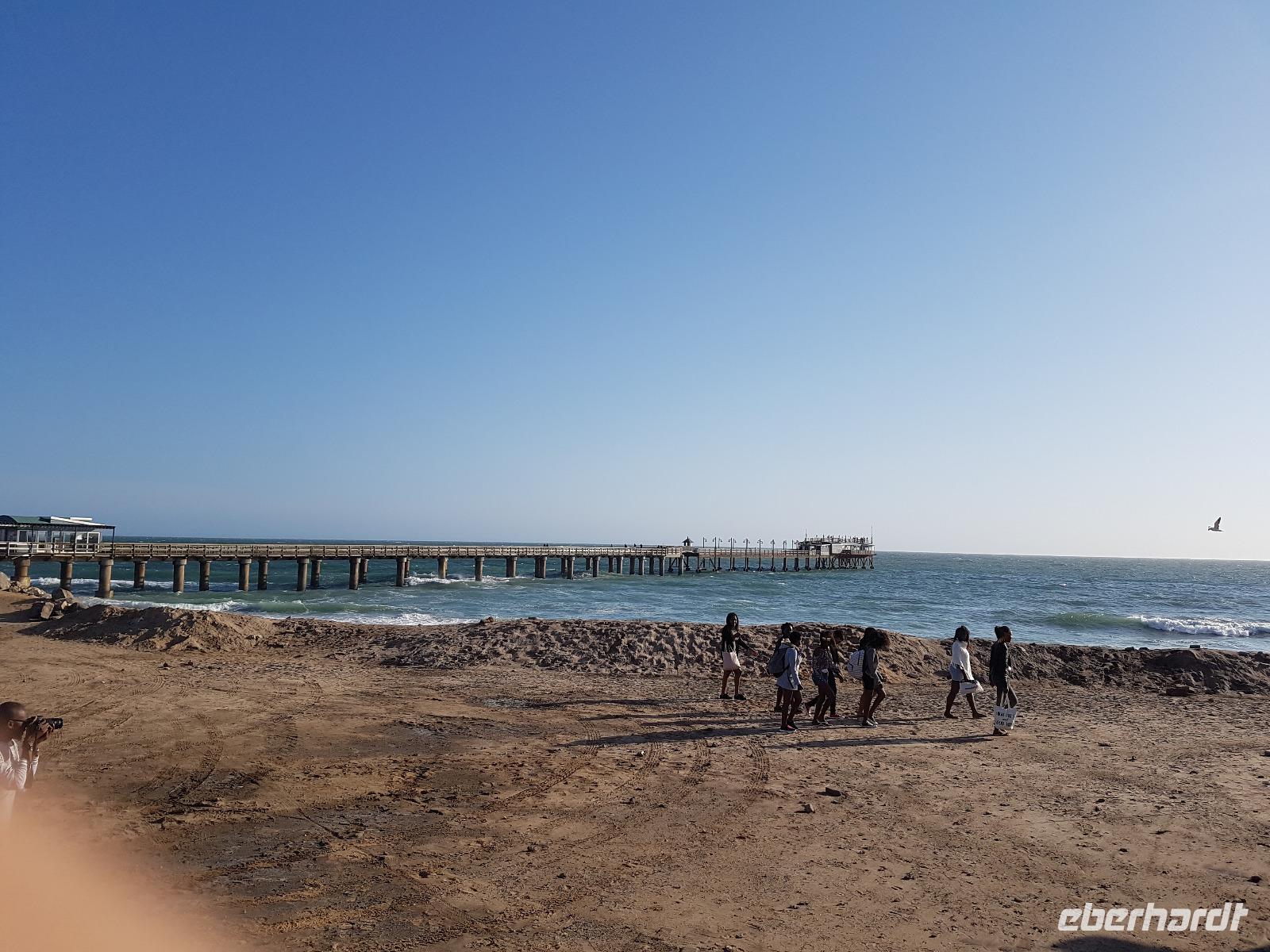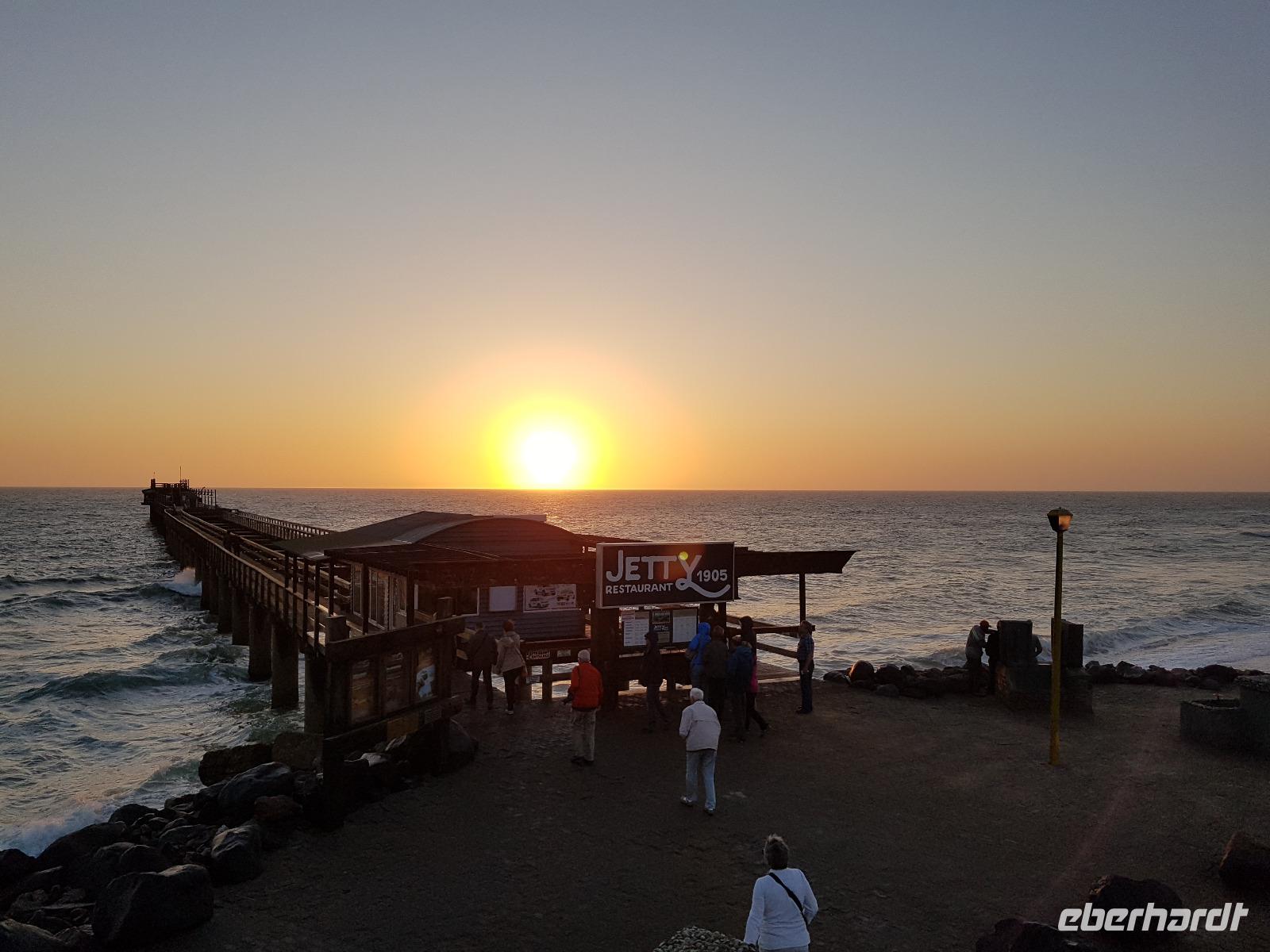 Heute durchqueren wir das karge Naukluftgebirge. Eine Pause in Solitaire war wieder ein Muss, um den frischen Apfelkuchen zu probieren aber auch um die putzigen Erdmännchen zu beobachten. Ganz lustig. Unterwegs passierten wir den südlichen Wendekreis des Steinbocks. An diesem Punkt strahlt die Sonne am 21. Dezember jedes Jahr senkrecht auf die Erde, sodass kein Schatten entsteht. Eine landschaftlich karge, aber wunderschöne Strecke führt uns über den Gaub Pass und durch den Kuiseb Canyon, wo sich Prof. Dr. Henno Martin während des 2. Weltkrieges versteckt hielt. Dieser Geologe ist Autor des Bestsellers "Wenn es Krieg gibt, gehen wir in die Wüste". Am frühen Nachmittag erreichten wir Walvis Bay wo wir Picknick mit Wind machten und später erreichten wir Swakopmund. Hier machten wir mit dem Bus erstmal eine kleine Entdeckungstour durch das Küstenstädtchen mit deutscher Vergangenheit um uns zu orientieren. Das Stadtbild ist von zahlreichen Kolonialbauten geprägt: Altes Amtsgericht, Hohenzollern-Haus und Prinzessin-Rupprecht-Haus, Woermann-Haus mit Damaraturm auf der Bismarckstraße, Bahnhof und sogar ein Leuchtturm fast wie in Warnemünde, könnte man denken. Benjamin ging heute schnell ins Wasser am Ozean um zu testen wie frisch hier der Atlantik ist. Ein beliebter Treffpunkt ist die "Jetty", die alte Seebrücke am Atlantik, wo wir uns um 17 Uhr verabredeten, um den Sonnenuntergang zu erleben. Hier hatte Eberhardt Travel eine Überraschung für alle: Amarola Schnaps um beim Bergfest anzustoßen. Wunderschön. Am Abend kehrten wir hier an der Seebrücke in eines der typischen Lokale "The Tug", den Schlepper ein, wo wir a la carte fangfrischen Fisch probieren konnten.