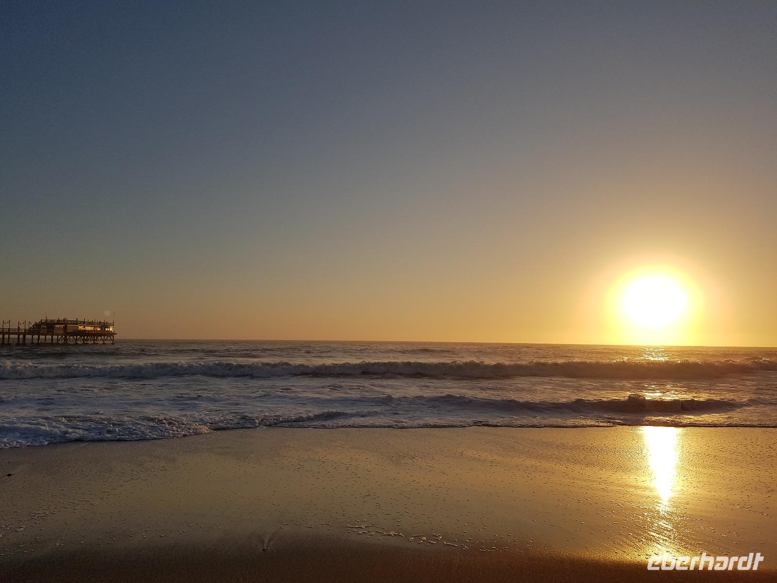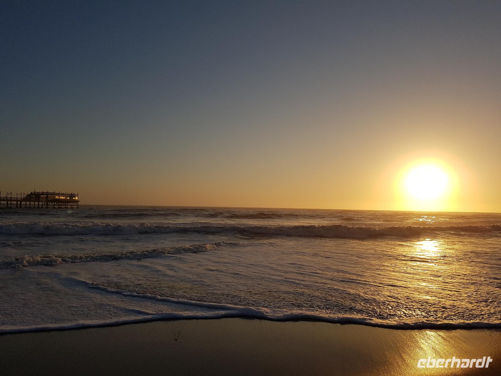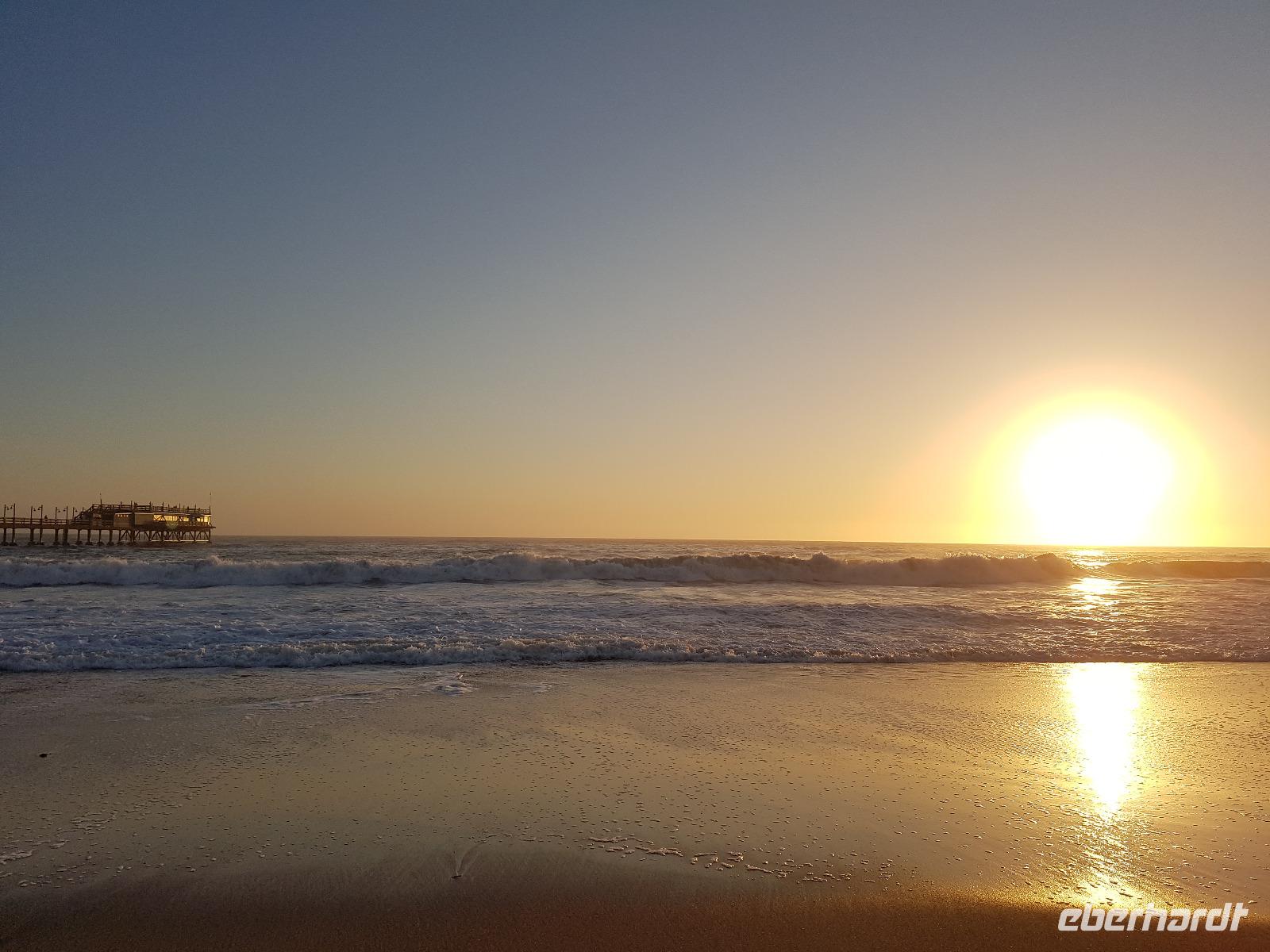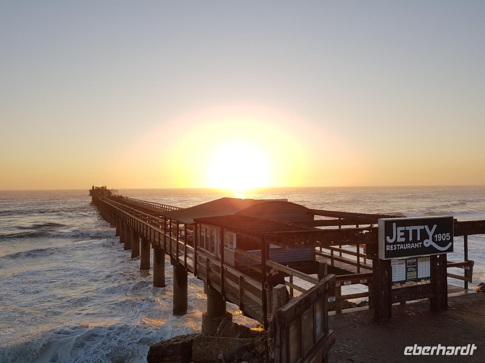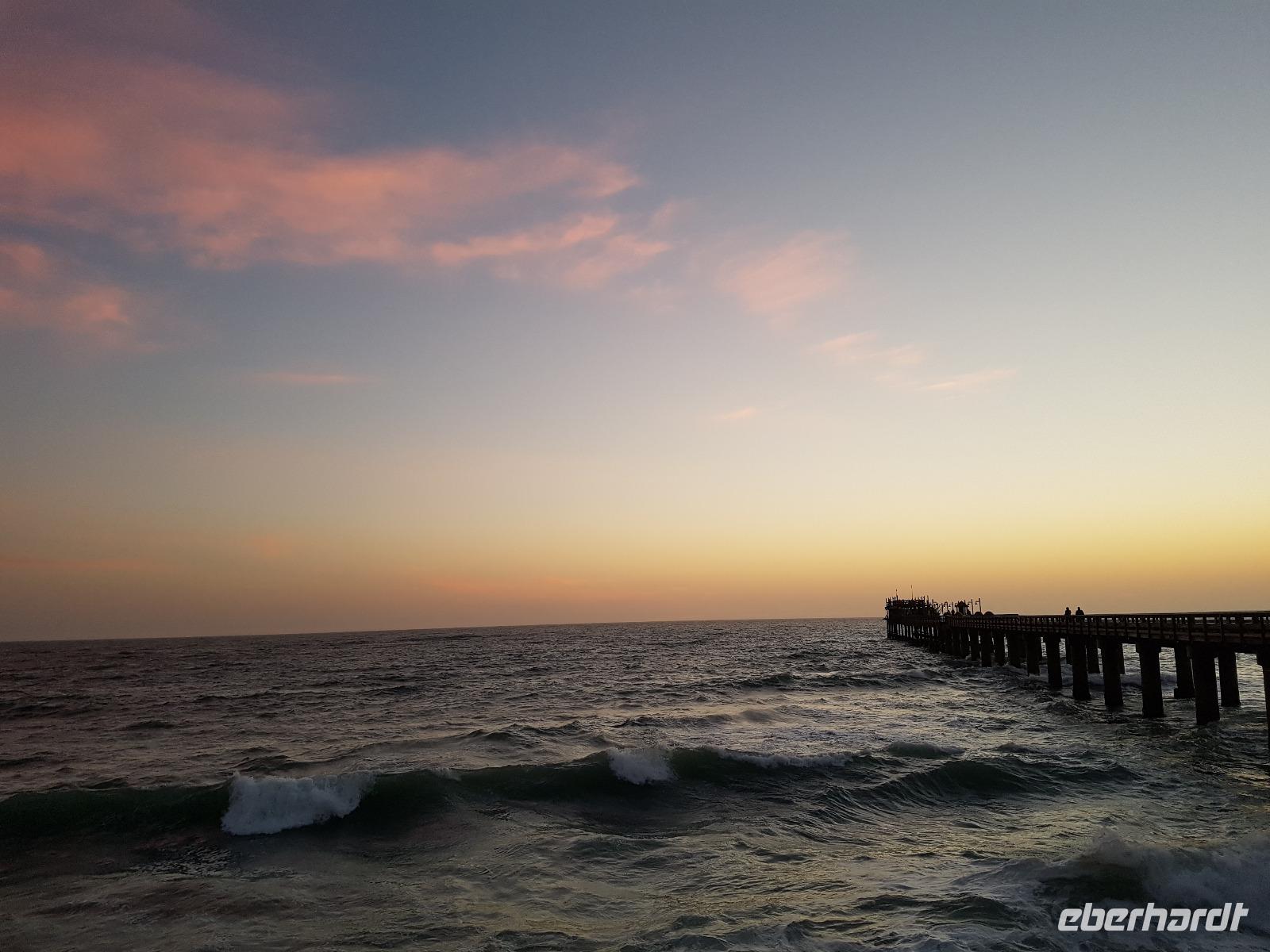Heute durchqueren wir das karge Naukluftgebirge. Eine Pause in Solitaire war wieder ein Muss, um den frischen Apfelkuchen zu probieren aber auch um die putzigen Erdmännchen zu beobachten. Ganz lustig. Unterwegs passierten wir den südlichen Wendekreis des Steinbocks. An diesem Punkt strahlt die Sonne am 21. Dezember jedes Jahr senkrecht auf die Erde, sodass kein Schatten entsteht. Eine landschaftlich karge, aber wunderschöne Strecke führt uns über den Gaub Pass und durch den Kuiseb Canyon, wo sich Prof. Dr. Henno Martin während des 2. Weltkrieges versteckt hielt. Dieser Geologe ist Autor des Bestsellers "Wenn es Krieg gibt, gehen wir in die Wüste". Am frühen Nachmittag erreichten wir Walvis Bay wo wir Picknick mit Wind machten und später erreichten wir Swakopmund. Hier machten wir mit dem Bus erstmal eine kleine Entdeckungstour durch das Küstenstädtchen mit deutscher Vergangenheit um uns zu orientieren. Das Stadtbild ist von zahlreichen Kolonialbauten geprägt: Altes Amtsgericht, Hohenzollern-Haus und Prinzessin-Rupprecht-Haus, Woermann-Haus mit Damaraturm auf der Bismarckstraße, Bahnhof und sogar ein Leuchtturm fast wie in Warnemünde, könnte man denken. Benjamin ging heute schnell ins Wasser am Ozean um zu testen wie frisch hier der Atlantik ist. Ein beliebter Treffpunkt ist die "Jetty", die alte Seebrücke am Atlantik, wo wir uns um 17 Uhr verabredeten, um den Sonnenuntergang zu erleben. Hier hatte Eberhardt Travel eine Überraschung für alle: Amarola Schnaps um beim Bergfest anzustoßen. Wunderschön. Am Abend kehrten wir hier an der Seebrücke in eines der typischen Lokale "The Tug", den Schlepper ein, wo wir a la carte fangfrischen Fisch probieren konnten.