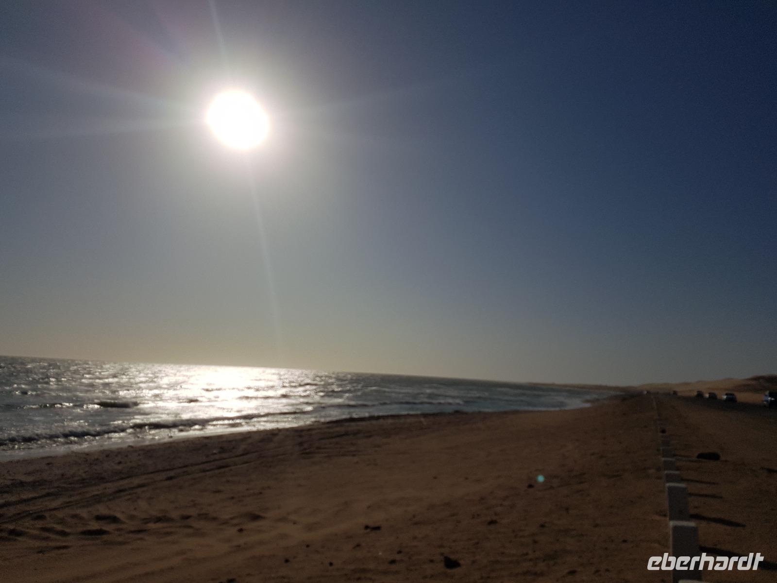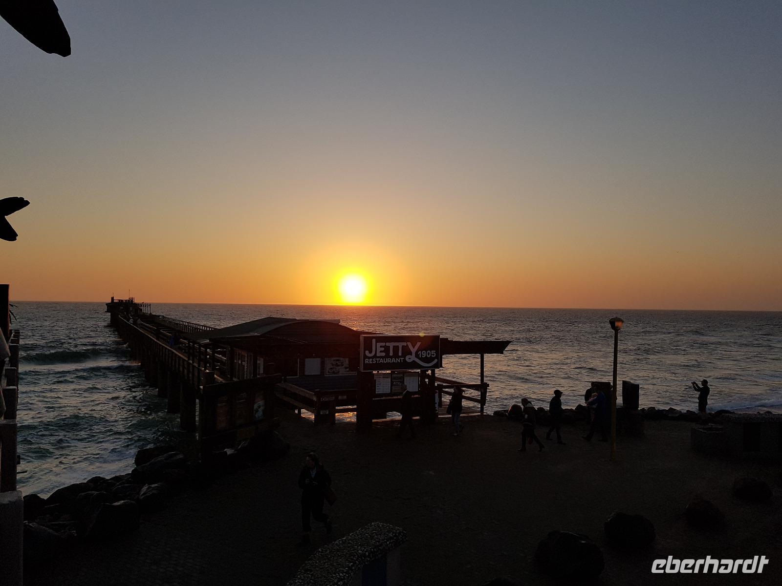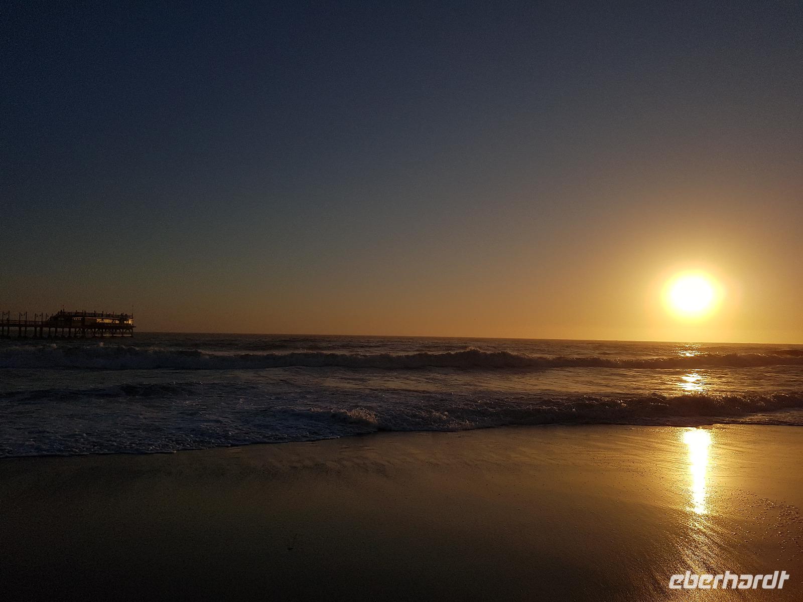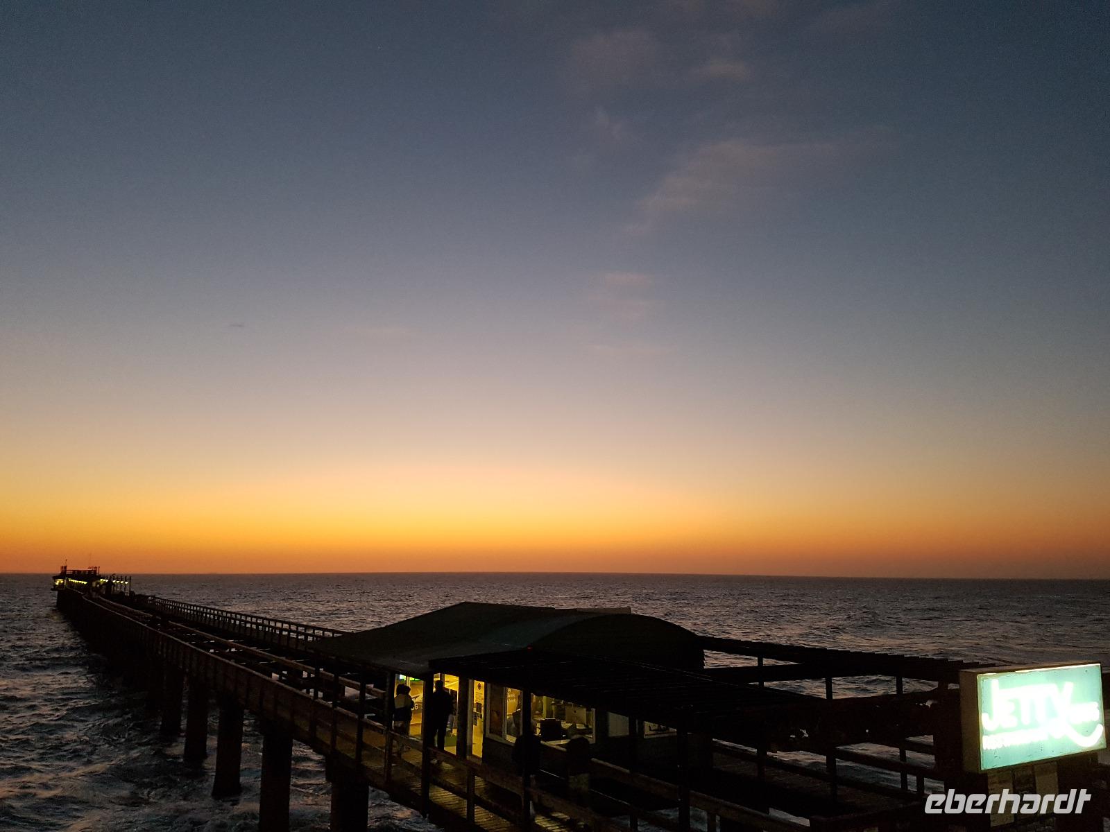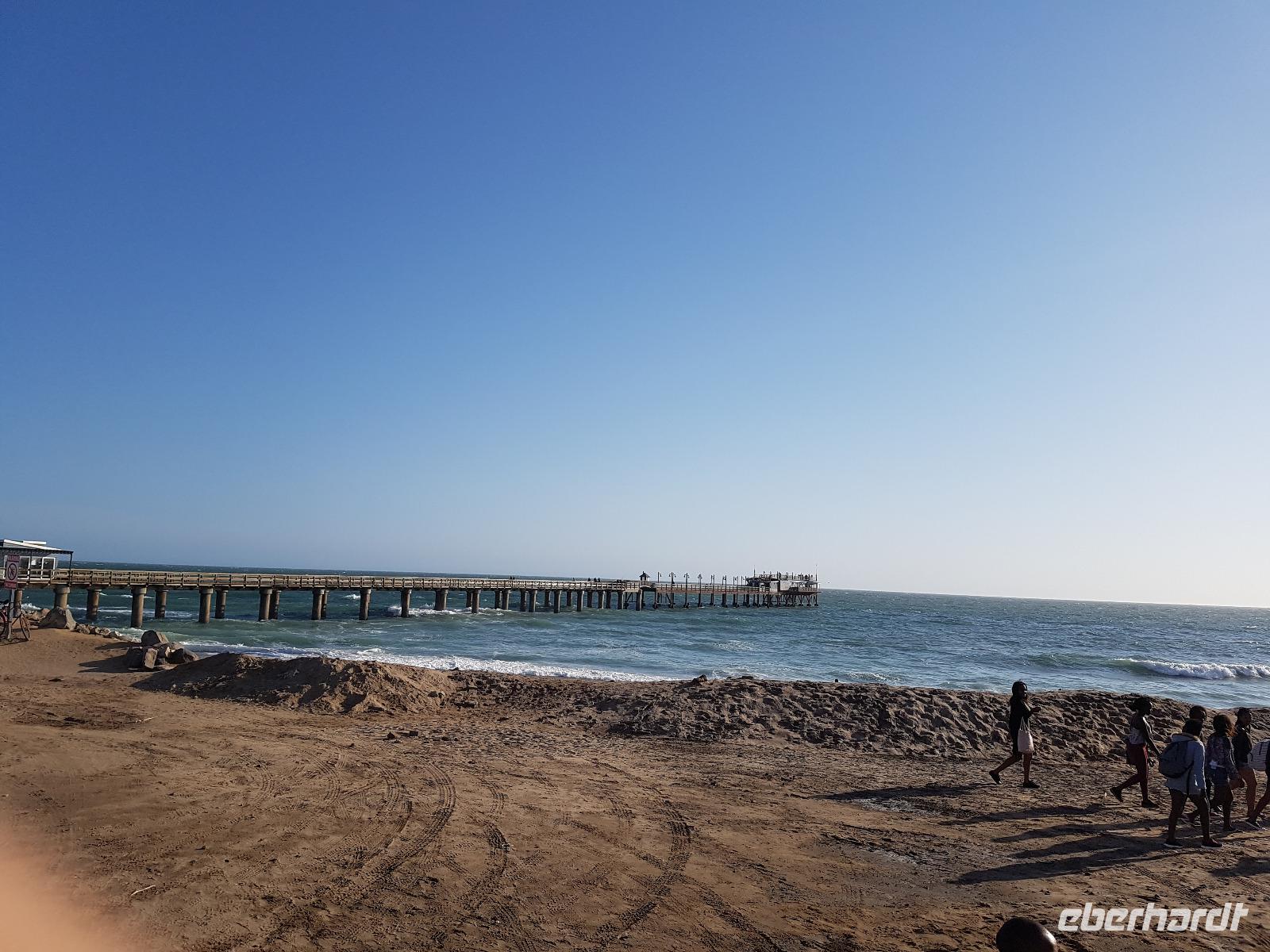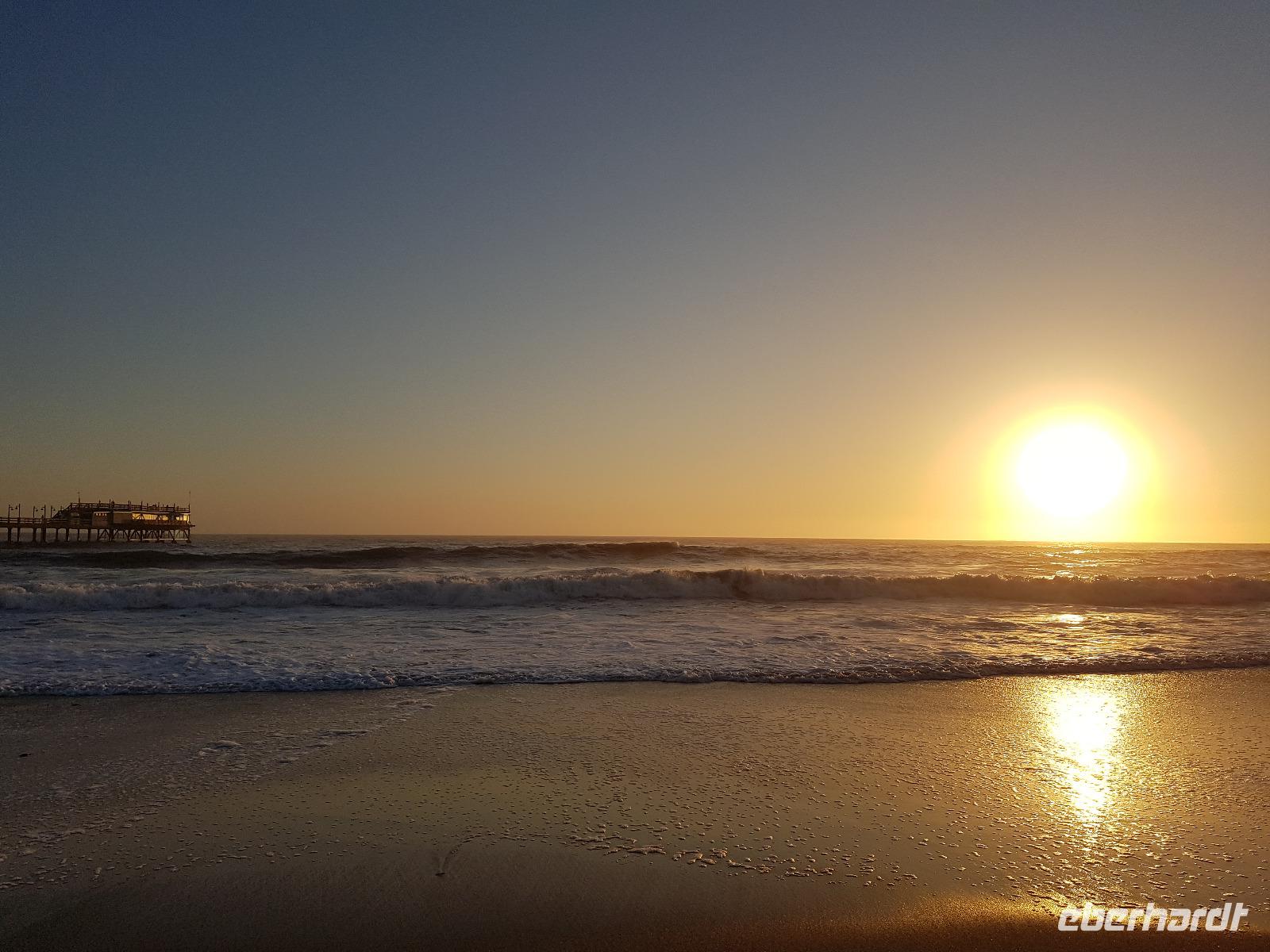 Heute durchqueren wir das karge Naukluftgebirge. Eine Pause in Solitaire war wieder ein Muss, um den frischen Apfelkuchen zu probieren aber auch um die putzigen Erdmännchen zu beobachten. Ganz lustig. Unterwegs passierten wir den südlichen Wendekreis des Steinbocks. An diesem Punkt strahlt die Sonne am 21. Dezember jedes Jahr senkrecht auf die Erde, sodass kein Schatten entsteht. Eine landschaftlich karge, aber wunderschöne Strecke führt uns über den Gaub Pass und durch den Kuiseb Canyon, wo sich Prof. Dr. Henno Martin während des 2. Weltkrieges versteckt hielt. Dieser Geologe ist Autor des Bestsellers "Wenn es Krieg gibt, gehen wir in die Wüste". Am frühen Nachmittag erreichten wir Walvis Bay wo wir Picknick mit Wind machten und später erreichten wir Swakopmund. Hier machten wir mit dem Bus erstmal eine kleine Entdeckungstour durch das Küstenstädtchen mit deutscher Vergangenheit um uns zu orientieren. Das Stadtbild ist von zahlreichen Kolonialbauten geprägt: Altes Amtsgericht, Hohenzollern-Haus und Prinzessin-Rupprecht-Haus, Woermann-Haus mit Damaraturm auf der Bismarckstraße, Bahnhof und sogar ein Leuchtturm fast wie in Warnemünde, könnte man denken. Benjamin ging heute schnell ins Wasser am Ozean um zu testen wie frisch hier der Atlantik ist. Ein beliebter Treffpunkt ist die "Jetty", die alte Seebrücke am Atlantik, wo wir uns um 17 Uhr verabredeten, um den Sonnenuntergang zu erleben. Hier hatte Eberhardt Travel eine Überraschung für alle: Amarola Schnaps um beim Bergfest anzustoßen. Wunderschön. Am Abend kehrten wir hier an der Seebrücke in eines der typischen Lokale "The Tug", den Schlepper ein, wo wir a la carte fangfrischen Fisch probieren konnten.