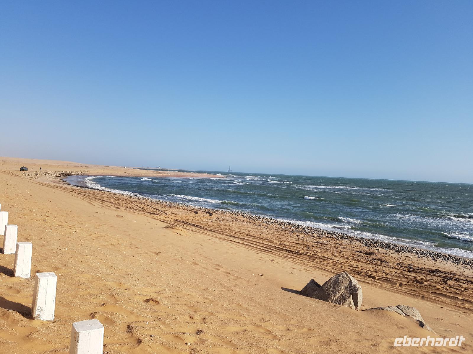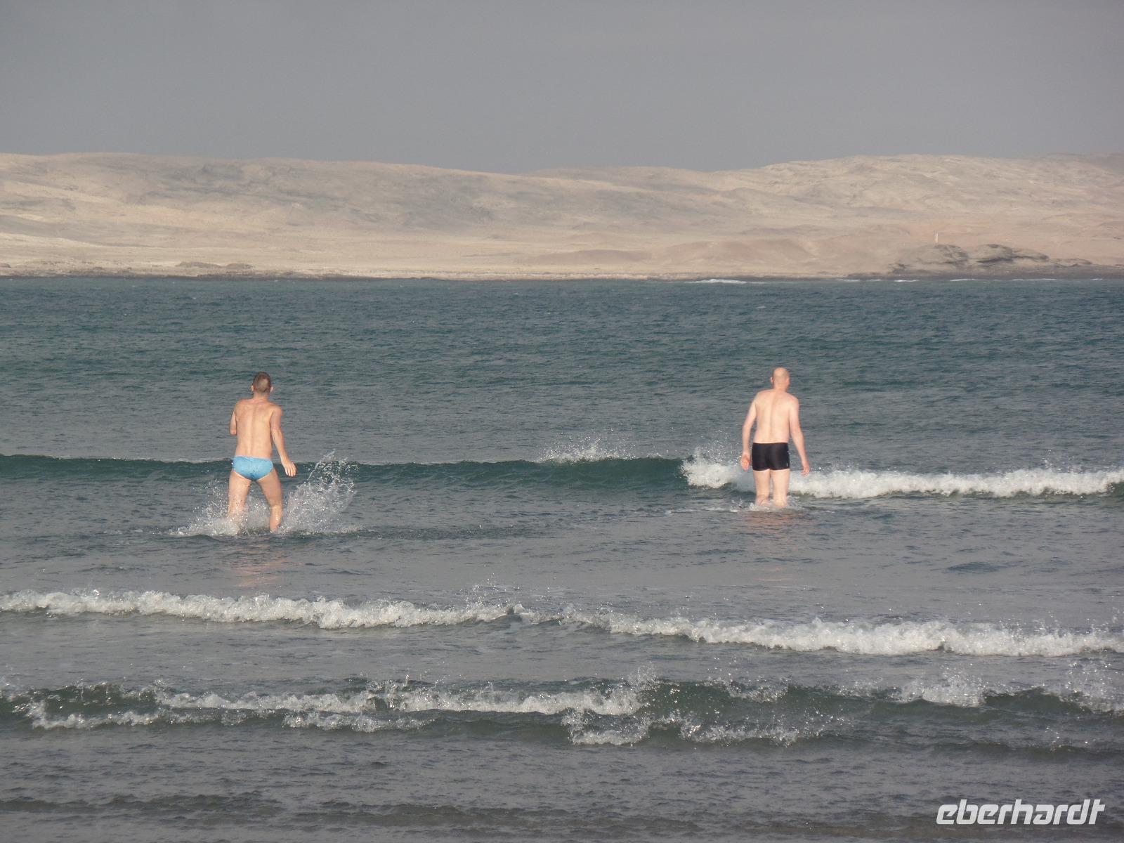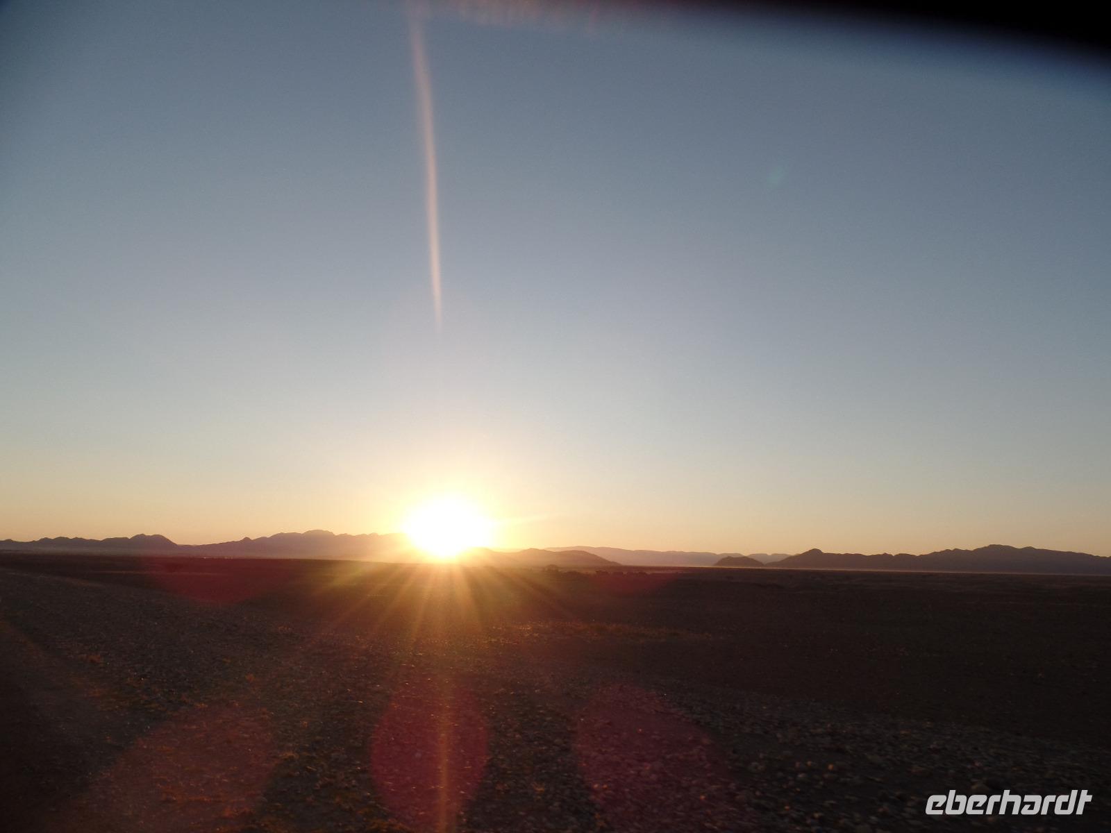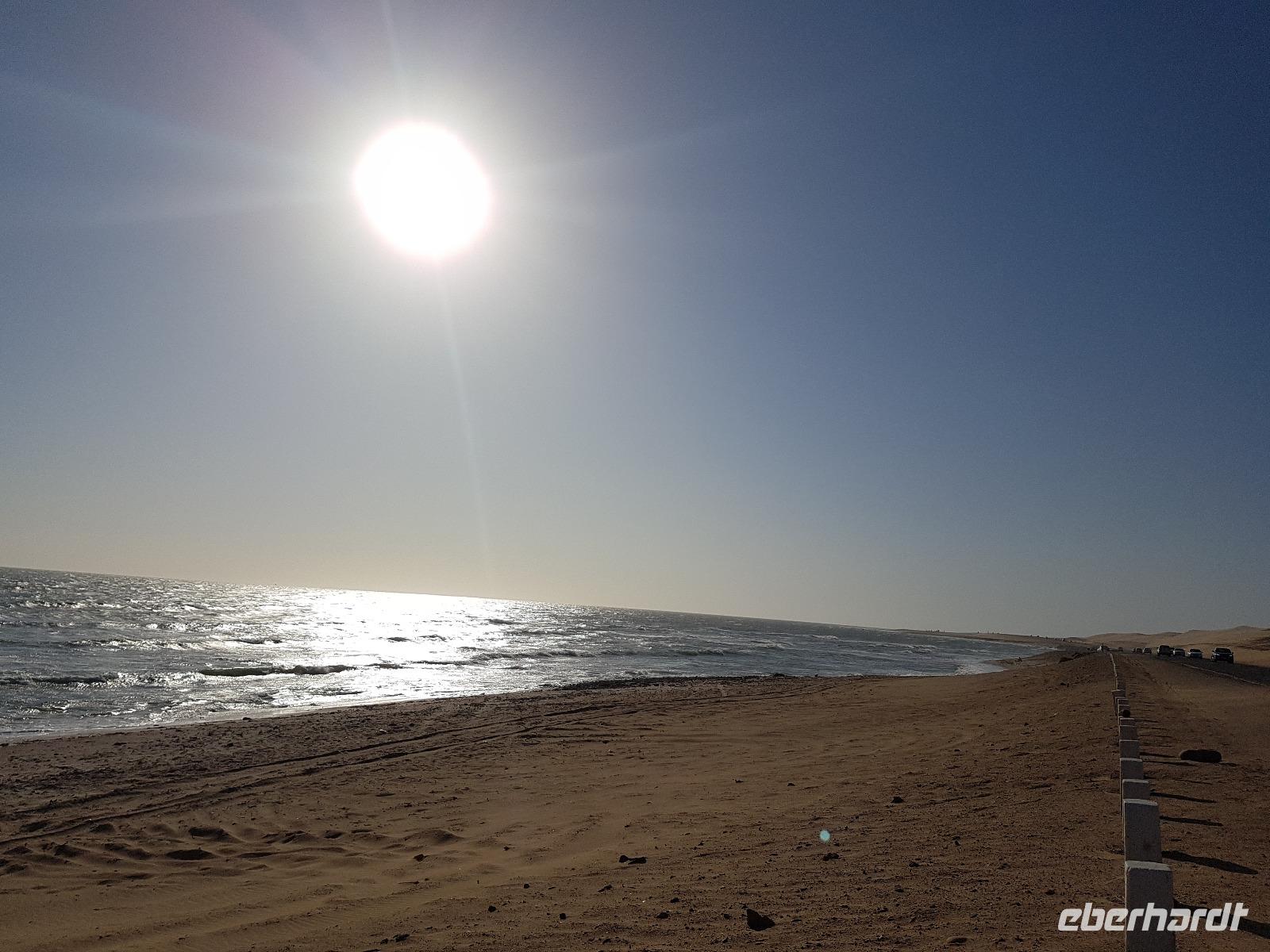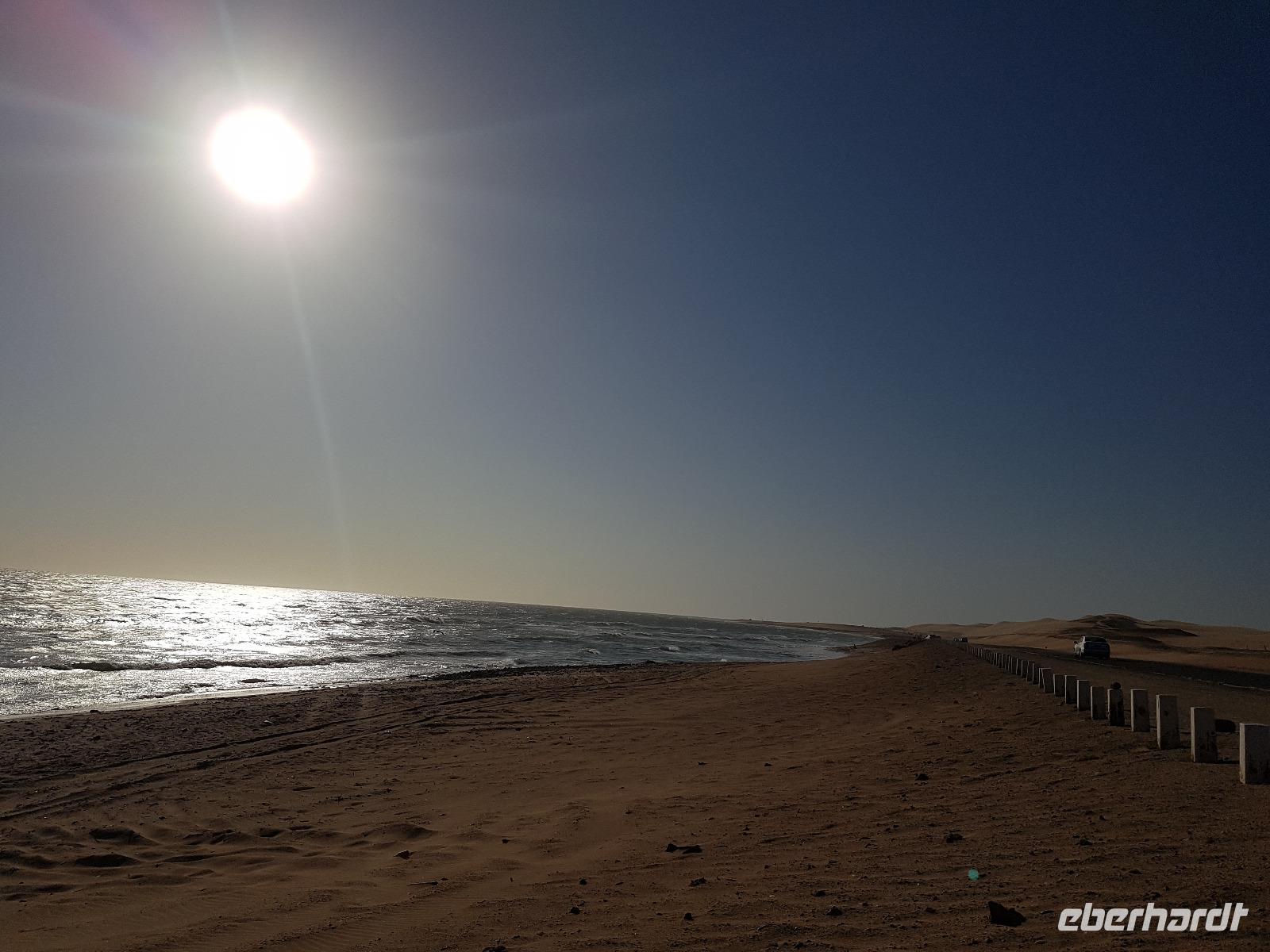 Heute durchqueren wir das karge Naukluftgebirge. Eine Pause in Solitaire war wieder ein Muss, um den frischen Apfelkuchen zu probieren aber auch um die putzigen Erdmännchen zu beobachten. Ganz lustig. Unterwegs passierten wir den südlichen Wendekreis des Steinbocks. An diesem Punkt strahlt die Sonne am 21. Dezember jedes Jahr senkrecht auf die Erde, sodass kein Schatten entsteht. Eine landschaftlich karge, aber wunderschöne Strecke führt uns über den Gaub Pass und durch den Kuiseb Canyon, wo sich Prof. Dr. Henno Martin während des 2. Weltkrieges versteckt hielt. Dieser Geologe ist Autor des Bestsellers "Wenn es Krieg gibt, gehen wir in die Wüste". Am frühen Nachmittag erreichten wir Walvis Bay wo wir Picknick mit Wind machten und später erreichten wir Swakopmund. Hier machten wir mit dem Bus erstmal eine kleine Entdeckungstour durch das Küstenstädtchen mit deutscher Vergangenheit um uns zu orientieren. Das Stadtbild ist von zahlreichen Kolonialbauten geprägt: Altes Amtsgericht, Hohenzollern-Haus und Prinzessin-Rupprecht-Haus, Woermann-Haus mit Damaraturm auf der Bismarckstraße, Bahnhof und sogar ein Leuchtturm fast wie in Warnemünde, könnte man denken. Benjamin ging heute schnell ins Wasser am Ozean um zu testen wie frisch hier der Atlantik ist. Ein beliebter Treffpunkt ist die "Jetty", die alte Seebrücke am Atlantik, wo wir uns um 17 Uhr verabredeten, um den Sonnenuntergang zu erleben. Hier hatte Eberhardt Travel eine Überraschung für alle: Amarola Schnaps um beim Bergfest anzustoßen. Wunderschön. Am Abend kehrten wir hier an der Seebrücke in eines der typischen Lokale "The Tug", den Schlepper ein, wo wir a la carte fangfrischen Fisch probieren konnten.
