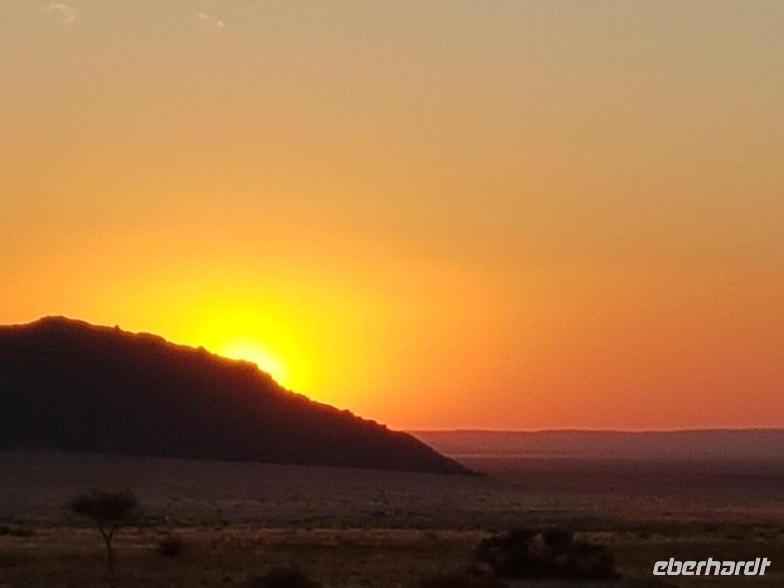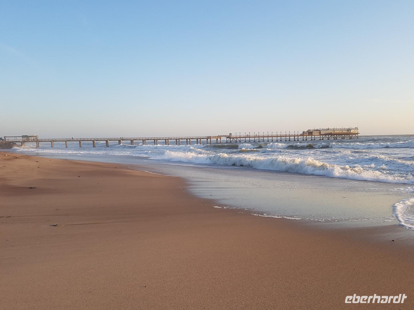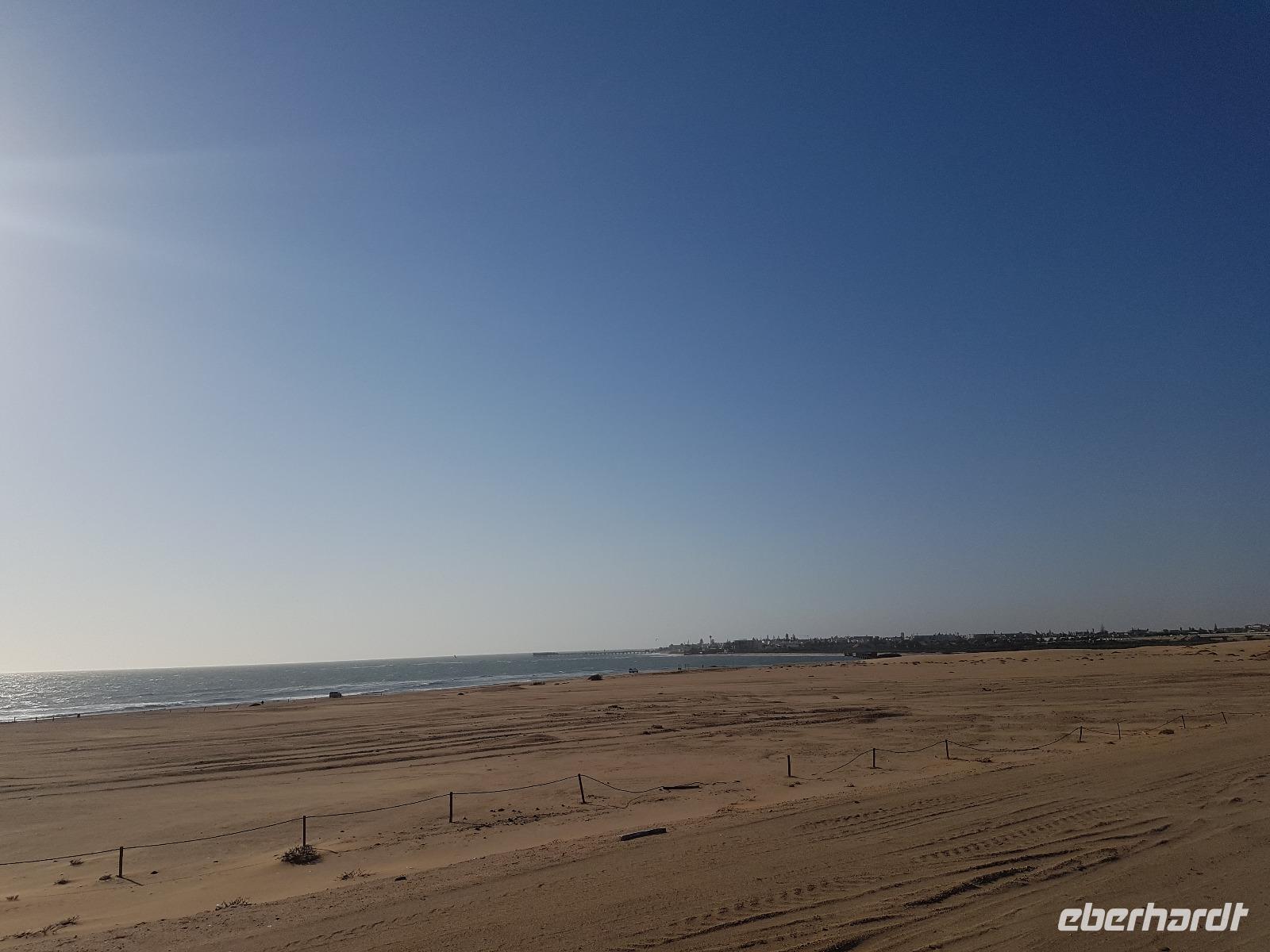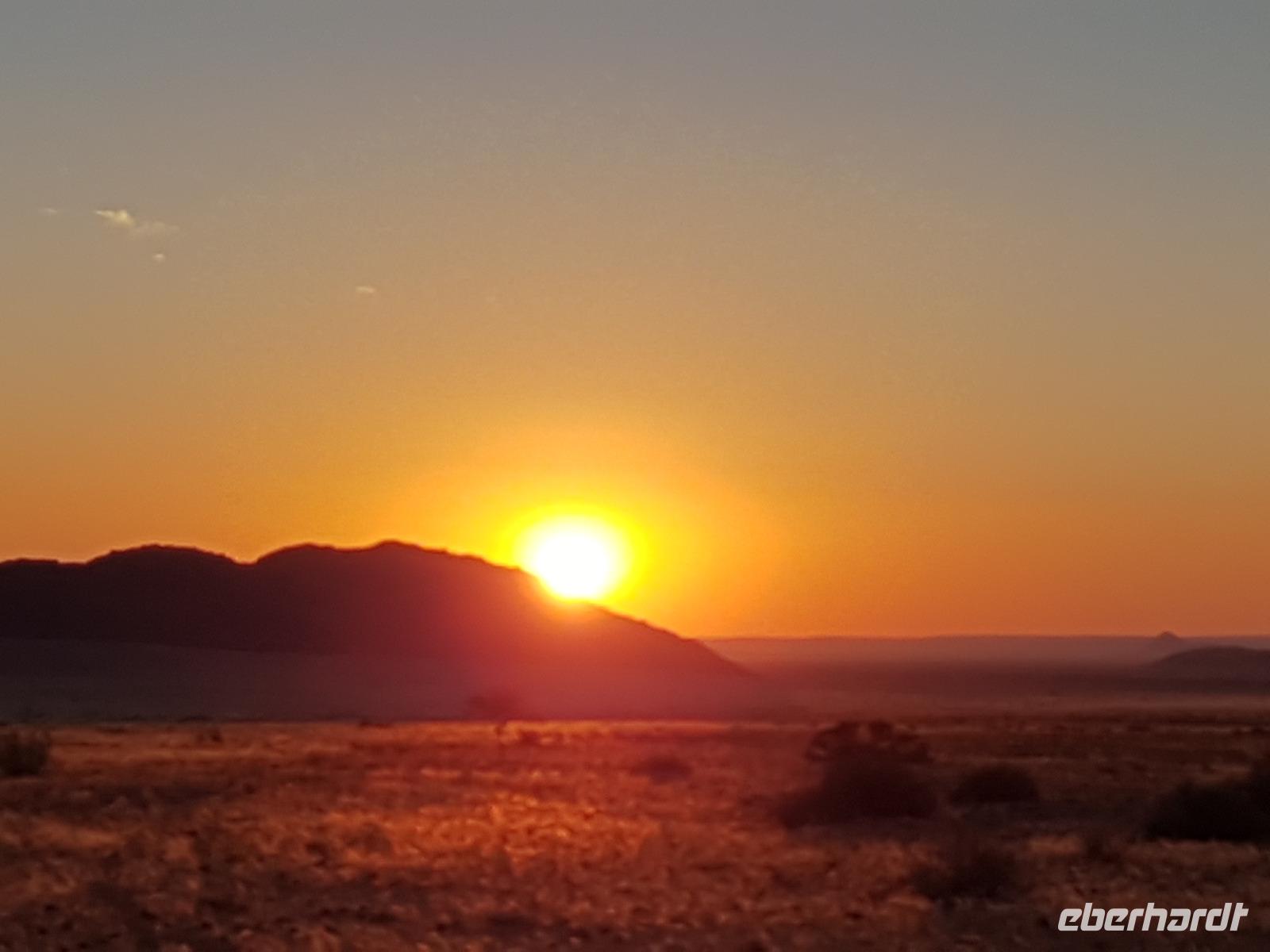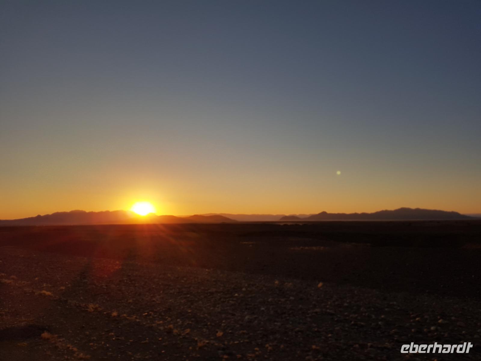 Heute durchqueren wir das karge Naukluftgebirge. Eine Pause in Solitaire war wieder ein Muss, um den frischen Apfelkuchen zu probieren aber auch um die putzigen Erdmännchen zu beobachten. Ganz lustig. Unterwegs passierten wir den südlichen Wendekreis des Steinbocks. An diesem Punkt strahlt die Sonne am 21. Dezember jedes Jahr senkrecht auf die Erde, sodass kein Schatten entsteht. Eine landschaftlich karge, aber wunderschöne Strecke führt uns über den Gaub Pass und durch den Kuiseb Canyon, wo sich Prof. Dr. Henno Martin während des 2. Weltkrieges versteckt hielt. Dieser Geologe ist Autor des Bestsellers "Wenn es Krieg gibt, gehen wir in die Wüste". Am frühen Nachmittag erreichten wir Walvis Bay wo wir Picknick mit Wind machten und später erreichten wir Swakopmund. Hier machten wir mit dem Bus erstmal eine kleine Entdeckungstour durch das Küstenstädtchen mit deutscher Vergangenheit um uns zu orientieren. Das Stadtbild ist von zahlreichen Kolonialbauten geprägt: Altes Amtsgericht, Hohenzollern-Haus und Prinzessin-Rupprecht-Haus, Woermann-Haus mit Damaraturm auf der Bismarckstraße, Bahnhof und sogar ein Leuchtturm fast wie in Warnemünde, könnte man denken. Benjamin ging heute schnell ins Wasser am Ozean um zu testen wie frisch hier der Atlantik ist. Ein beliebter Treffpunkt ist die "Jetty", die alte Seebrücke am Atlantik, wo wir uns um 17 Uhr verabredeten, um den Sonnenuntergang zu erleben. Hier hatte Eberhardt Travel eine Überraschung für alle: Amarola Schnaps um beim Bergfest anzustoßen. Wunderschön. Am Abend kehrten wir hier an der Seebrücke in eines der typischen Lokale "The Tug", den Schlepper ein, wo wir a la carte fangfrischen Fisch probieren konnten.