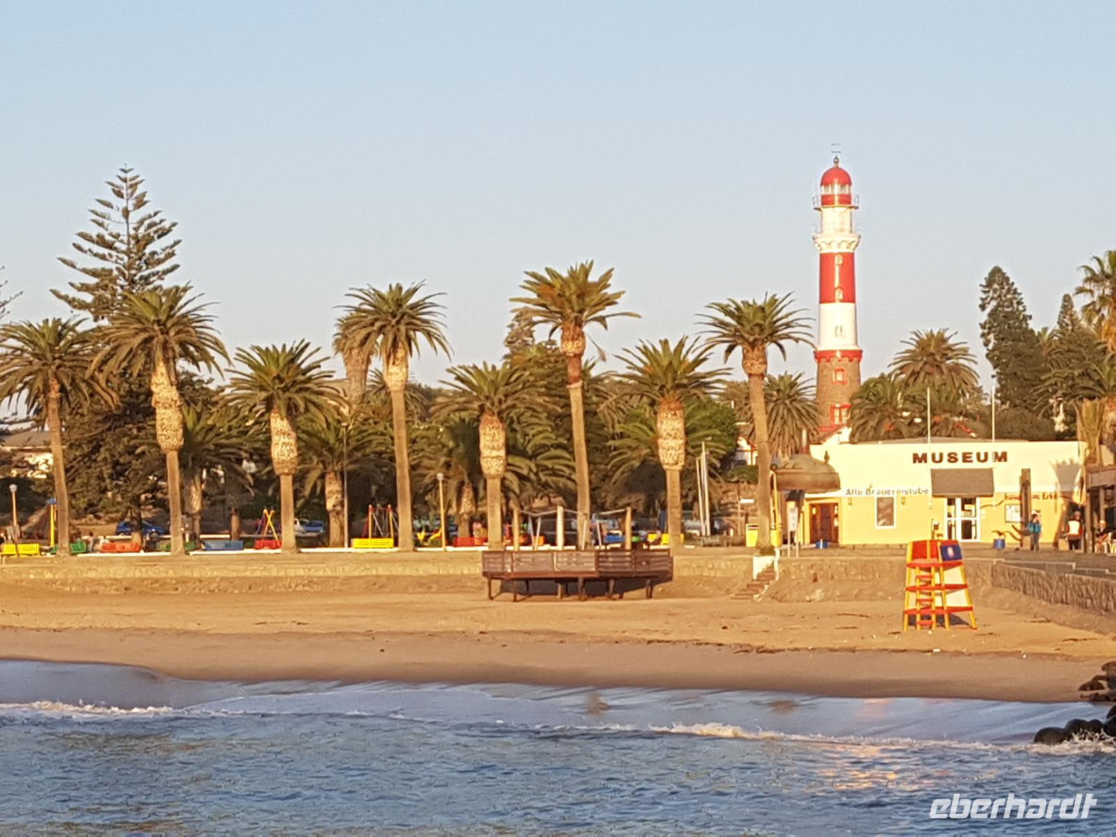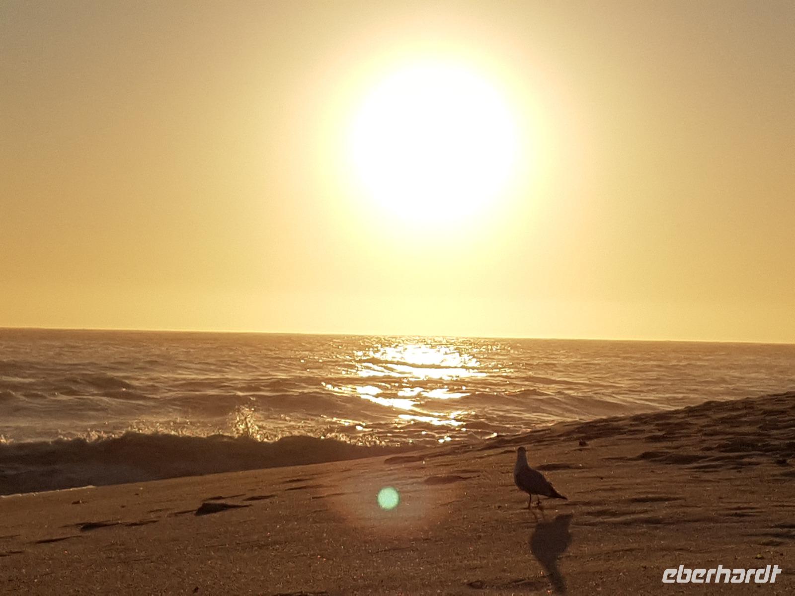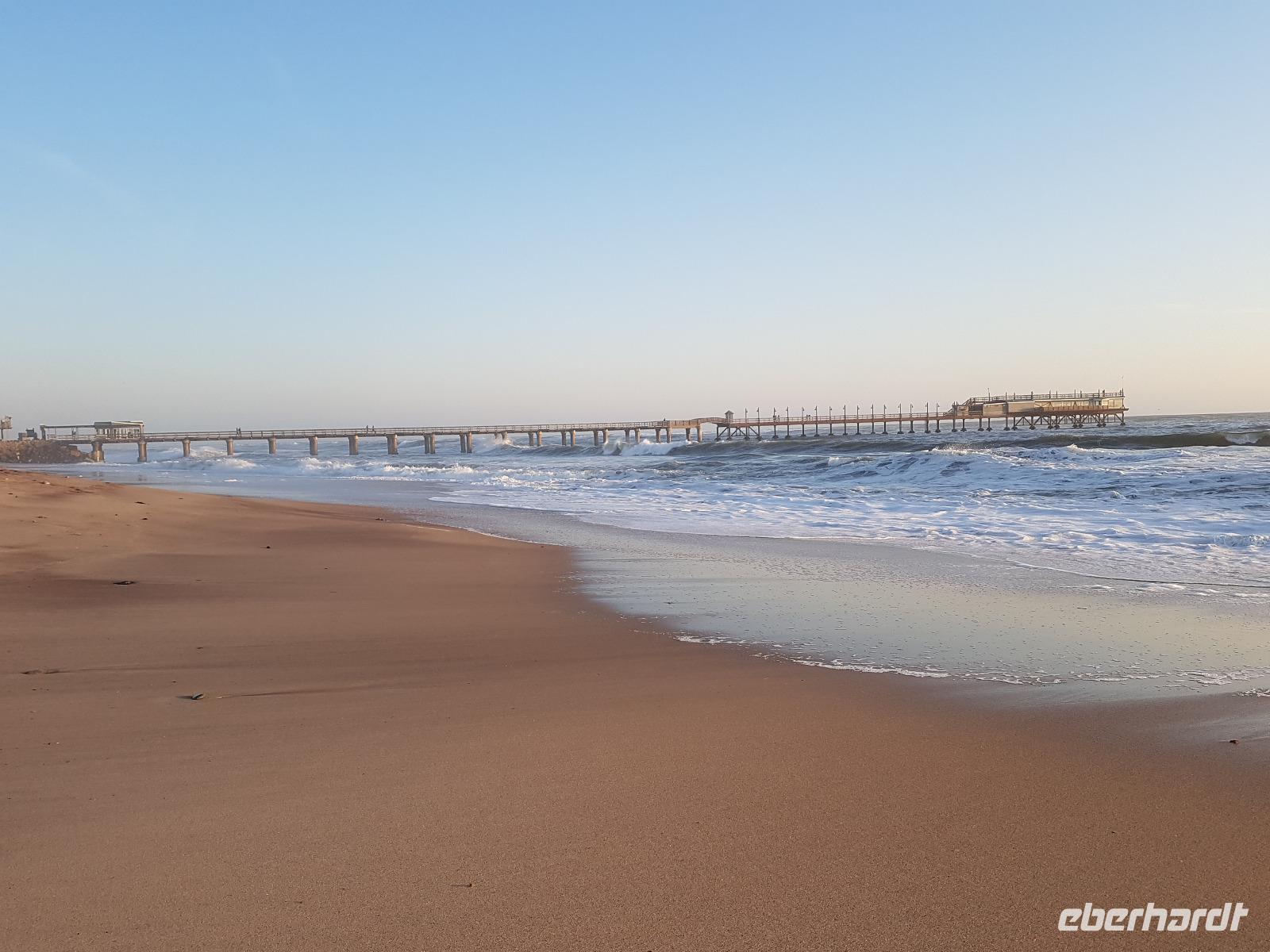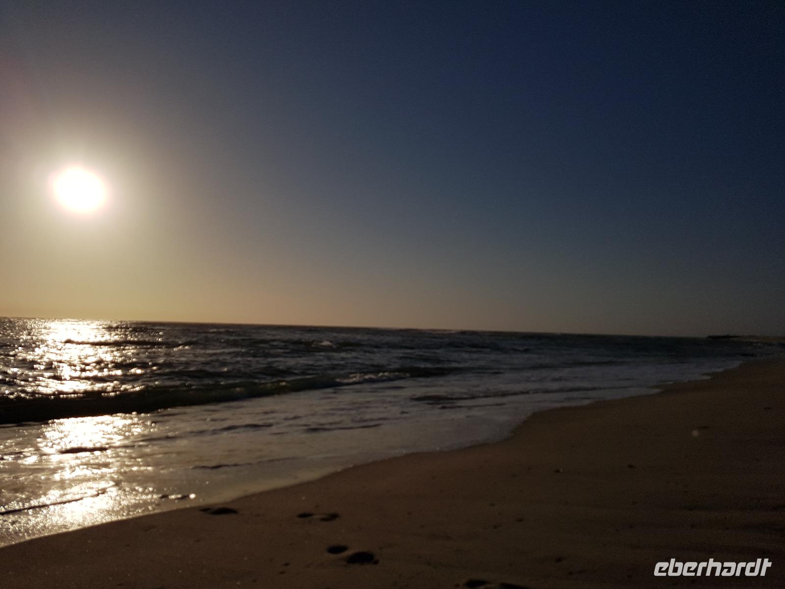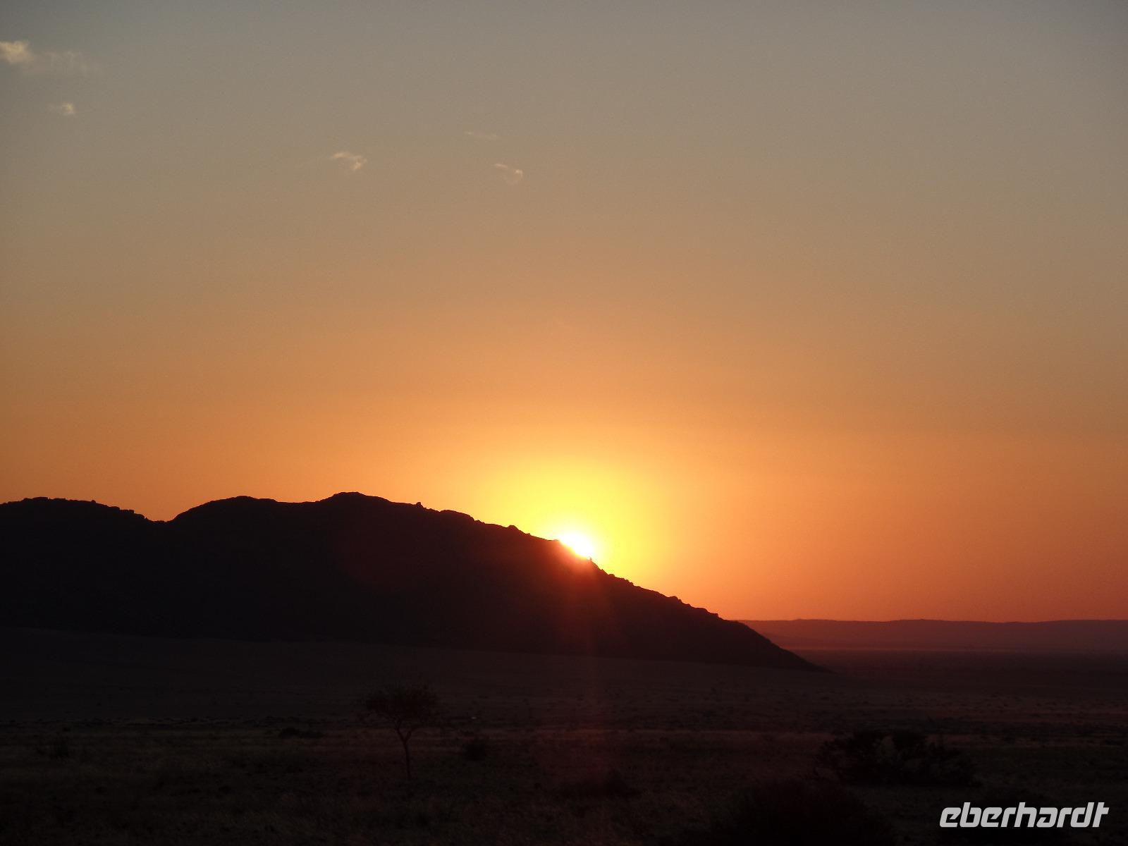 Heute durchqueren wir das karge Naukluftgebirge. Eine Pause in Solitaire war wieder ein Muss, um den frischen Apfelkuchen zu probieren aber auch um die putzigen Erdmännchen zu beobachten. Ganz lustig. Unterwegs passierten wir den südlichen Wendekreis des Steinbocks. An diesem Punkt strahlt die Sonne am 21. Dezember jedes Jahr senkrecht auf die Erde, sodass kein Schatten entsteht. Eine landschaftlich karge, aber wunderschöne Strecke führt uns über den Gaub Pass und durch den Kuiseb Canyon, wo sich Prof. Dr. Henno Martin während des 2. Weltkrieges versteckt hielt. Dieser Geologe ist Autor des Bestsellers "Wenn es Krieg gibt, gehen wir in die Wüste". Am frühen Nachmittag erreichten wir Walvis Bay wo wir Picknick mit Wind machten und später erreichten wir Swakopmund. Hier machten wir mit dem Bus erstmal eine kleine Entdeckungstour durch das Küstenstädtchen mit deutscher Vergangenheit um uns zu orientieren. Das Stadtbild ist von zahlreichen Kolonialbauten geprägt: Altes Amtsgericht, Hohenzollern-Haus und Prinzessin-Rupprecht-Haus, Woermann-Haus mit Damaraturm auf der Bismarckstraße, Bahnhof und sogar ein Leuchtturm fast wie in Warnemünde, könnte man denken. Benjamin ging heute schnell ins Wasser am Ozean um zu testen wie frisch hier der Atlantik ist. Ein beliebter Treffpunkt ist die "Jetty", die alte Seebrücke am Atlantik, wo wir uns um 17 Uhr verabredeten, um den Sonnenuntergang zu erleben. Hier hatte Eberhardt Travel eine Überraschung für alle: Amarola Schnaps um beim Bergfest anzustoßen. Wunderschön. Am Abend kehrten wir hier an der Seebrücke in eines der typischen Lokale "The Tug", den Schlepper ein, wo wir a la carte fangfrischen Fisch probieren konnten.