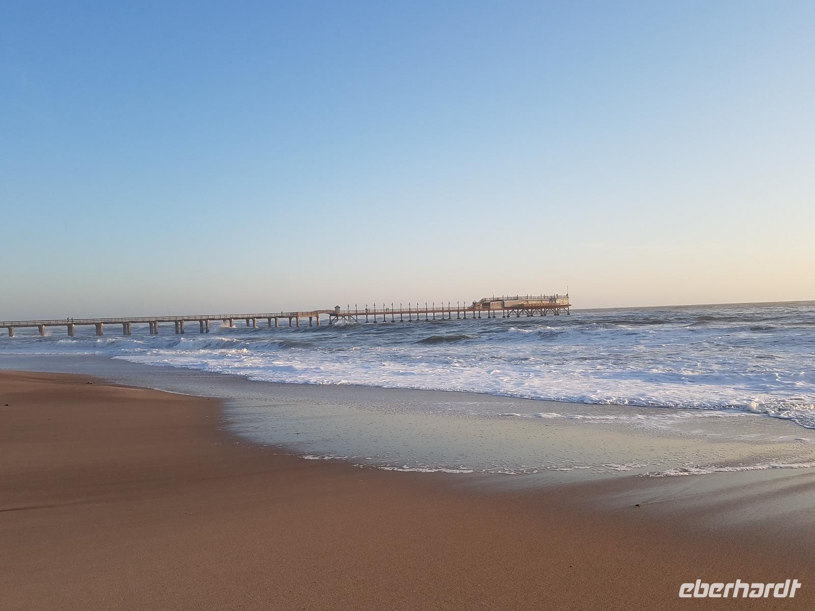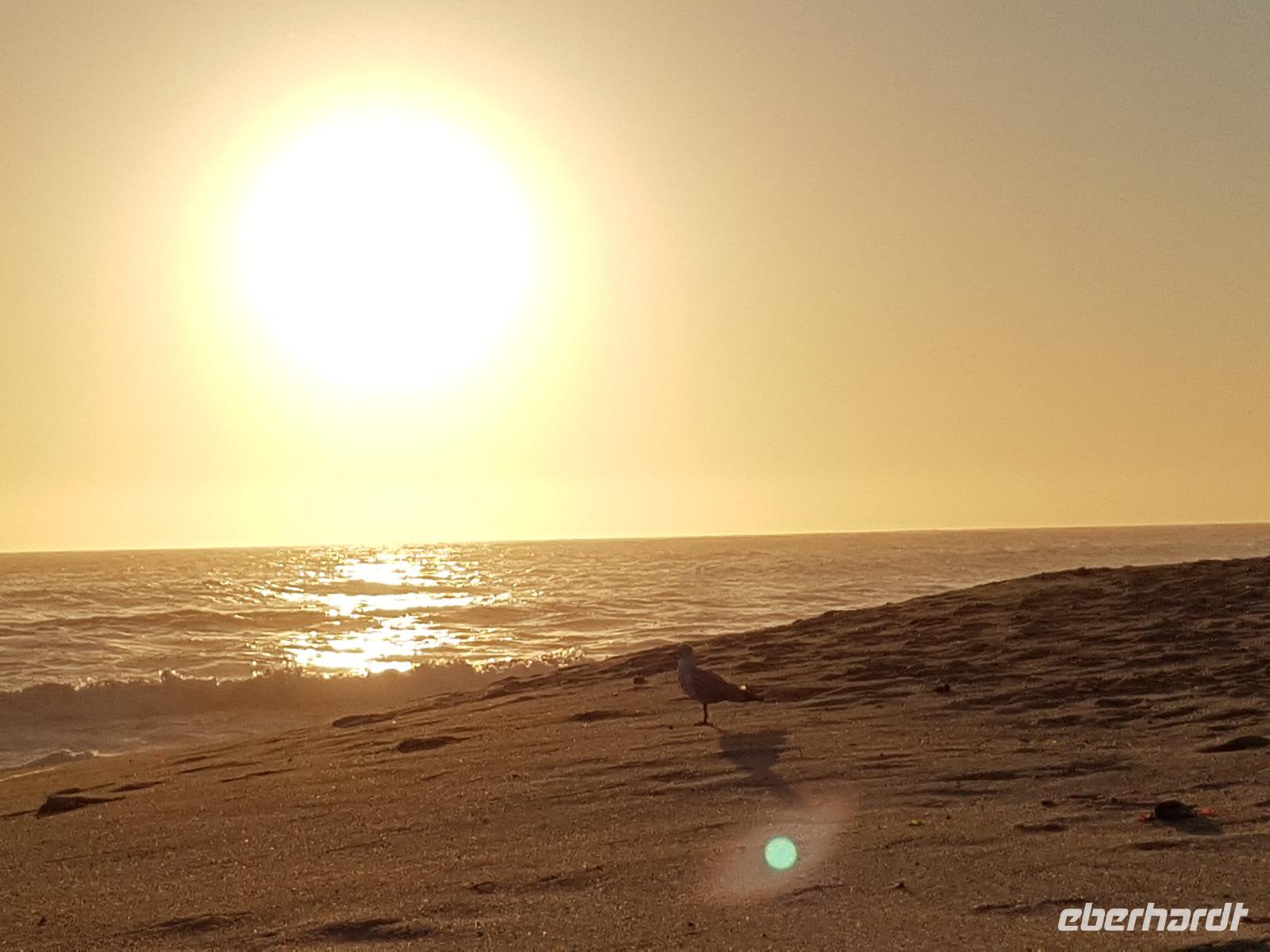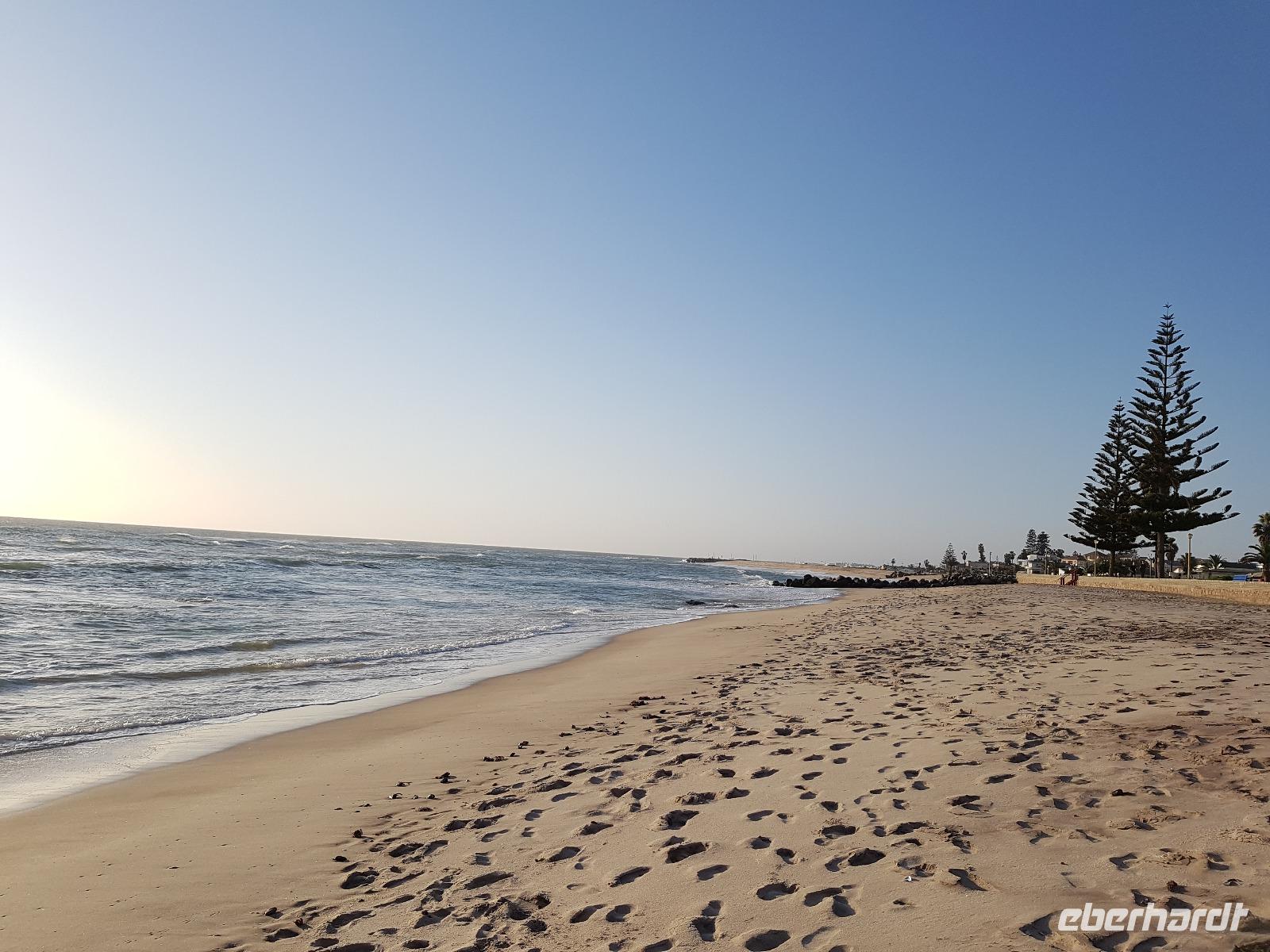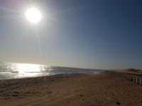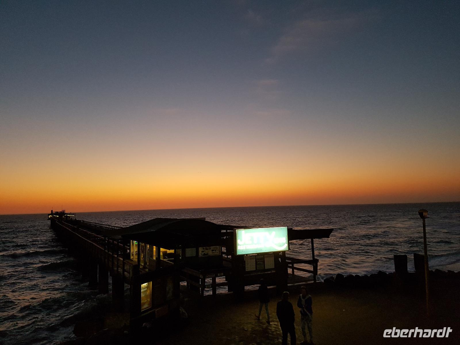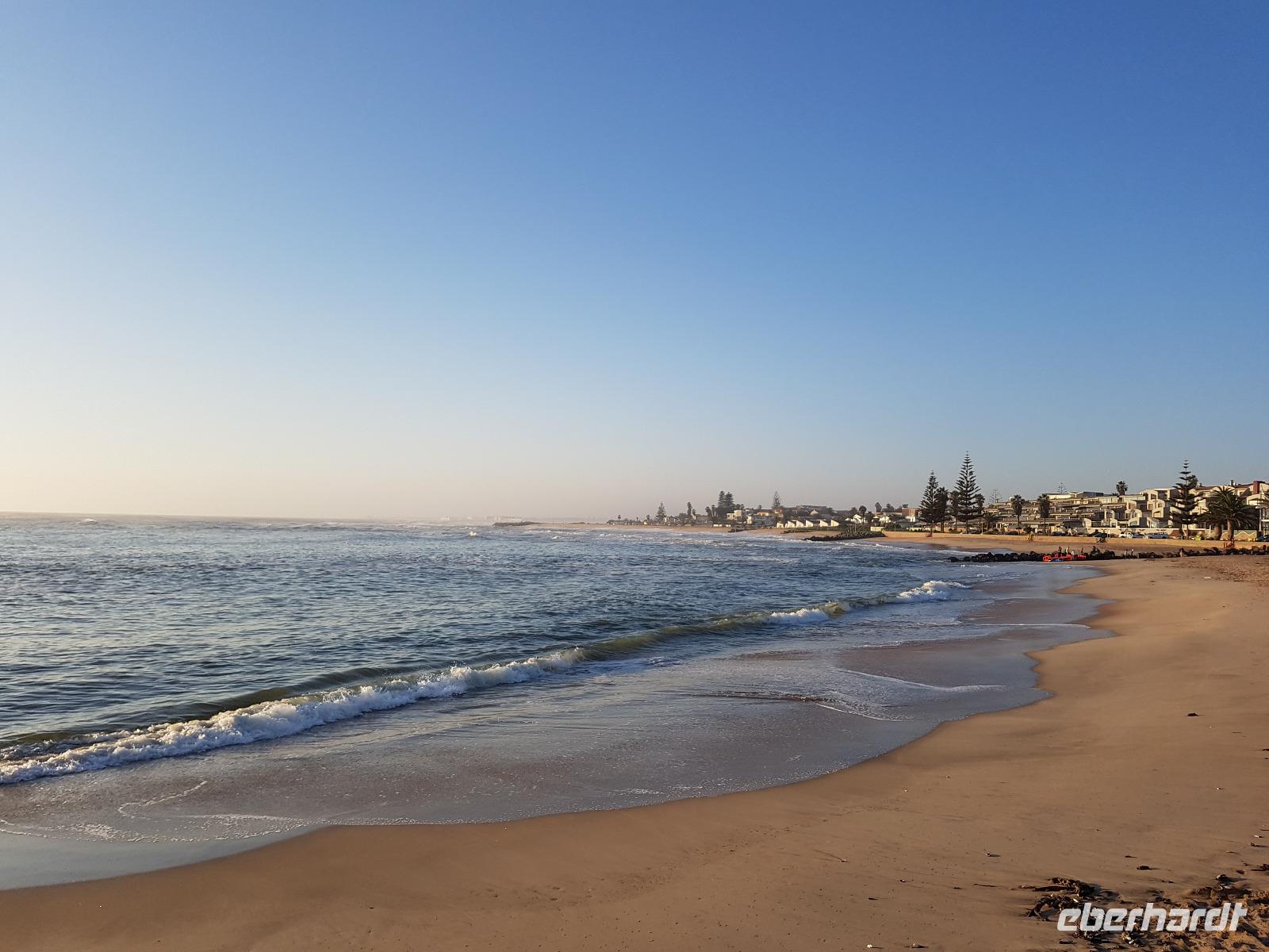 Heute durchqueren wir das karge Naukluftgebirge. Eine Pause in Solitaire war wieder ein Muss, um den frischen Apfelkuchen zu probieren aber auch um die putzigen Erdmännchen zu beobachten. Ganz lustig. Unterwegs passierten wir den südlichen Wendekreis des Steinbocks. An diesem Punkt strahlt die Sonne am 21. Dezember jedes Jahr senkrecht auf die Erde, sodass kein Schatten entsteht. Eine landschaftlich karge, aber wunderschöne Strecke führt uns über den Gaub Pass und durch den Kuiseb Canyon, wo sich Prof. Dr. Henno Martin während des 2. Weltkrieges versteckt hielt. Dieser Geologe ist Autor des Bestsellers "Wenn es Krieg gibt, gehen wir in die Wüste". Am frühen Nachmittag erreichten wir Walvis Bay wo wir Picknick mit Wind machten und später erreichten wir Swakopmund. Hier machten wir mit dem Bus erstmal eine kleine Entdeckungstour durch das Küstenstädtchen mit deutscher Vergangenheit um uns zu orientieren. Das Stadtbild ist von zahlreichen Kolonialbauten geprägt: Altes Amtsgericht, Hohenzollern-Haus und Prinzessin-Rupprecht-Haus, Woermann-Haus mit Damaraturm auf der Bismarckstraße, Bahnhof und sogar ein Leuchtturm fast wie in Warnemünde, könnte man denken. Benjamin ging heute schnell ins Wasser am Ozean um zu testen wie frisch hier der Atlantik ist. Ein beliebter Treffpunkt ist die "Jetty", die alte Seebrücke am Atlantik, wo wir uns um 17 Uhr verabredeten, um den Sonnenuntergang zu erleben. Hier hatte Eberhardt Travel eine Überraschung für alle: Amarola Schnaps um beim Bergfest anzustoßen. Wunderschön. Am Abend kehrten wir hier an der Seebrücke in eines der typischen Lokale "The Tug", den Schlepper ein, wo wir a la carte fangfrischen Fisch probieren konnten.