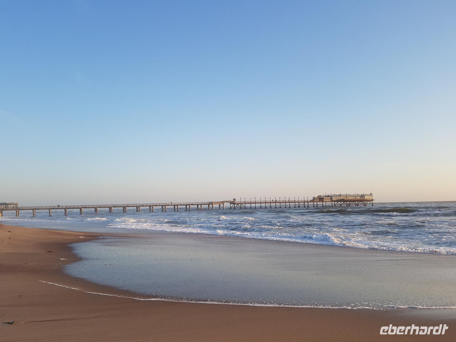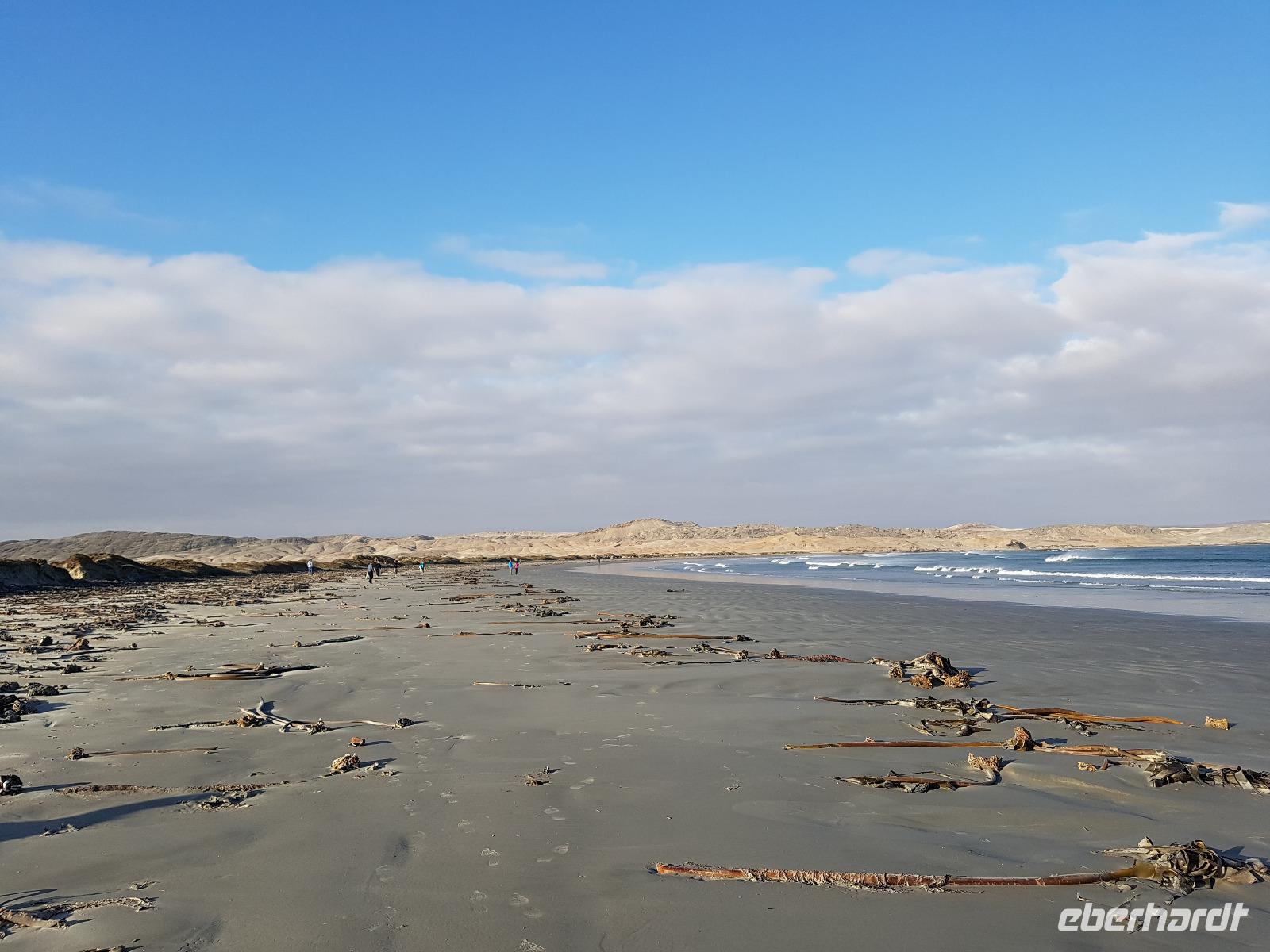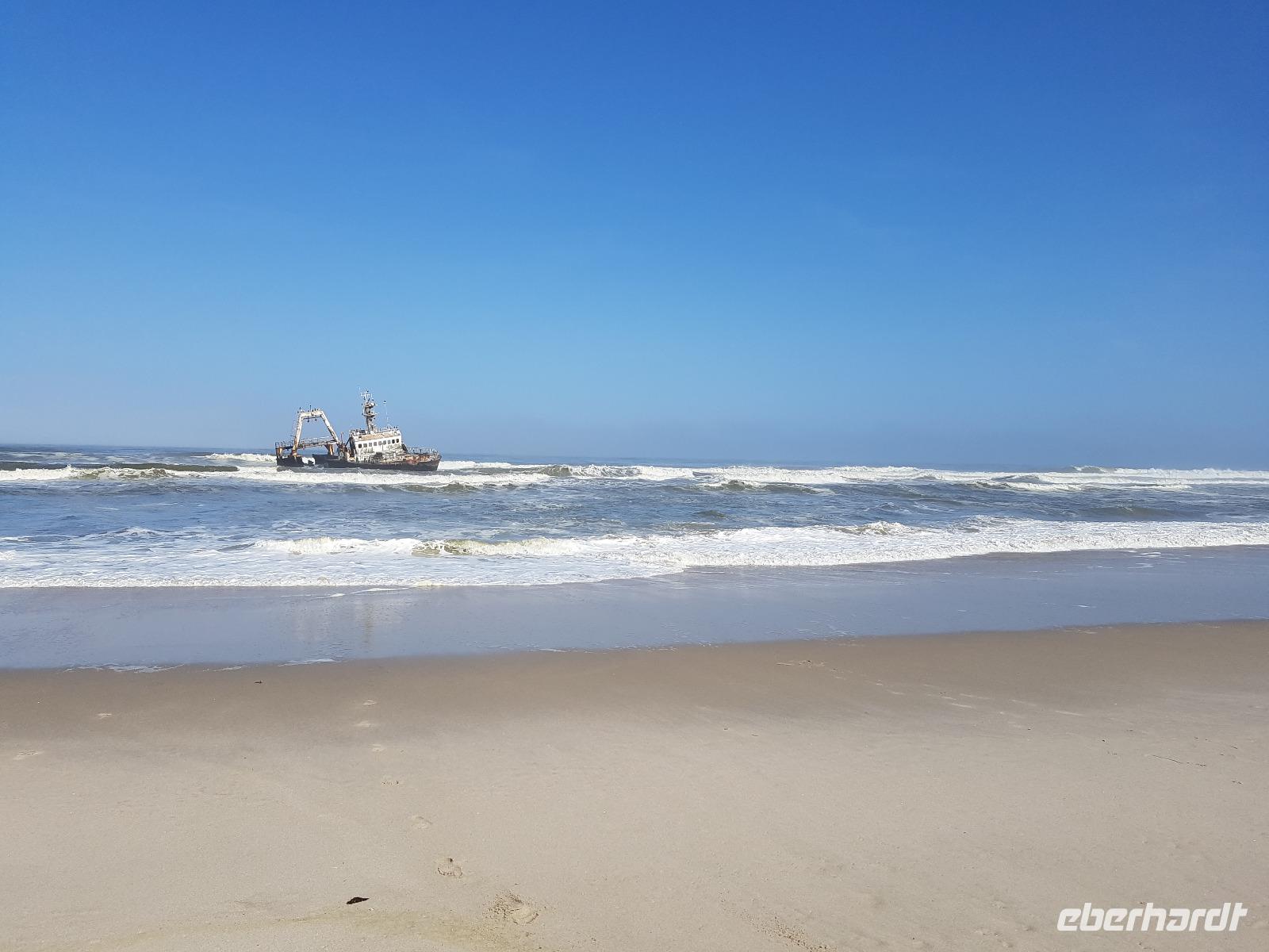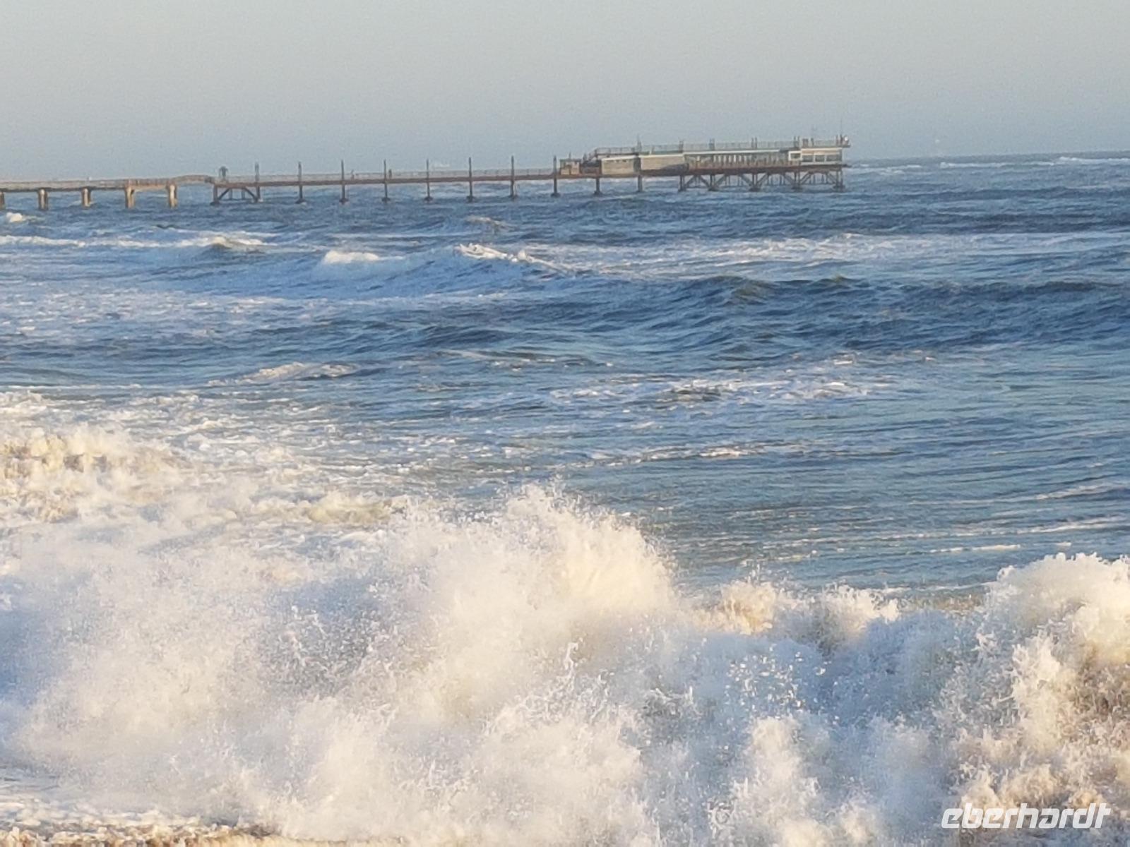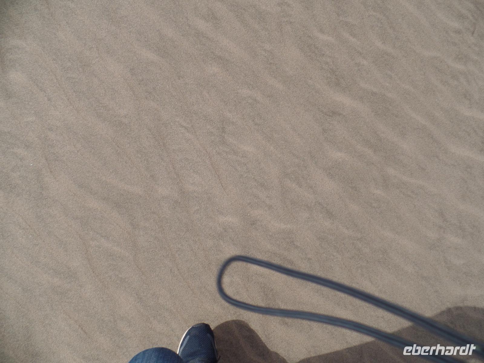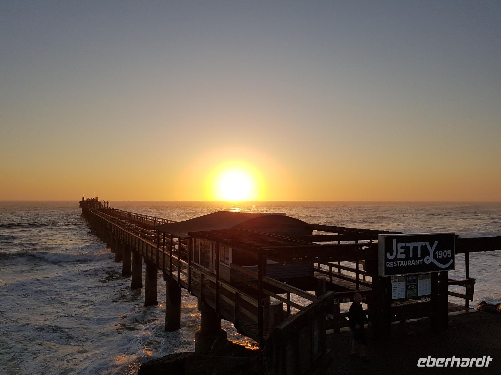 Heute durchqueren wir das karge Naukluftgebirge. Eine Pause in Solitaire war wieder ein Muss, um den frischen Apfelkuchen zu probieren aber auch um die putzigen Erdmännchen zu beobachten. Ganz lustig. Unterwegs passierten wir den südlichen Wendekreis des Steinbocks. An diesem Punkt strahlt die Sonne am 21. Dezember jedes Jahr senkrecht auf die Erde, sodass kein Schatten entsteht. Eine landschaftlich karge, aber wunderschöne Strecke führt uns über den Gaub Pass und durch den Kuiseb Canyon, wo sich Prof. Dr. Henno Martin während des 2. Weltkrieges versteckt hielt. Dieser Geologe ist Autor des Bestsellers "Wenn es Krieg gibt, gehen wir in die Wüste". Am frühen Nachmittag erreichten wir Walvis Bay wo wir Picknick mit Wind machten und später erreichten wir Swakopmund. Hier machten wir mit dem Bus erstmal eine kleine Entdeckungstour durch das Küstenstädtchen mit deutscher Vergangenheit um uns zu orientieren. Das Stadtbild ist von zahlreichen Kolonialbauten geprägt: Altes Amtsgericht, Hohenzollern-Haus und Prinzessin-Rupprecht-Haus, Woermann-Haus mit Damaraturm auf der Bismarckstraße, Bahnhof und sogar ein Leuchtturm fast wie in Warnemünde, könnte man denken. Benjamin ging heute schnell ins Wasser am Ozean um zu testen wie frisch hier der Atlantik ist. Ein beliebter Treffpunkt ist die "Jetty", die alte Seebrücke am Atlantik, wo wir uns um 17 Uhr verabredeten, um den Sonnenuntergang zu erleben. Hier hatte Eberhardt Travel eine Überraschung für alle: Amarola Schnaps um beim Bergfest anzustoßen. Wunderschön. Am Abend kehrten wir hier an der Seebrücke in eines der typischen Lokale "The Tug", den Schlepper ein, wo wir a la carte fangfrischen Fisch probieren konnten.