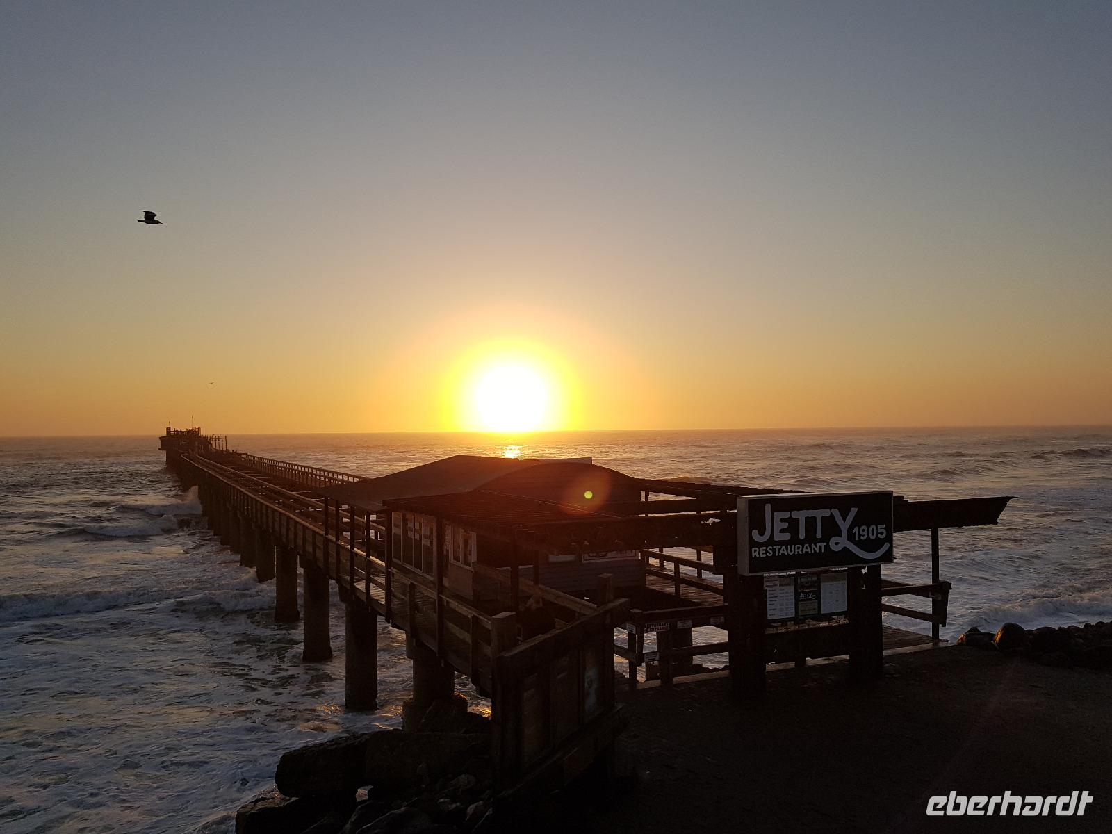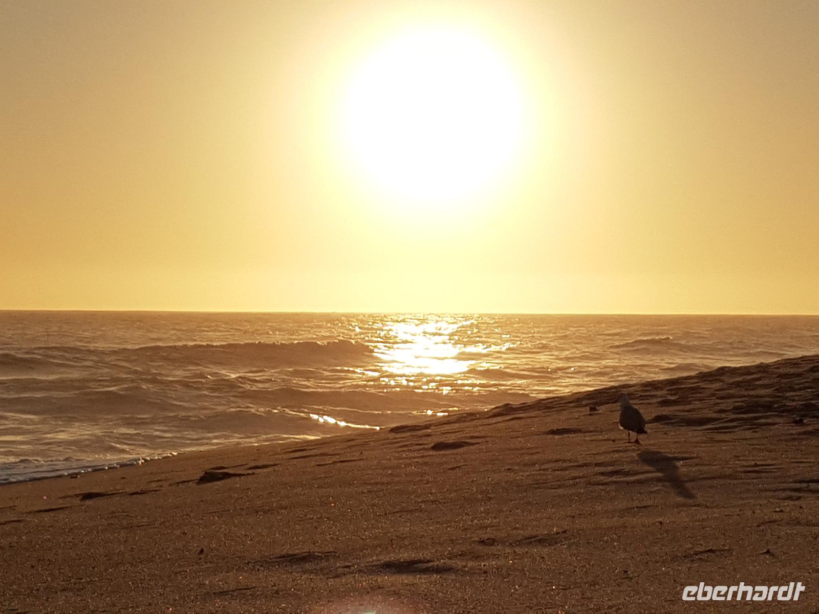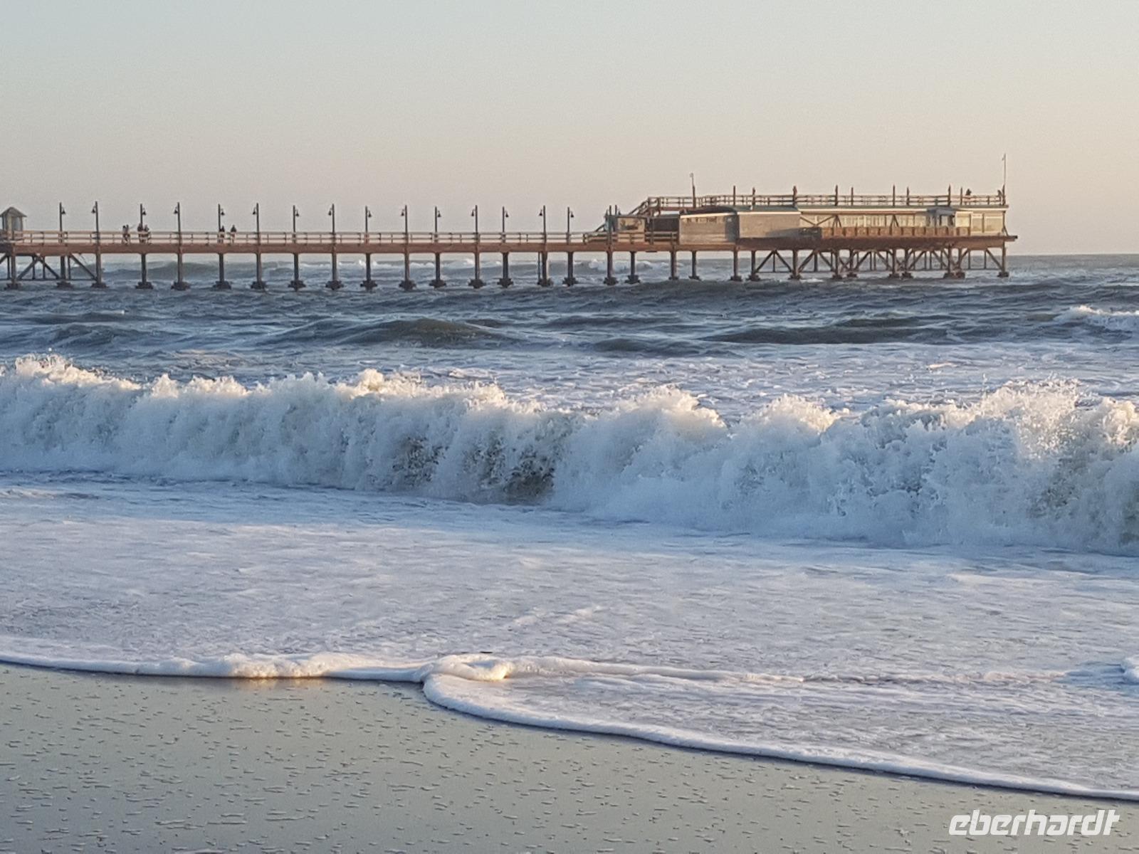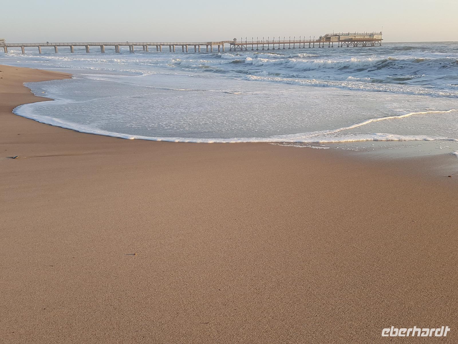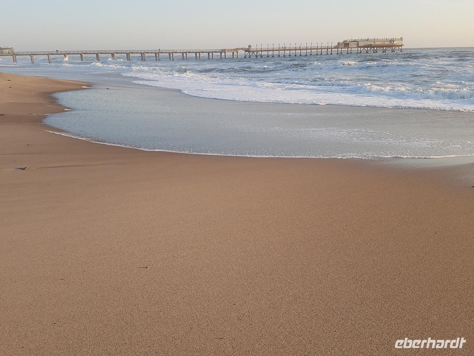 Heute durchqueren wir das karge Naukluftgebirge. Eine Pause in Solitaire war wieder ein Muss, um den frischen Apfelkuchen zu probieren aber auch um die putzigen Erdmännchen zu beobachten. Ganz lustig. Unterwegs passierten wir den südlichen Wendekreis des Steinbocks. An diesem Punkt strahlt die Sonne am 21. Dezember jedes Jahr senkrecht auf die Erde, sodass kein Schatten entsteht. Eine landschaftlich karge, aber wunderschöne Strecke führt uns über den Gaub Pass und durch den Kuiseb Canyon, wo sich Prof. Dr. Henno Martin während des 2. Weltkrieges versteckt hielt. Dieser Geologe ist Autor des Bestsellers "Wenn es Krieg gibt, gehen wir in die Wüste". Am frühen Nachmittag erreichten wir Walvis Bay wo wir Picknick mit Wind machten und später erreichten wir Swakopmund. Hier machten wir mit dem Bus erstmal eine kleine Entdeckungstour durch das Küstenstädtchen mit deutscher Vergangenheit um uns zu orientieren. Das Stadtbild ist von zahlreichen Kolonialbauten geprägt: Altes Amtsgericht, Hohenzollern-Haus und Prinzessin-Rupprecht-Haus, Woermann-Haus mit Damaraturm auf der Bismarckstraße, Bahnhof und sogar ein Leuchtturm fast wie in Warnemünde, könnte man denken. Benjamin ging heute schnell ins Wasser am Ozean um zu testen wie frisch hier der Atlantik ist. Ein beliebter Treffpunkt ist die "Jetty", die alte Seebrücke am Atlantik, wo wir uns um 17 Uhr verabredeten, um den Sonnenuntergang zu erleben. Hier hatte Eberhardt Travel eine Überraschung für alle: Amarola Schnaps um beim Bergfest anzustoßen. Wunderschön. Am Abend kehrten wir hier an der Seebrücke in eines der typischen Lokale "The Tug", den Schlepper ein, wo wir a la carte fangfrischen Fisch probieren konnten.