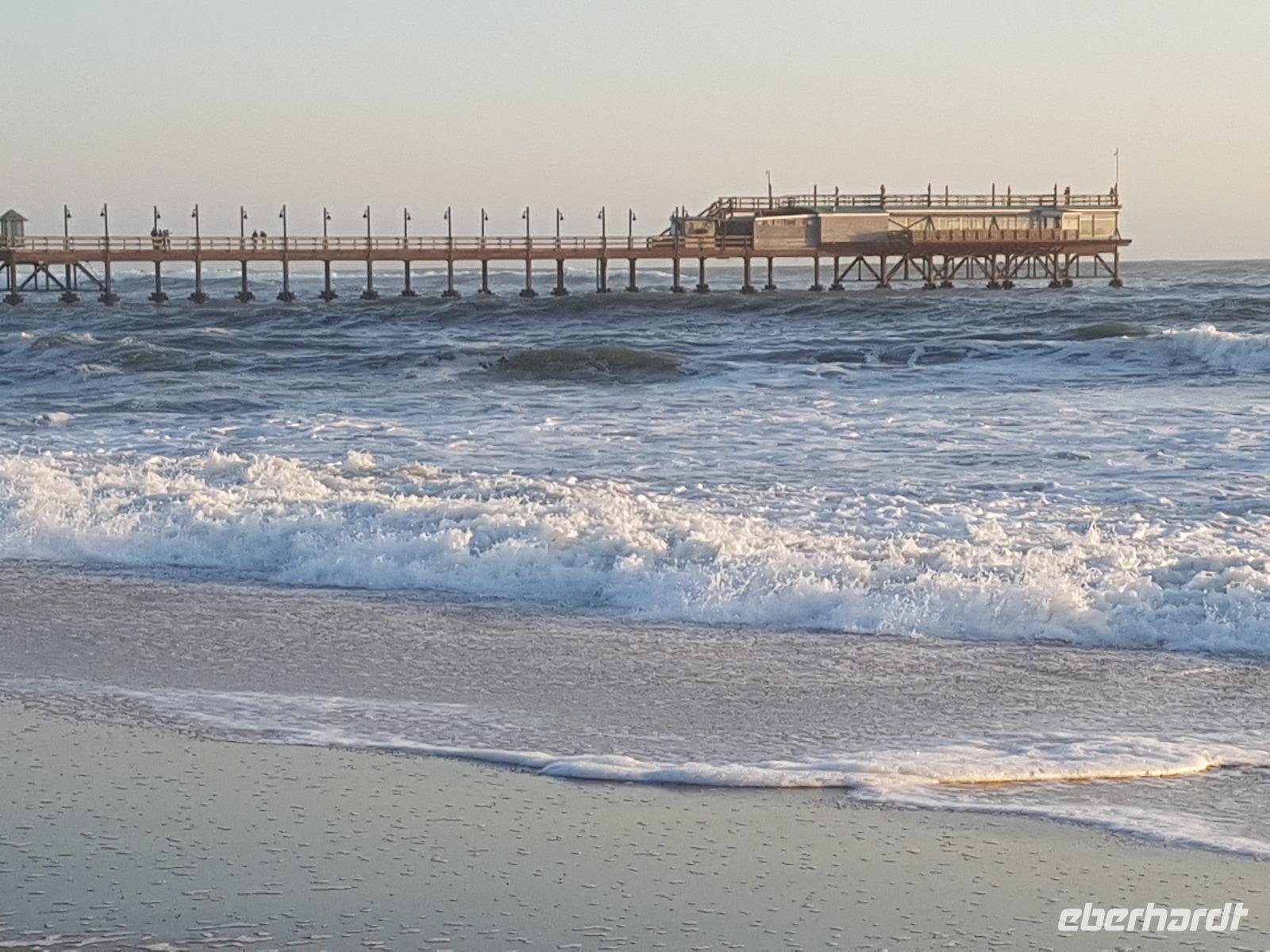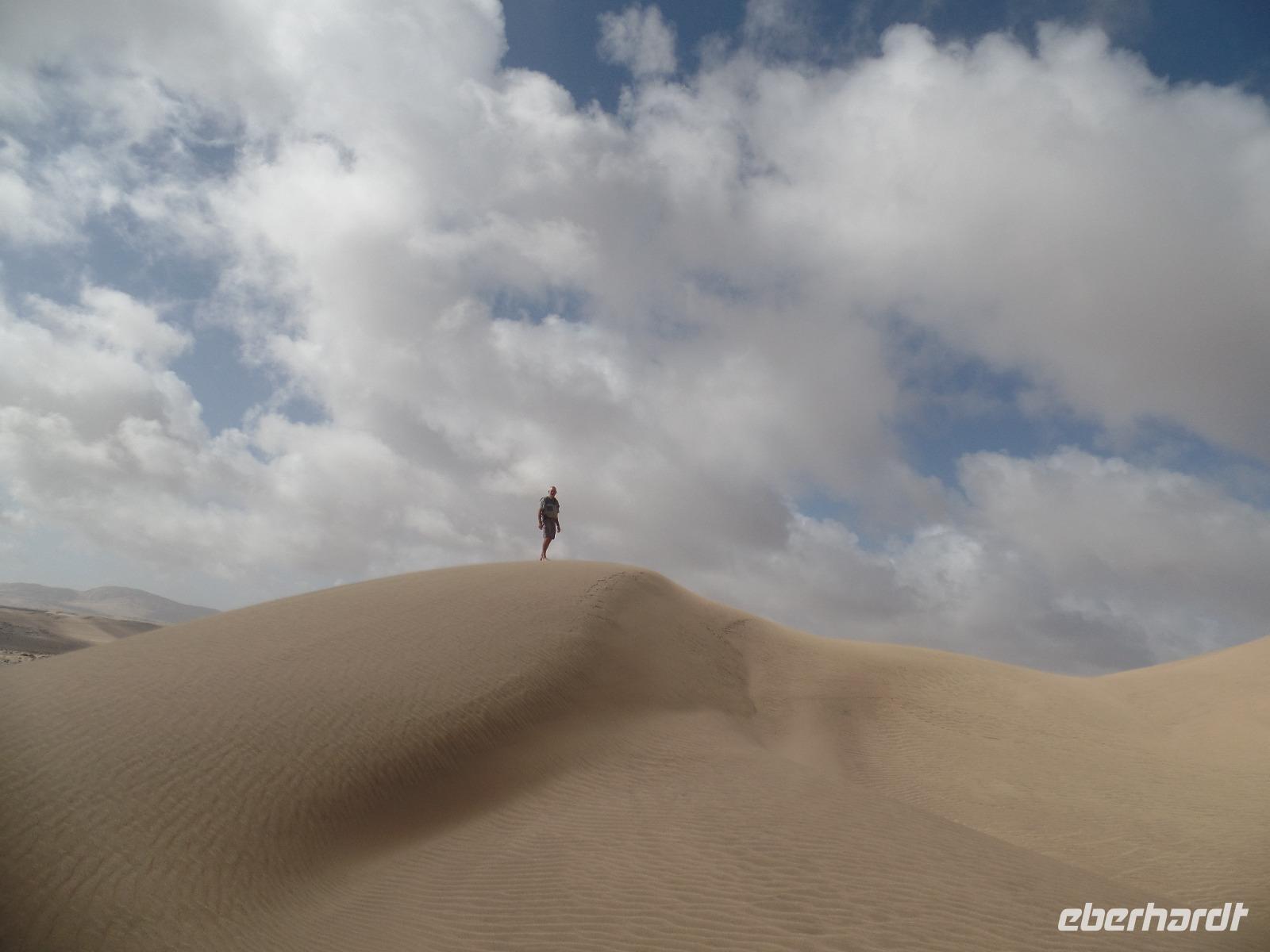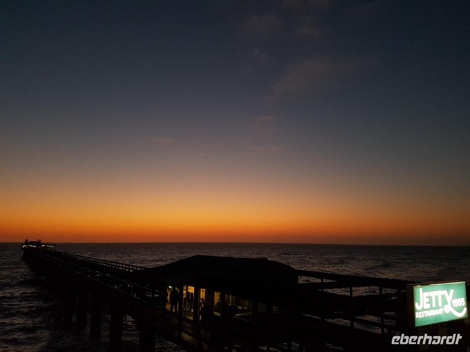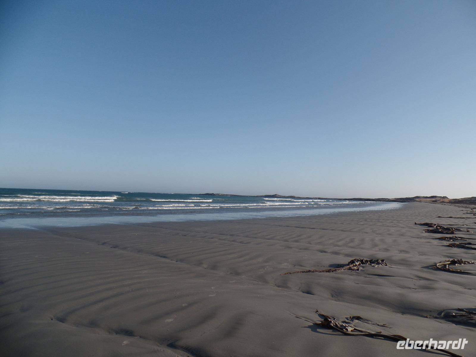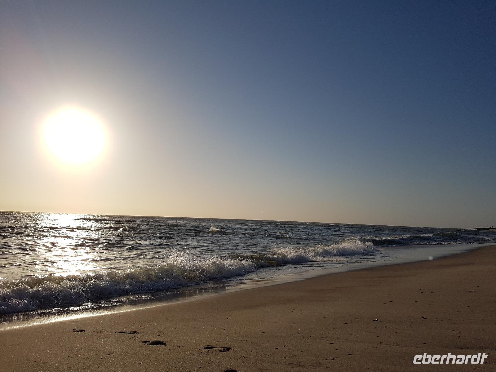 Heute durchqueren wir das karge Naukluftgebirge. Eine Pause in Solitaire war wieder ein Muss, um den frischen Apfelkuchen zu probieren aber auch um die putzigen Erdmännchen zu beobachten. Ganz lustig. Unterwegs passierten wir den südlichen Wendekreis des Steinbocks. An diesem Punkt strahlt die Sonne am 21. Dezember jedes Jahr senkrecht auf die Erde, sodass kein Schatten entsteht. Eine landschaftlich karge, aber wunderschöne Strecke führt uns über den Gaub Pass und durch den Kuiseb Canyon, wo sich Prof. Dr. Henno Martin während des 2. Weltkrieges versteckt hielt. Dieser Geologe ist Autor des Bestsellers "Wenn es Krieg gibt, gehen wir in die Wüste". Am frühen Nachmittag erreichten wir Walvis Bay wo wir Picknick mit Wind machten und später erreichten wir Swakopmund. Hier machten wir mit dem Bus erstmal eine kleine Entdeckungstour durch das Küstenstädtchen mit deutscher Vergangenheit um uns zu orientieren. Das Stadtbild ist von zahlreichen Kolonialbauten geprägt: Altes Amtsgericht, Hohenzollern-Haus und Prinzessin-Rupprecht-Haus, Woermann-Haus mit Damaraturm auf der Bismarckstraße, Bahnhof und sogar ein Leuchtturm fast wie in Warnemünde, könnte man denken. Benjamin ging heute schnell ins Wasser am Ozean um zu testen wie frisch hier der Atlantik ist. Ein beliebter Treffpunkt ist die "Jetty", die alte Seebrücke am Atlantik, wo wir uns um 17 Uhr verabredeten, um den Sonnenuntergang zu erleben. Hier hatte Eberhardt Travel eine Überraschung für alle: Amarola Schnaps um beim Bergfest anzustoßen. Wunderschön. Am Abend kehrten wir hier an der Seebrücke in eines der typischen Lokale "The Tug", den Schlepper ein, wo wir a la carte fangfrischen Fisch probieren konnten.