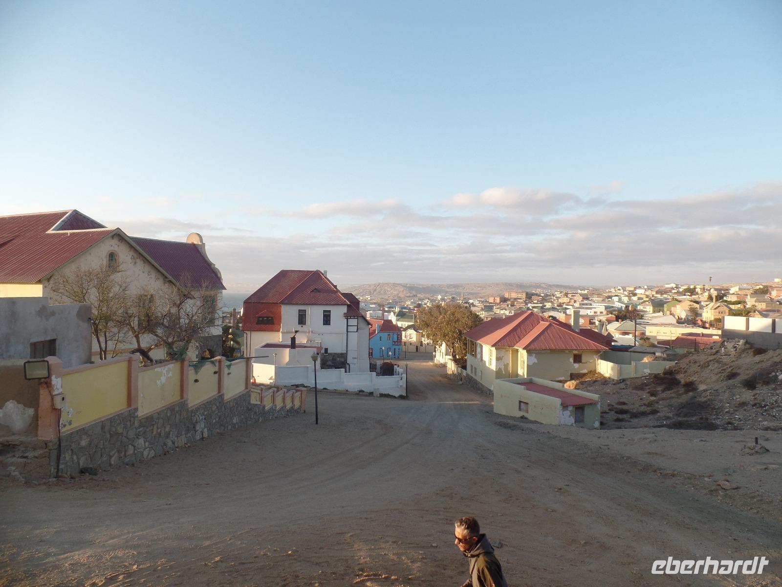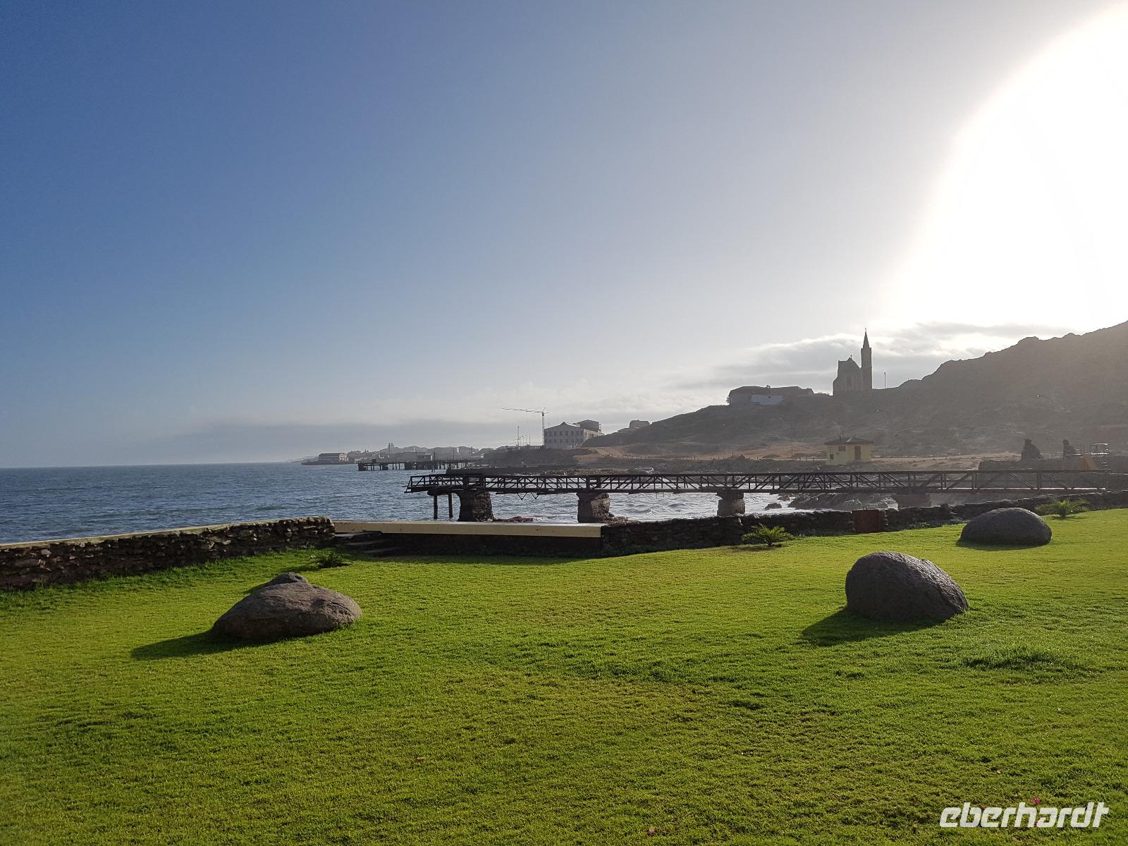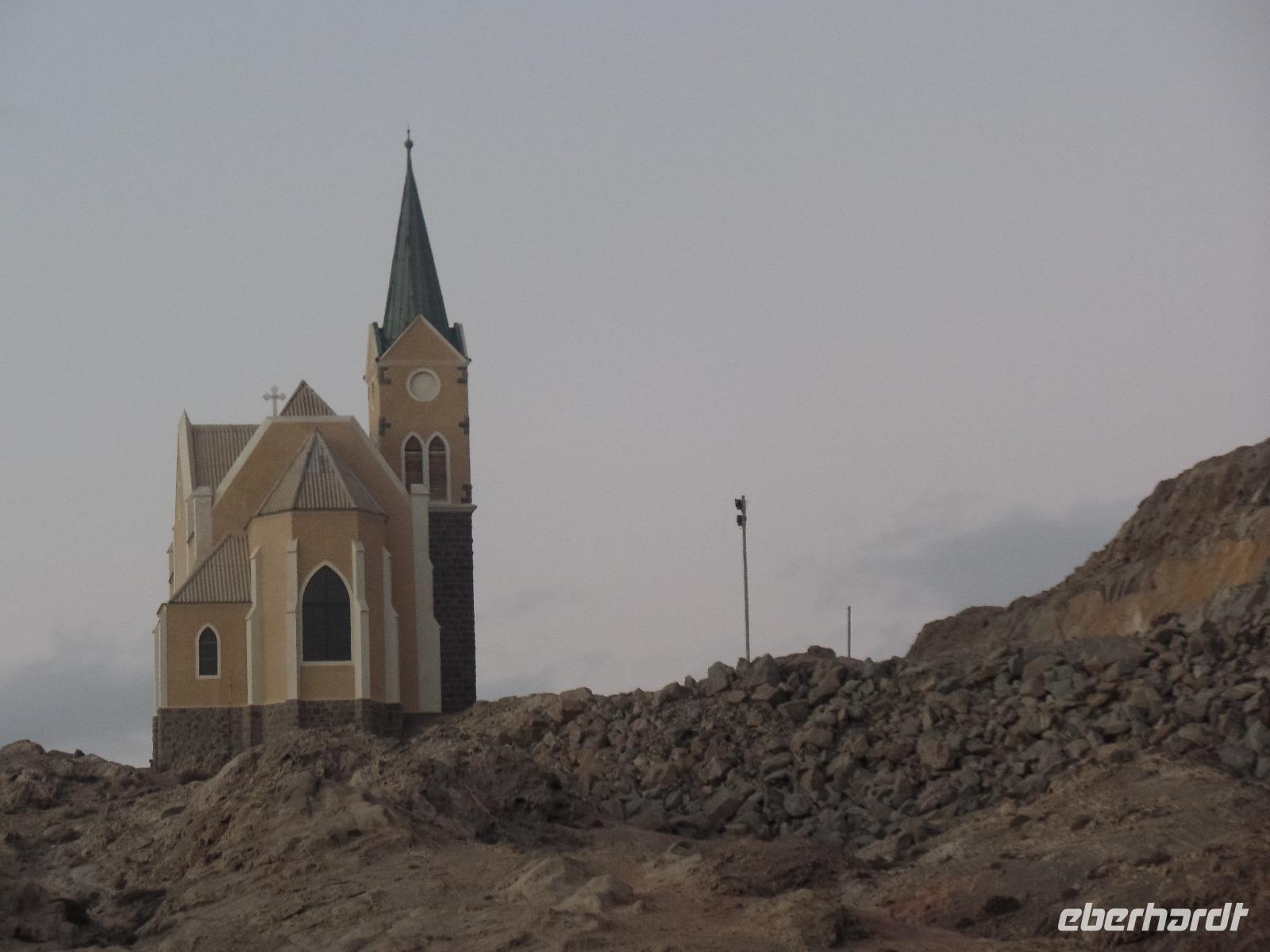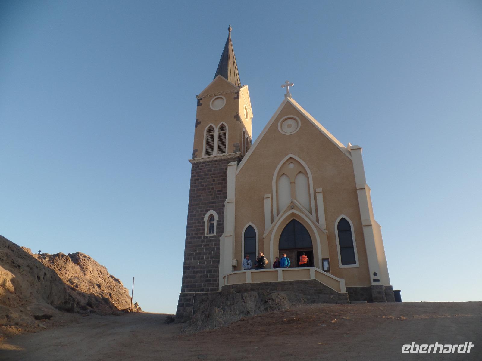 Nach einer kleinen Rundfahrt durch das übersichtliche, farbenfrohe Lüderitz besichtigten wir die Felsenkirche, die als eines der Wahrzeichen der Stadt gilt. Benjamin nutzte die tolle Akustik und sang ein paar Lieder.
