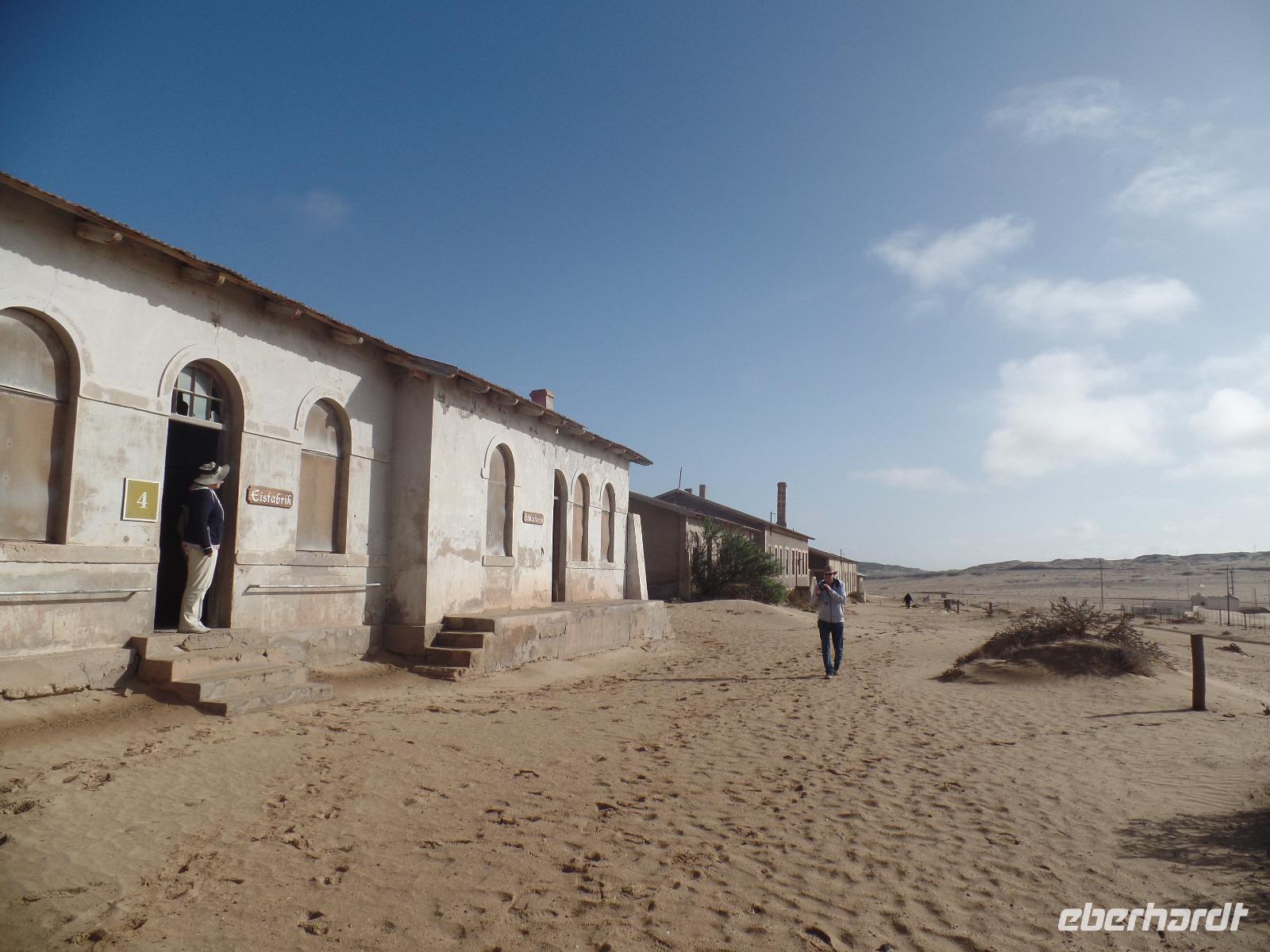 Wir haben heute sehr gut geschlafen, da wir die ganze Nacht das beruhigende Rauschen vom Meer hören konnten. Frühstück gab es mit Blick aufs Meer und oben links war die die Felsenkirche von Lüderitz zu sehen. Am Vormittag ging es erstmal ein kurzes Stück nach Kolmanskop zurück am Rande des Diamentensperrgebietes der Namib. Eine gespenstische Geisterstadt. Hier erlebten wir wieder die deutsche Vergangenheit und das damalige Diamantenfieber. In Kolmanskop hatten wir eine örtliche deutschsprachige Führung. Eine sehr nette alte Dame, die uns alles gut erklärte. Während der Besichtigung sahen wir die schönen Gebäude von innen und da die Türen geschlossen gehalten wurden, waren sie noch gut erhalten. Aber bei denen, wo Türen und Fenster offen waren, mussten wir durch den tiefen Sand dieser Geisterstadt laufen. Verfallene, vom Sand bedeckte Häuser und restaurierte Gebäude erinnerten an die deutsche Vergangenheit und das ehemalige Diamantenfieber. Wir fuhren weiter durch verschiedene Wüstenlandschaften und machten eine Mittagpause bei Helmeringhausen wo wir den besten warmen Apfelkuchen der Welt hatten??