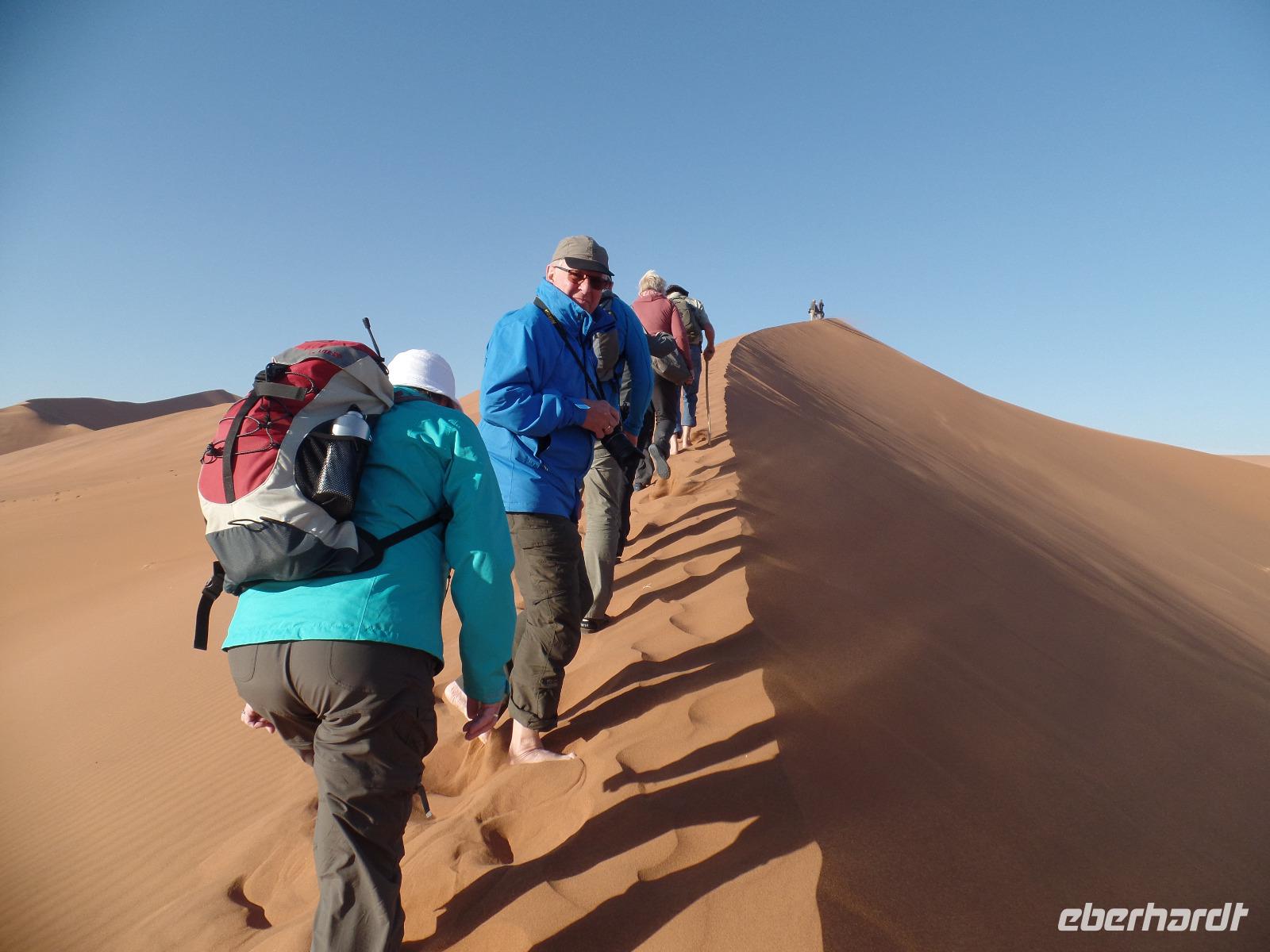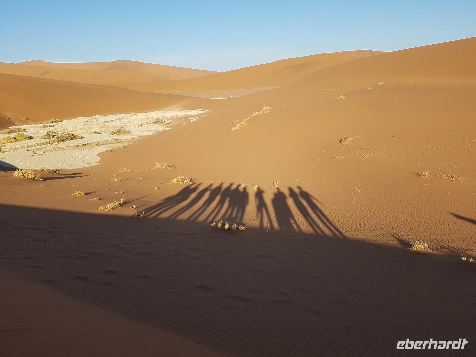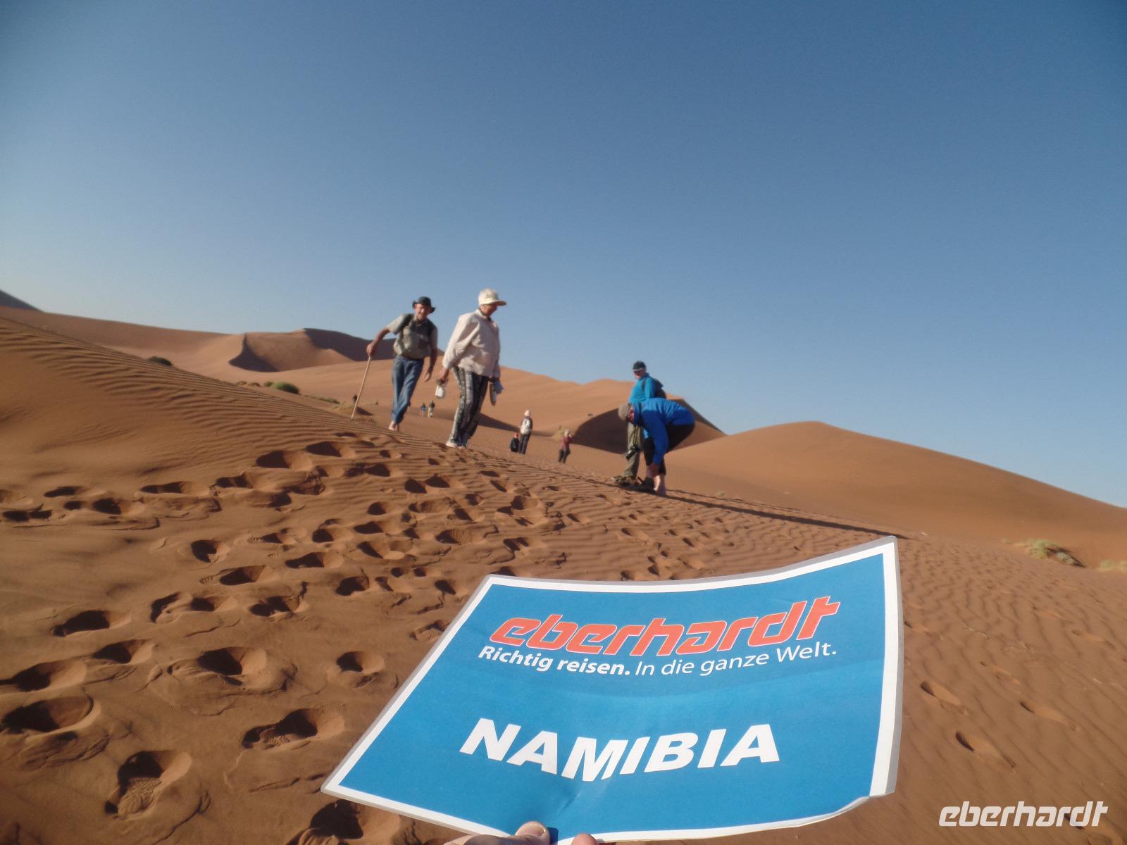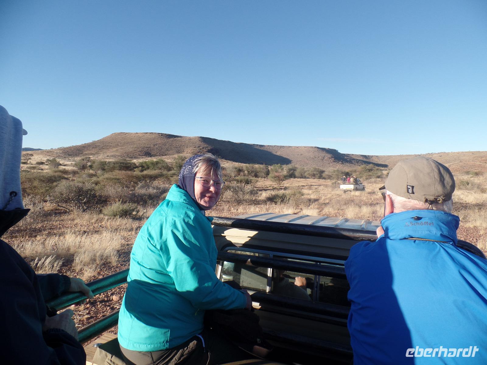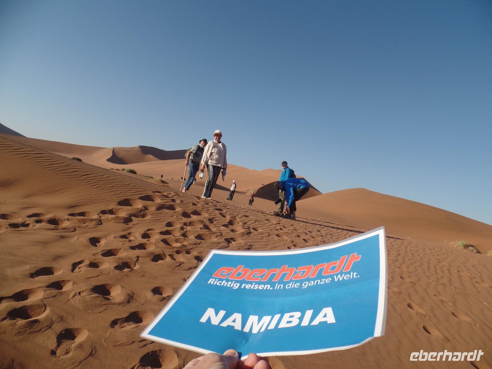 Im Morgengrauen starten wir zum Ausflug in die unendlich scheinende Namib, ein Höhepunkt unserer Reise. Im frühen Morgenlicht erstrahlen die hohen Dünen (bis ca. 400 Meter hoch) im satten Rot ein toller Kontrast zum tiefblauen Himmel. Das wechselnde Farbenspiel ist besonders faszinierend. Deshalb wollten wir noch im Dunkel fahren, damit wir mit den ersten Sonnenstrahlen des Tages vor Ort sind. Im National Park angekommen steigen wir in Geländewagen um. Die Sossusvlei (Lehmsenke) wird von mächtigen, roten Sanddünen umschlossen, die zu den größten der Welt gehören. Hier machten wir alle eine kleine Wanderung hoch auf die Dünen und zum Dead Vlei. Unvergesslich!! Von oben nach unten könnte man laufen, oder wie Irmgard und Waltraud es machten, einfach auf dem Popo rutschen lassen. Herrlich. Unten in der Lehmsenke machten wir ein Gruppenfoto mit tollen Farben. Danach fuhren wir zum Sesriem Canyon, der an einigen Stellen 30 Meter tief und manchmal nur zwei Meter breit ist. Da der Tsauchab-Fluss gerade kein Wasser führte, konnten wir hinab steigen und dort unten eine kleine Wanderung im Canyon unternehmen. Wir hatten langsam Hunger und inmitten dieser faszinierenden Dünenlandschaft organsierten wir wieder ein tolles Picknick. Zurück im Hotel gingen einige mit Benjamin der Sonne entgegen, um wieder einen afrikanischen Sonnenuntergang zu genießen, bevor wir den Abend bei einem typisch namibischen Braai, welchen wir alle gemeinsam zubereiteten, verbrachten.