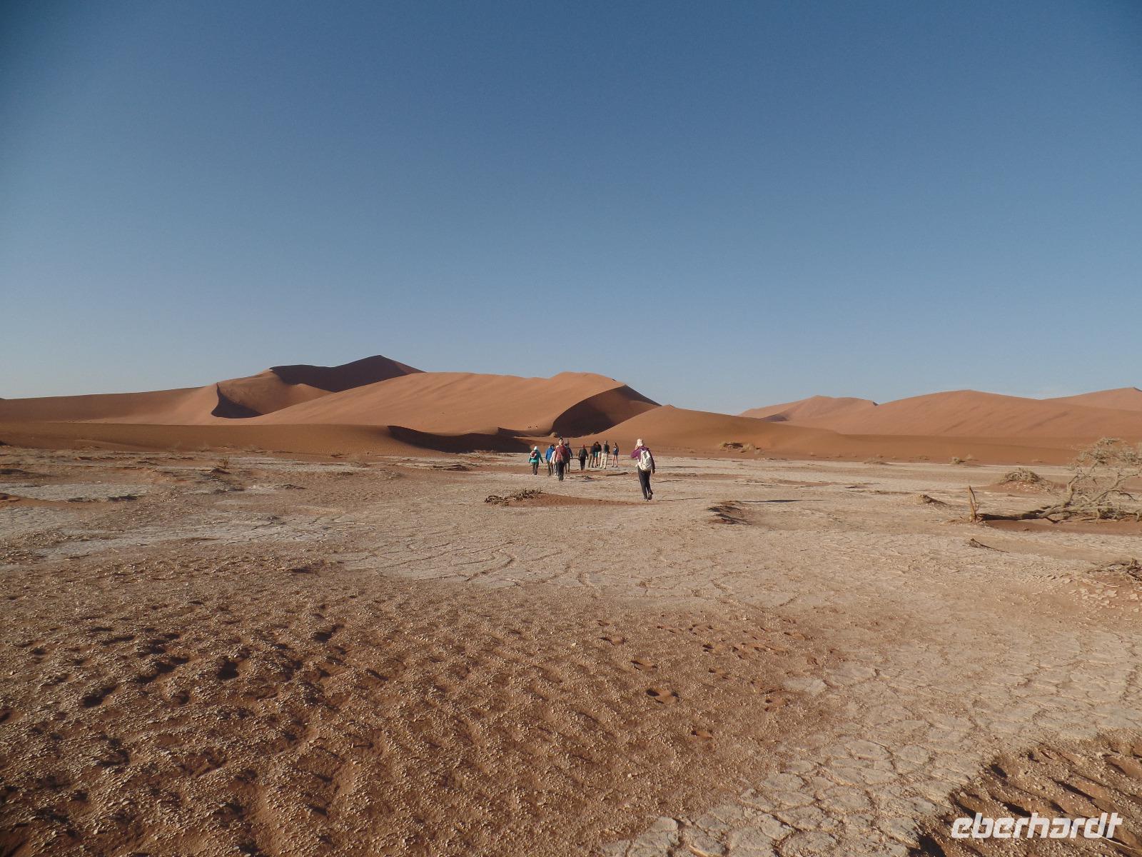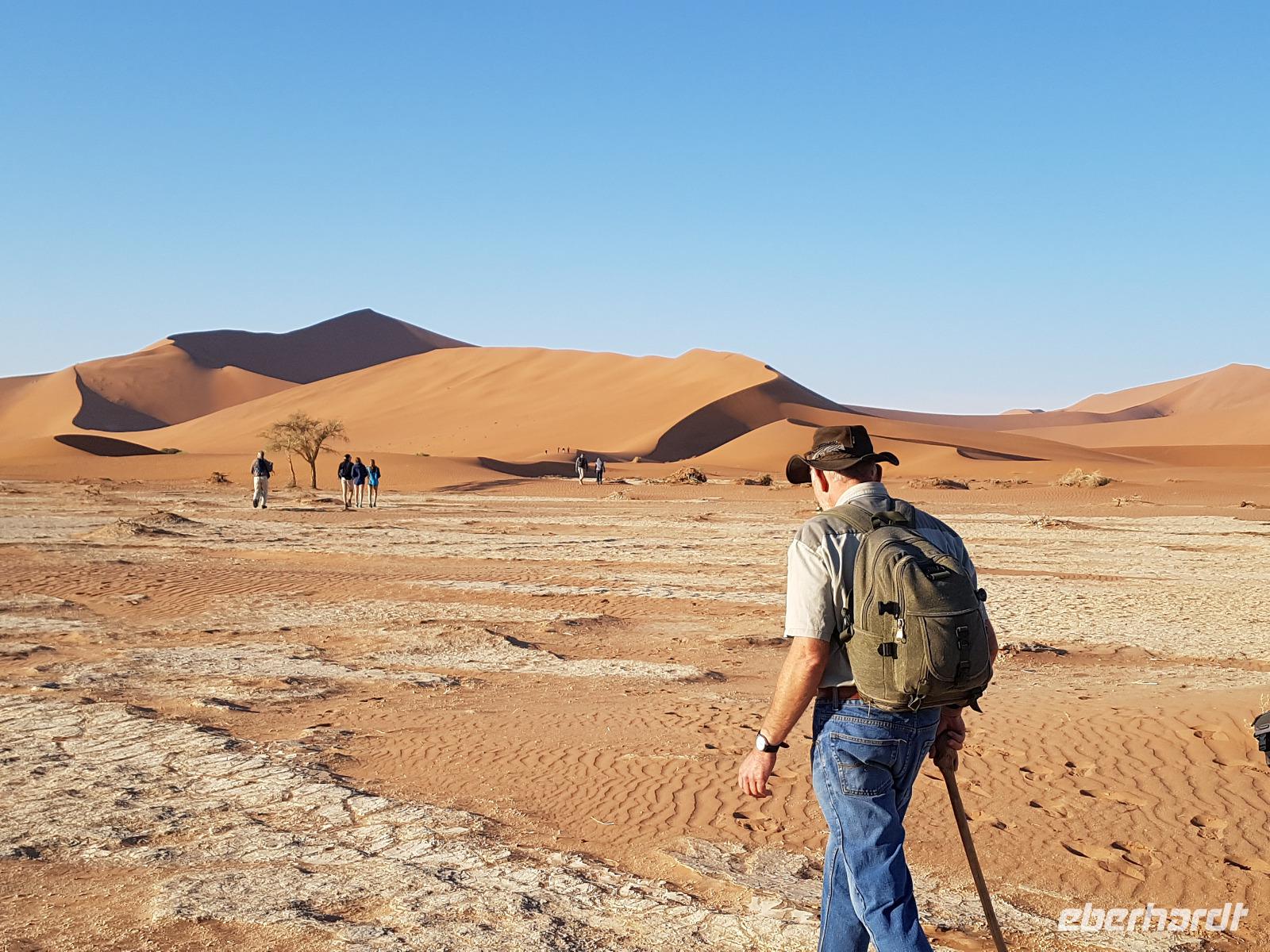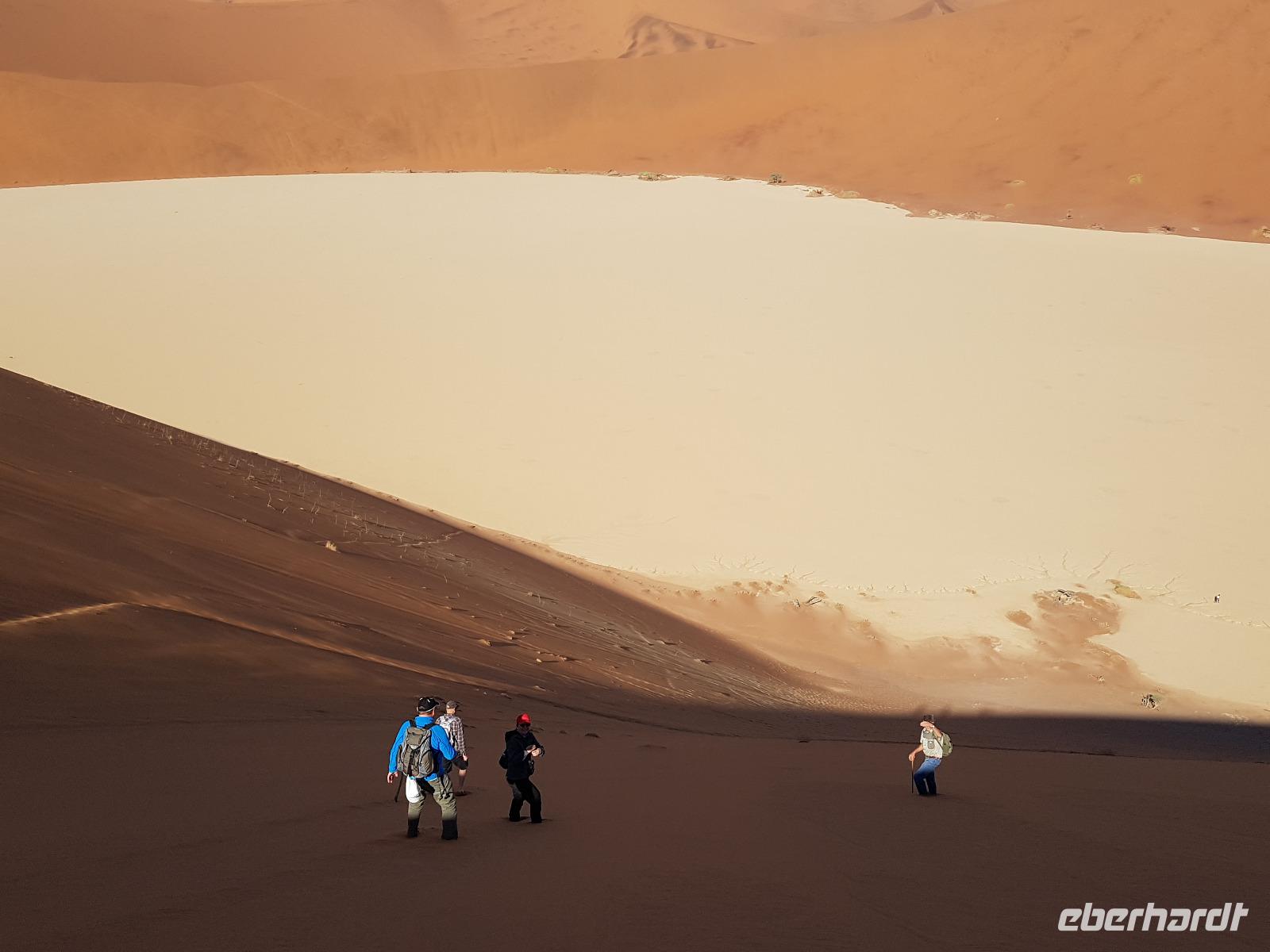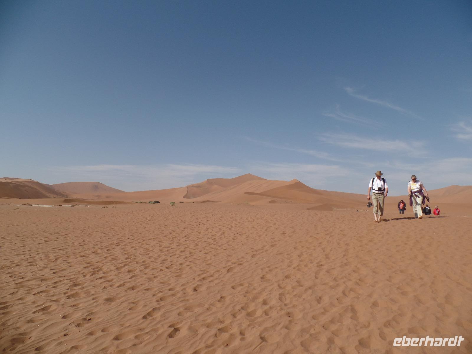 Im Morgengrauen starten wir zum Ausflug in die unendlich scheinende Namib, ein Höhepunkt unserer Reise. Im frühen Morgenlicht erstrahlen die hohen Dünen (bis ca. 400 Meter hoch) im satten Rot ein toller Kontrast zum tiefblauen Himmel. Das wechselnde Farbenspiel ist besonders faszinierend. Deshalb wollten wir noch im Dunkel fahren, damit wir mit den ersten Sonnenstrahlen des Tages vor Ort sind. Im National Park angekommen steigen wir in Geländewagen um. Die Sossusvlei (Lehmsenke) wird von mächtigen, roten Sanddünen umschlossen, die zu den größten der Welt gehören. Hier machten wir alle eine kleine Wanderung hoch auf die Dünen und zum Dead Vlei. Unvergesslich!! Von oben nach unten könnte man laufen, oder wie Irmgard und Waltraud es machten, einfach auf dem Popo rutschen lassen. Herrlich. Unten in der Lehmsenke machten wir ein Gruppenfoto mit tollen Farben. Danach fuhren wir zum Sesriem Canyon, der an einigen Stellen 30 Meter tief und manchmal nur zwei Meter breit ist. Da der Tsauchab-Fluss gerade kein Wasser führte, konnten wir hinab steigen und dort unten eine kleine Wanderung im Canyon unternehmen. Wir hatten langsam Hunger und inmitten dieser faszinierenden Dünenlandschaft organsierten wir wieder ein tolles Picknick. Zurück im Hotel gingen einige mit Benjamin der Sonne entgegen, um wieder einen afrikanischen Sonnenuntergang zu genießen, bevor wir den Abend bei einem typisch namibischen Braai, welchen wir alle gemeinsam zubereiteten, verbrachten.
