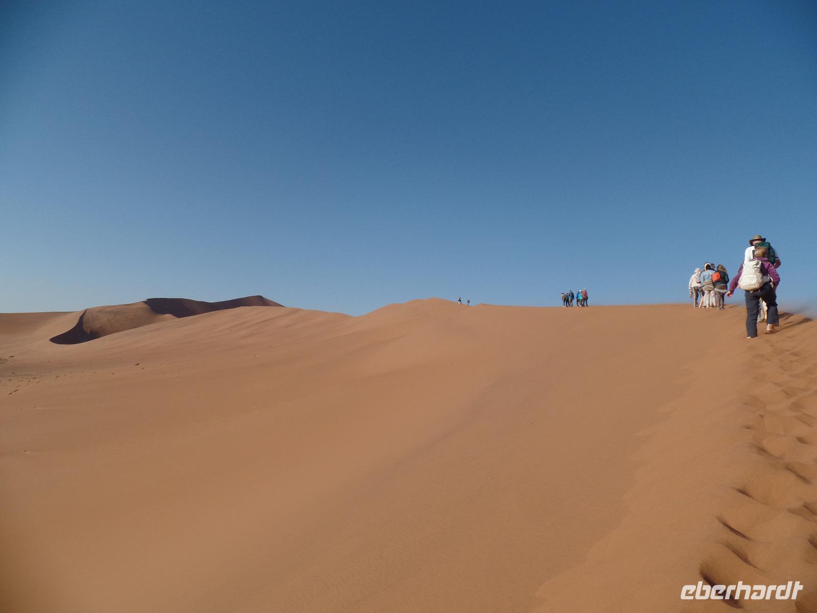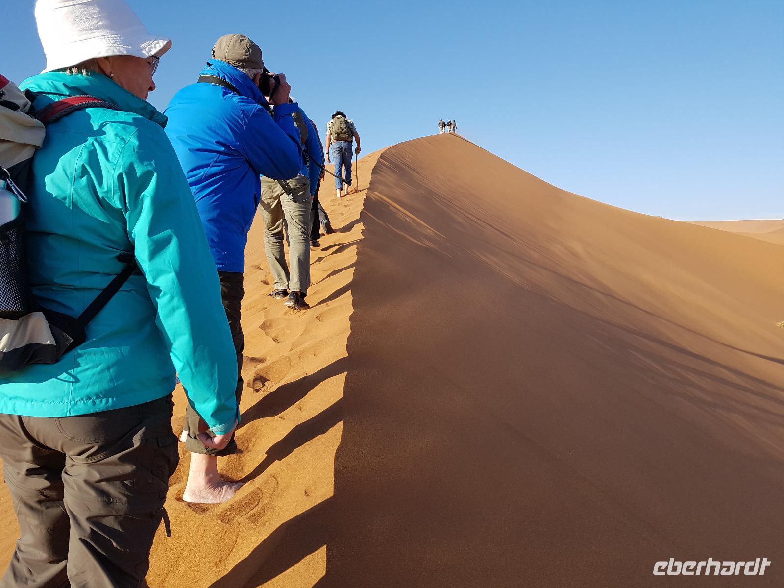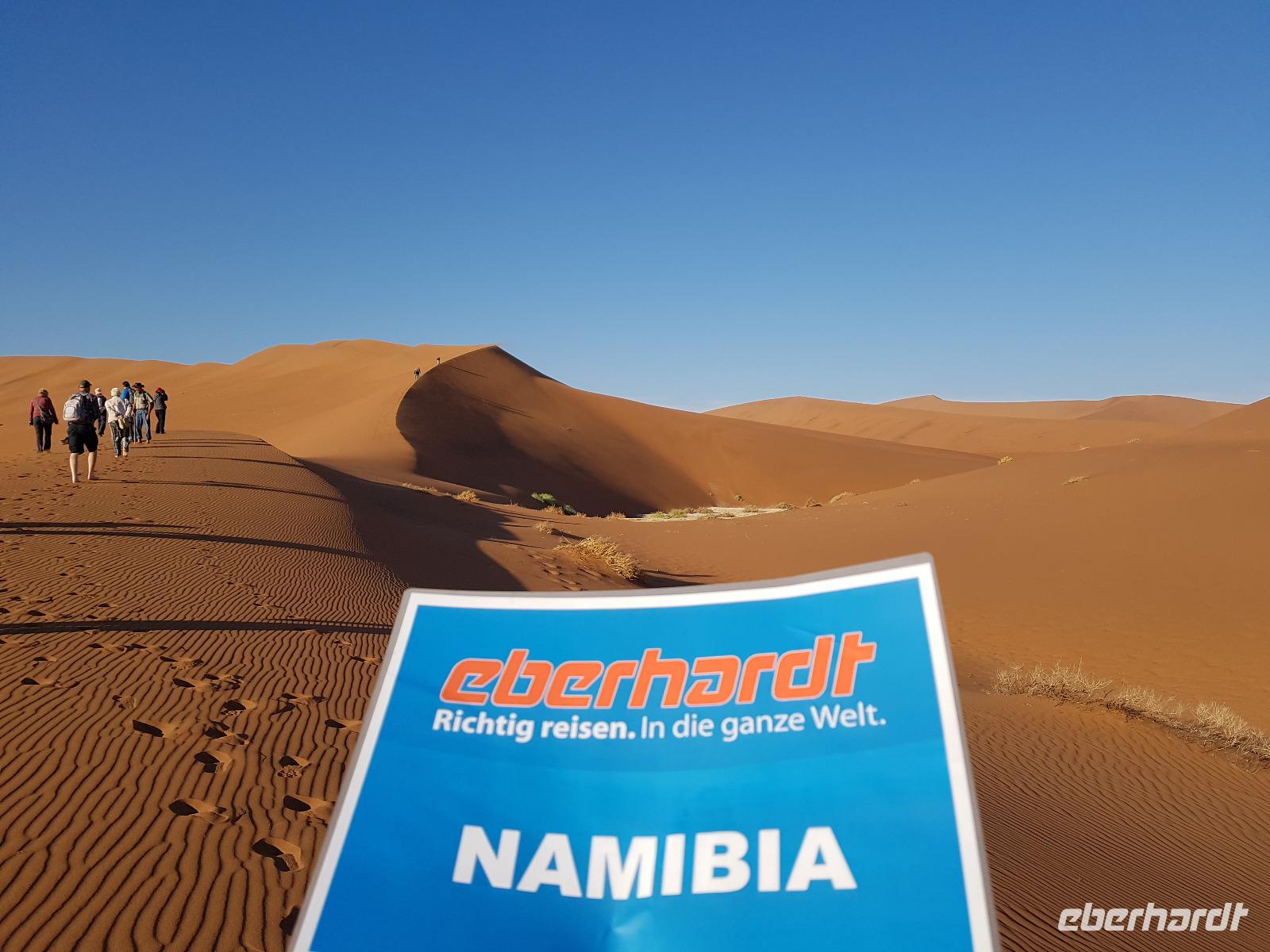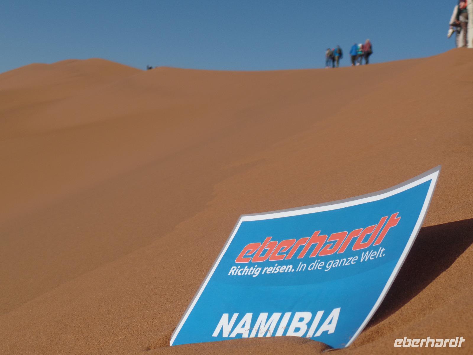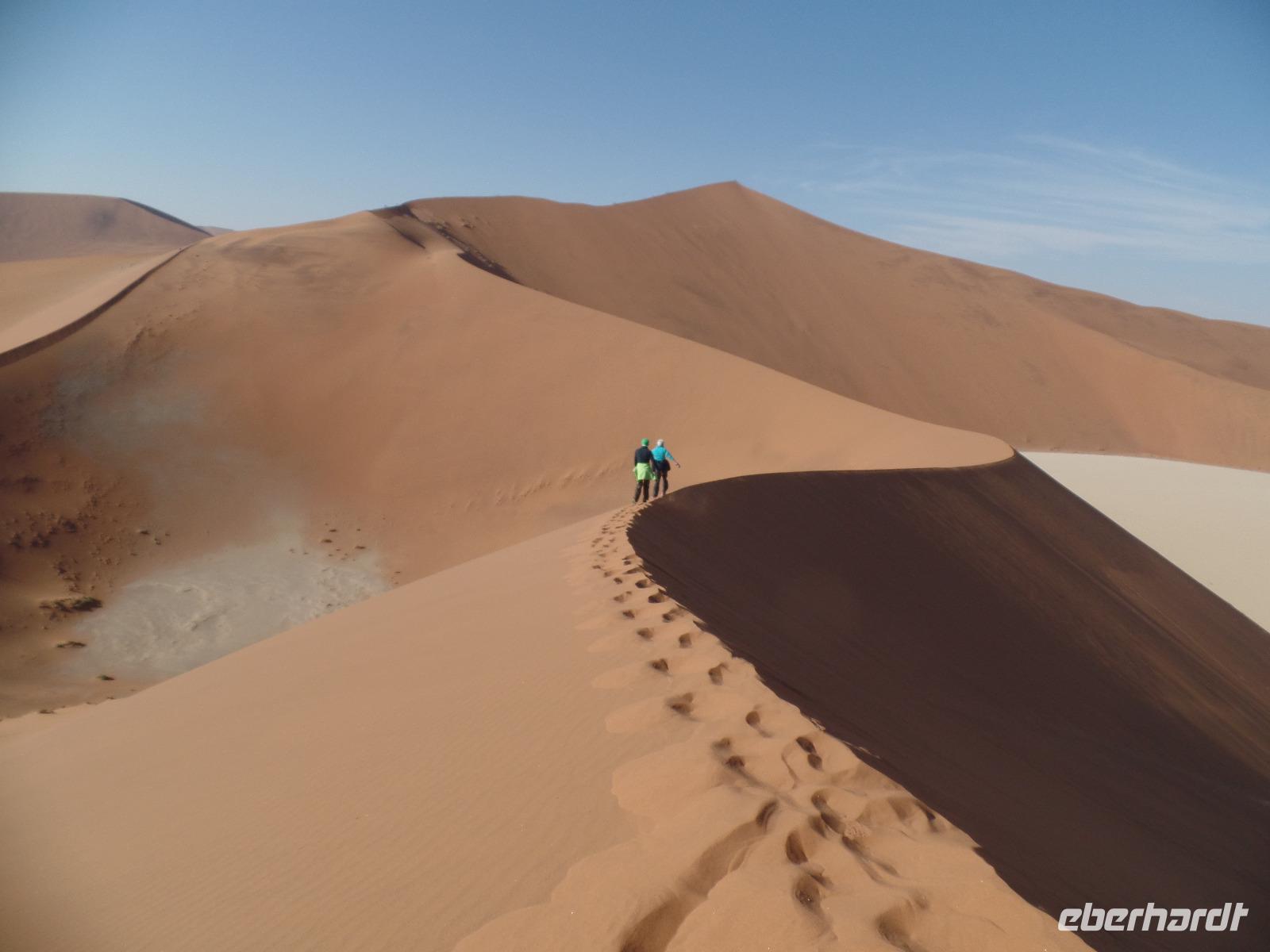 Im Morgengrauen starten wir zum Ausflug in die unendlich scheinende Namib, ein Höhepunkt unserer Reise. Im frühen Morgenlicht erstrahlen die hohen Dünen (bis ca. 400 Meter hoch) im satten Rot ein toller Kontrast zum tiefblauen Himmel. Das wechselnde Farbenspiel ist besonders faszinierend. Deshalb wollten wir noch im Dunkel fahren, damit wir mit den ersten Sonnenstrahlen des Tages vor Ort sind. Im National Park angekommen steigen wir in Geländewagen um. Die Sossusvlei (Lehmsenke) wird von mächtigen, roten Sanddünen umschlossen, die zu den größten der Welt gehören. Hier machten wir alle eine kleine Wanderung hoch auf die Dünen und zum Dead Vlei. Unvergesslich!! Von oben nach unten könnte man laufen, oder wie Irmgard und Waltraud es machten, einfach auf dem Popo rutschen lassen. Herrlich. Unten in der Lehmsenke machten wir ein Gruppenfoto mit tollen Farben. Danach fuhren wir zum Sesriem Canyon, der an einigen Stellen 30 Meter tief und manchmal nur zwei Meter breit ist. Da der Tsauchab-Fluss gerade kein Wasser führte, konnten wir hinab steigen und dort unten eine kleine Wanderung im Canyon unternehmen. Wir hatten langsam Hunger und inmitten dieser faszinierenden Dünenlandschaft organsierten wir wieder ein tolles Picknick. Zurück im Hotel gingen einige mit Benjamin der Sonne entgegen, um wieder einen afrikanischen Sonnenuntergang zu genießen, bevor wir den Abend bei einem typisch namibischen Braai, welchen wir alle gemeinsam zubereiteten, verbrachten.