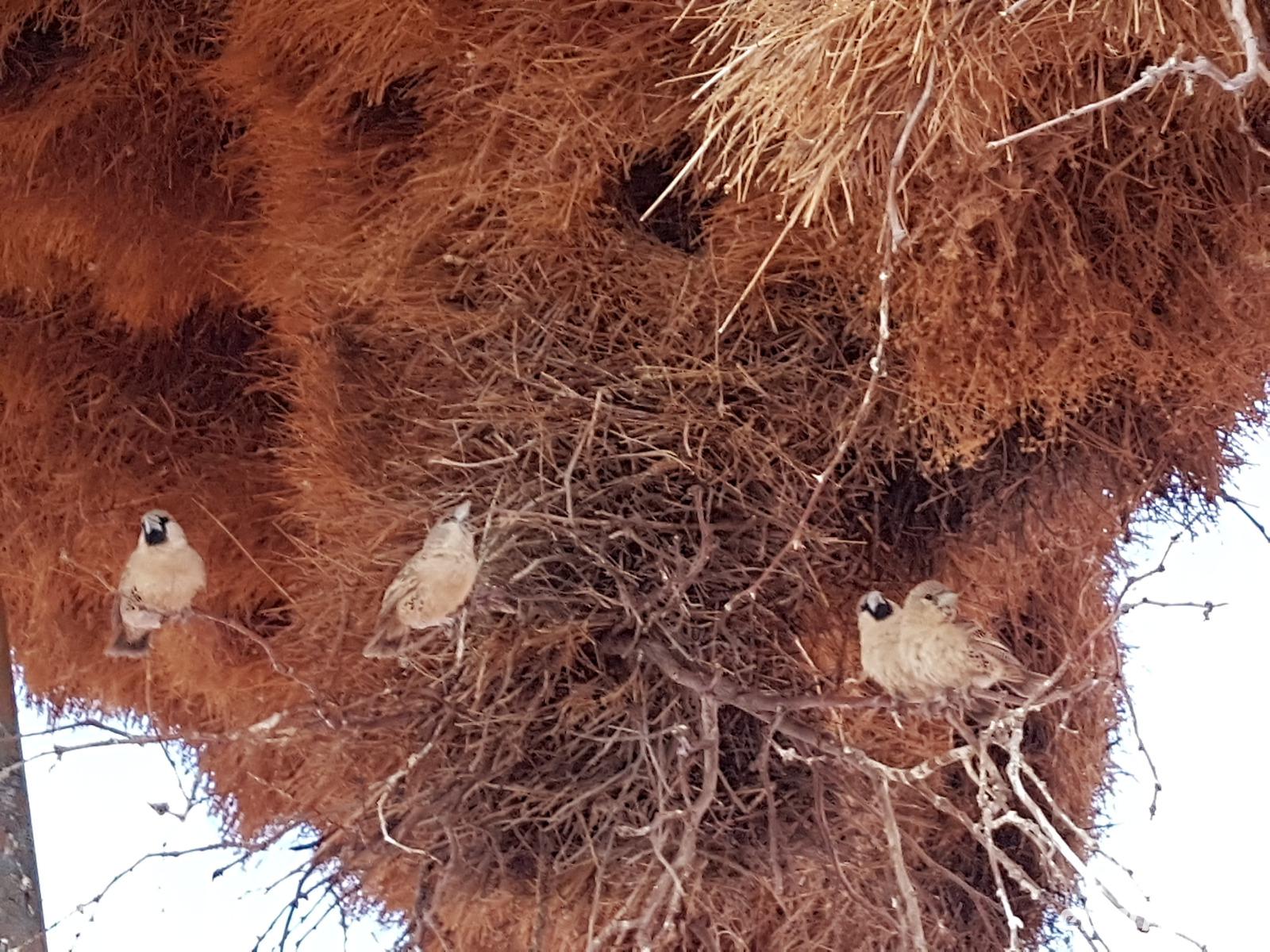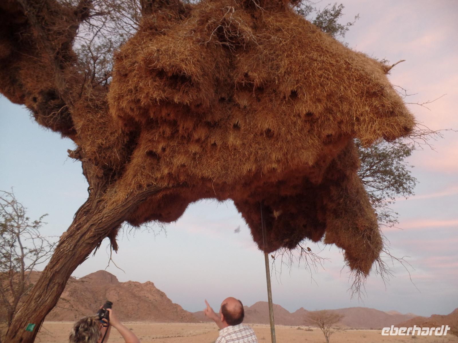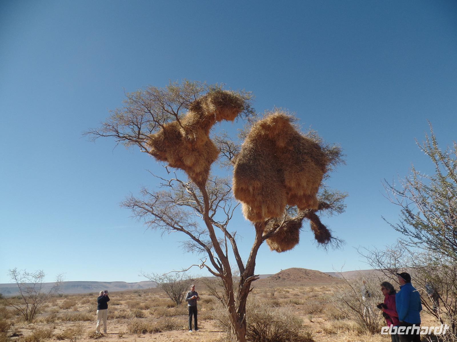 Draußen erwarteten uns schon unser örtlicher Reiseleiter Ernst Ritter und unser Busfahrer Theo, mit dem wir auch deutsch sprechen konnten. Wir wurden ganz herzlich von ihnen in Namibia begrüßt, fuhren zum Supermarket um uns etwas zum Mittagessen zu holen, da wir noch heute eine lange Strecke von ca. 300 km vor uns hatten. Vorbei am Heldenacker und der Basterstadt Rehoboth reisten wir in die rote Dünenlandschaft der Kalahari zu unserer ersten Lodge bei Mariental. Unterwegs bestaunten wir die Riesennester der Webervögel, einsame Viehstationen mit traditionellen Wasserpumpen oder "Kalahari Ferraris", die durch die Wüste rasten. Hard like welcome in Namibia! Die Auas Berge ließen wir links liegen und nahmen die ersten 300 km in Angriff. In der "Basterstadt" Rehoboth legten wir eine Toi- und Tankpause ein. Als Baster wurden damals die unehelichen Kinder zwischen den Holländern und den Khoisan bezeichnet.