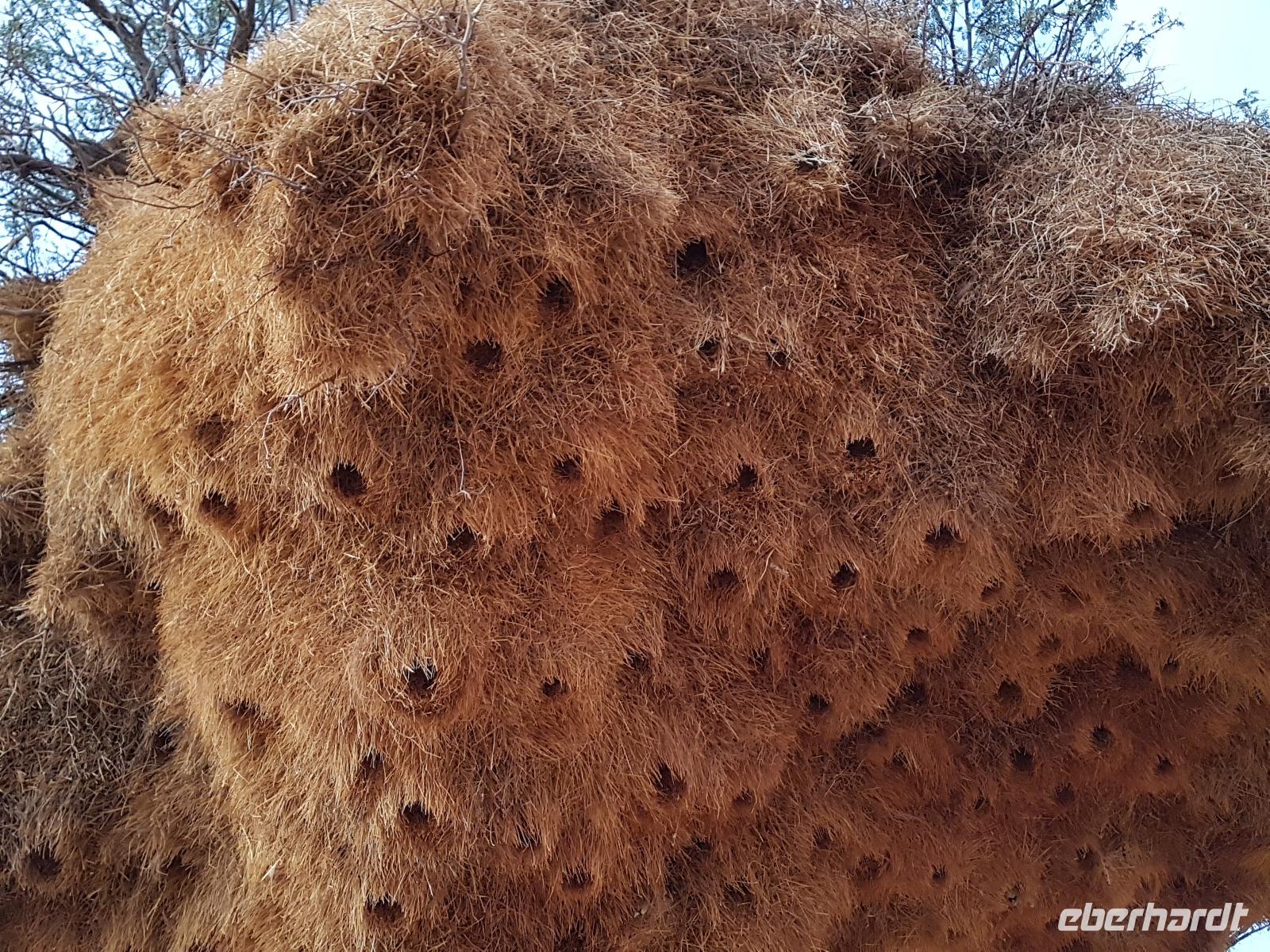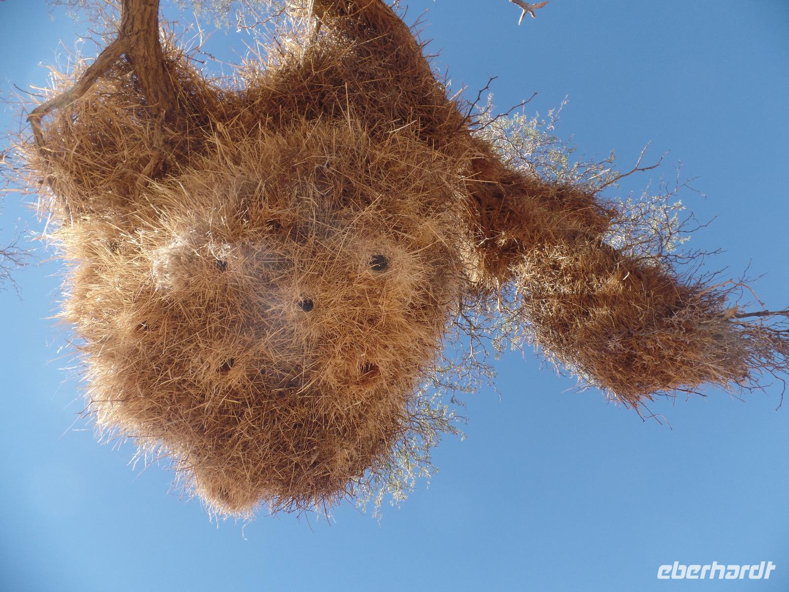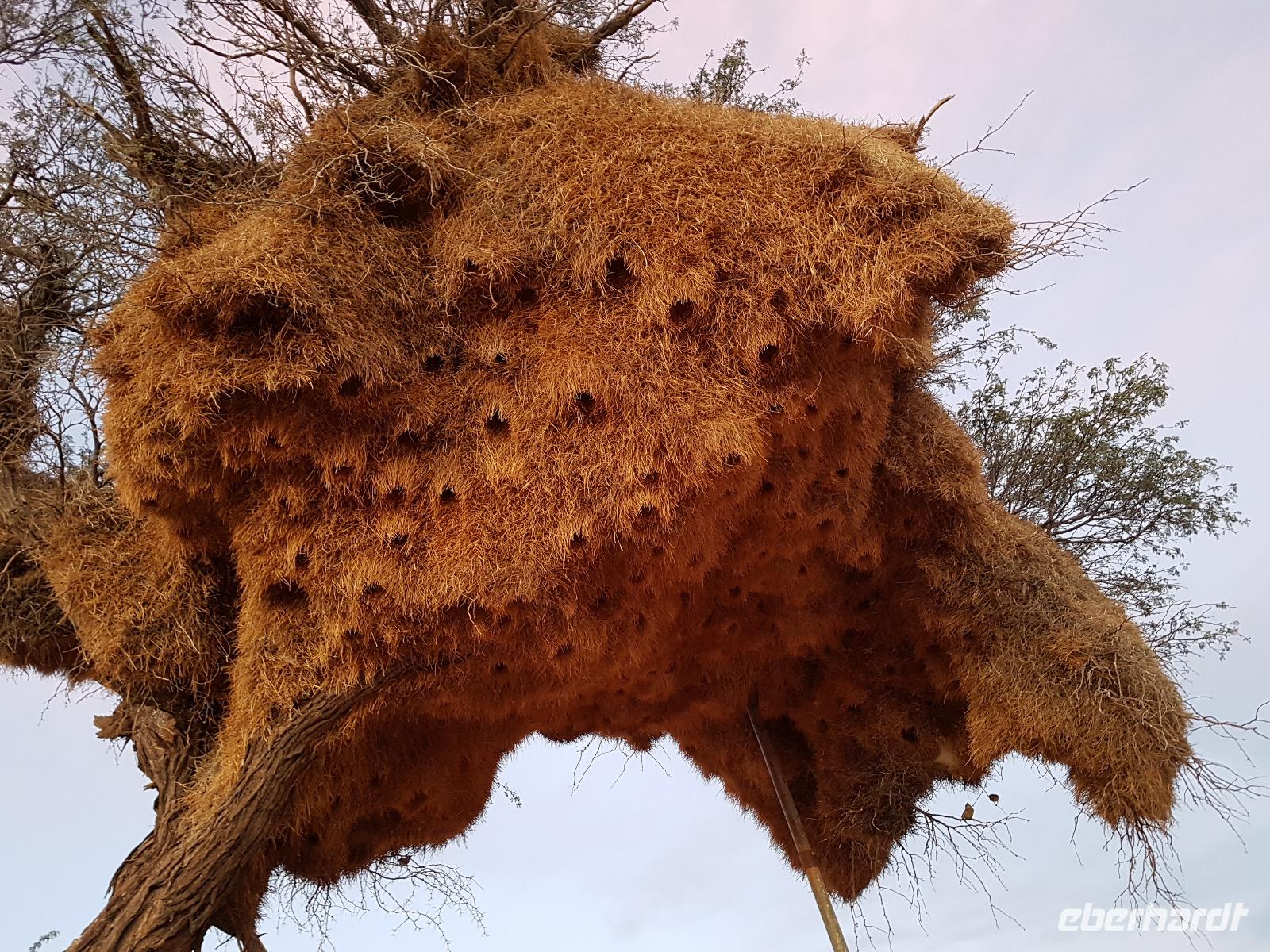 Draußen erwarteten uns schon unser örtlicher Reiseleiter Ernst Ritter und unser Busfahrer Theo, mit dem wir auch deutsch sprechen konnten. Wir wurden ganz herzlich von ihnen in Namibia begrüßt, fuhren zum Supermarket um uns etwas zum Mittagessen zu holen, da wir noch heute eine lange Strecke von ca. 300 km vor uns hatten. Vorbei am Heldenacker und der Basterstadt Rehoboth reisten wir in die rote Dünenlandschaft der Kalahari zu unserer ersten Lodge bei Mariental. Unterwegs bestaunten wir die Riesennester der Webervögel, einsame Viehstationen mit traditionellen Wasserpumpen oder "Kalahari Ferraris", die durch die Wüste rasten. Hard like welcome in Namibia! Die Auas Berge ließen wir links liegen und nahmen die ersten 300 km in Angriff. In der "Basterstadt" Rehoboth legten wir eine Toi- und Tankpause ein. Als Baster wurden damals die unehelichen Kinder zwischen den Holländern und den Khoisan bezeichnet.