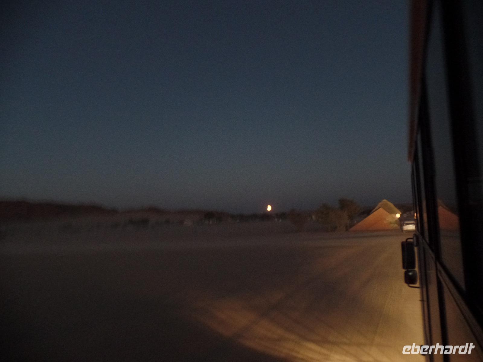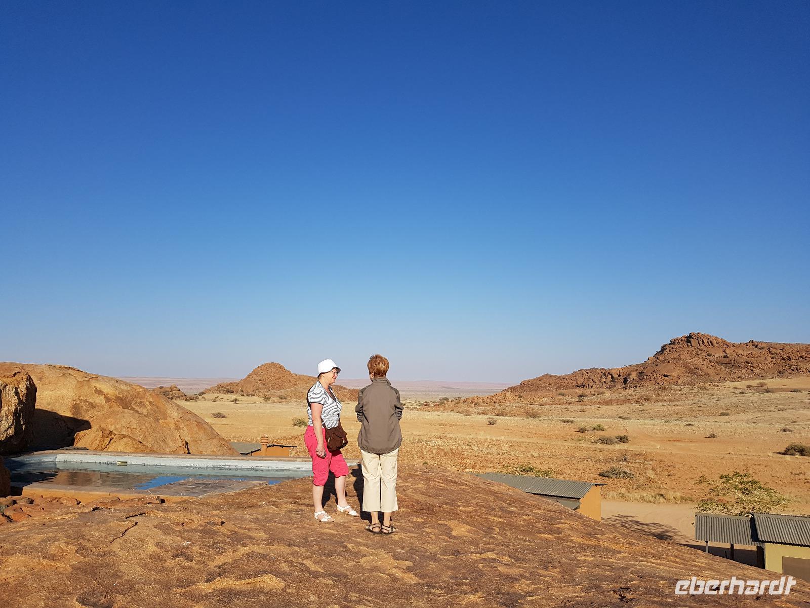 Wir trafen uns heute um 7.30 Uhr auf der Veranda, wo wir erstmal nur einen Kaffee bekamen und machten gemeinsam noch einen kleinen Spaziergang rund um das Farmerhaus. Jörg zeigte uns stolz den grünen Gemüsegarten, wo sogar Spargel wächst und seine Solarwerkstatt. Nach einem guten Frühstück mit der Familie hieß es Abschied nehmen und weiterfahren. Um uns von den Kindern zu verabschieden sangen wir „Mein kleiner grüner Kaktus" gemeinsam. Im verträumten Ort Maltahöhe halten wir an, um im kleinen Krämerladen einen frischen Kaffee zu trinken und in nostalgischen Erinnerungen zu schwelgen. Anschließend ging heute unsere Reise Richtung Namib Naukluft Park weiter, der 1979 als Schutzzone für die gefährdeten Bergzebras proklamiert wurde. Der Park umfasst 50.000 Quadratkilometer und ist somit der größte Afrikas. Wir übernachten heute am Rande der Namib im Adventure Camp. Uwe konnte den Pool genießen bevor die Sonne unterging. Das Abendessen bereiteten wir gemeinsam mit unserem Reiseleiter Ernst zu. Es wurde gegrillt. Als Vorspeise kochte Ernst für uns eine leckere Kürbissuppe und heute und morgen halfen alle gerne beim Kochen mit?? Wieder eine Nacht voller Sterne. Es sah so aus, als würden wir heute auf dem Planet Mars schlafen. Tolle, irre Landschaft hier.