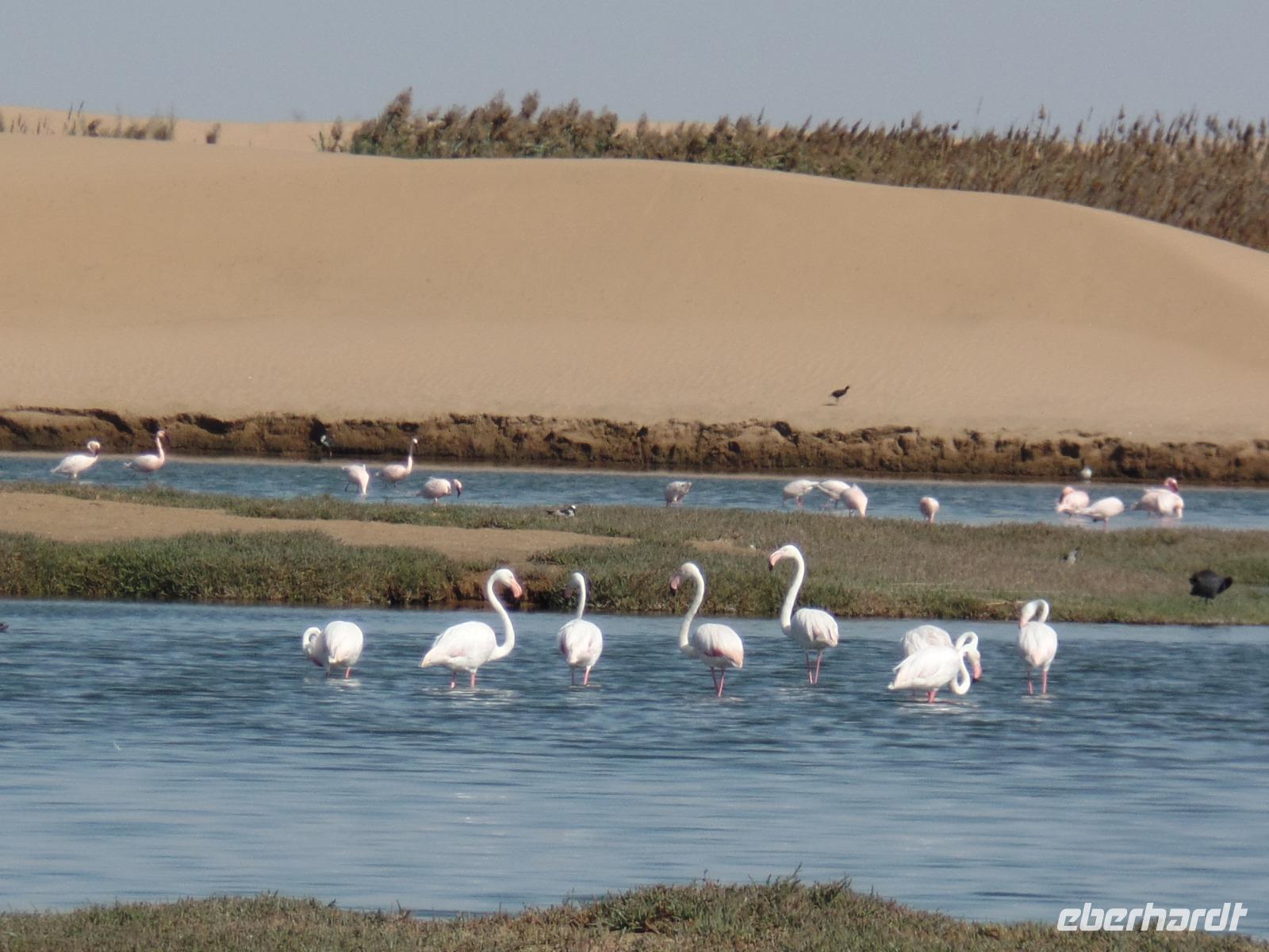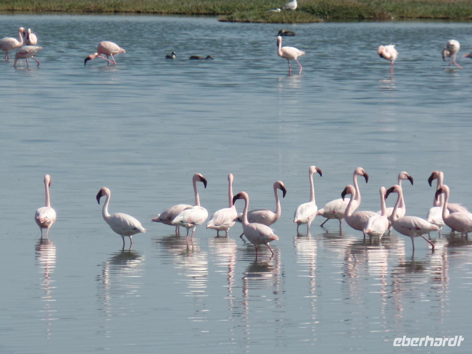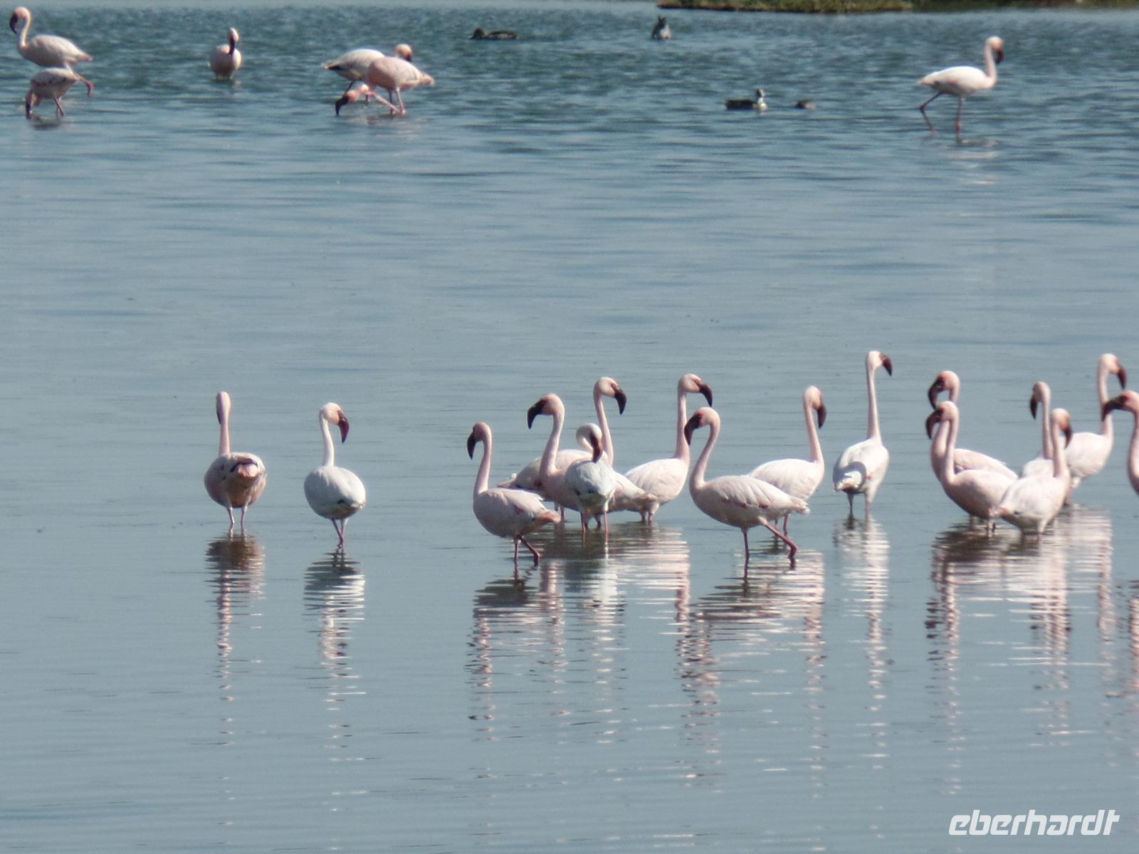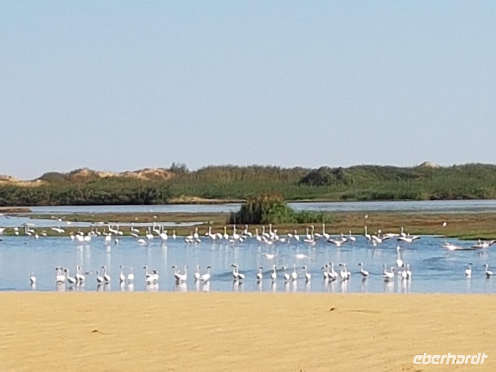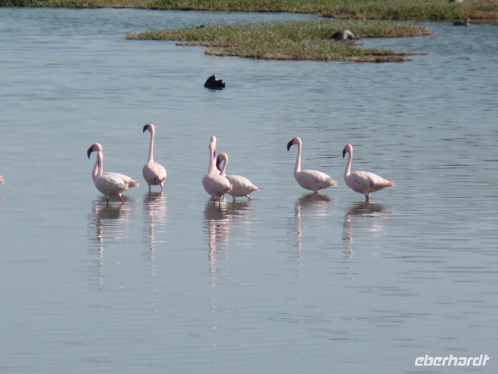 Heute hatten wir eigentlich freie Zeit aber wir alle wollten an dem fakultativen Ausflug Katamaranfahrt durch die Lagune von Walvis Bay teilnehmen. Imbiss und Getränken waren inklusive. Diese Bootsfahrt war echt ein besonderes Erlebnis: zutrauliche Ohrenrobben kamen als blinde Passagiere an Bord, Pelikane, Kormorane und riesige Möwen begleiteten uns. Eine Robbe kam an Bord für längere Zeit und man konnte sie umarmen und sich mit ihr fotografieren. Unvergesslich!! Zwischendurch wurden wir mit kleinen Leckereien und Sekt bewirtet. Natürlich probierten wir auch frische Austern, die in der Lagune gezüchtet werden. Einige hatten sie niemals vorher verkostet, heute zum erstes Mal. Und... hat es geschmeckt? Ja, oder? Bevor wir zurück nach Swakopmund fuhren, hielten wir bei eine Lagune, weil wir dort gestern aus der Ferne Flamingos sahen. Wir spazierten ganz still durch die Dünen, um die Flamingos nicht zu stören und konnten ganz nah Fotos machen. der Der weitere Nachmittag steht uns zur freien Verfügung um das charmante Swakopmund weiter zu entdecken oder eine Strandwanderung zu unternehmen. Uwe und Benja gingen wieder am Strand baden und sie waren die einzigen weißen Männer am Strand?? Toll. Das ist Afrika. Später trafen sich einige wieder an der Seebrücke, um einen unvergesslichen Sonnenuntergang zu bestaunen. Der Ozean, das Meer, die Sonne, die Farben. Am Abend hatte Eberhardt Travel für uns Plätze in einem Restaurant reserviert, doch es gab einen totalen Stromausfall in Swakopmund und wir mussten schnell woanders suchen. Ernst bestellte für uns im Europa Hof und uns hat es sehr gut geschmeckt. Dort trafen wir ein spanisches Ehepaar, welches auf Hochzeit war und sangen gemeinsam für sie „Mein kleiner grüner Kaktus!" Wieder??