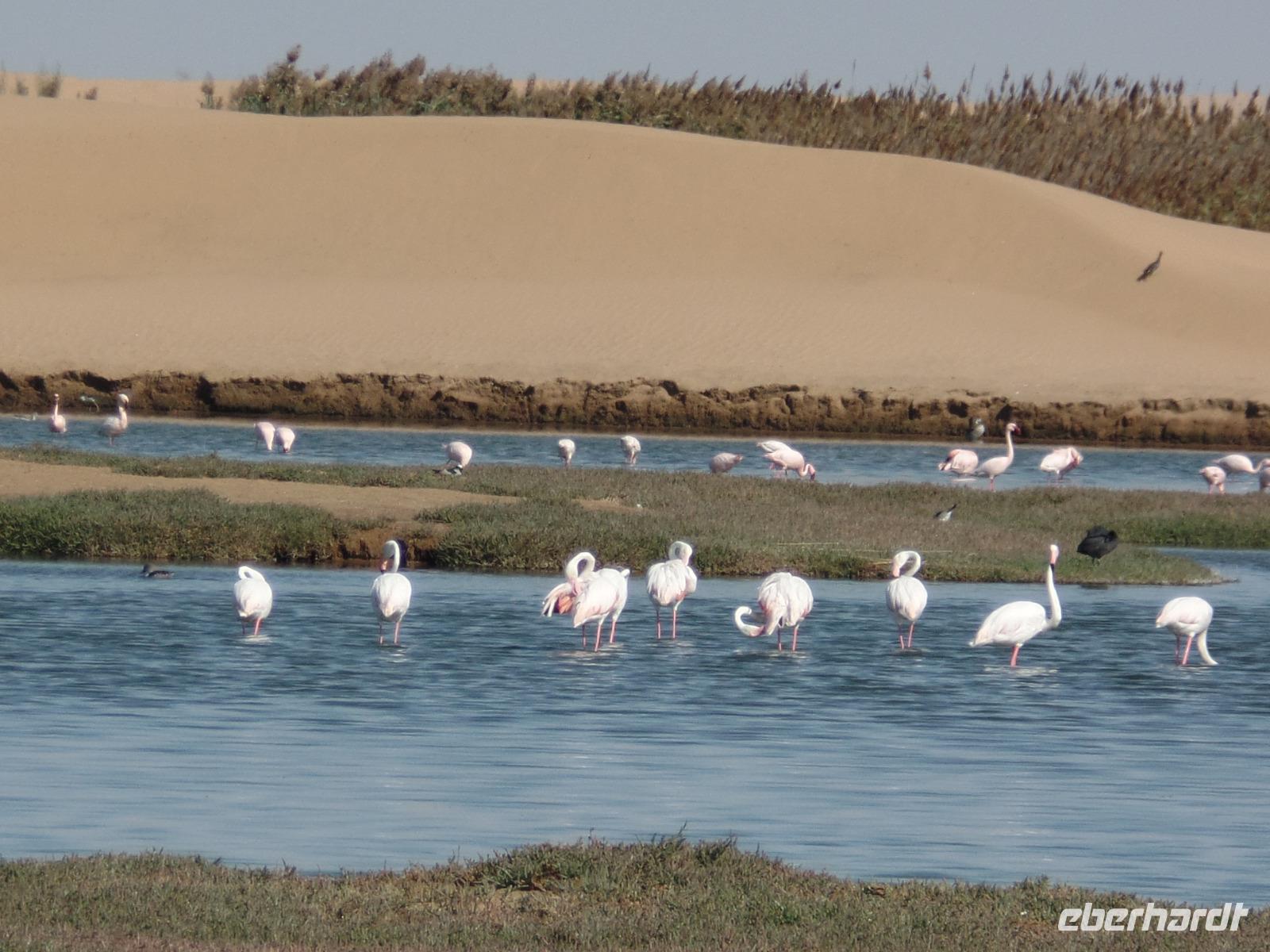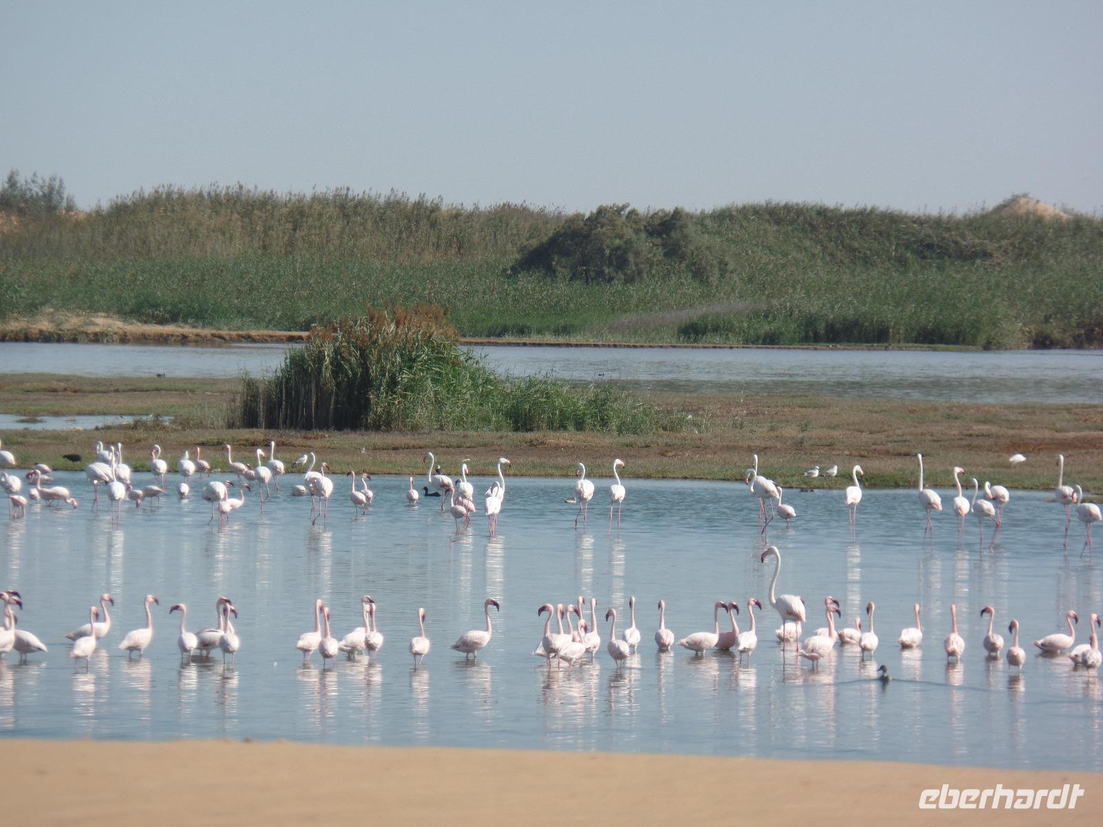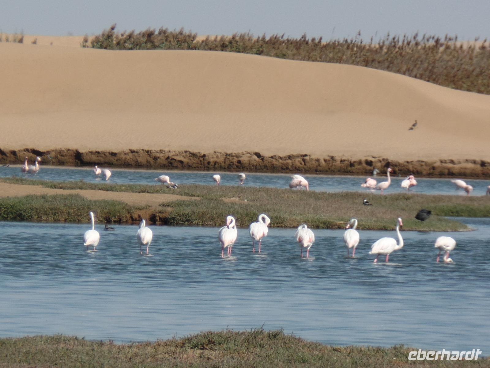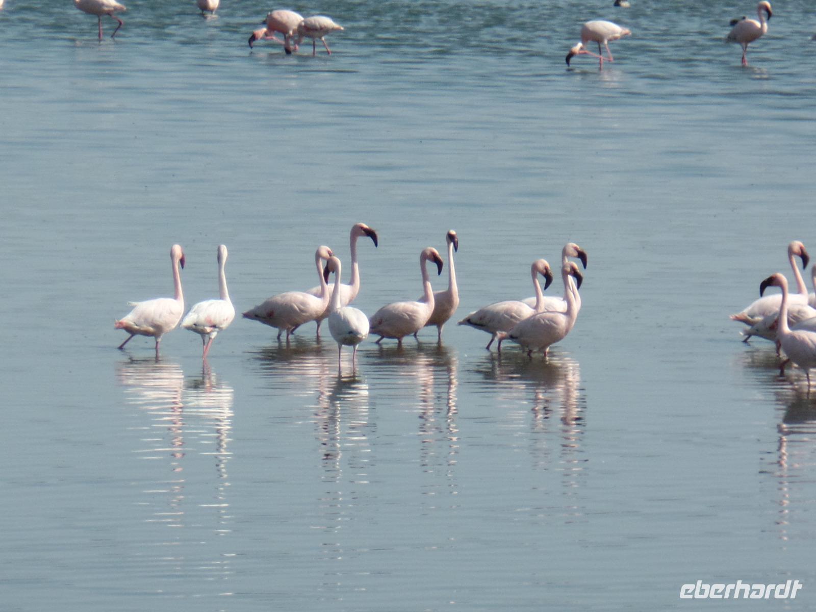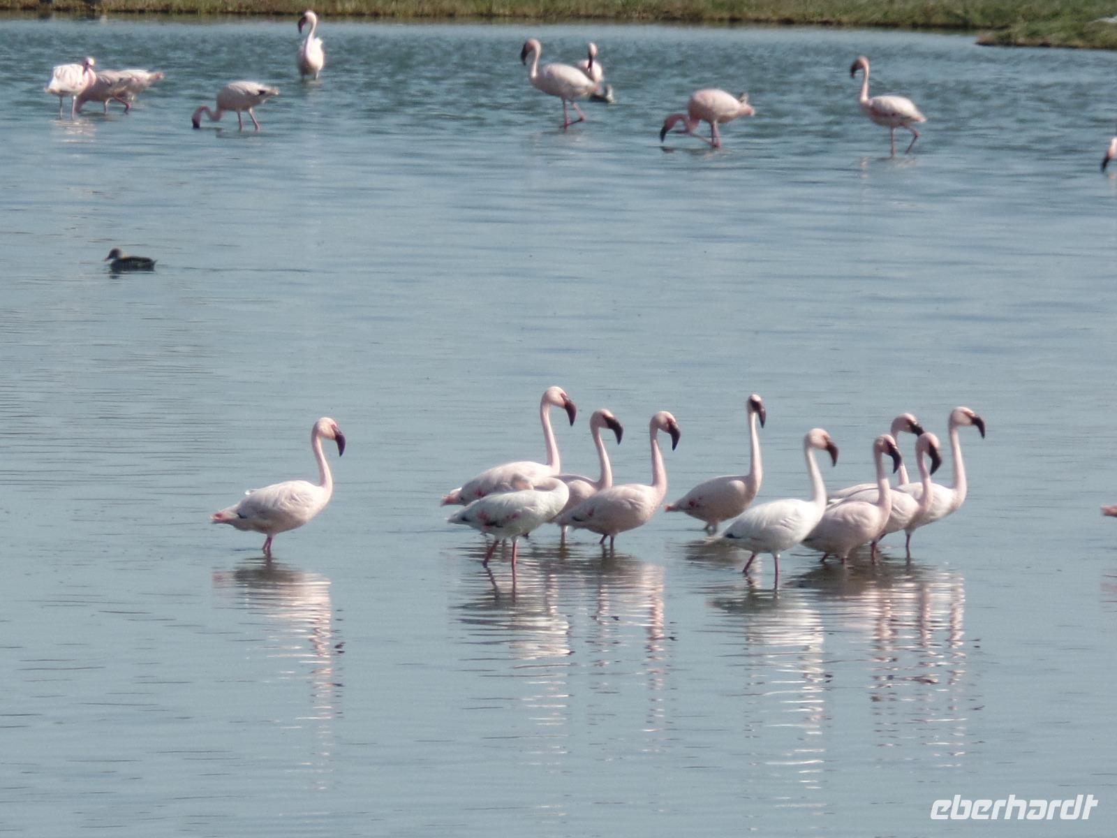 Heute hatten wir eigentlich freie Zeit aber wir alle wollten an dem fakultativen Ausflug Katamaranfahrt durch die Lagune von Walvis Bay teilnehmen. Imbiss und Getränken waren inklusive. Diese Bootsfahrt war echt ein besonderes Erlebnis: zutrauliche Ohrenrobben kamen als blinde Passagiere an Bord, Pelikane, Kormorane und riesige Möwen begleiteten uns. Eine Robbe kam an Bord für längere Zeit und man konnte sie umarmen und sich mit ihr fotografieren. Unvergesslich!! Zwischendurch wurden wir mit kleinen Leckereien und Sekt bewirtet. Natürlich probierten wir auch frische Austern, die in der Lagune gezüchtet werden. Einige hatten sie niemals vorher verkostet, heute zum erstes Mal. Und... hat es geschmeckt? Ja, oder? Bevor wir zurück nach Swakopmund fuhren, hielten wir bei eine Lagune, weil wir dort gestern aus der Ferne Flamingos sahen. Wir spazierten ganz still durch die Dünen, um die Flamingos nicht zu stören und konnten ganz nah Fotos machen. der Der weitere Nachmittag steht uns zur freien Verfügung um das charmante Swakopmund weiter zu entdecken oder eine Strandwanderung zu unternehmen. Uwe und Benja gingen wieder am Strand baden und sie waren die einzigen weißen Männer am Strand?? Toll. Das ist Afrika. Später trafen sich einige wieder an der Seebrücke, um einen unvergesslichen Sonnenuntergang zu bestaunen. Der Ozean, das Meer, die Sonne, die Farben. Am Abend hatte Eberhardt Travel für uns Plätze in einem Restaurant reserviert, doch es gab einen totalen Stromausfall in Swakopmund und wir mussten schnell woanders suchen. Ernst bestellte für uns im Europa Hof und uns hat es sehr gut geschmeckt. Dort trafen wir ein spanisches Ehepaar, welches auf Hochzeit war und sangen gemeinsam für sie „Mein kleiner grüner Kaktus!" Wieder??