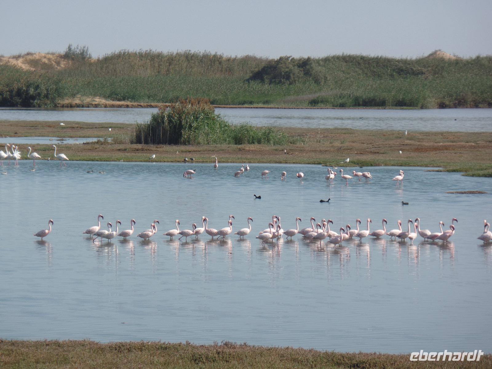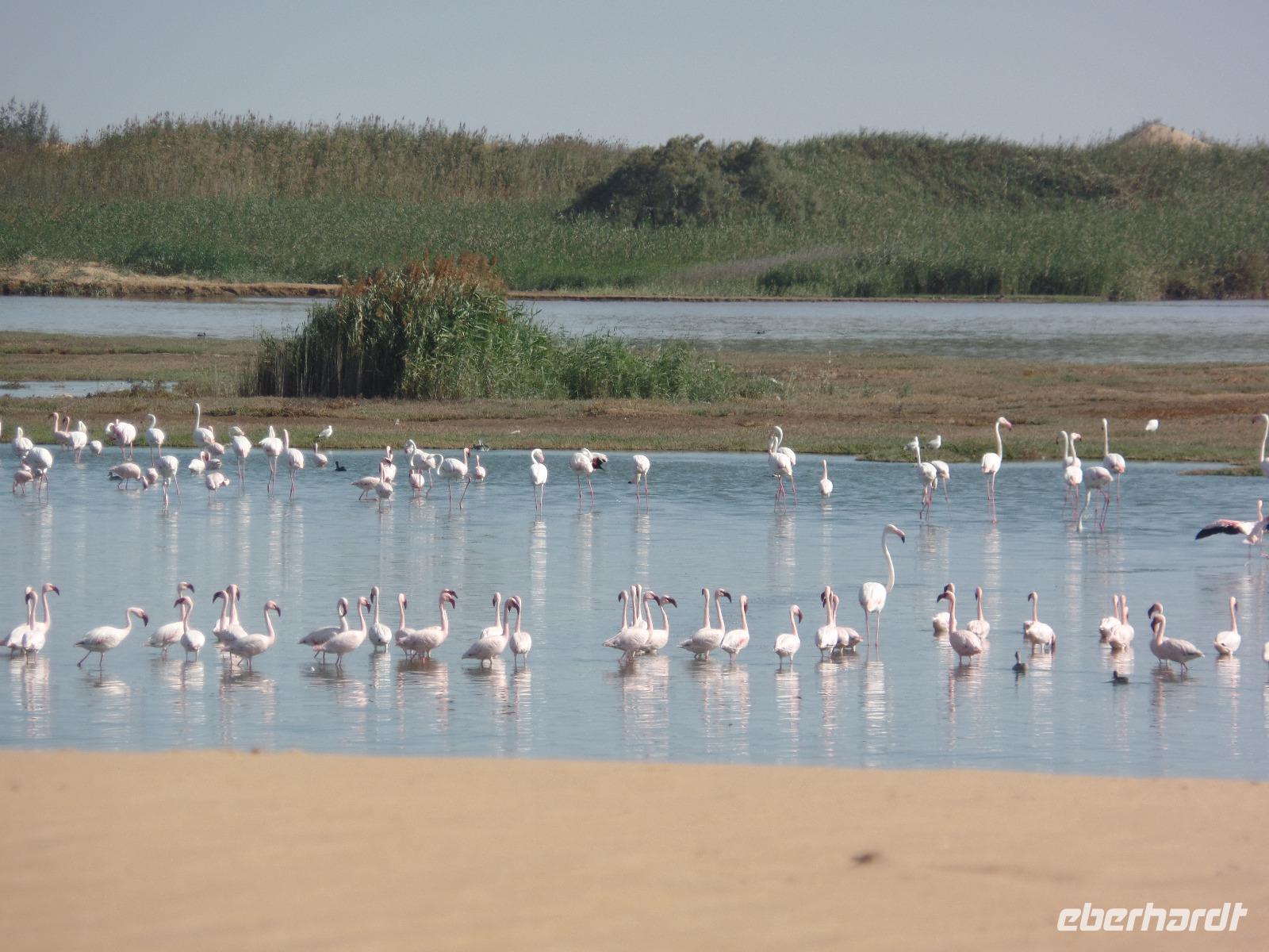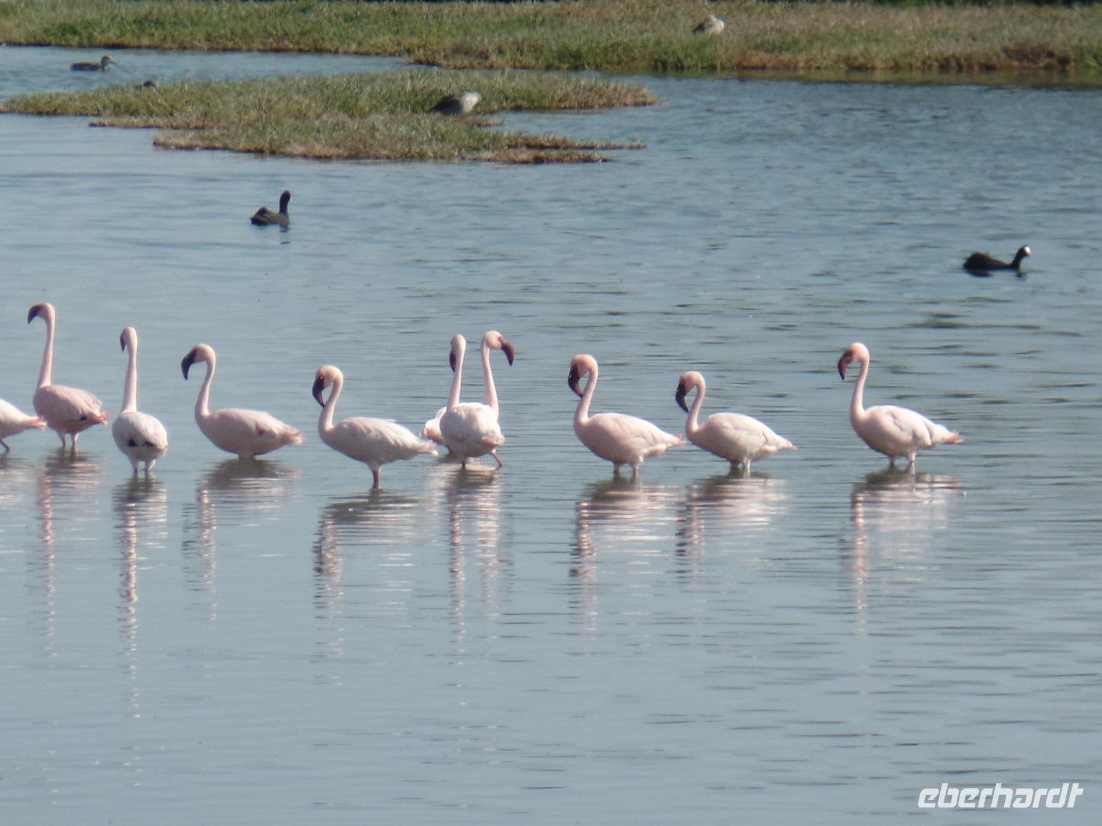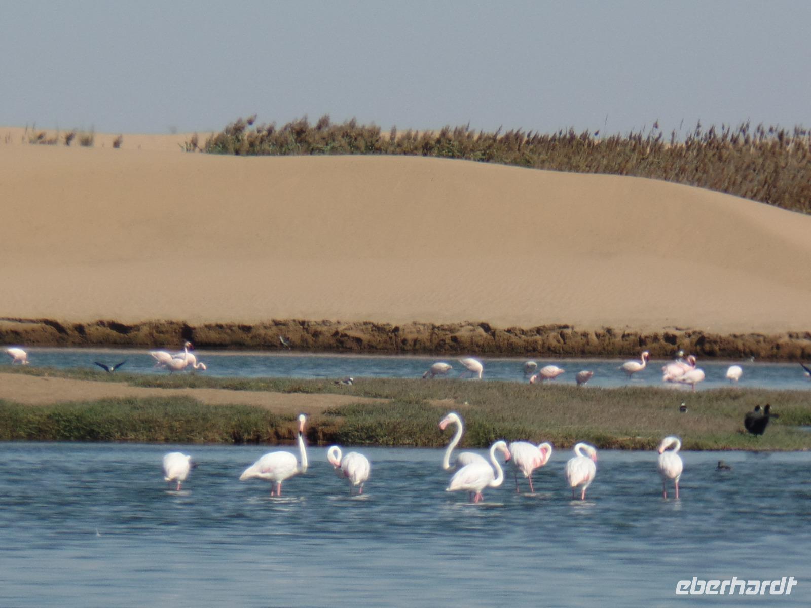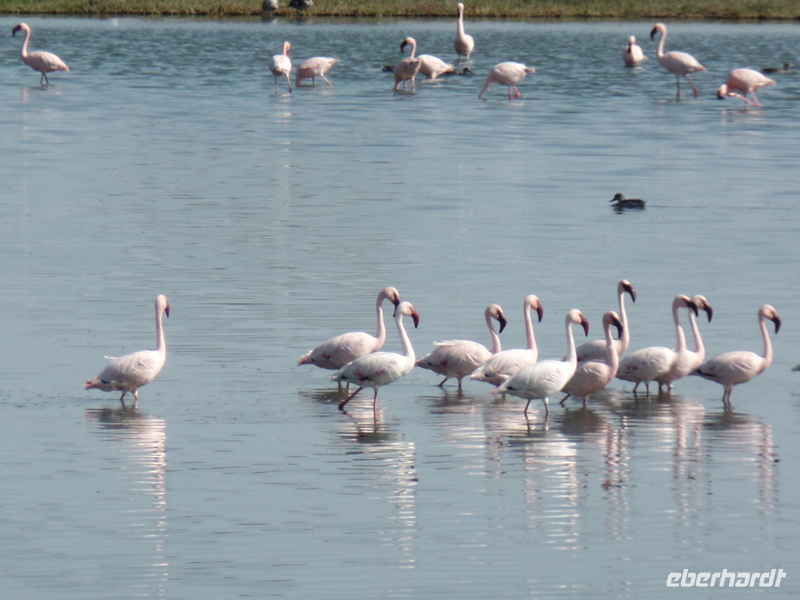 Heute hatten wir eigentlich freie Zeit aber wir alle wollten an dem fakultativen Ausflug Katamaranfahrt durch die Lagune von Walvis Bay teilnehmen. Imbiss und Getränken waren inklusive. Diese Bootsfahrt war echt ein besonderes Erlebnis: zutrauliche Ohrenrobben kamen als blinde Passagiere an Bord, Pelikane, Kormorane und riesige Möwen begleiteten uns. Eine Robbe kam an Bord für längere Zeit und man konnte sie umarmen und sich mit ihr fotografieren. Unvergesslich!! Zwischendurch wurden wir mit kleinen Leckereien und Sekt bewirtet. Natürlich probierten wir auch frische Austern, die in der Lagune gezüchtet werden. Einige hatten sie niemals vorher verkostet, heute zum erstes Mal. Und... hat es geschmeckt? Ja, oder? Bevor wir zurück nach Swakopmund fuhren, hielten wir bei eine Lagune, weil wir dort gestern aus der Ferne Flamingos sahen. Wir spazierten ganz still durch die Dünen, um die Flamingos nicht zu stören und konnten ganz nah Fotos machen. der Der weitere Nachmittag steht uns zur freien Verfügung um das charmante Swakopmund weiter zu entdecken oder eine Strandwanderung zu unternehmen. Uwe und Benja gingen wieder am Strand baden und sie waren die einzigen weißen Männer am Strand?? Toll. Das ist Afrika. Später trafen sich einige wieder an der Seebrücke, um einen unvergesslichen Sonnenuntergang zu bestaunen. Der Ozean, das Meer, die Sonne, die Farben. Am Abend hatte Eberhardt Travel für uns Plätze in einem Restaurant reserviert, doch es gab einen totalen Stromausfall in Swakopmund und wir mussten schnell woanders suchen. Ernst bestellte für uns im Europa Hof und uns hat es sehr gut geschmeckt. Dort trafen wir ein spanisches Ehepaar, welches auf Hochzeit war und sangen gemeinsam für sie „Mein kleiner grüner Kaktus!" Wieder??