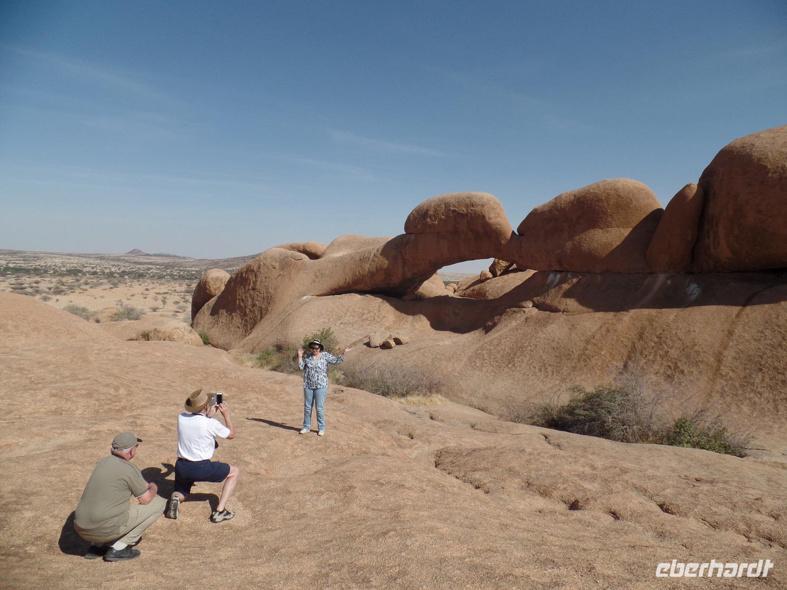 Wir verabschiedeten uns von Swakopmund und konnten sogar beim Frühstück Austern essen. Dann ging es erstmal Richtung Norden immer am Ozean entlang, einen Fotostopp machten wir vor einem gestrandeten Geisterschiff. Weiter auf der Fahrt wurden wir beeindruckt von den bizarren Felsformationen aus Granit, die sich äußerst fotogen aus der einmaligen Berglandschaft des Erongo Gebirges erheben. An der Spitzkoppe oder auch Matterhorn Namibias genannt, unternahmen wir eine kleine Wanderung zum Rock Arch während Ernst für uns das Picknick vorbereitete. Diese Gegend ist auch reich an Halbedelsteinen. Nicht nur Hobbygeologen erfreuten sich an den einzigartigen Gesteinen, die an kleinen Ständen am Straßenrand feil geboten wurden. Wir übernachteten heute in der Kashana Lodge bei Omaruru. Nach dem Abendessen kamen 2 Kellnerinnen und die Köchin und sangen für uns ein paar schöne afrikanische Lieder. Toll.