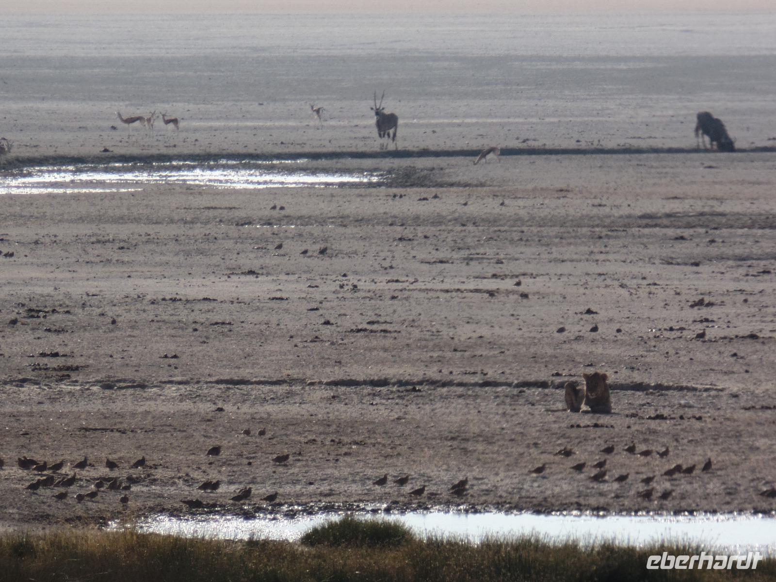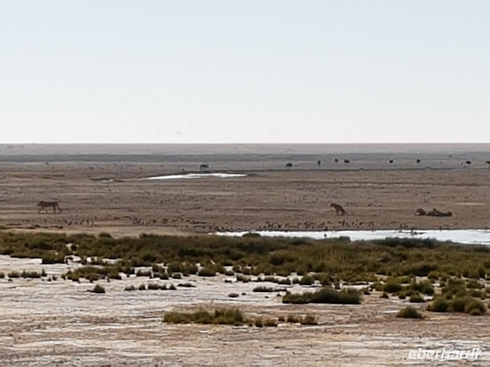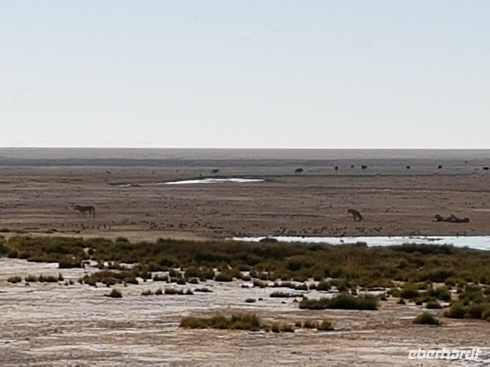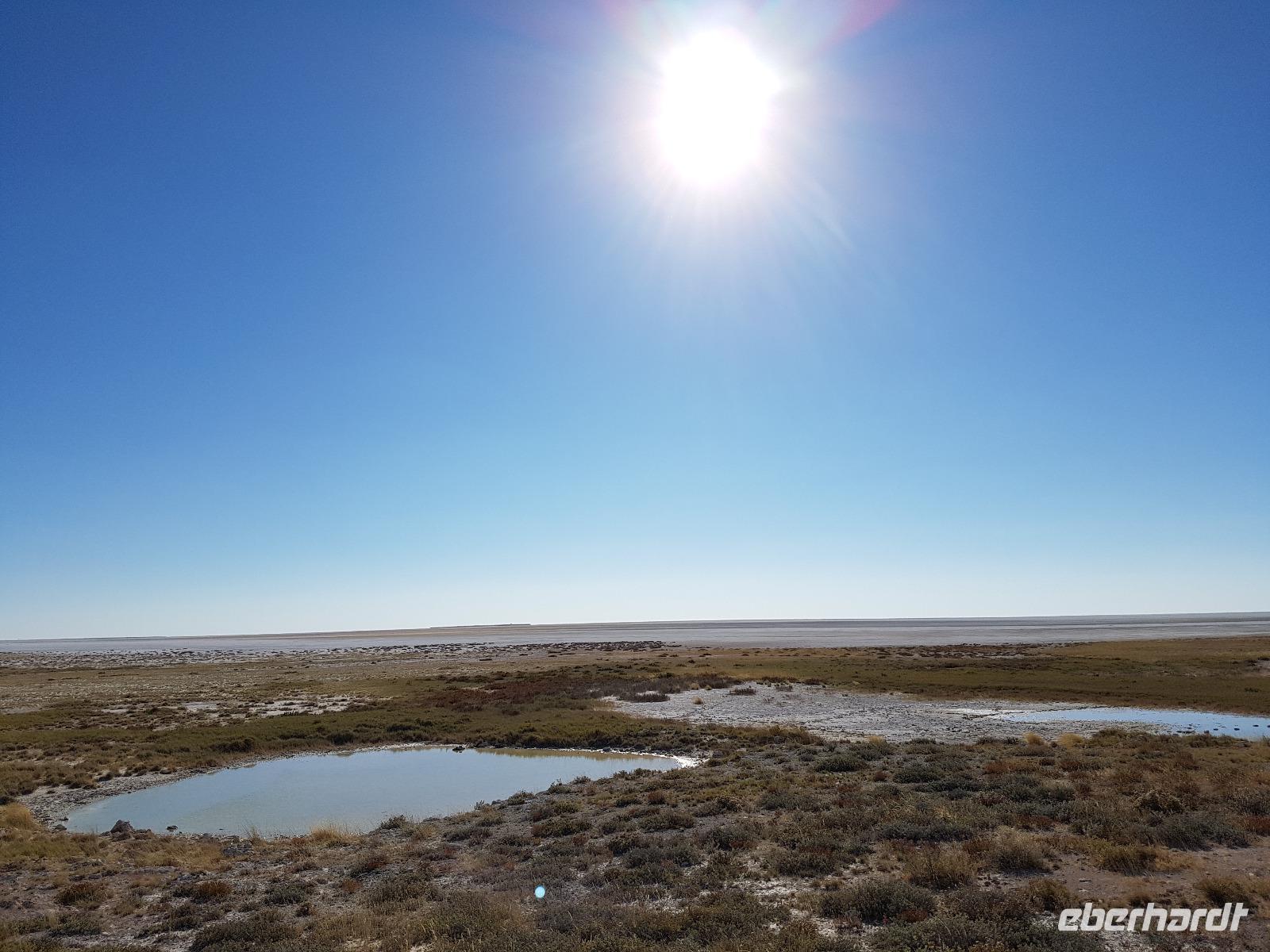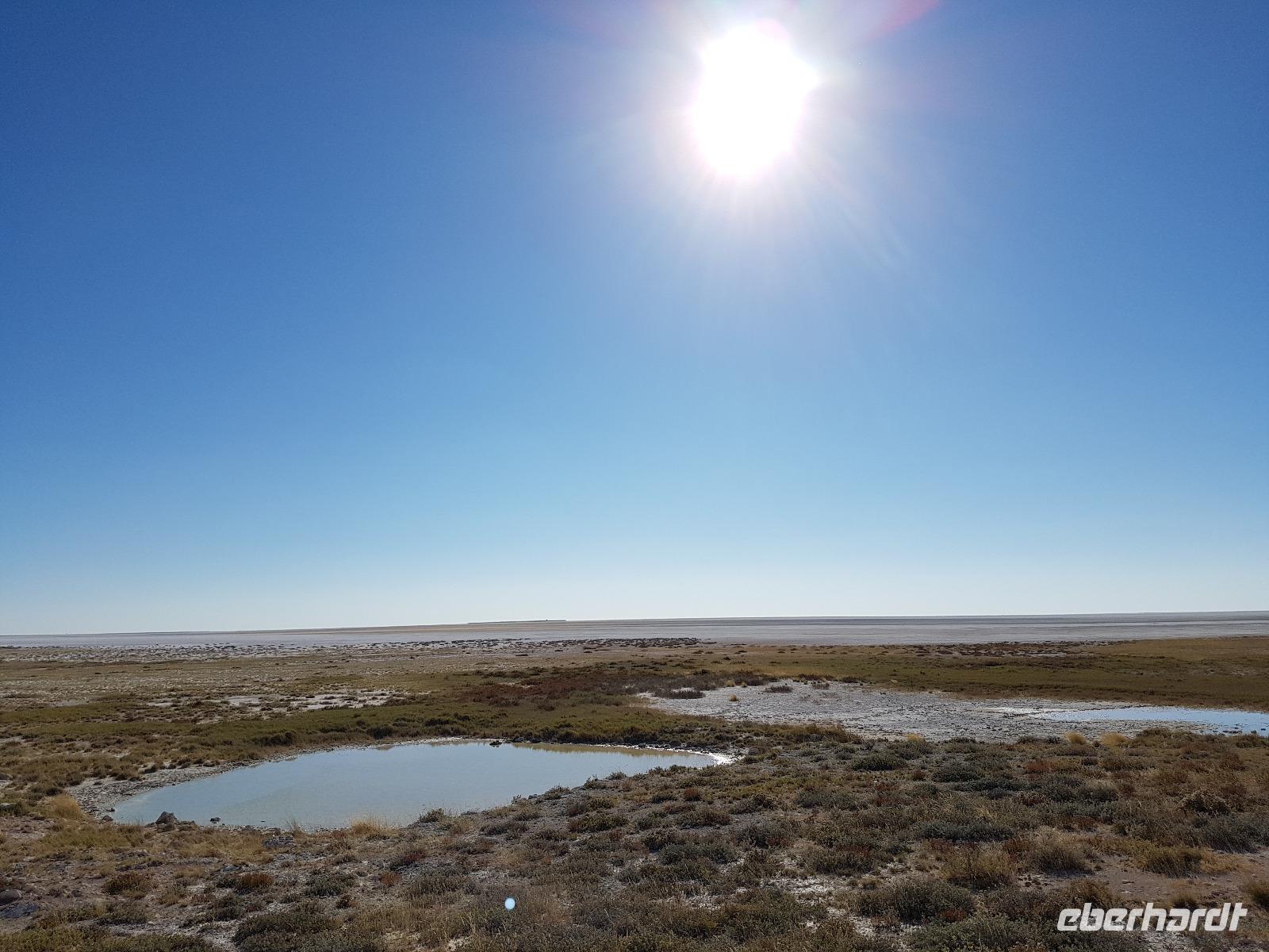 So wie gestern verbrachten wir die Mittagstunden beim gemütlichen Picknick in einem schattigen Camp direkt im Park. Hier konnte man sich was zum Essen bestellen oder zum Wasserloch laufen, um Tiere zu beobachten. Eberhardt Travel lud heute alle Gäste zum Eis ein. War eine gute Idee, oder? Am frühenNachmittag fuhren wir direkt am Rand von dem Herzstück des Parks, die 100 Kilometer lange Etosha-Pfanne. Eine große, weiße Fläche, wie der Name aus der Sansprache bedeutet, breitet sich ins Unendliche aus. Die weiße, nichtgreifbare Weite zieht uns alle magisch in ihren Bann.