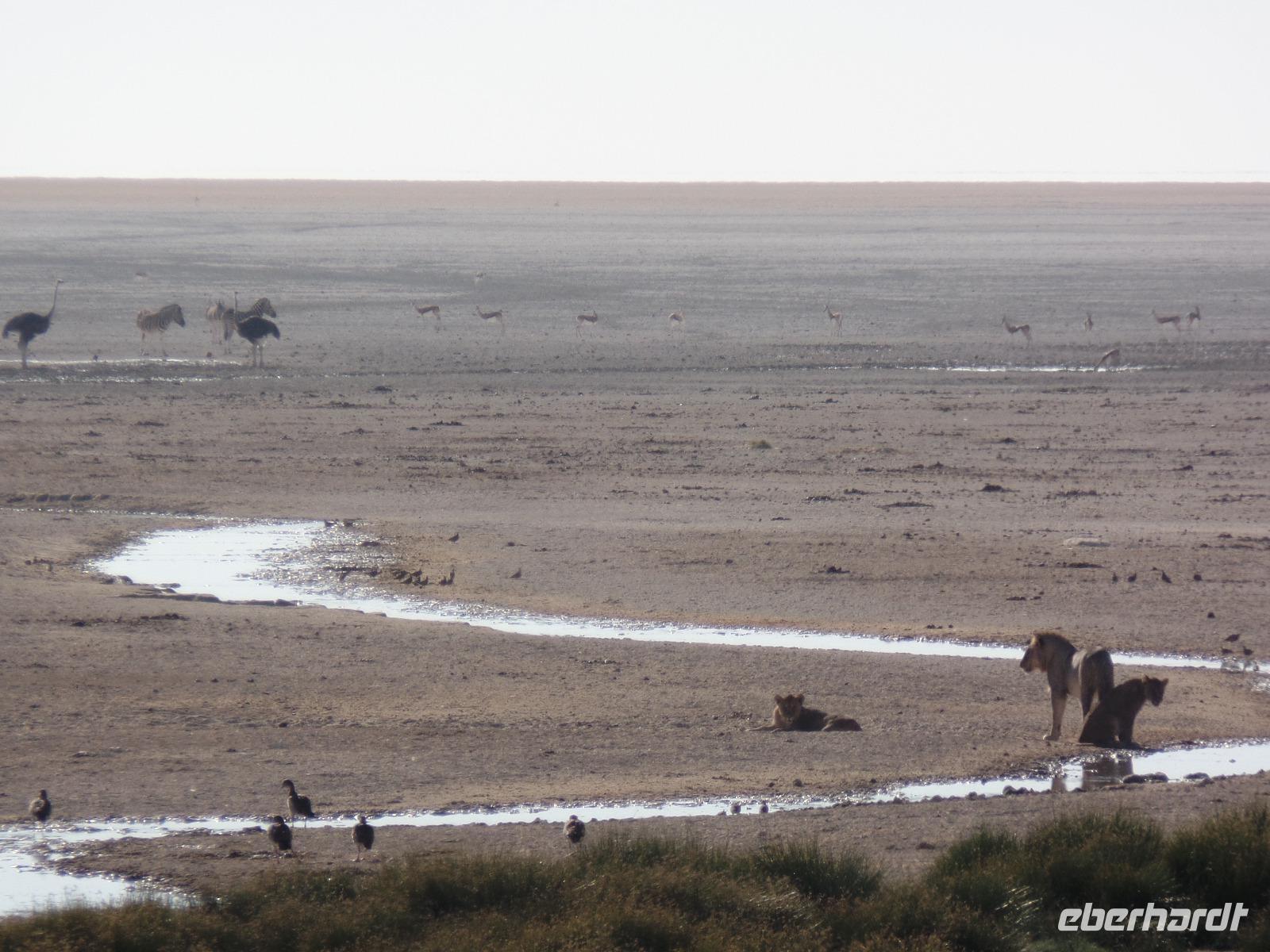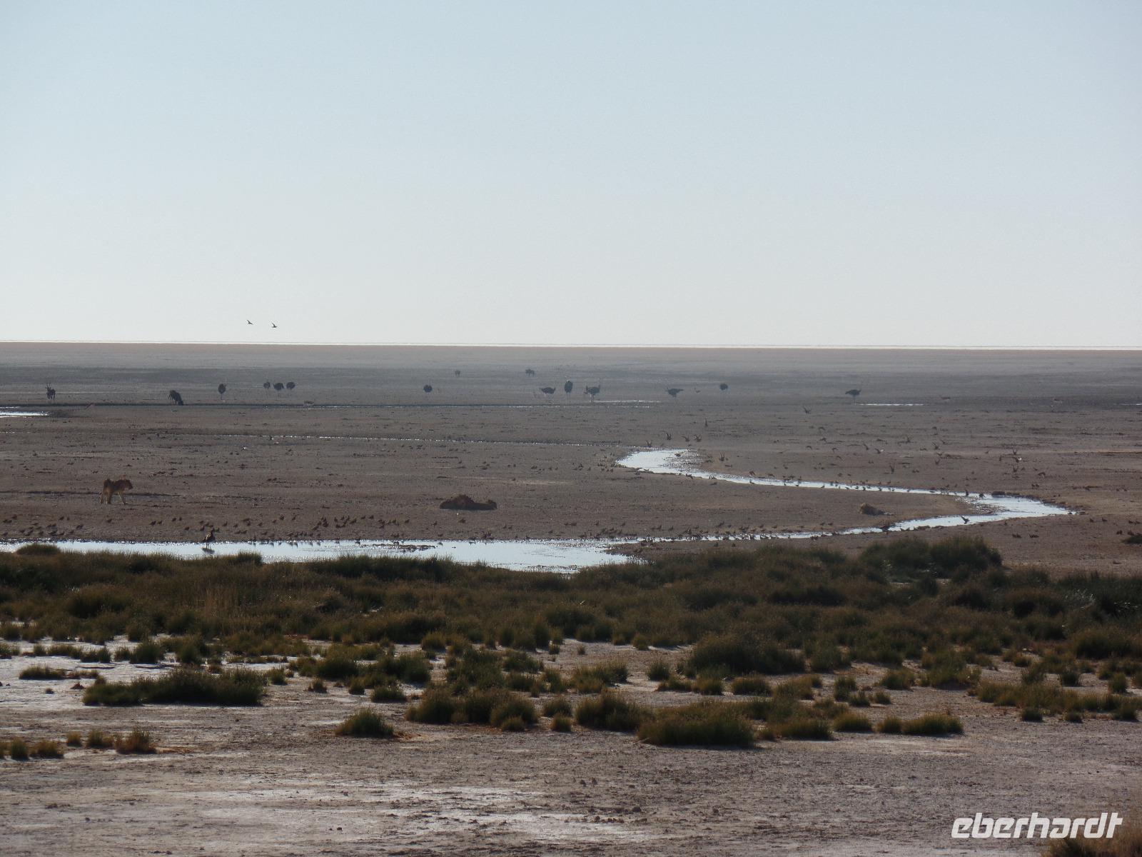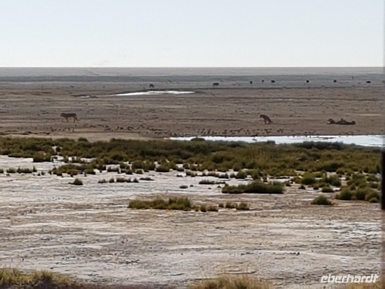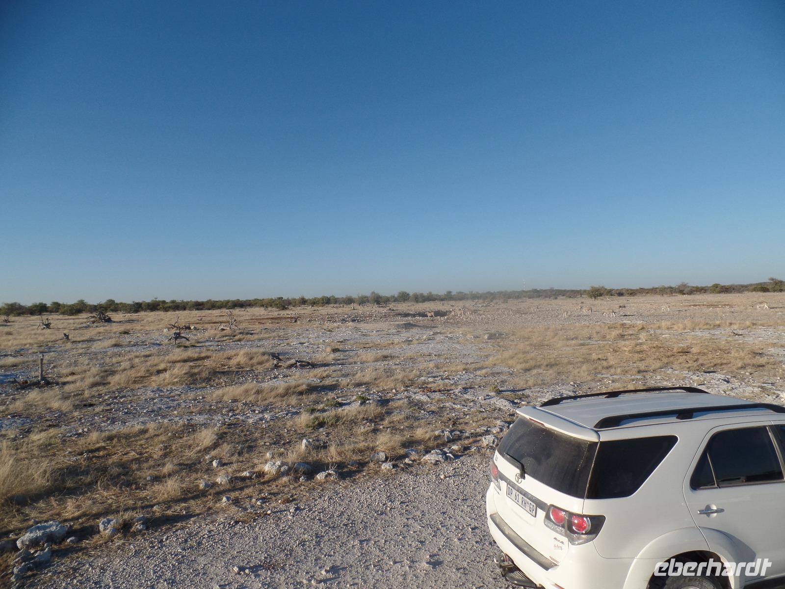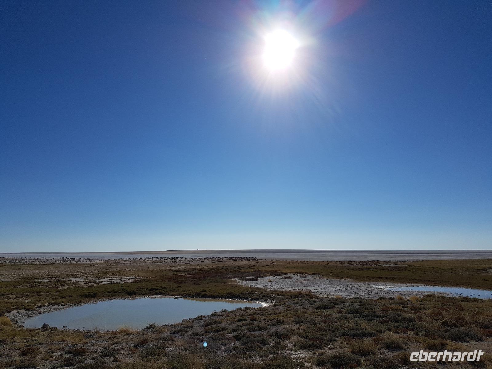 So wie gestern verbrachten wir die Mittagstunden beim gemütlichen Picknick in einem schattigen Camp direkt im Park. Hier konnte man sich was zum Essen bestellen oder zum Wasserloch laufen, um Tiere zu beobachten. Eberhardt Travel lud heute alle Gäste zum Eis ein. War eine gute Idee, oder? Am frühenNachmittag fuhren wir direkt am Rand von dem Herzstück des Parks, die 100 Kilometer lange Etosha-Pfanne. Eine große, weiße Fläche, wie der Name aus der Sansprache bedeutet, breitet sich ins Unendliche aus. Die weiße, nichtgreifbare Weite zieht uns alle magisch in ihren Bann.