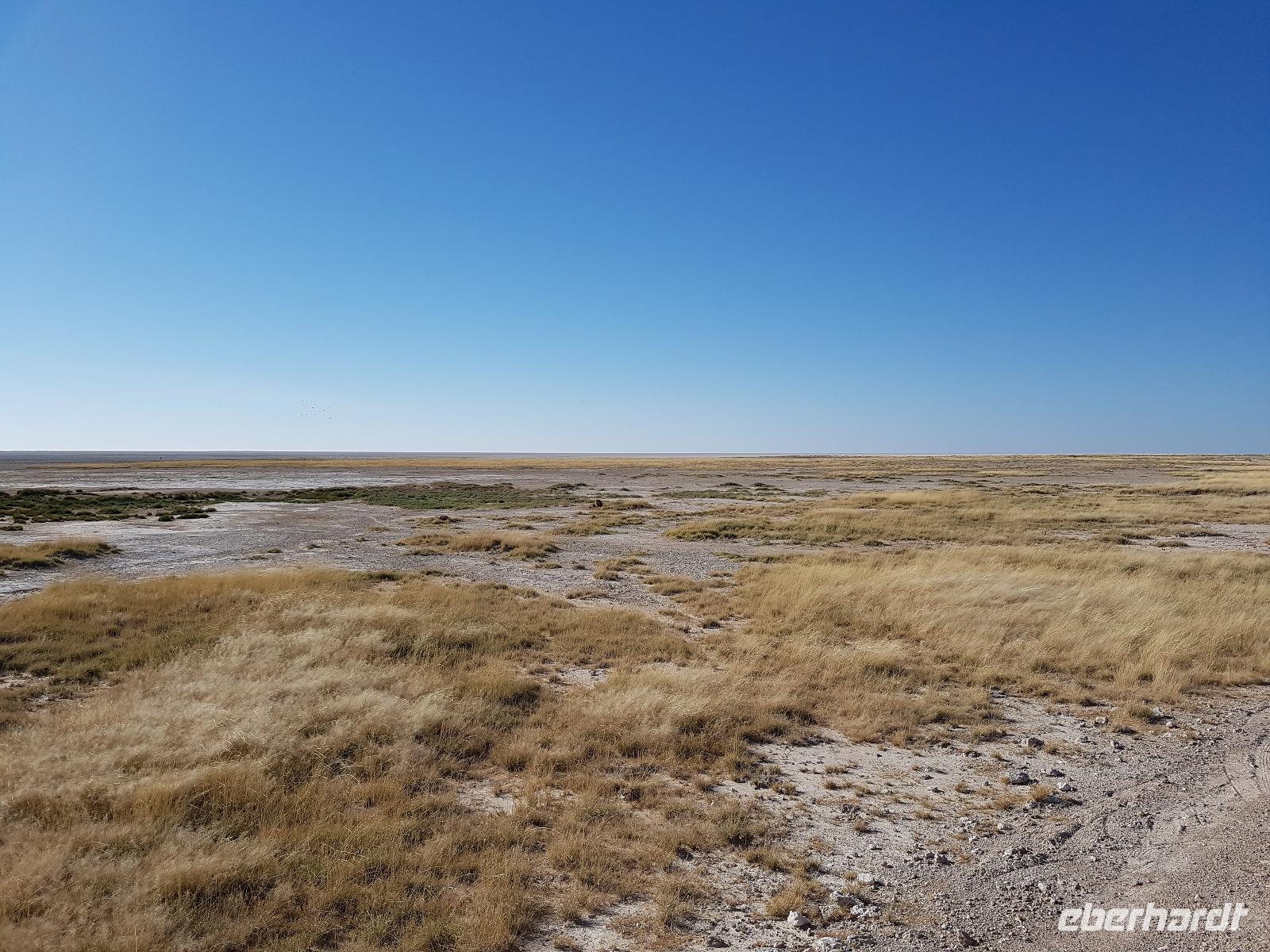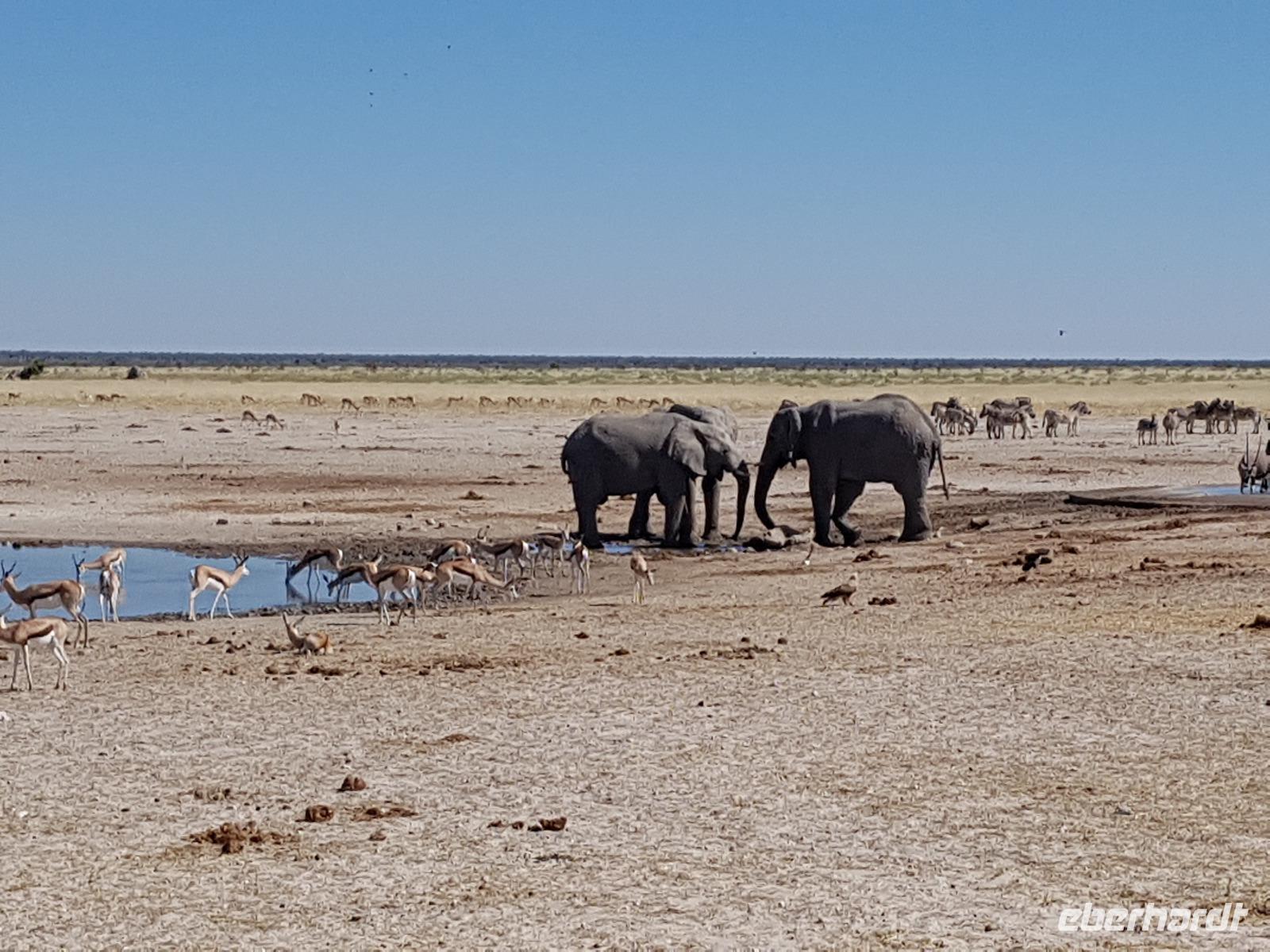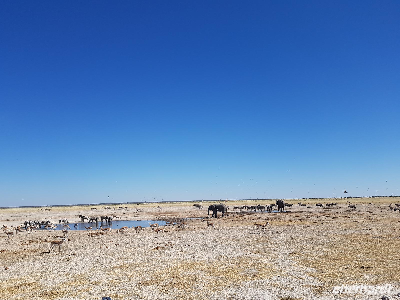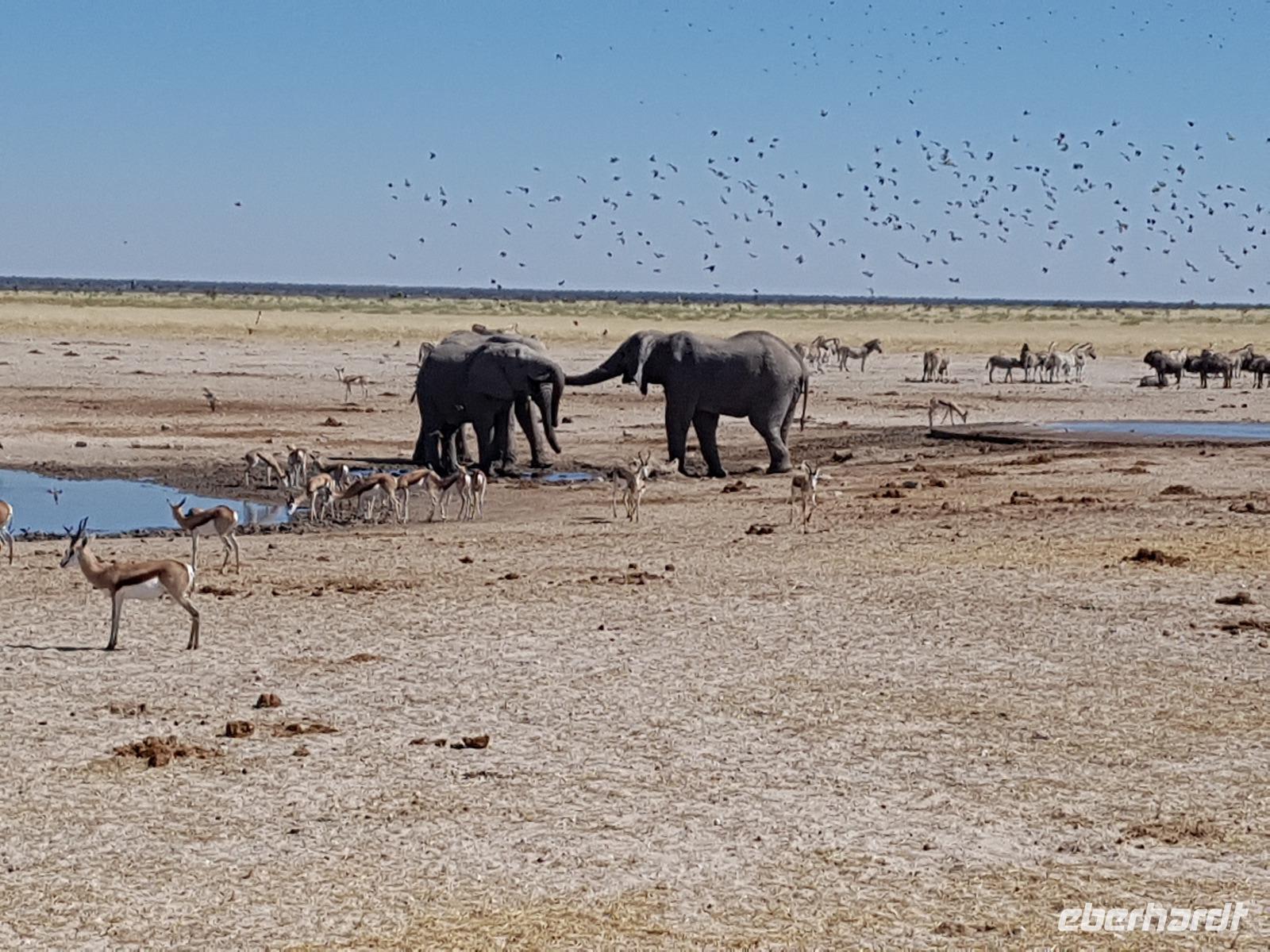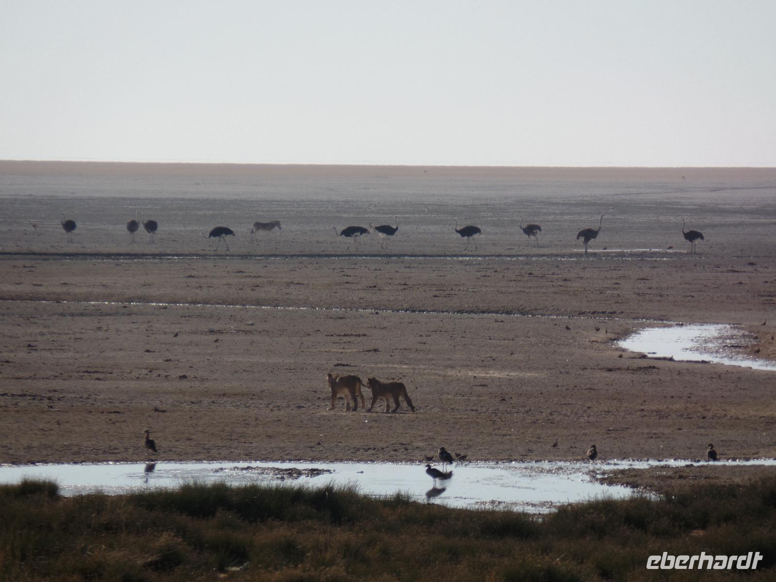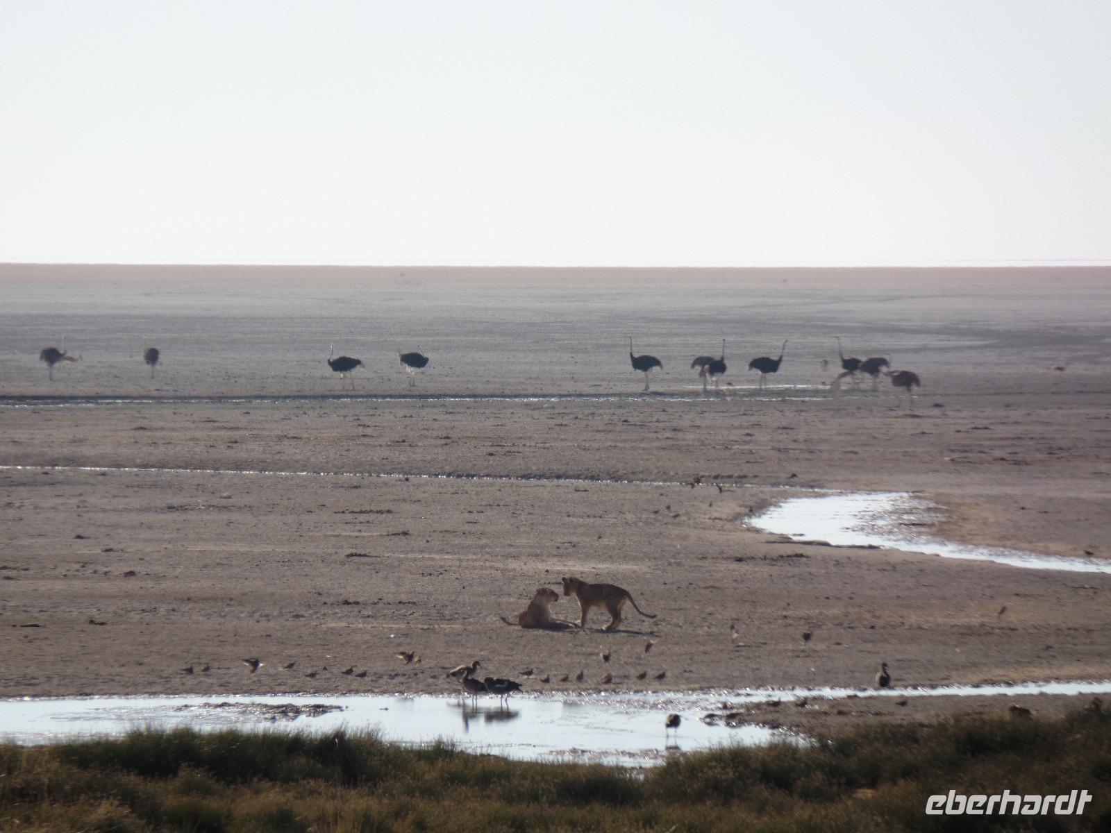 So wie gestern verbrachten wir die Mittagstunden beim gemütlichen Picknick in einem schattigen Camp direkt im Park. Hier konnte man sich was zum Essen bestellen oder zum Wasserloch laufen, um Tiere zu beobachten. Eberhardt Travel lud heute alle Gäste zum Eis ein. War eine gute Idee, oder? Am frühenNachmittag fuhren wir direkt am Rand von dem Herzstück des Parks, die 100 Kilometer lange Etosha-Pfanne. Eine große, weiße Fläche, wie der Name aus der Sansprache bedeutet, breitet sich ins Unendliche aus. Die weiße, nichtgreifbare Weite zieht uns alle magisch in ihren Bann.