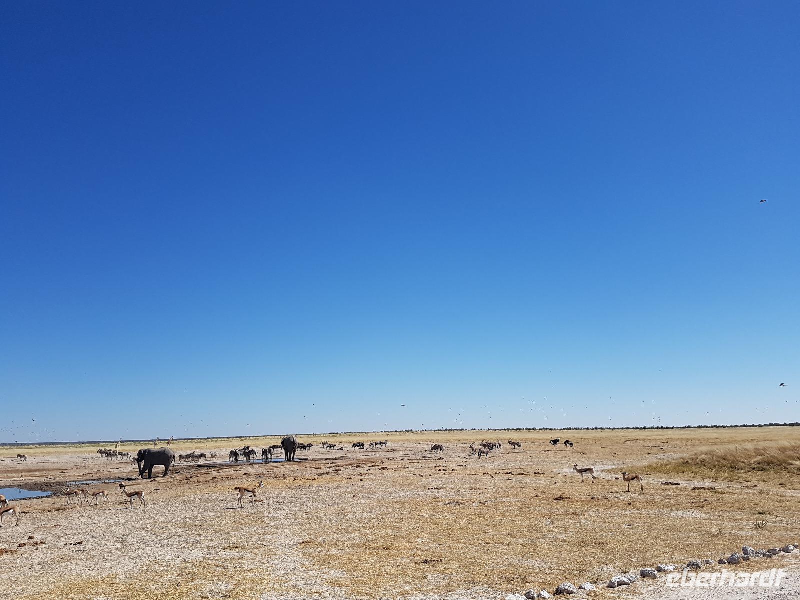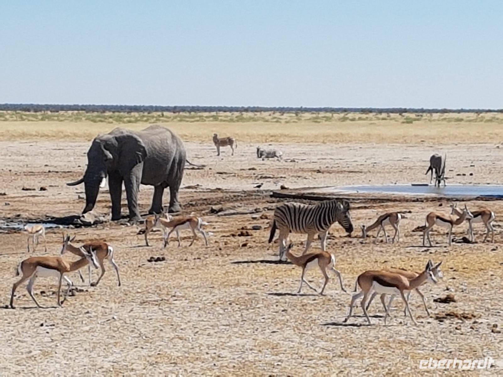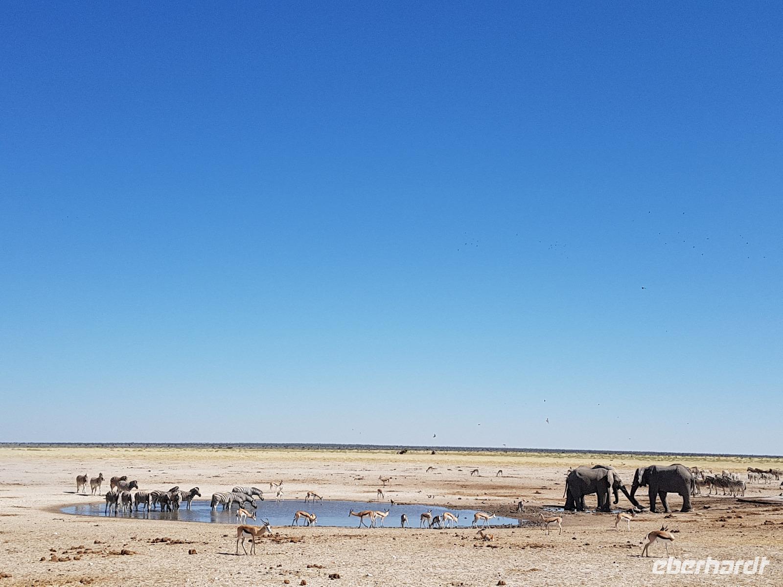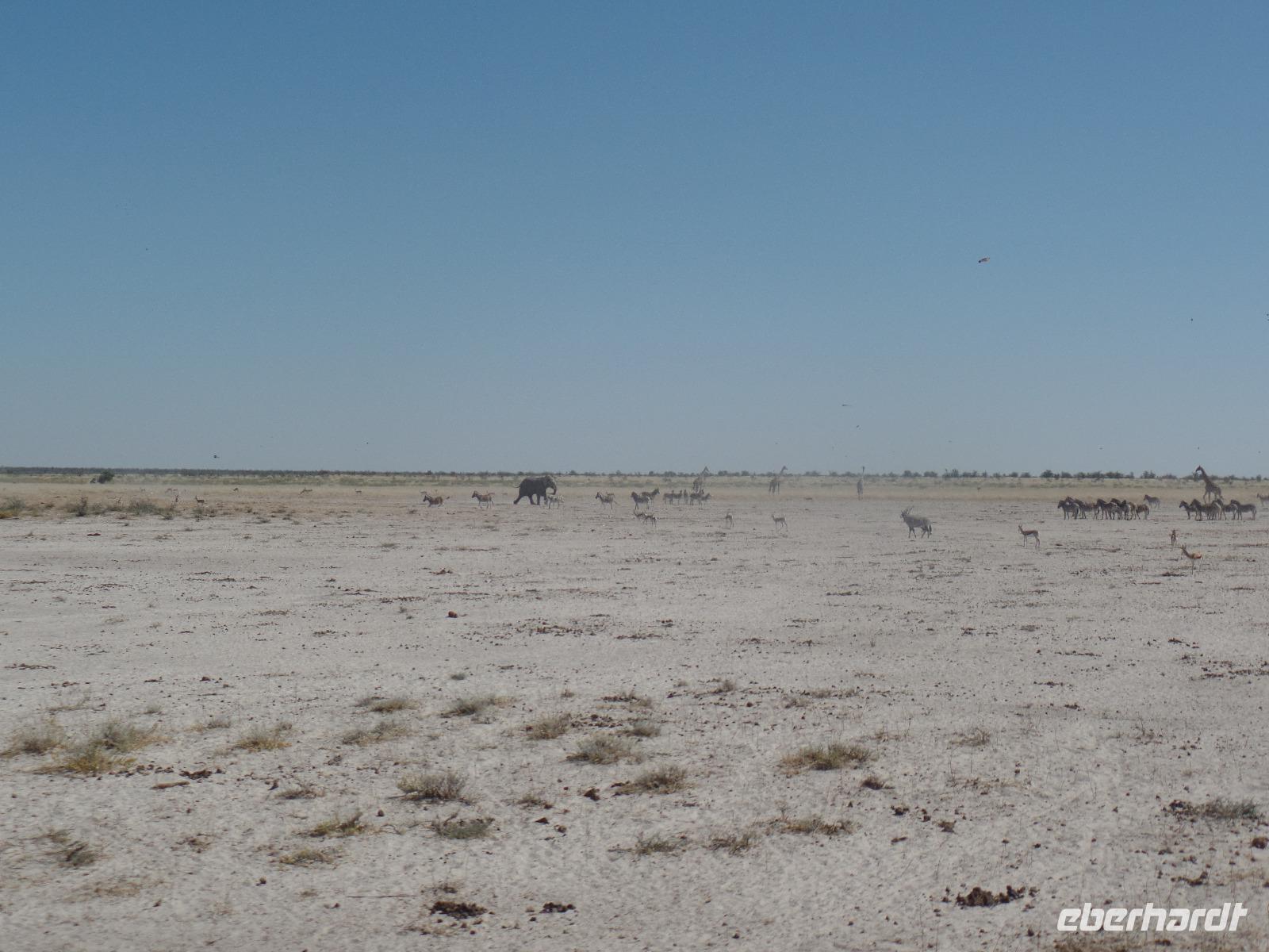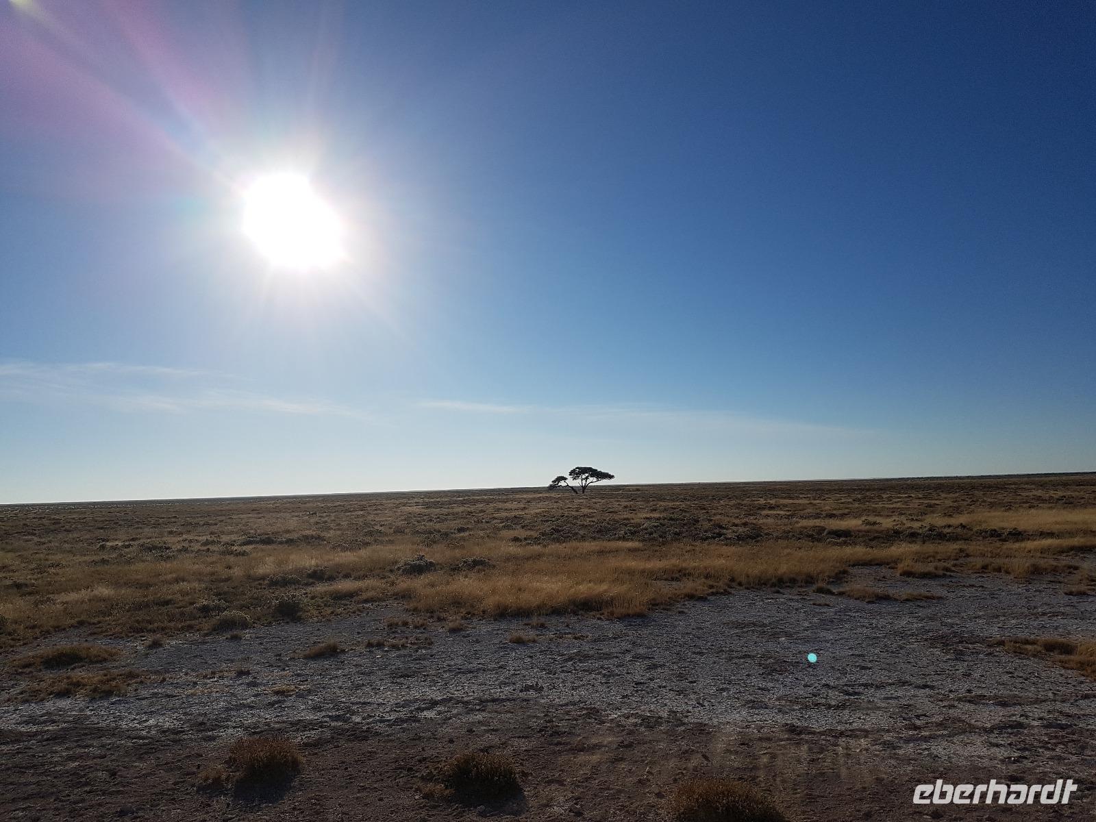 So wie gestern verbrachten wir die Mittagstunden beim gemütlichen Picknick in einem schattigen Camp direkt im Park. Hier konnte man sich was zum Essen bestellen oder zum Wasserloch laufen, um Tiere zu beobachten. Eberhardt Travel lud heute alle Gäste zum Eis ein. War eine gute Idee, oder? Am frühenNachmittag fuhren wir direkt am Rand von dem Herzstück des Parks, die 100 Kilometer lange Etosha-Pfanne. Eine große, weiße Fläche, wie der Name aus der Sansprache bedeutet, breitet sich ins Unendliche aus. Die weiße, nichtgreifbare Weite zieht uns alle magisch in ihren Bann.