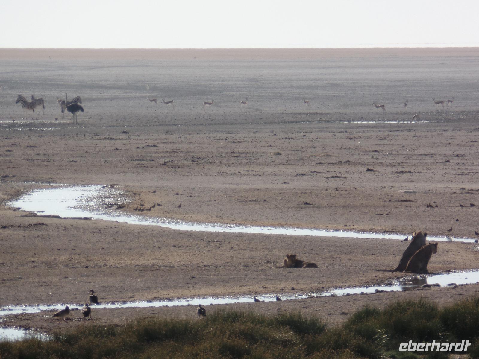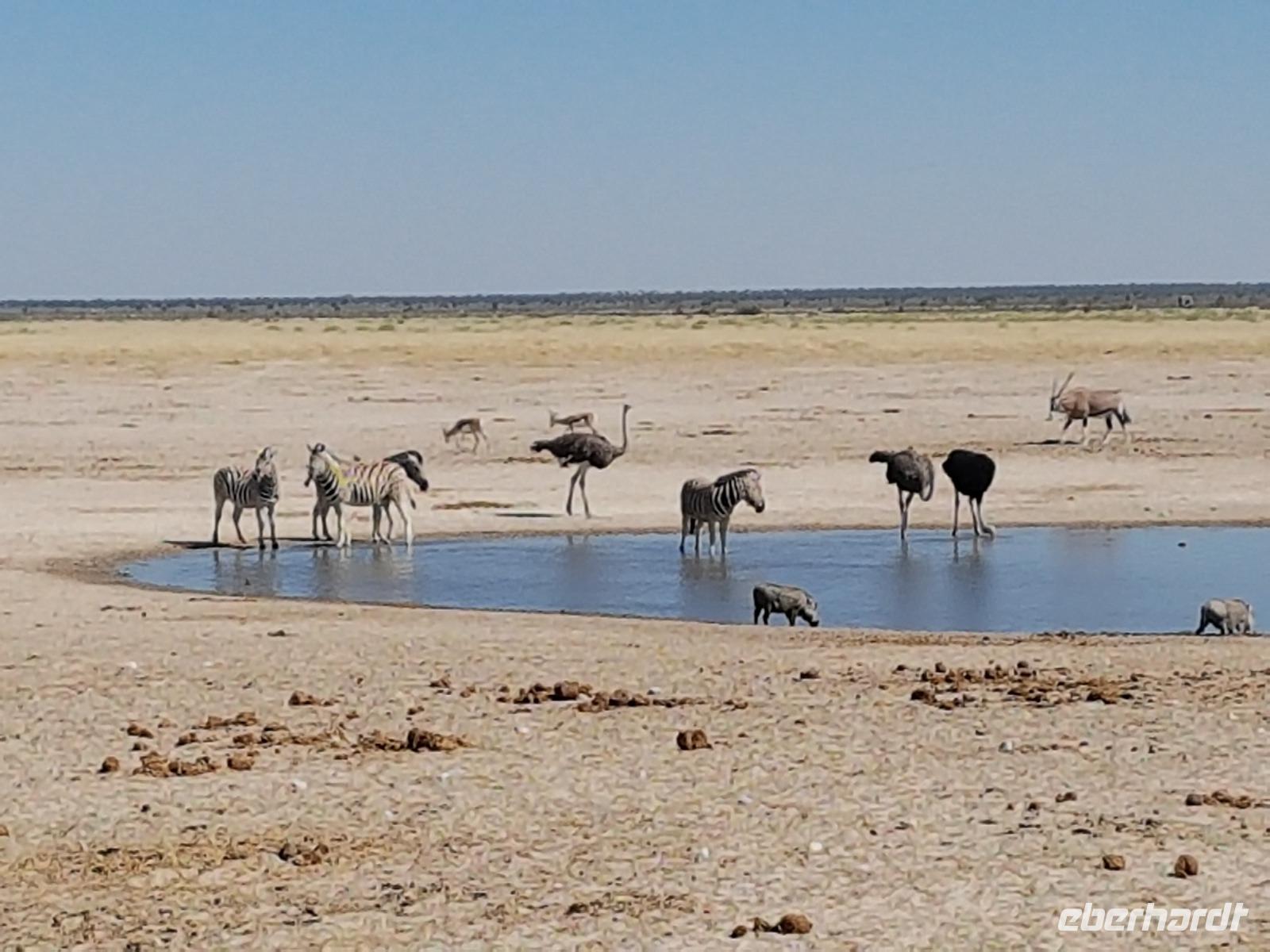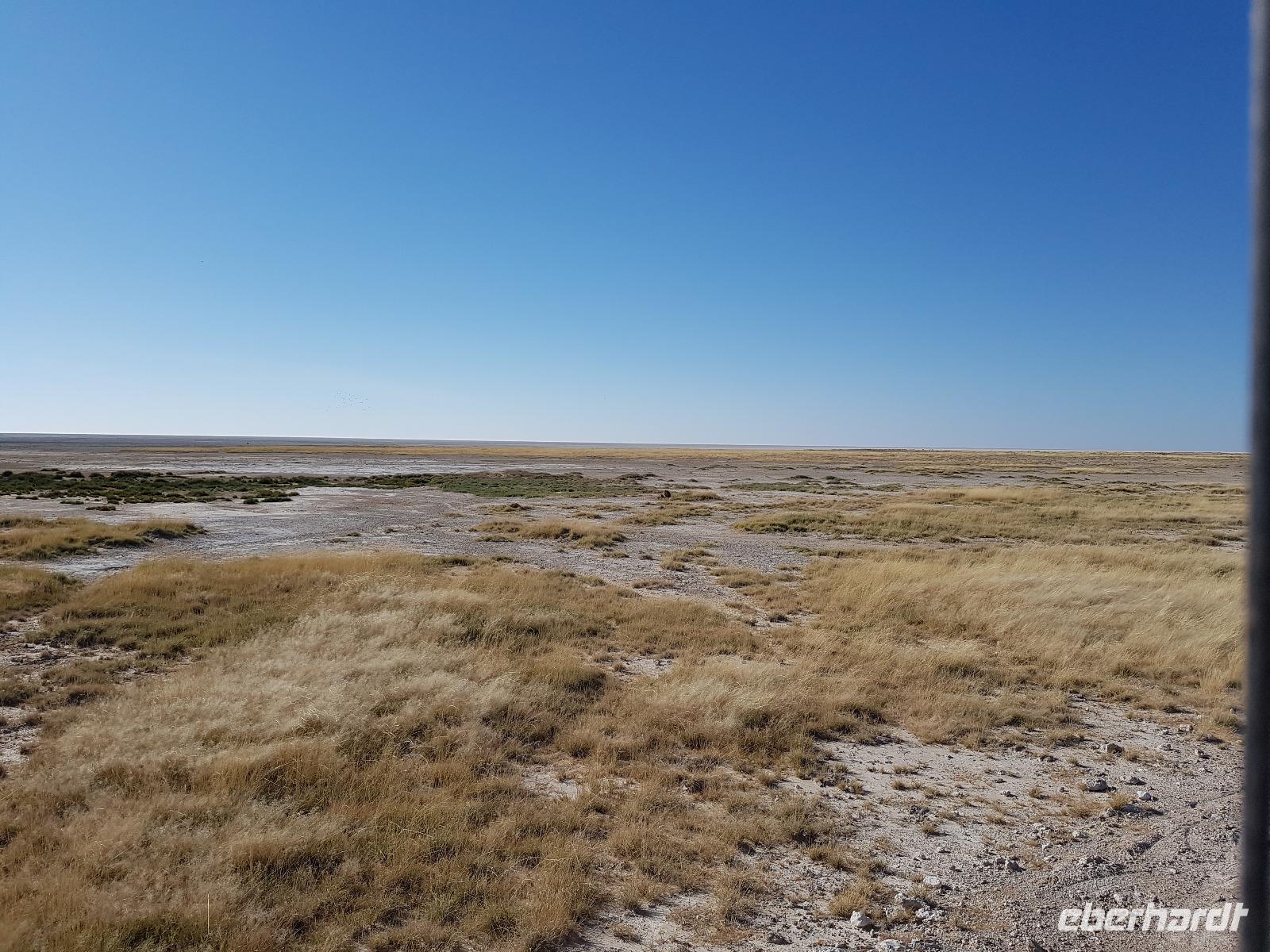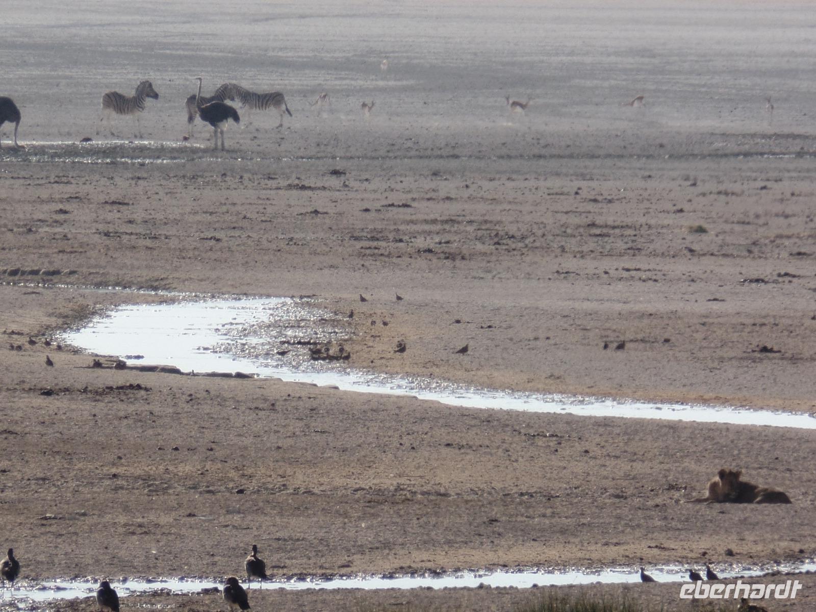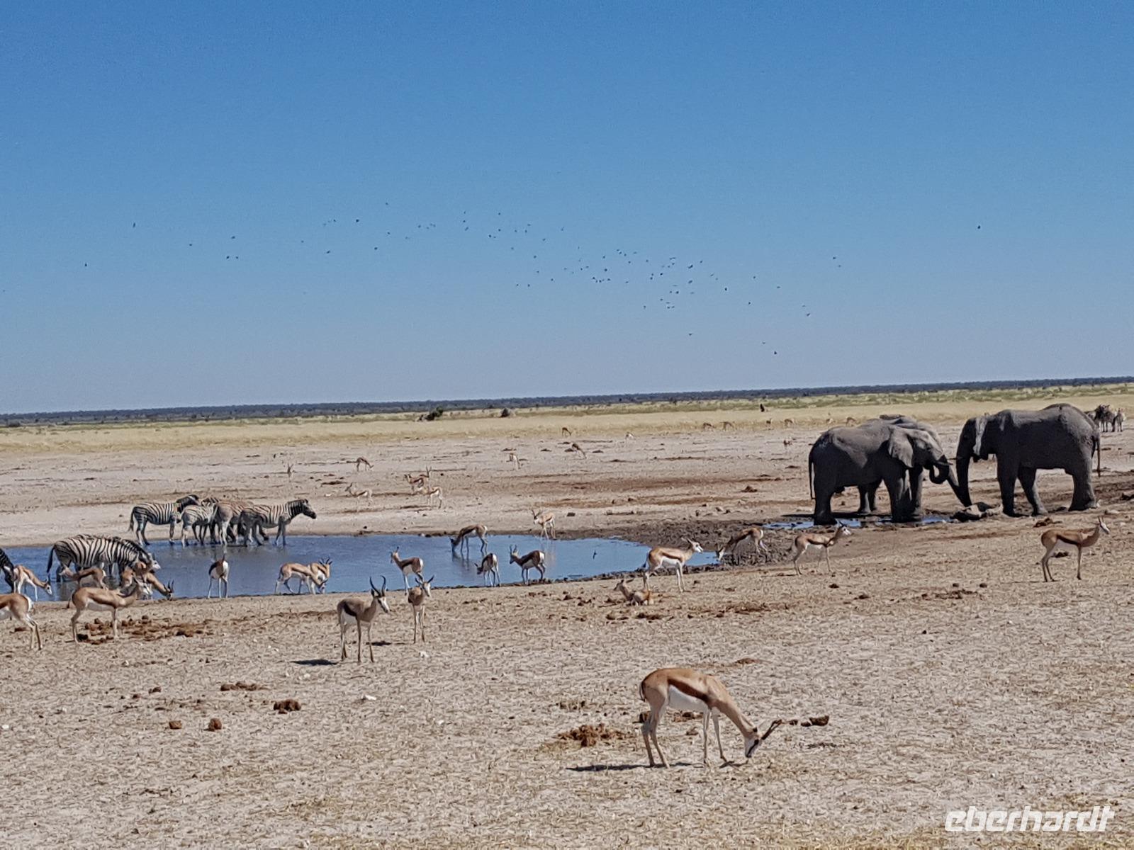 So wie gestern verbrachten wir die Mittagstunden beim gemütlichen Picknick in einem schattigen Camp direkt im Park. Hier konnte man sich was zum Essen bestellen oder zum Wasserloch laufen, um Tiere zu beobachten. Eberhardt Travel lud heute alle Gäste zum Eis ein. War eine gute Idee, oder? Am frühenNachmittag fuhren wir direkt am Rand von dem Herzstück des Parks, die 100 Kilometer lange Etosha-Pfanne. Eine große, weiße Fläche, wie der Name aus der Sansprache bedeutet, breitet sich ins Unendliche aus. Die weiße, nichtgreifbare Weite zieht uns alle magisch in ihren Bann.