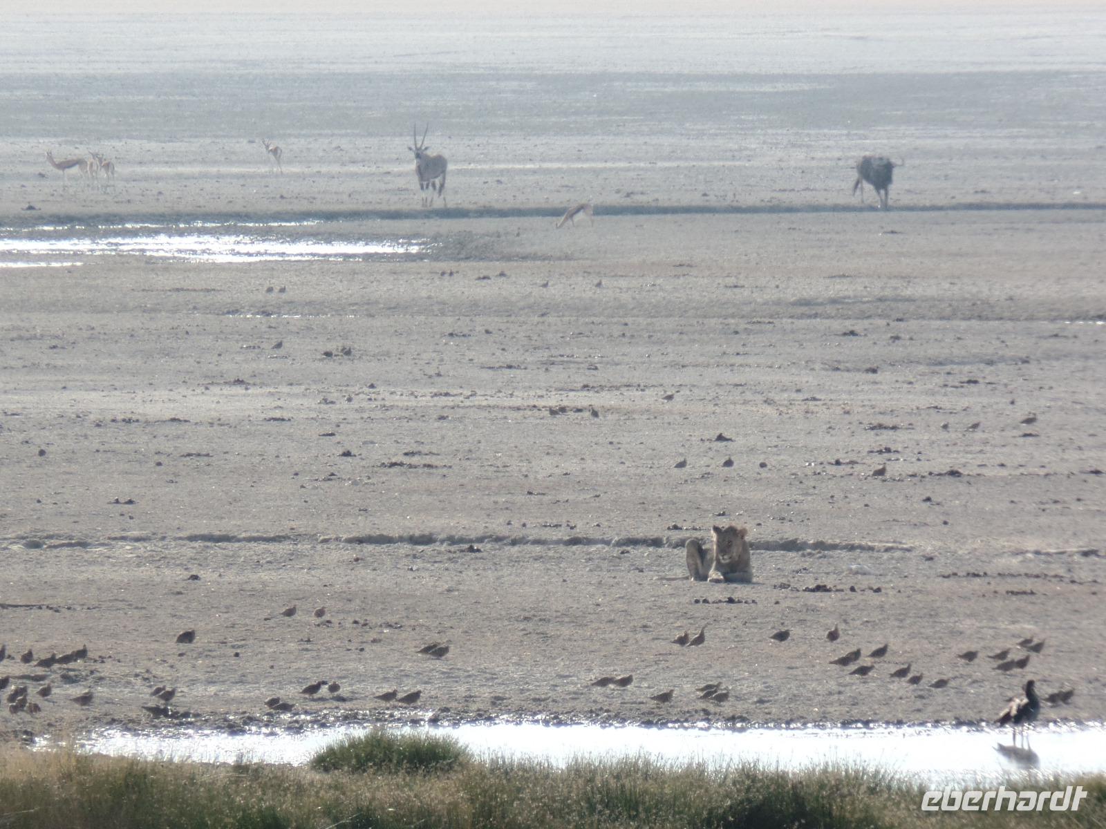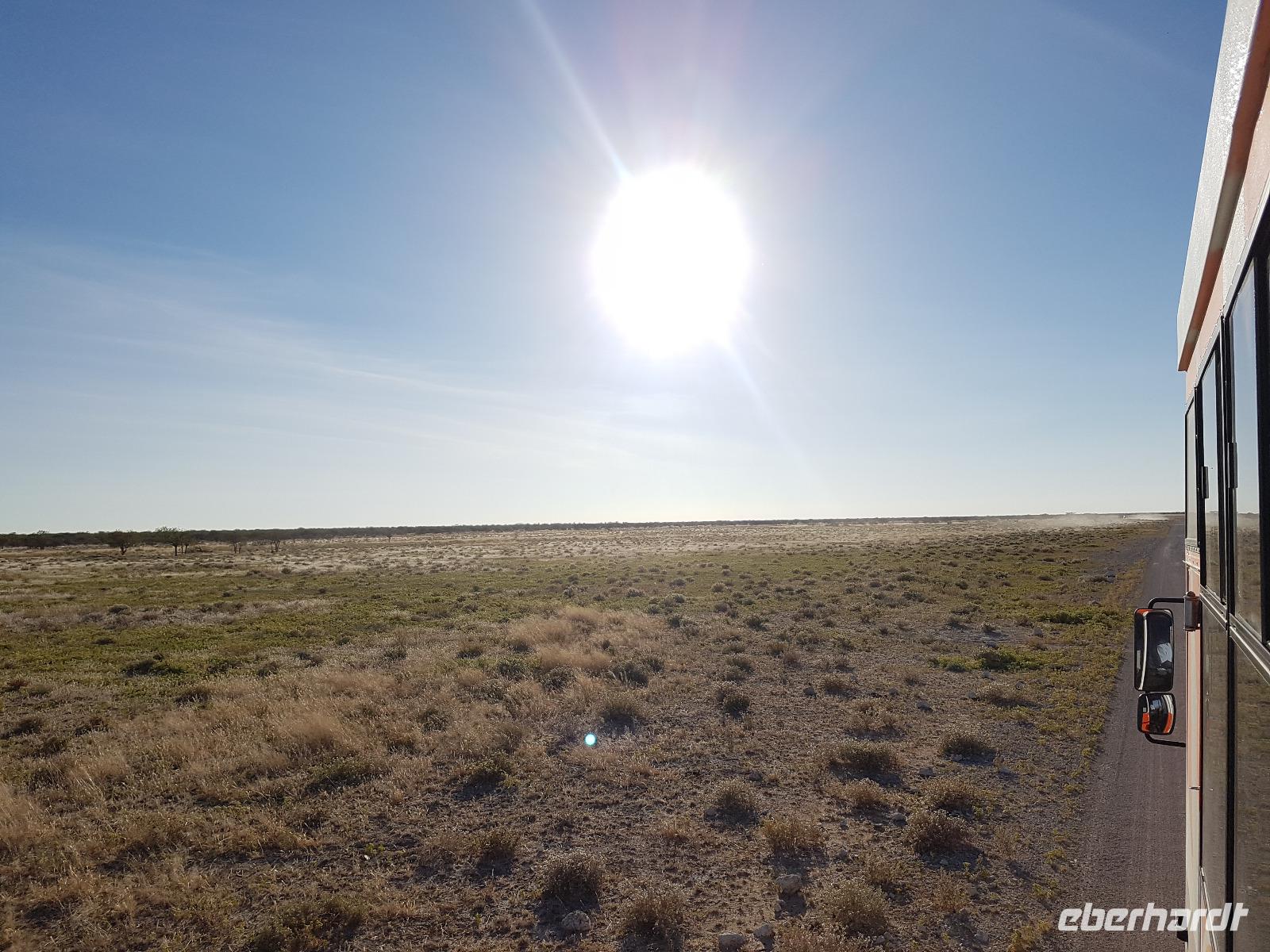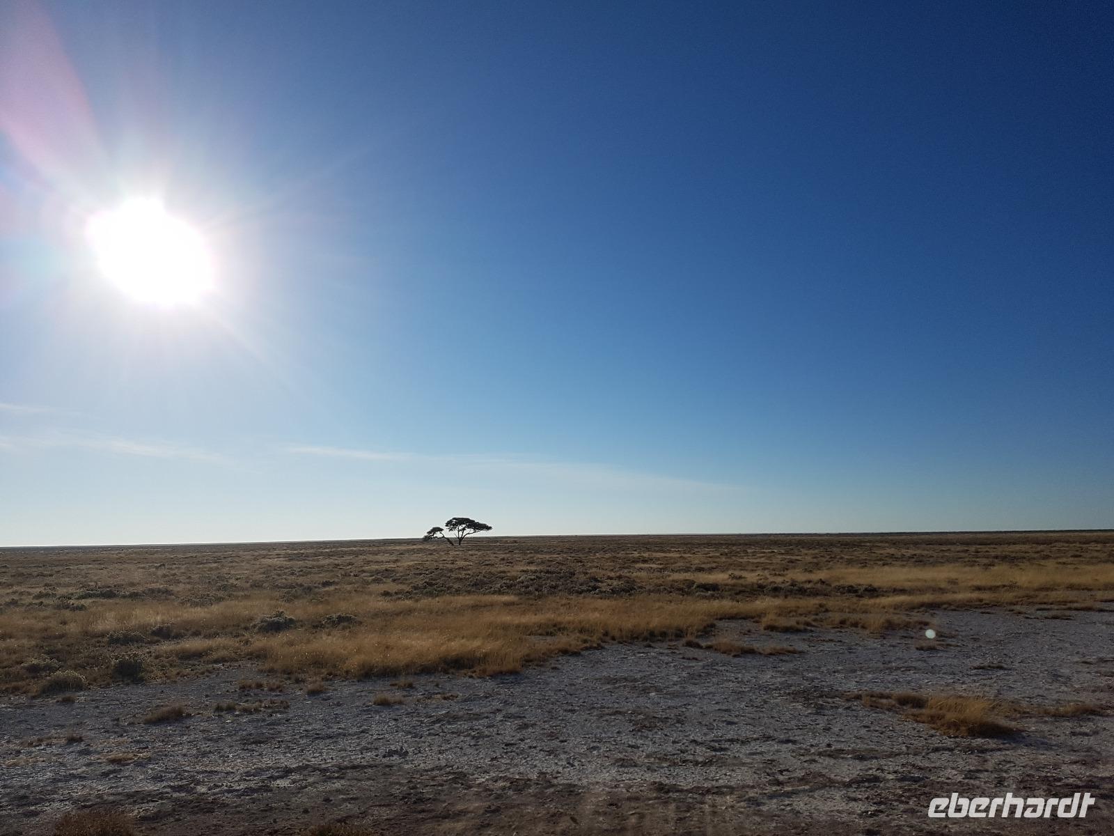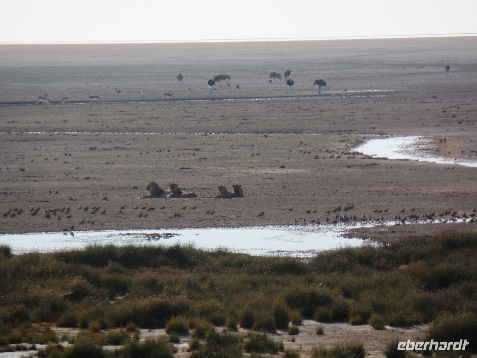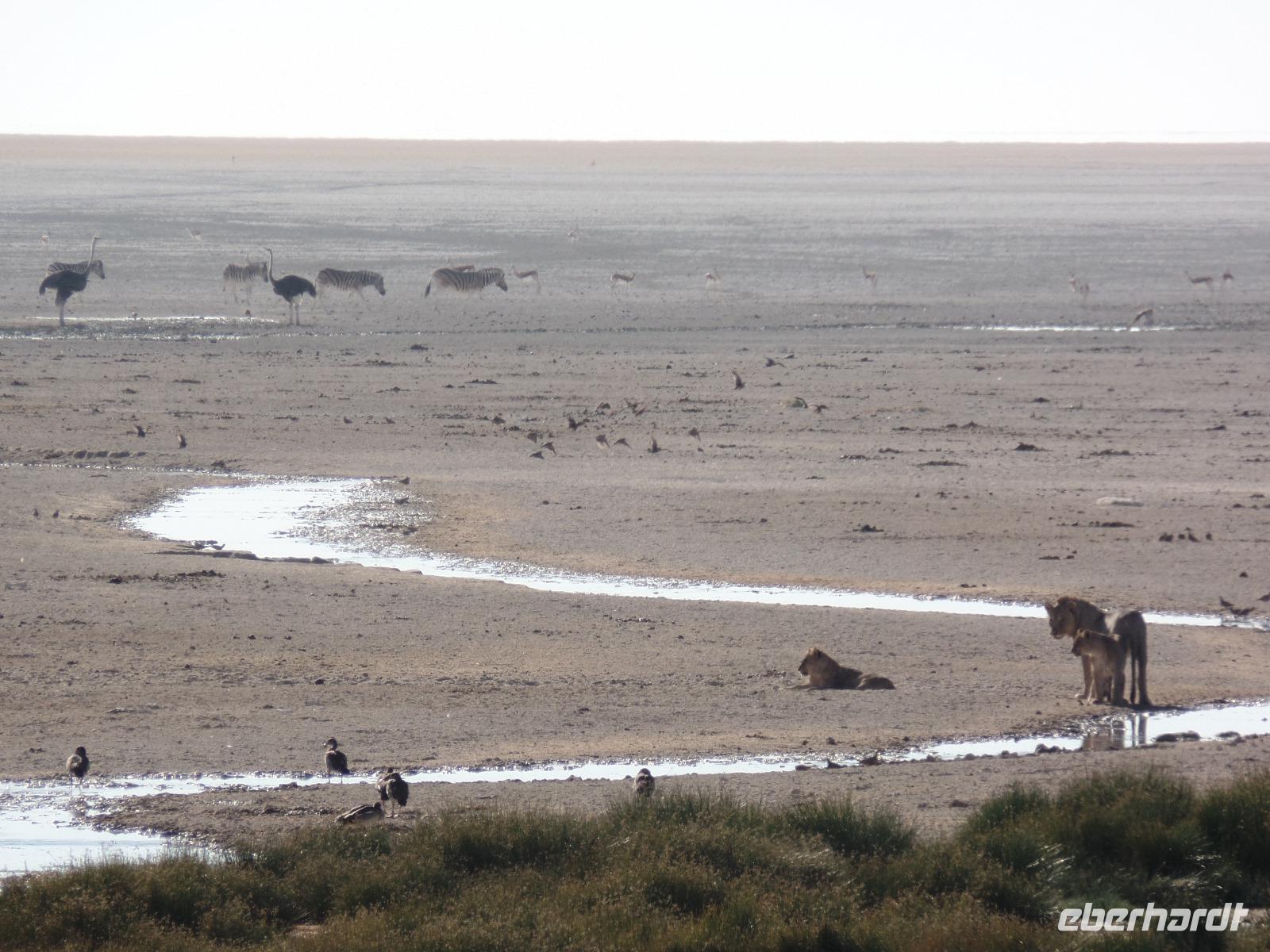 So wie gestern verbrachten wir die Mittagstunden beim gemütlichen Picknick in einem schattigen Camp direkt im Park. Hier konnte man sich was zum Essen bestellen oder zum Wasserloch laufen, um Tiere zu beobachten. Eberhardt Travel lud heute alle Gäste zum Eis ein. War eine gute Idee, oder? Am frühenNachmittag fuhren wir direkt am Rand von dem Herzstück des Parks, die 100 Kilometer lange Etosha-Pfanne. Eine große, weiße Fläche, wie der Name aus der Sansprache bedeutet, breitet sich ins Unendliche aus. Die weiße, nichtgreifbare Weite zieht uns alle magisch in ihren Bann.