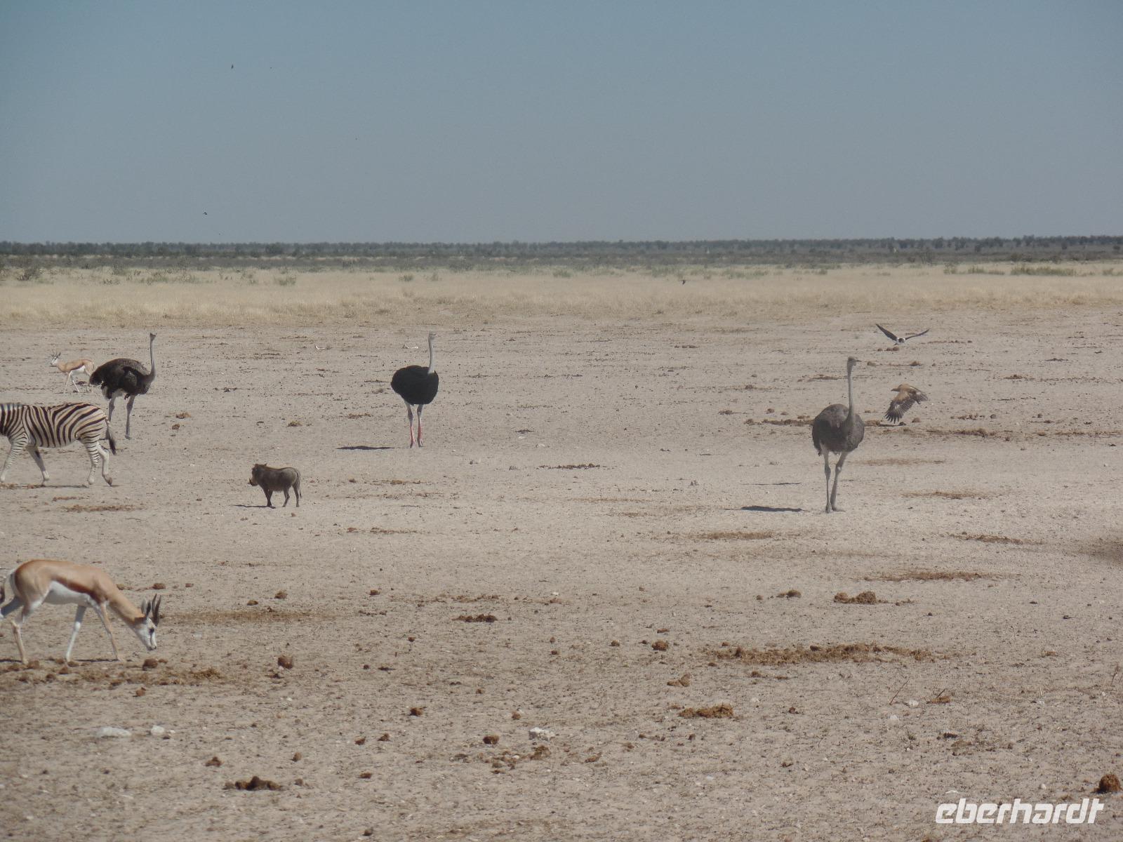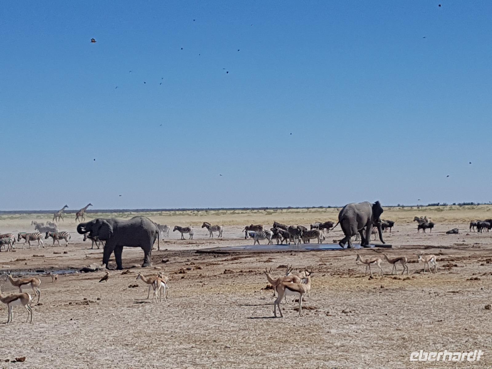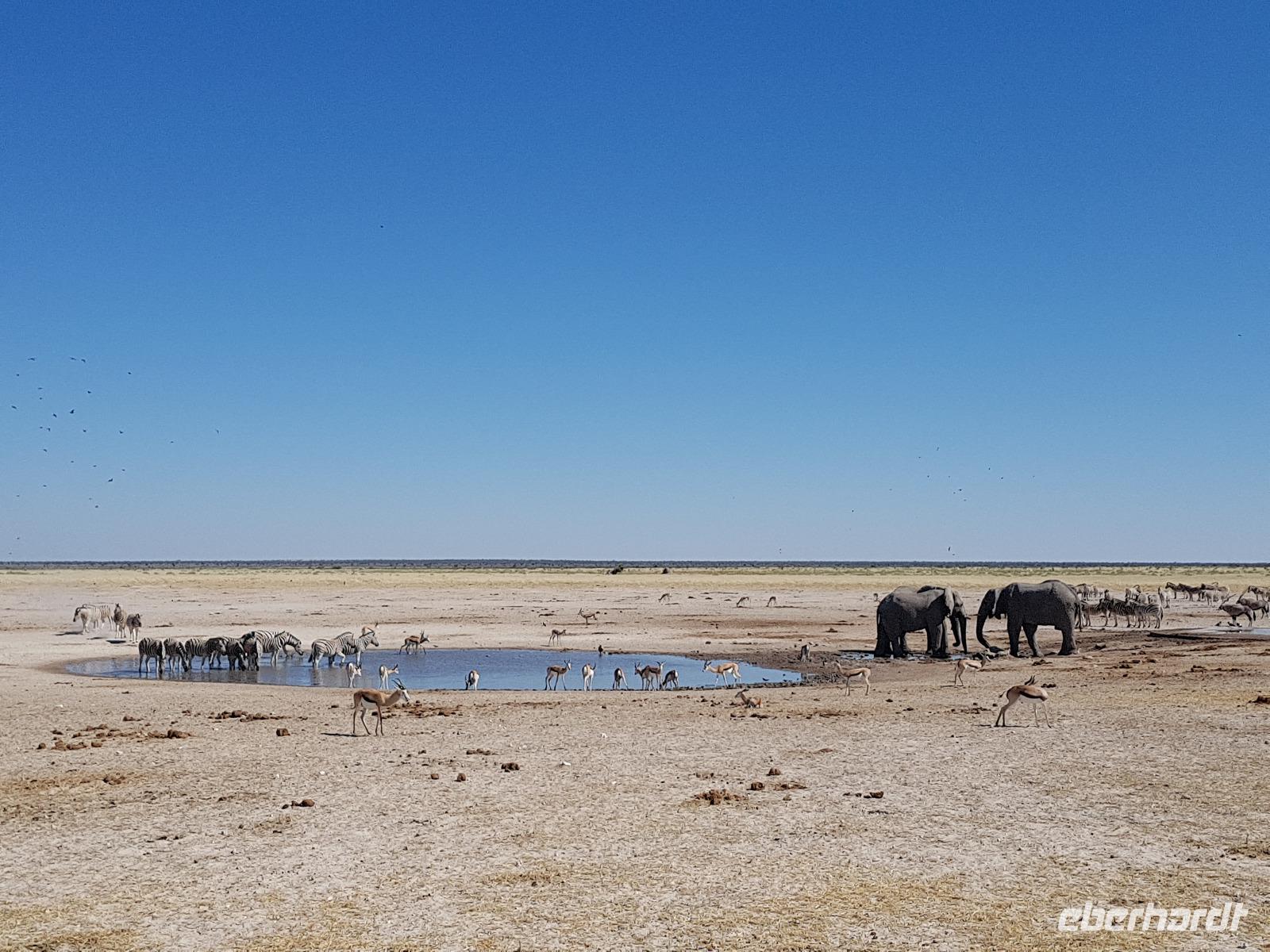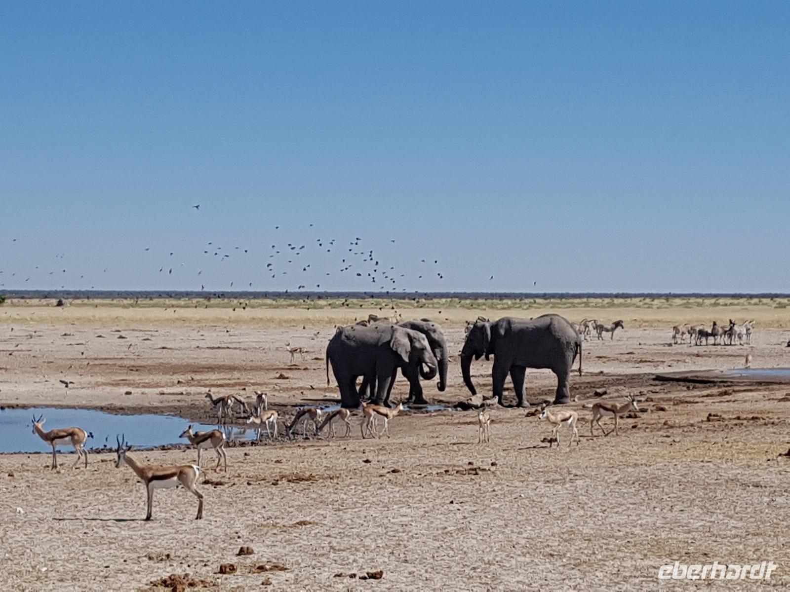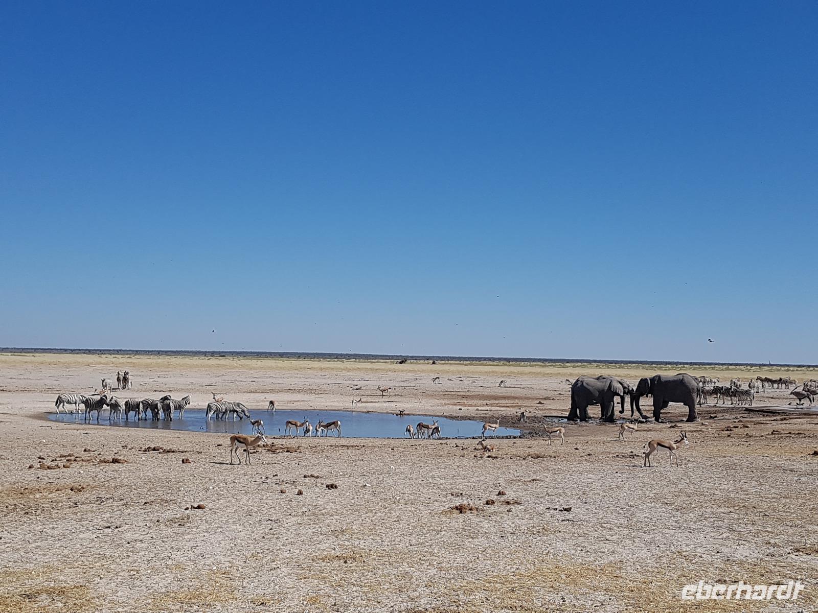 So wie gestern verbrachten wir die Mittagstunden beim gemütlichen Picknick in einem schattigen Camp direkt im Park. Hier konnte man sich was zum Essen bestellen oder zum Wasserloch laufen, um Tiere zu beobachten. Eberhardt Travel lud heute alle Gäste zum Eis ein. War eine gute Idee, oder? Am frühenNachmittag fuhren wir direkt am Rand von dem Herzstück des Parks, die 100 Kilometer lange Etosha-Pfanne. Eine große, weiße Fläche, wie der Name aus der Sansprache bedeutet, breitet sich ins Unendliche aus. Die weiße, nichtgreifbare Weite zieht uns alle magisch in ihren Bann.